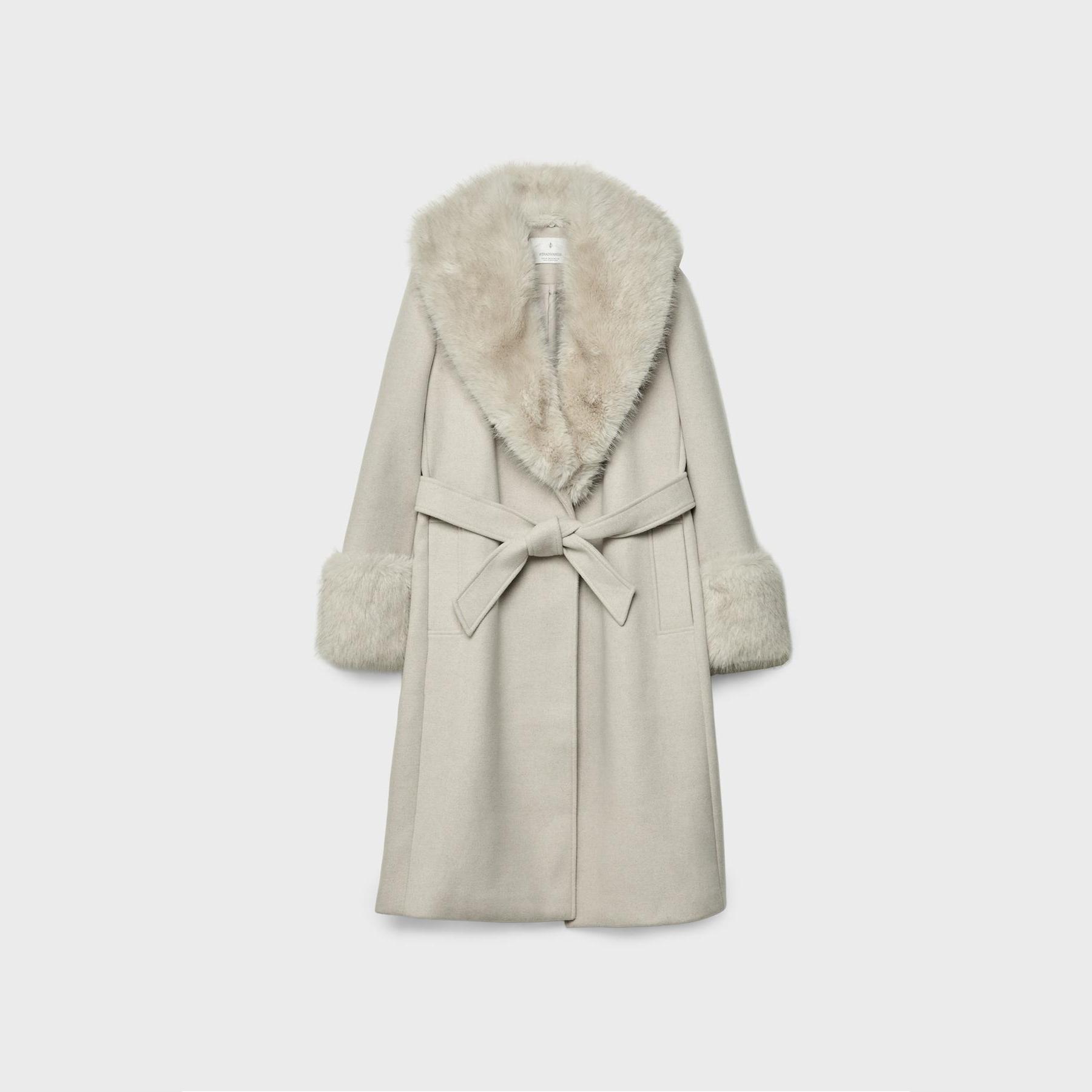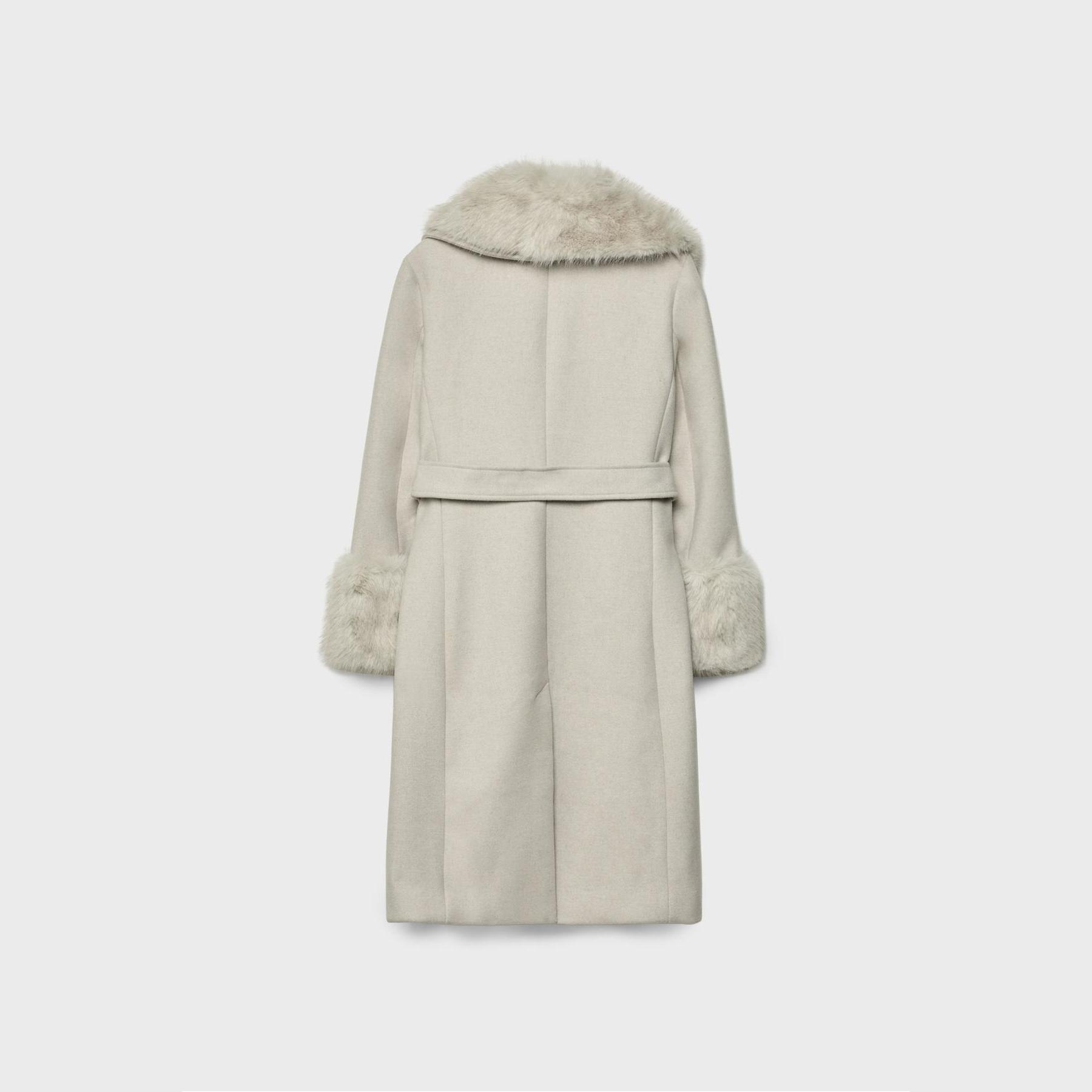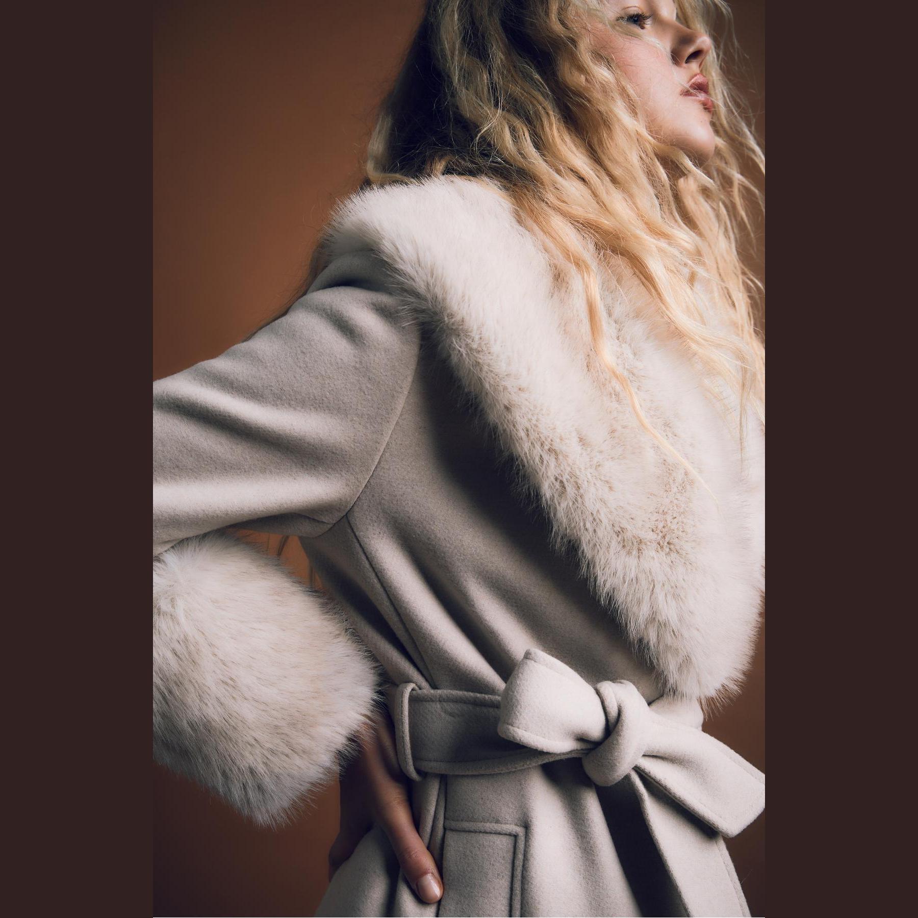 كابان شتوي أنيق من Stradivarius بلون إكرو ناعم، مصنوع من خامة منسوجة بتركيبة غنية بالصوف، بياقة عالية مزودة بتفاصيل سُني فرو قابلة للإزالة، يتميز بإغلاق أمامي بحزام من نفس القماش، أكمام طويلة، وجيوب جانبية بيات، مثالي للتنسيق مع بناطيل رسمية أو قطع كاجوال لإطلالة شتوية فاخرة ومتناسقة.