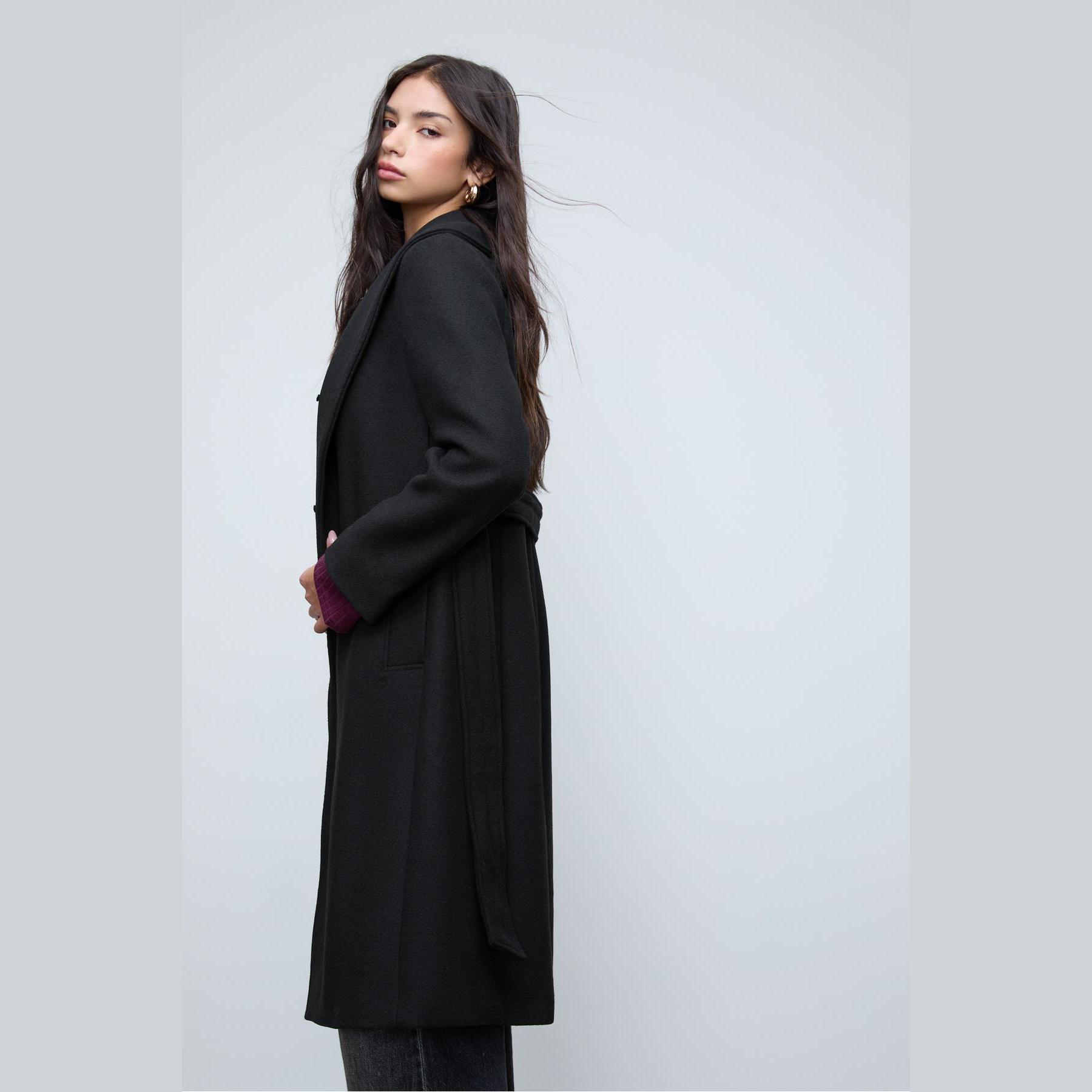كابان شتوي أنيق من Stradivarius بلون أسود كلاسيكي، مصنوع من خامة منسوجة بتركيبة غنية بالصوف، بياقة عالية مزودة بتفاصيل سُني فرو قابلة للإزالة، يتميز بإغلاق أمامي بحزام من نفس القماش، أكمام طويلة، وجيوب جانبية بيات، مثالي للتنسيق مع بناطيل رسمية أو قطع كاجوال لإطلالة شتوية فاخرة ومتناسقة.