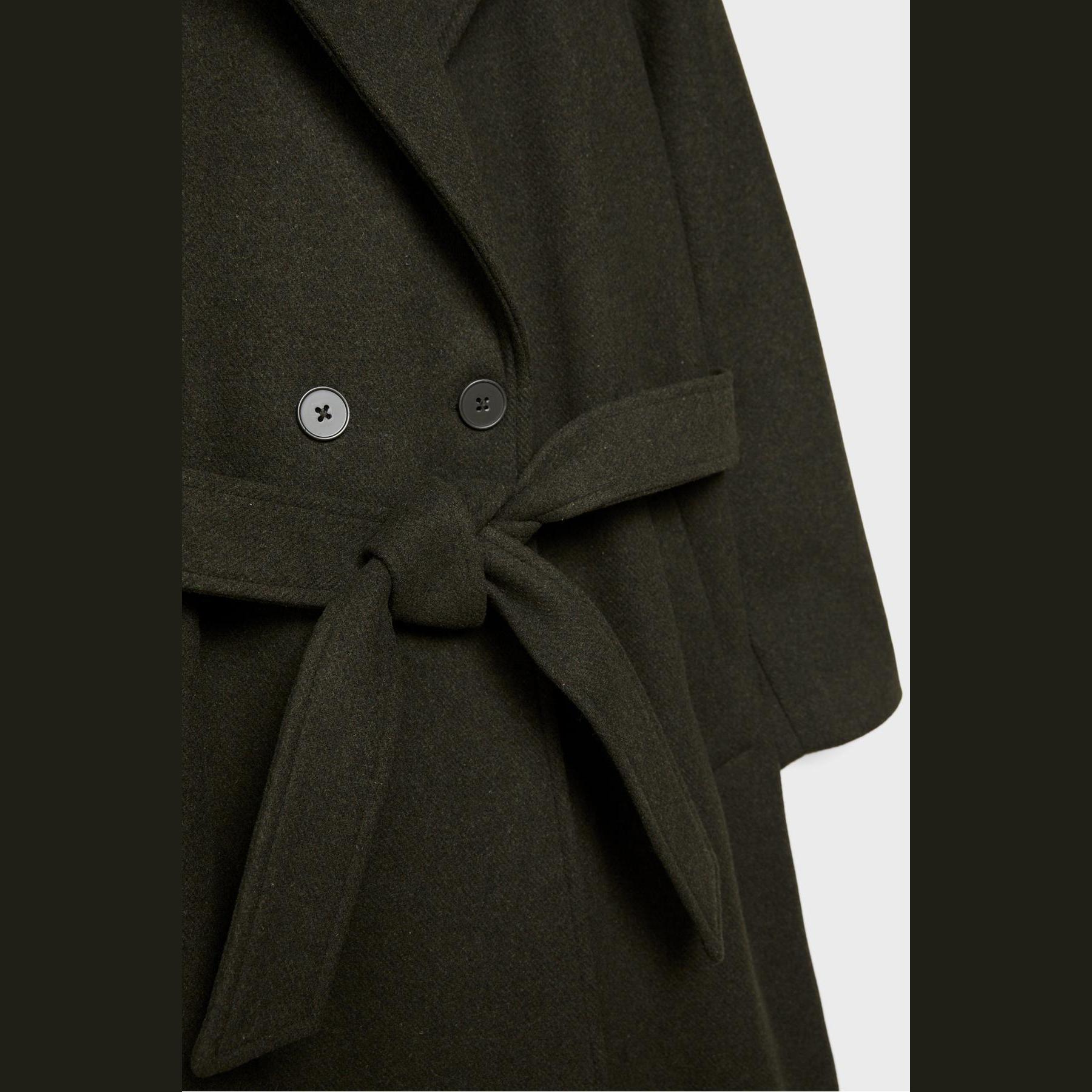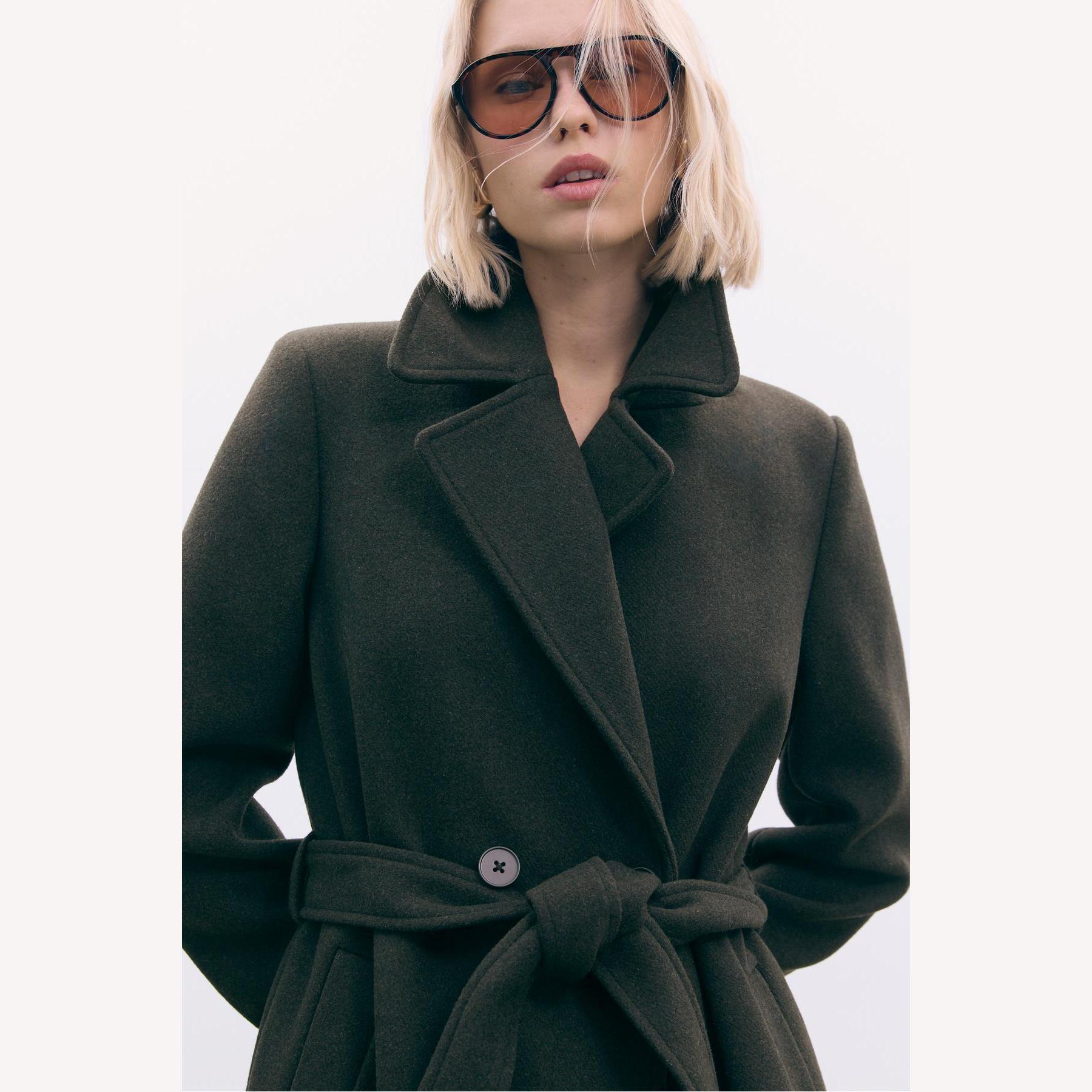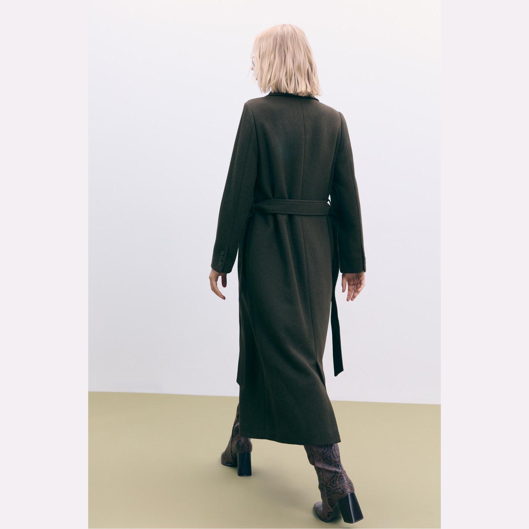 كابان أنيق من Stradivarius بلون زيتي داكن، مصنوع من خامة منسوجة ناعمة بتركيبة غنية بالصوف، بياقة كروڤاز مزدوجة وقصة Regular، مزود بحزام خصر من نفس القماش لإبراز القوام، يتميز بأزرار أمامية، أكمام طويلة، وجيوب جانبية بيات، مثالي للتنسيق مع بناطيل رسمية أو قطع كاجوال لإطلالة شتوية متناسقة.