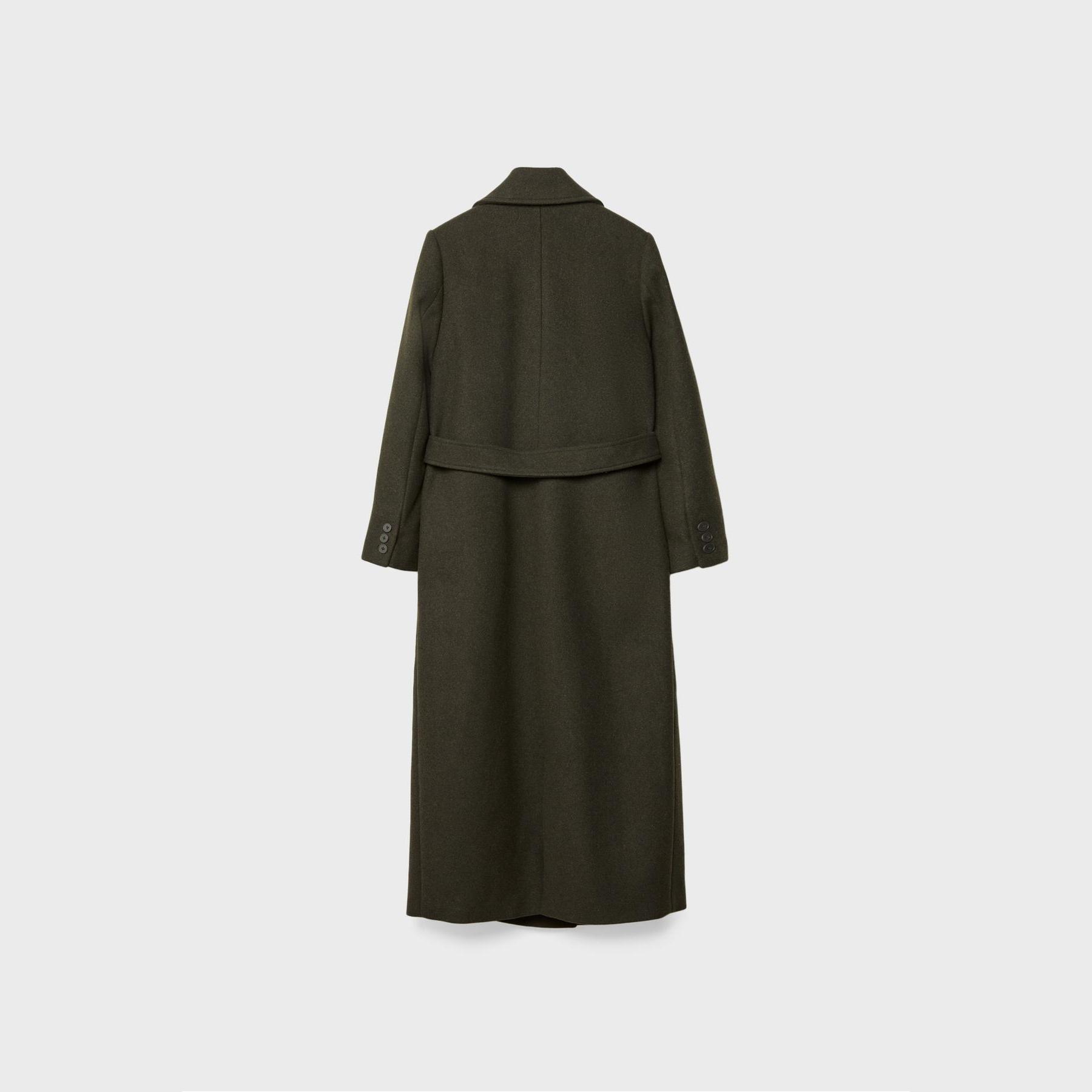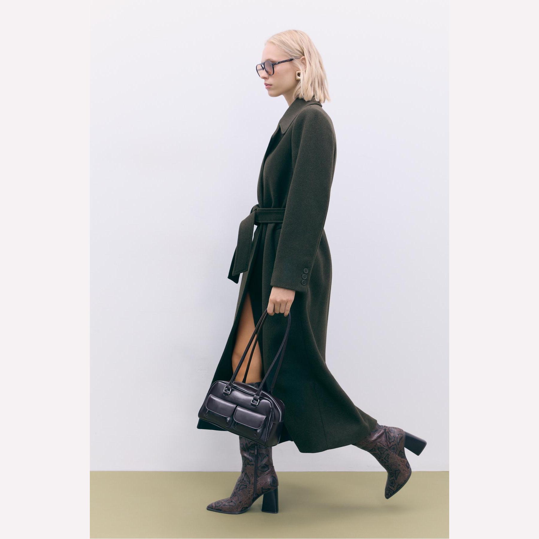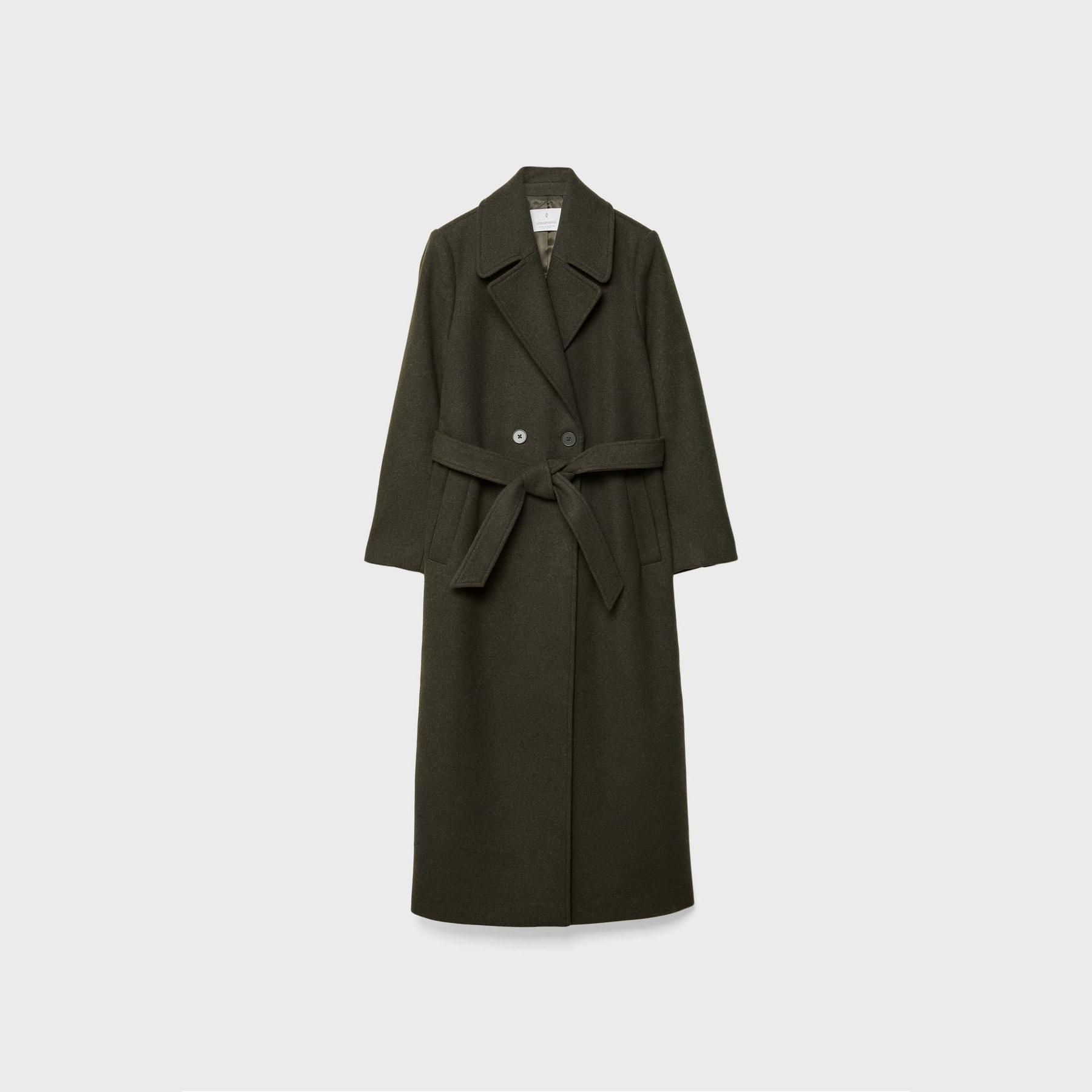 كابان أنيق من Stradivarius بلون زيتي داكن، مصنوع من خامة منسوجة ناعمة بتركيبة غنية بالصوف، بياقة كروڤاز مزدوجة وقصة Regular، مزود بحزام خصر من نفس القماش لإبراز القوام، يتميز بأزرار أمامية، أكمام طويلة، وجيوب جانبية بيات، مثالي للتنسيق مع بناطيل رسمية أو قطع كاجوال لإطلالة شتوية متناسقة.