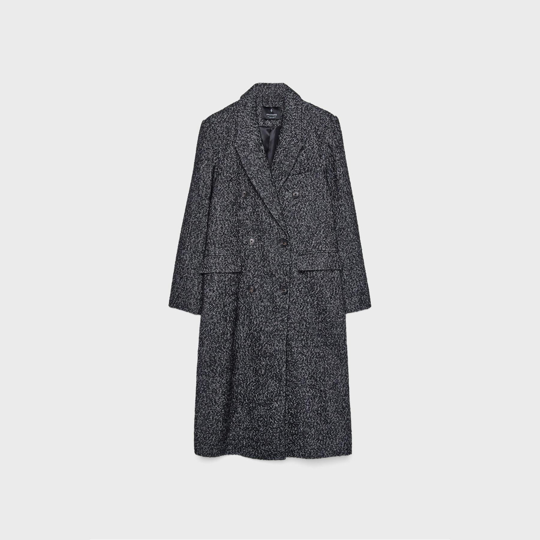 - التصميم: كابان طويل، بياقة عالية، بأكمام طويلة، أزرار أمامية متقاطعة
