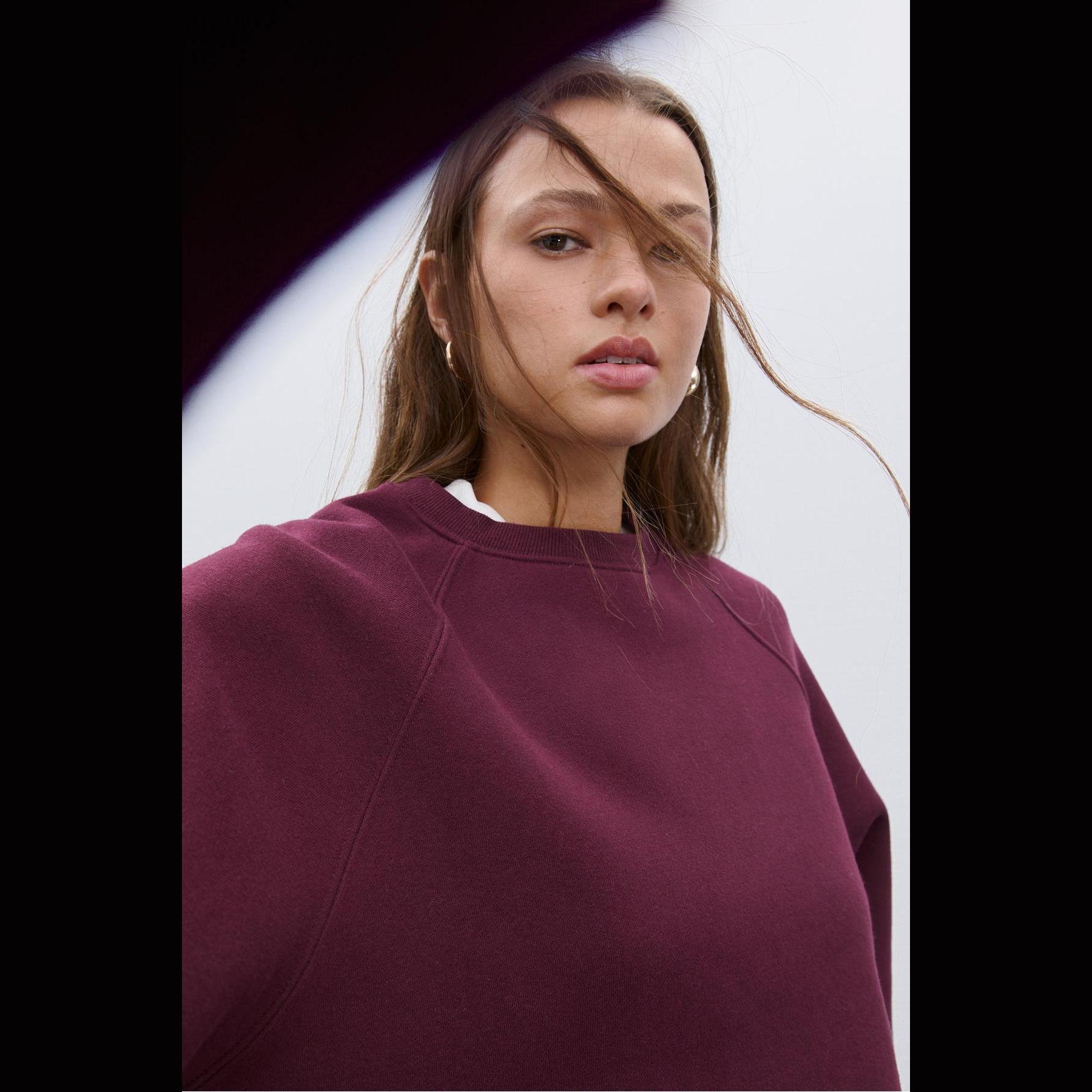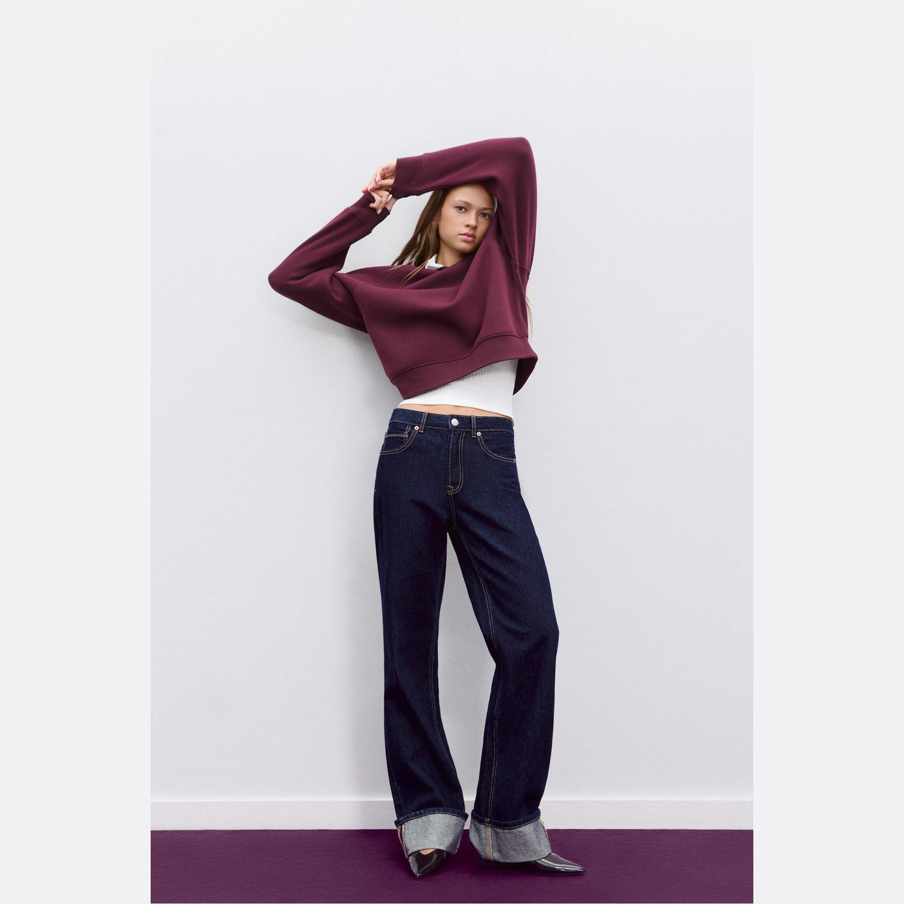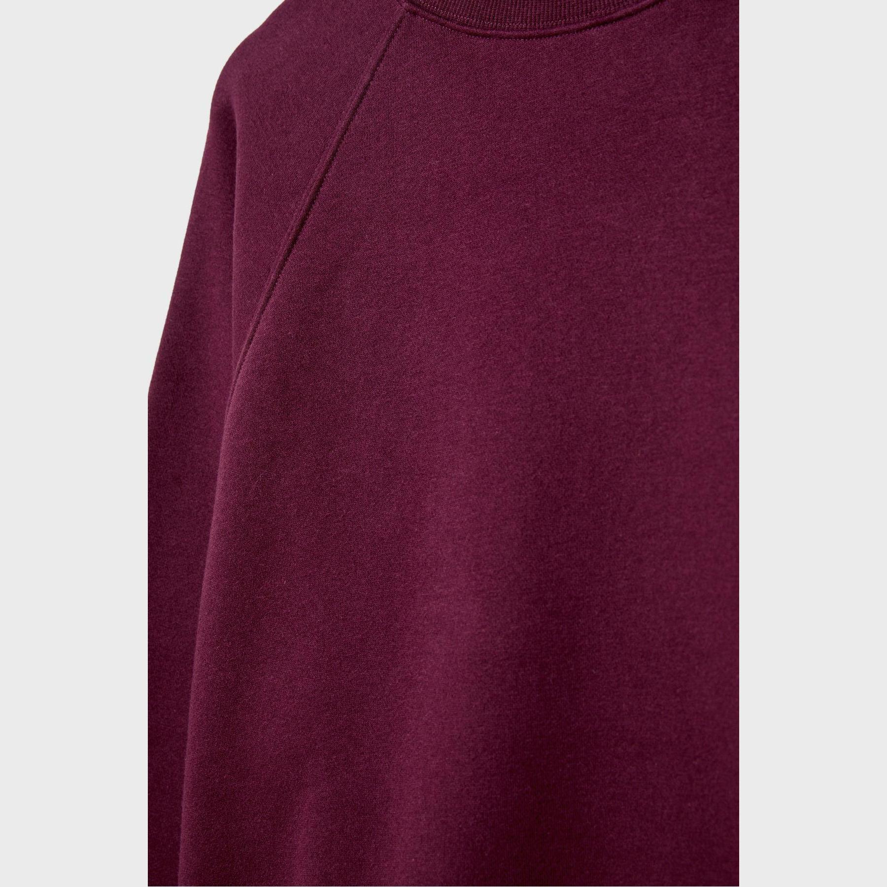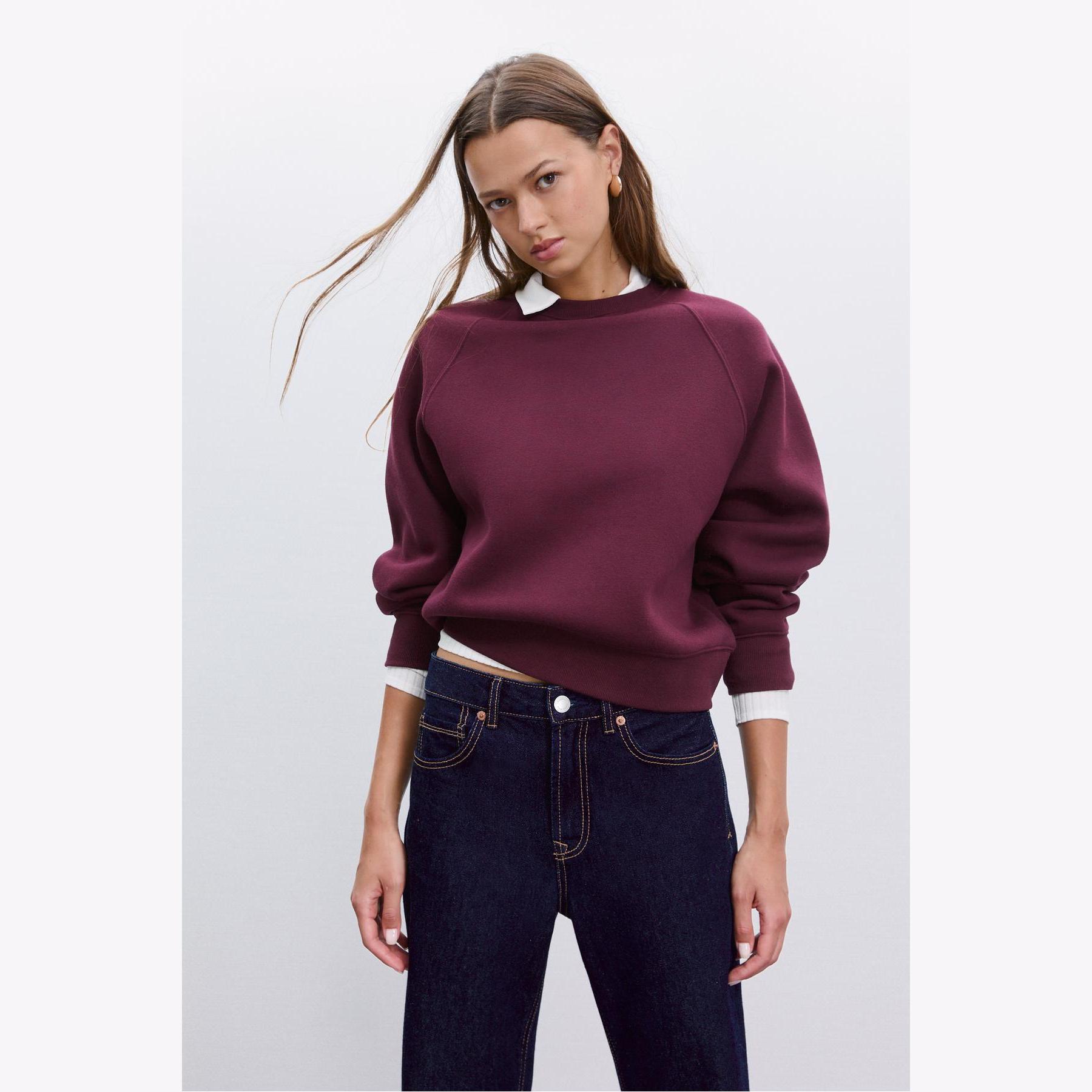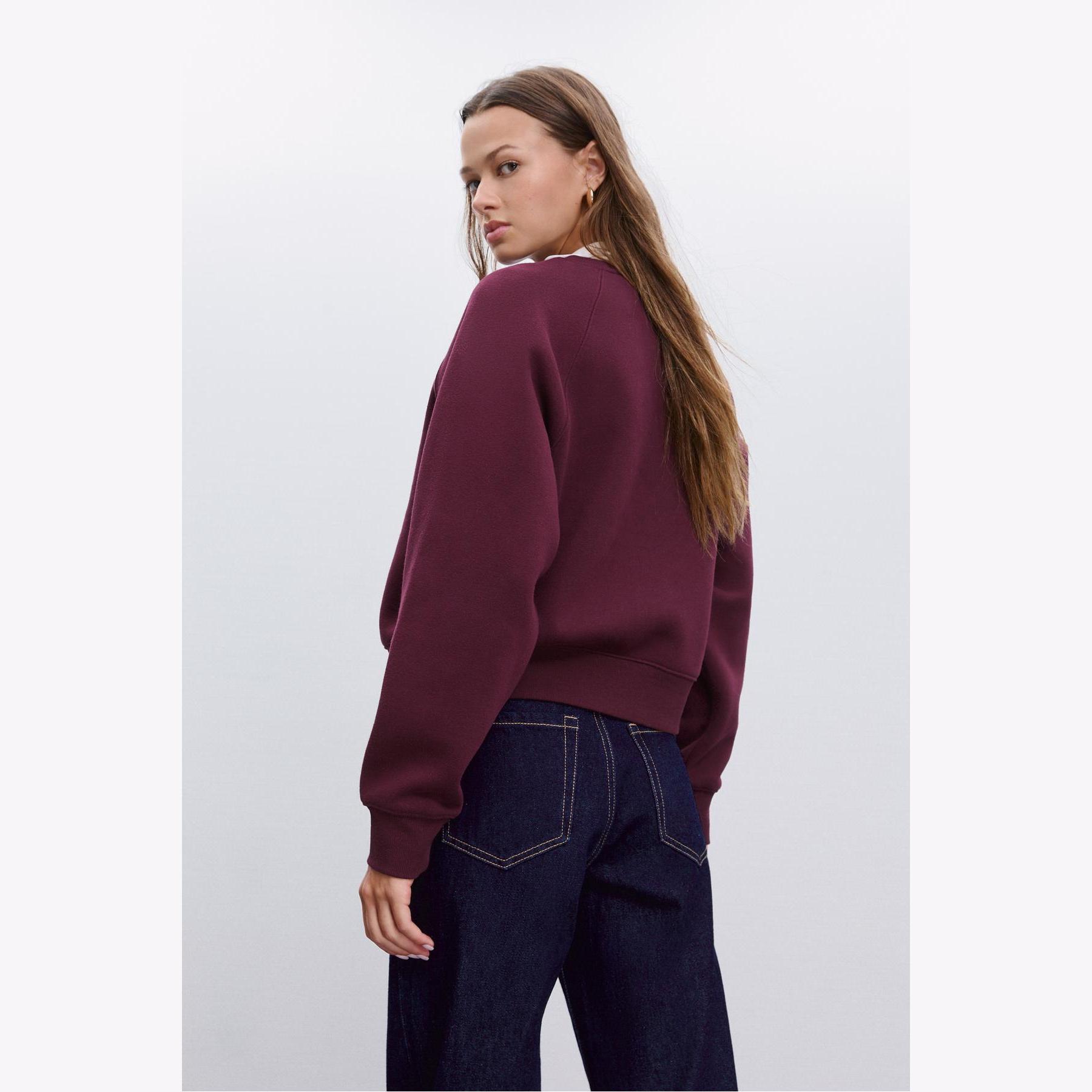 سويت شيرت عملي من Stradivarius بلون بنفسجي، مصنوع من خامة ناعمة بتركيبة 64% قطن، 35% بوليستر، 1% إيلاستان، يتميز بقصة Comfort مريحة وفتحة رقبة دائرية (Bisiklet Yaka)، أكمام طويلة مع أطراف وأساور Ribana مرنة، ملمس داخلي ناعم يشبه القطيفة، تصميم سادة بدون طبعات، مثالي للتنسيق مع جينز أو بنطال رياضي لإطلالة كاجوال يومية.