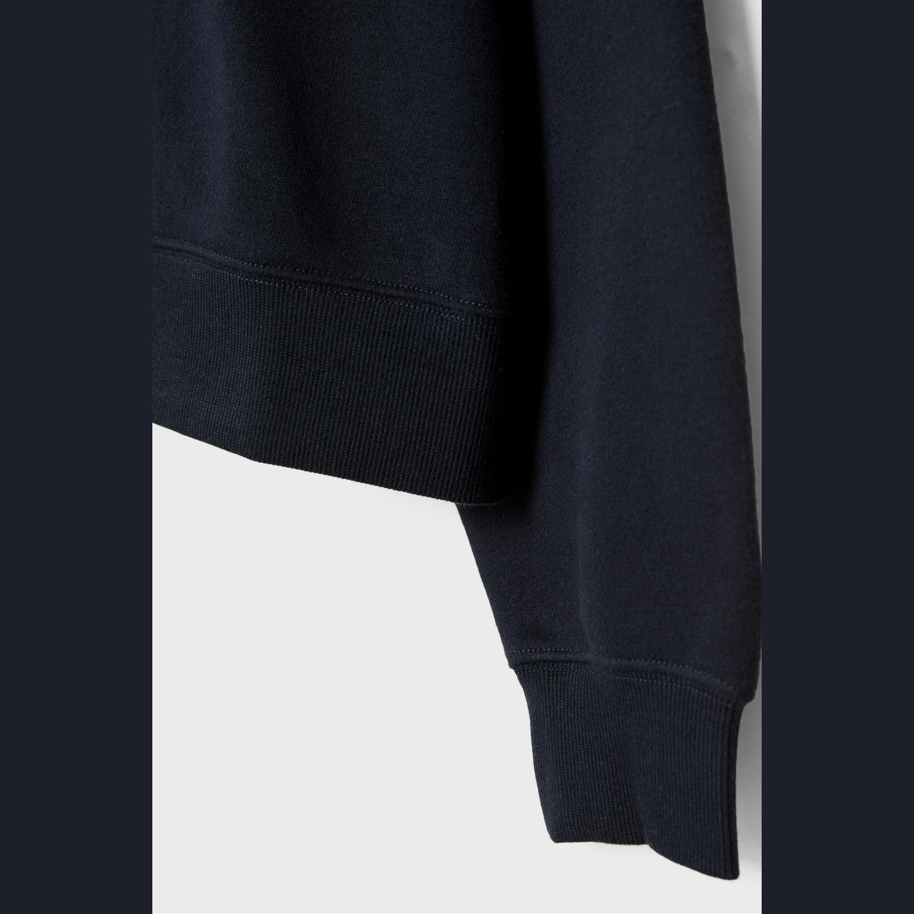 سويت شيرت عملي من Stradivarius بلون كحلي داكن، مصنوع من خامة ناعمة بتركيبة 64% قطن، 35% بوليستر، 1% إيلاستان، يتميز بقصة Comfort مريحة وفتحة رقبة دائرية (Bisiklet Yaka)، أكمام طويلة مع أطراف وأساور Ribana مرنة، ملمس داخلي ناعم يشبه القطيفة، تصميم سادة بدون طبعات، مثالي للتنسيق مع جينز أو بنطال رياضي لإطلالة كاجوال يومية.