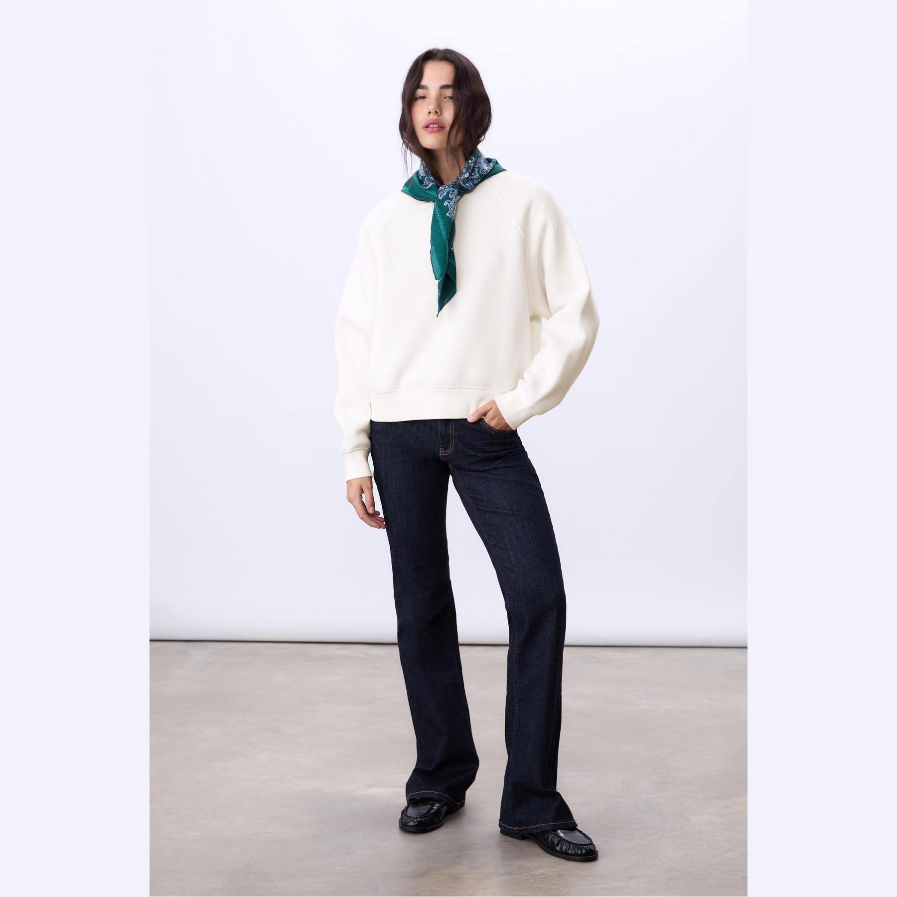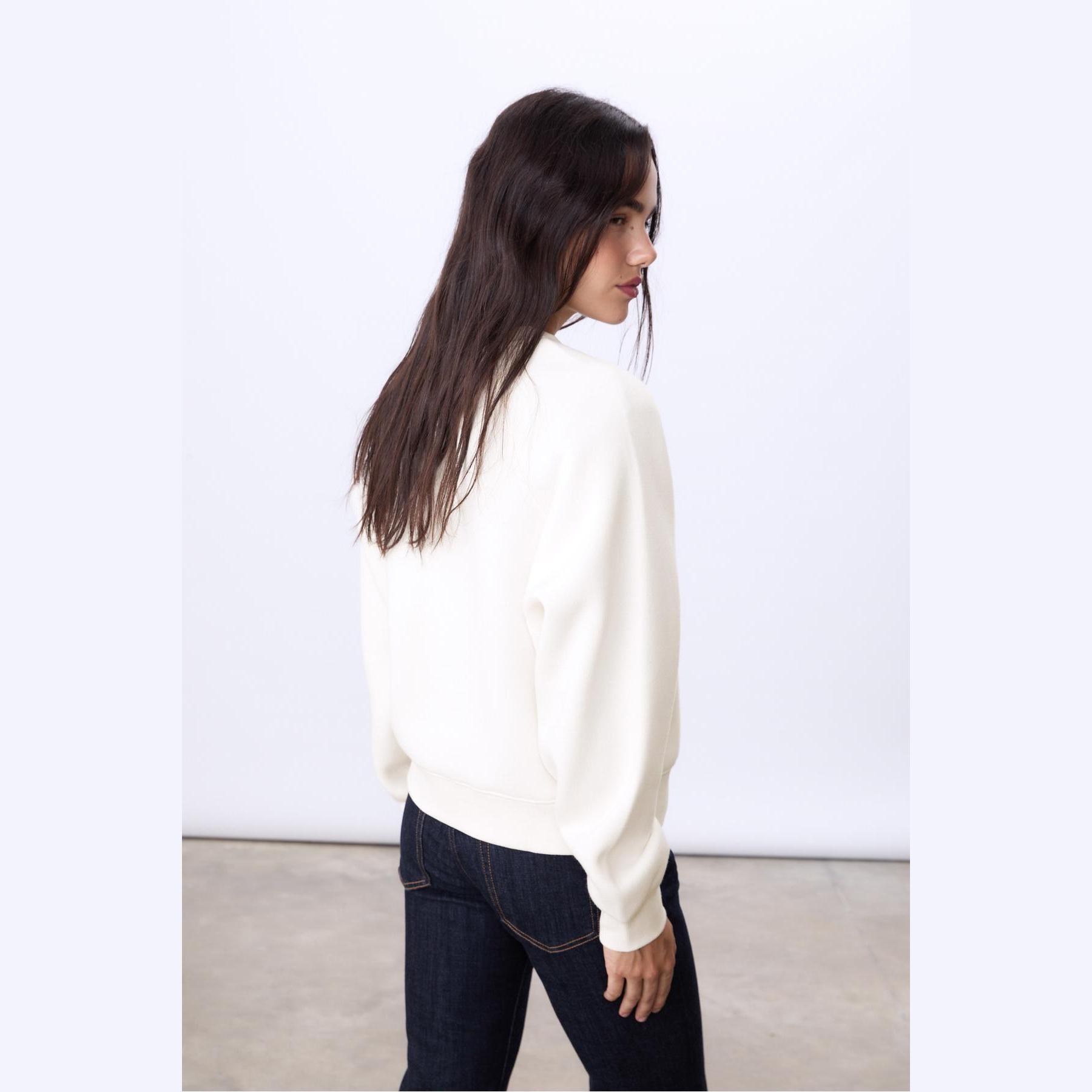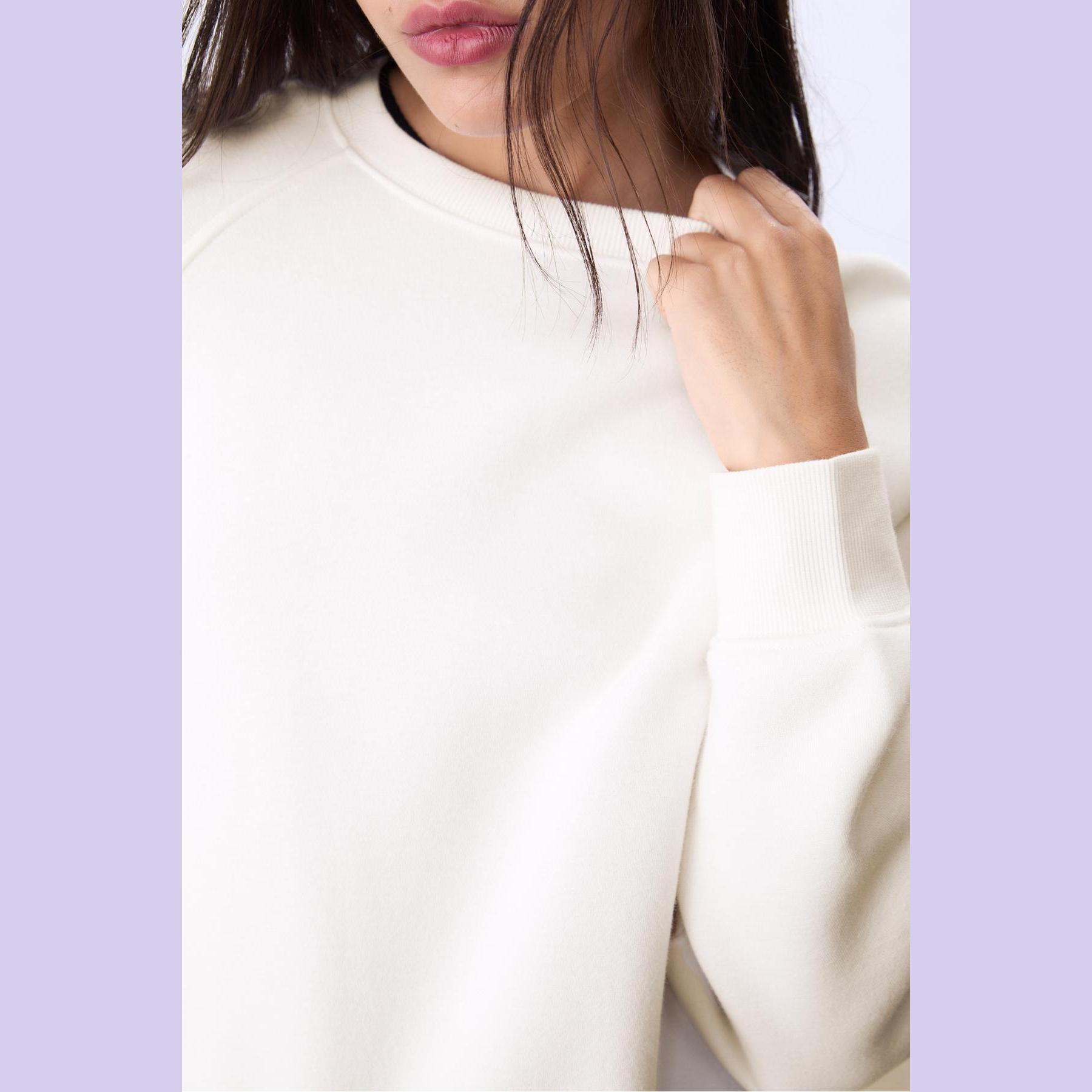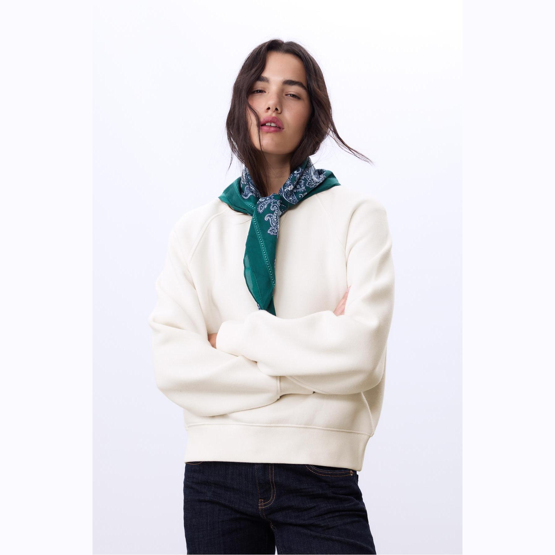 سويت شيرت عملي من Stradivarius بلون إكرو، مصنوع من خامة ناعمة بتركيبة 64% قطن، 35% بوليستر، 1% إيلاستان، يتميز بقصة Comfort مريحة وفتحة رقبة دائرية (Bisiklet Yaka)، أكمام طويلة مع أطراف وأساور Ribana مرنة، ملمس داخلي ناعم يشبه القطيفة، تصميم سادة بدون طبعات، مثالي للتنسيق مع جينز أو بنطال رياضي لإطلالة كاجوال يومية.