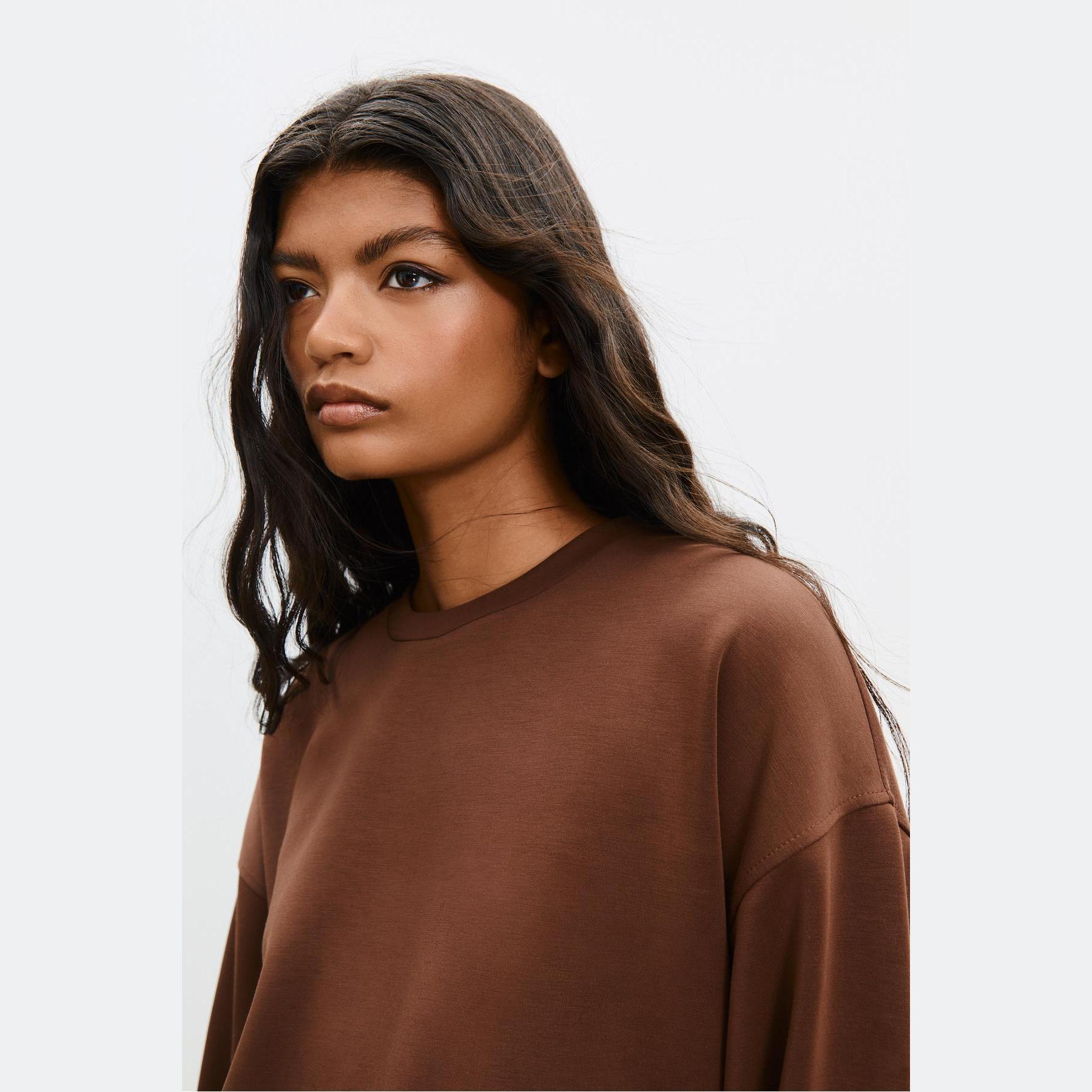 سويت شيرت عملي من Stradivarius بلون بني دافئ، مصنوع من خامة ناعمة بتركيبة غنية بـ49% مودال، 42% بوليستر، 9% إيلاستان، يتميز بقصة Comfort مريحة وفتحة رقبة دائرية (Bisiklet Yaka)، أكمام قصيرة، تصميم سادة بدون طبعات، ملمس داخلي ناعم يمنحك إحساسًا بالدفء والراحة، مثالي للتنسيق مع جينز أو بنطال رياضي لإطلالة كاجوال يومية.
