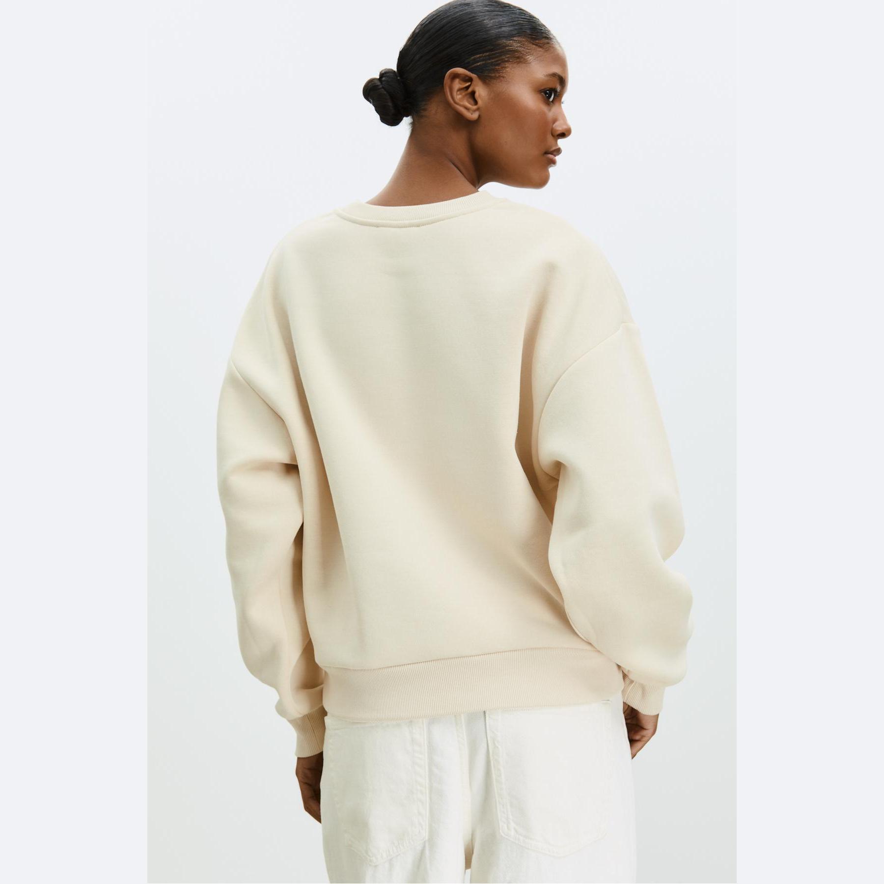 سويت شيرت عملي من Stradivarius بلون كريمي، مصنوع من خامة ناعمة بتركيبة 70% قطن، 30% بوليستر، يتميز بقصة Loose واسعة وفتحة رقبة دائرية (Bisiklet Yaka)، أكمام طويلة مع أطراف وأساور Ribana مرنة، تصميم سادة مزين بتطريز وطبعات فلكية على الجهة الأمامية، ملمس داخلي ناعم بدون شاردون، بدون جيوب، مثالي للتنسيق مع جينز أو بنطال رياضي لإطلالة كاجوال يومية.
