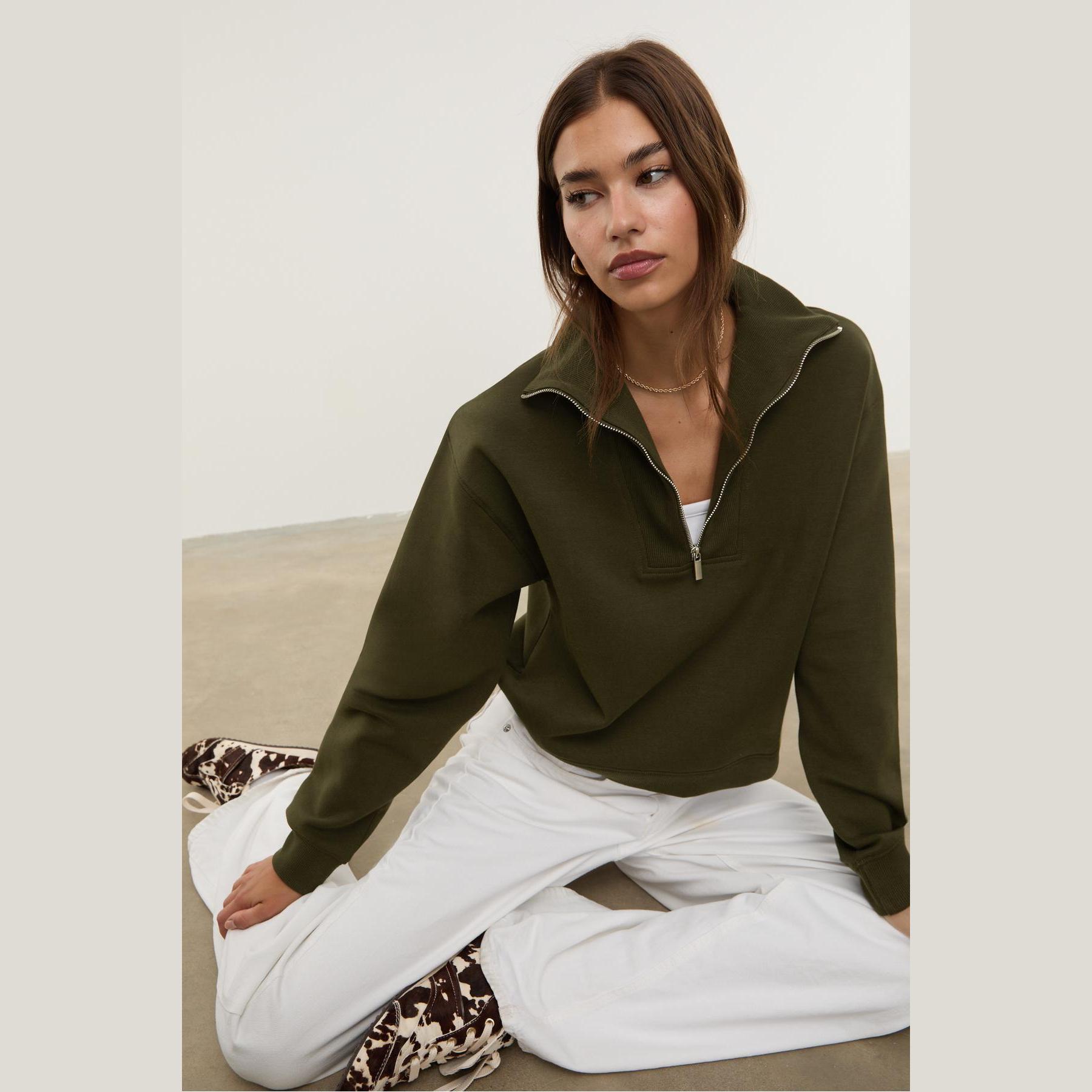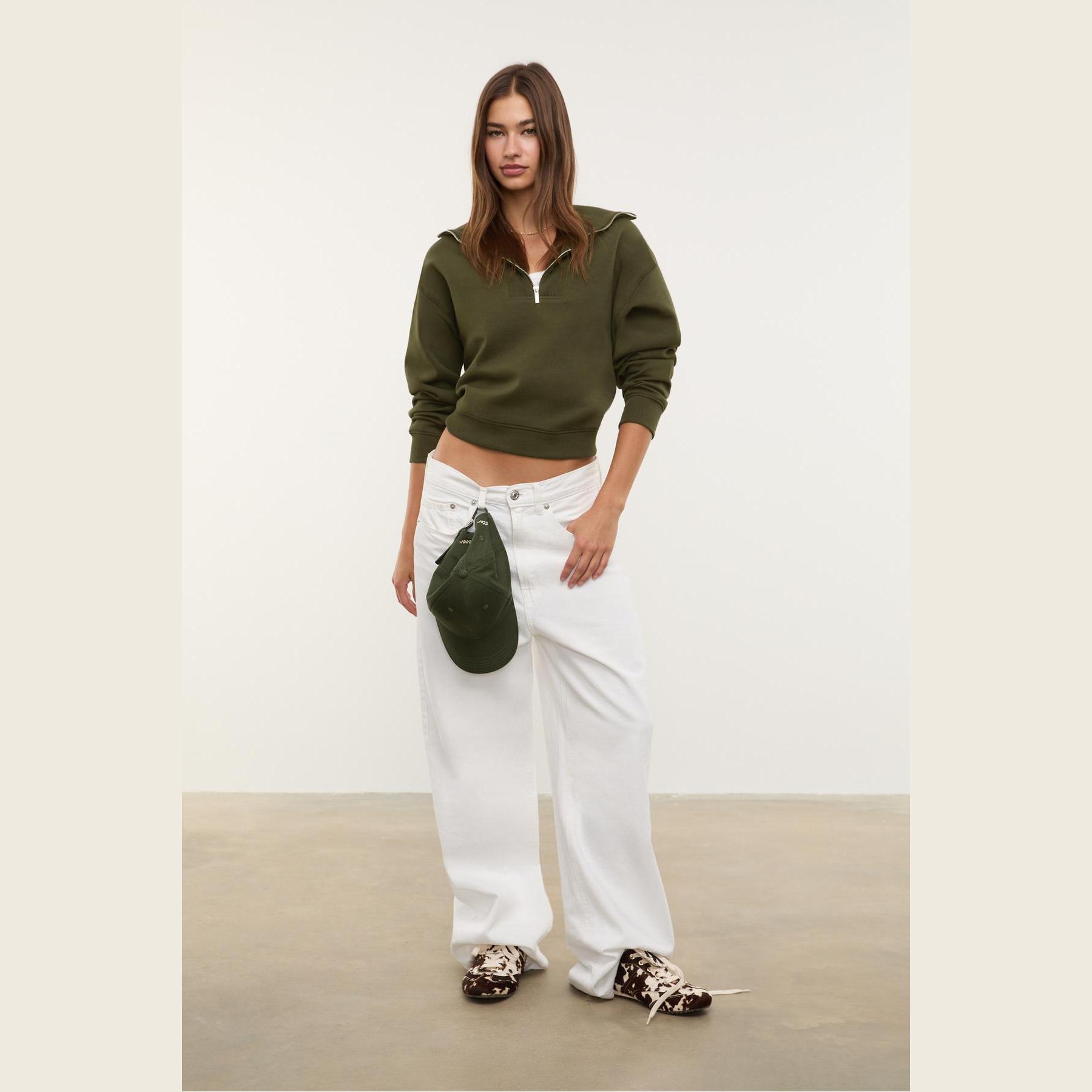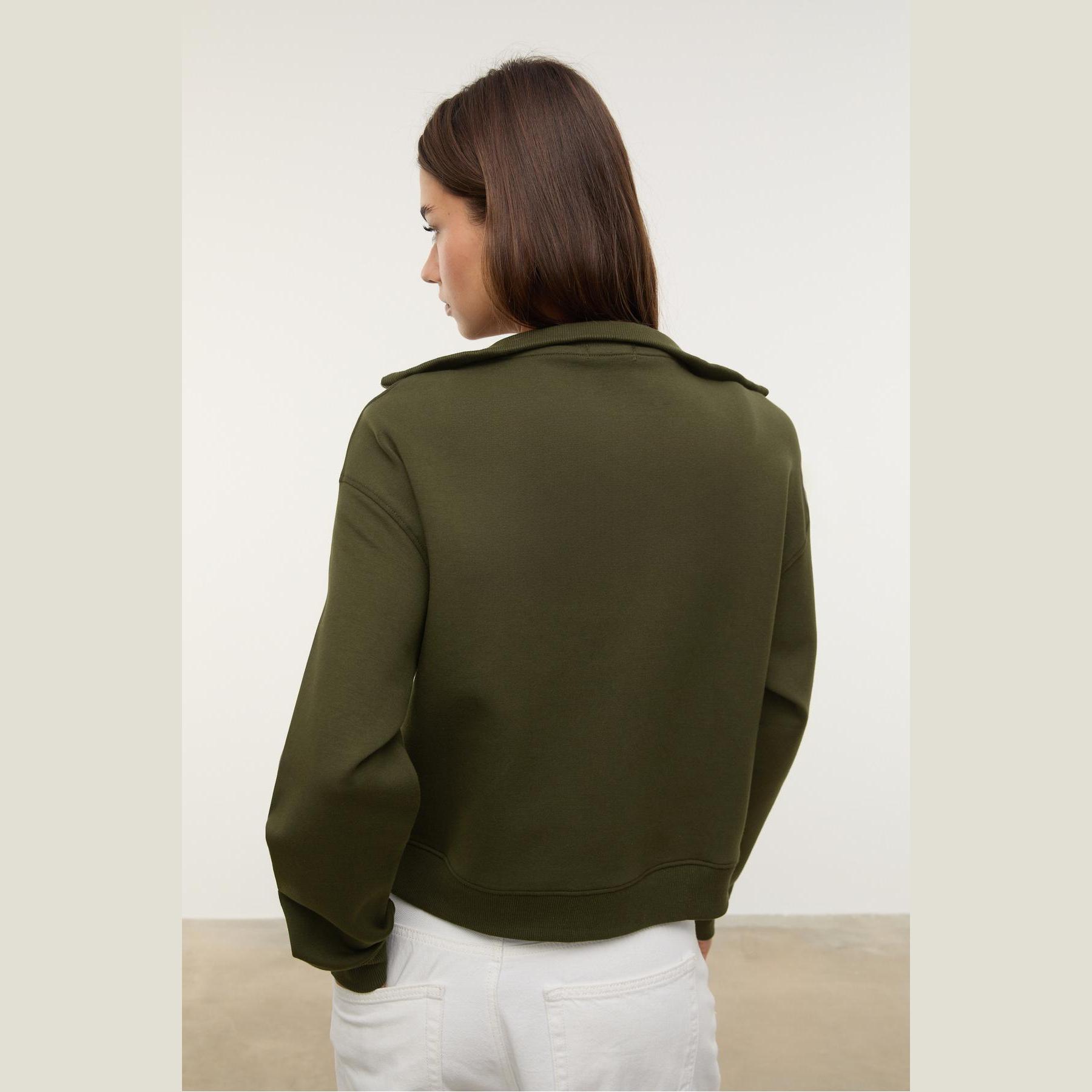 سويت شيرت عملي من Stradivarius بلون أخضر داكن، مصنوع من خامة ناعمة بتركيبة 84% قطن، 11% بوليستر، 5% إيلاستان، يتميز بقصة Comfort مريحة وفتحة رقبة عالية (Dik Yaka) مع سحاب معدني أمامي، أكمام طويلة، أطراف وأساور Ribana مرنة، تصميم سادة بدون طبعات، ملمس داخلي ناعم، مثالي للتنسيق مع جينز أو ليغينغ لإطلالة كاجوال يومية.