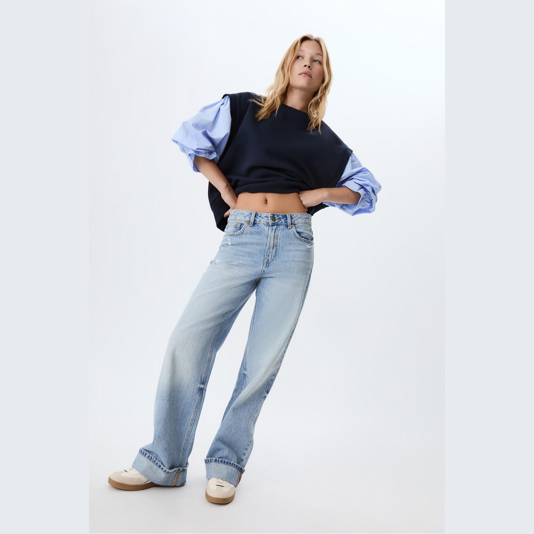 سويت شيرت أنيق من Stradivarius بلون كحلي، مصنوع من خامة ناعمة بتركيبة 77% قطن، 23% بوليستر، يتميز بقصة Regular مريحة وفتحة رقبة دائرية (Bisiklet Yaka)، أكمام طويلة بتصميم بالون مع تفاصيل فِرِيل (Fırfır) عند الكتف، مزيج من الأقمشة لإضفاء طابع مركّب، تصميم سادة بدون طبعات، ملمس داخلي ناعم، مثالي للتنسيق مع تنورة أو بنطال عالي الخصر لإطلالة أنثوية كاجوال.