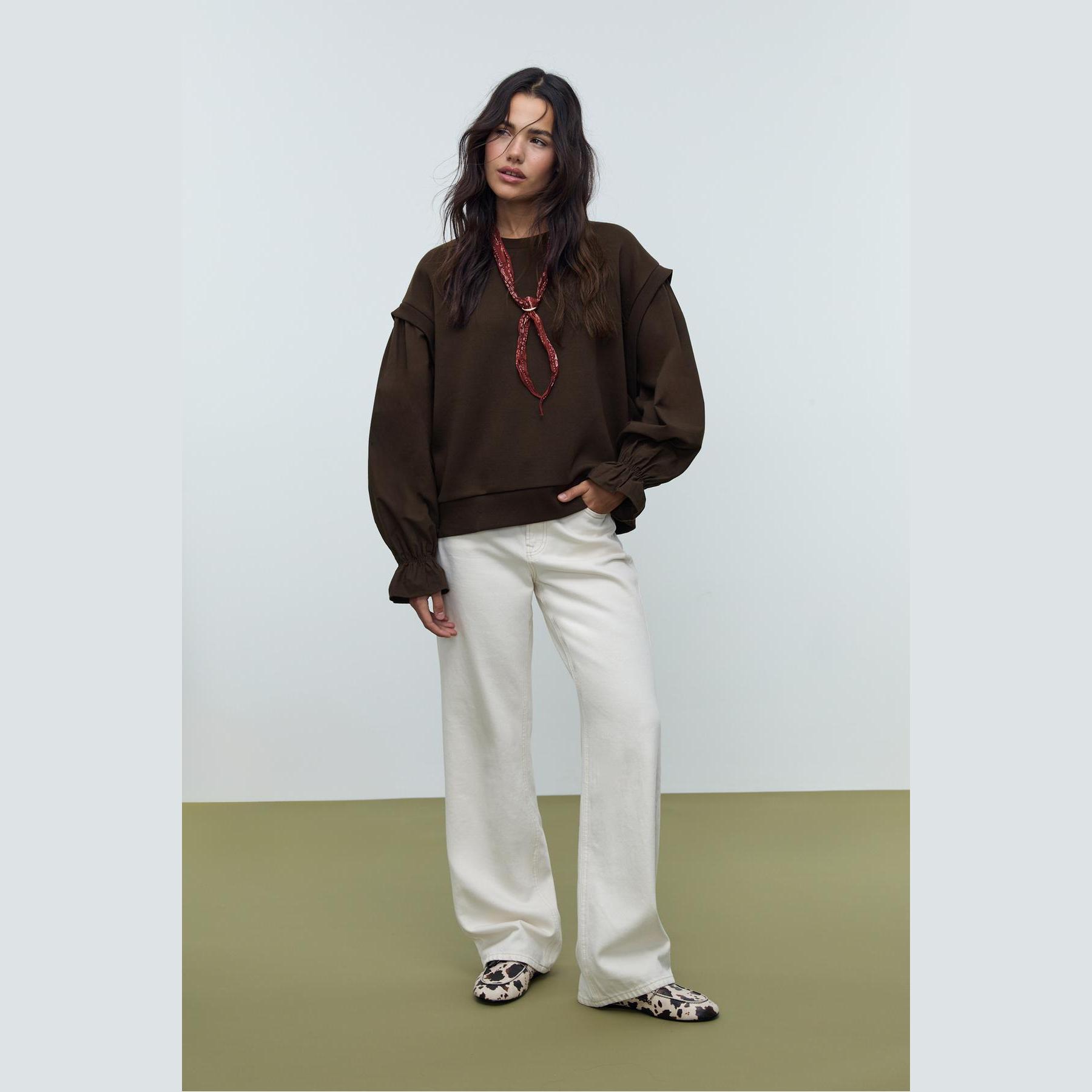 سويت شيرت أنيق من Stradivarius بلون بني، مصنوع من خامة ناعمة بتركيبة 77% قطن، 23% بوليستر، يتميز بقصة Regular مريحة وفتحة رقبة دائرية (Bisiklet Yaka)، أكمام طويلة بتصميم بالون مع تفاصيل فِرِيل (Fırfır) عند الكتف، نهايات الأكمام مطاطية، تصميم سادة بدون طبعات، ملمس داخلي ناعم، مثالي للتنسيق مع تنورة أو بنطال عالي الخصر لإطلالة أنثوية كاجوال.