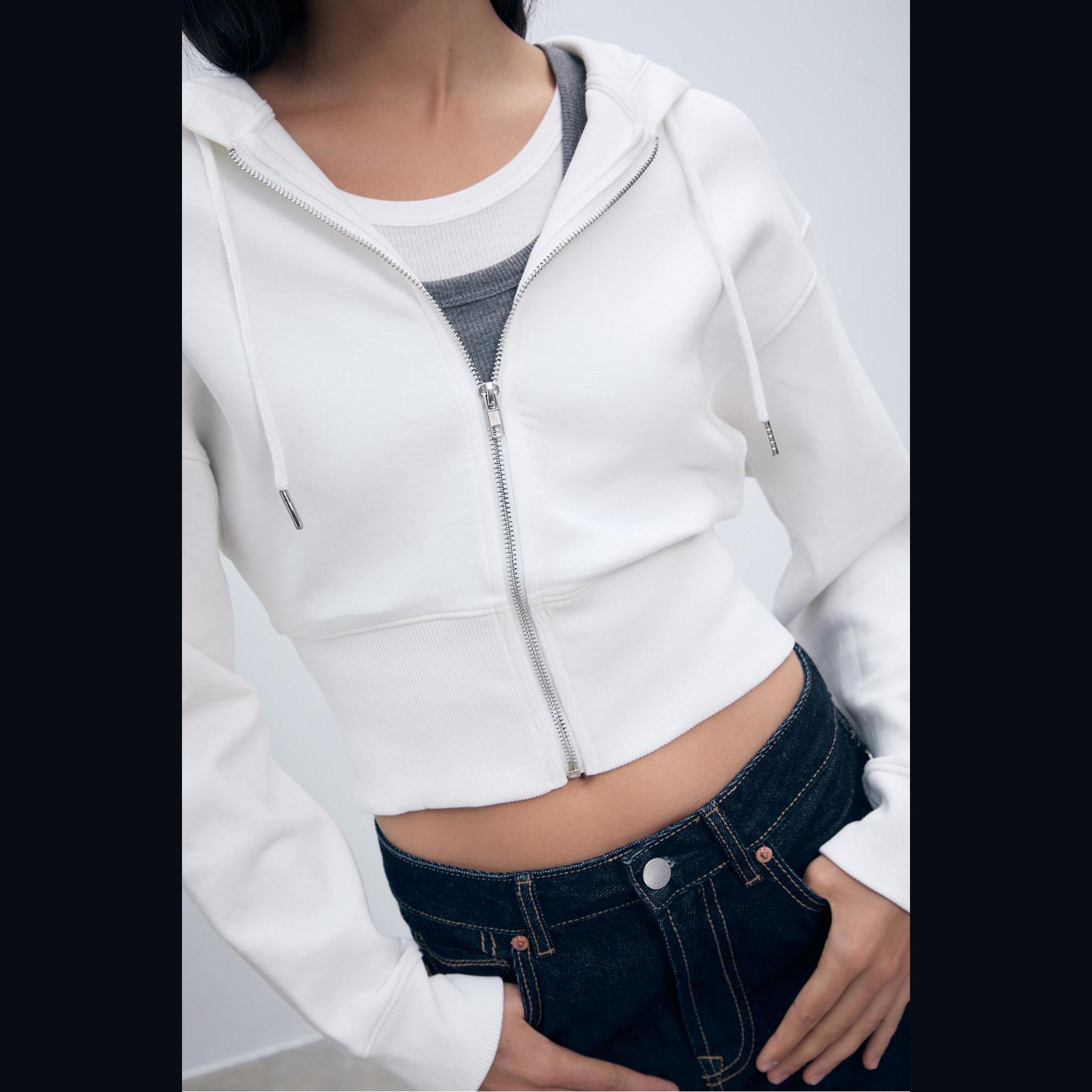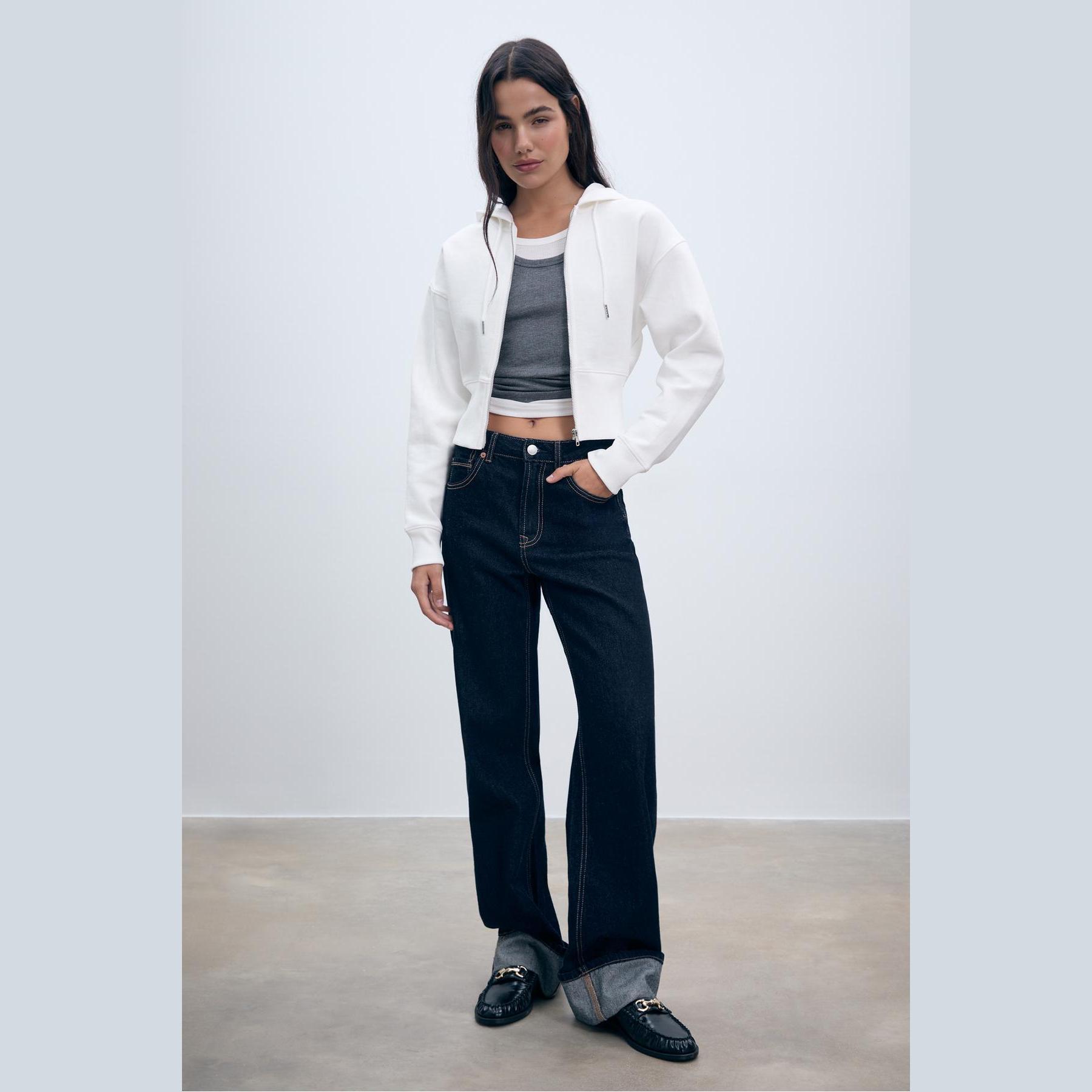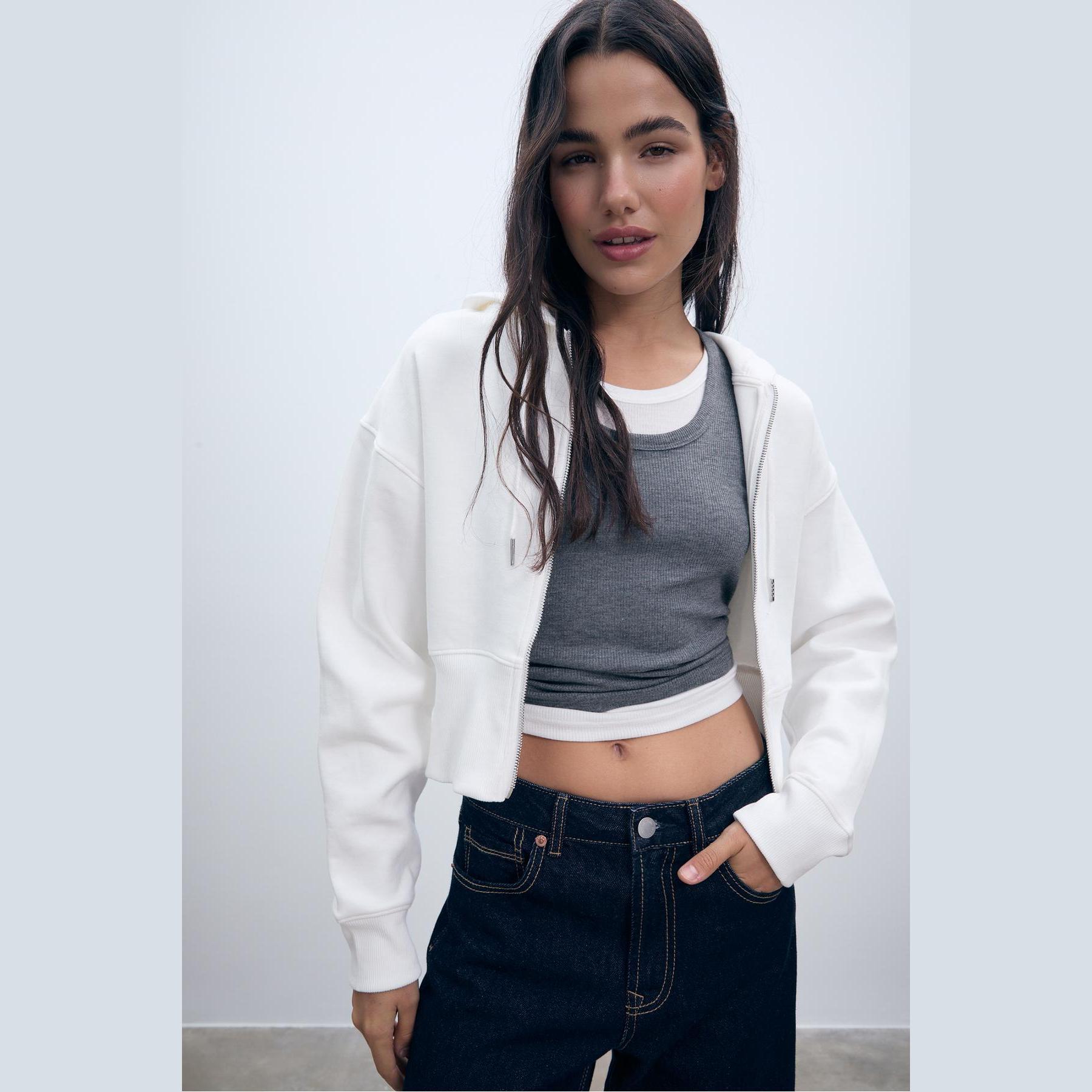 سويت شيرت عملي من Stradivarius بلون إكرو، مصنوع من خامة ناعمة بتركيبة 84% قطن، 11% بوليستر، 5% إيلاستان، يتميز بقصة Comfort مريحة، غطاء رأس قابل للتعديل بخيوط، سحاب أمامي كامل، أكمام طويلة، أطراف وأساور Ribana مرنة، تصميم سادة بدون طبعات، ملمس داخلي ناعم بشاردون، مزود بجيب كنغر أمامي، مثالي للتنسيق مع جينز أو ليغينغ لإطلالة كاجوال يومية.