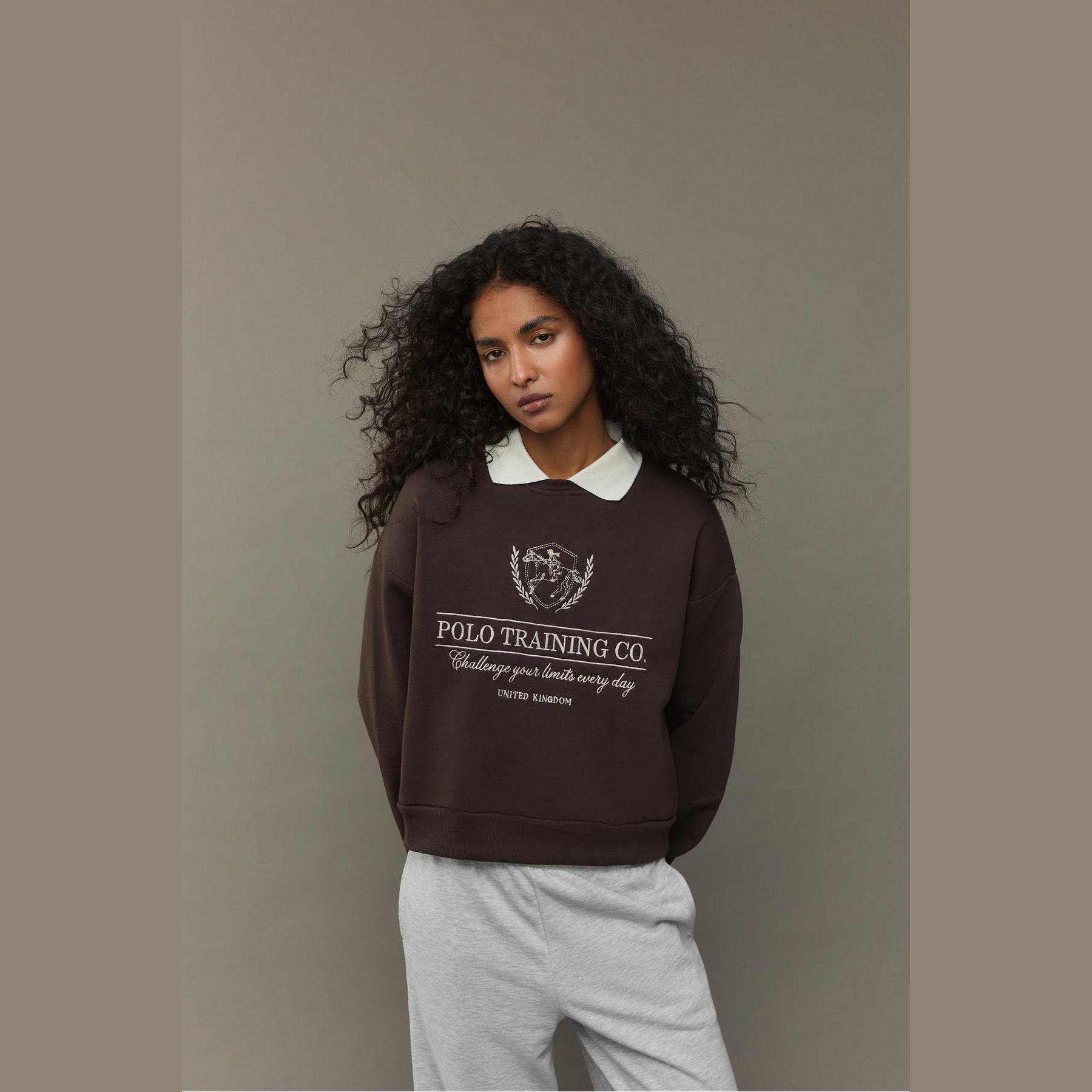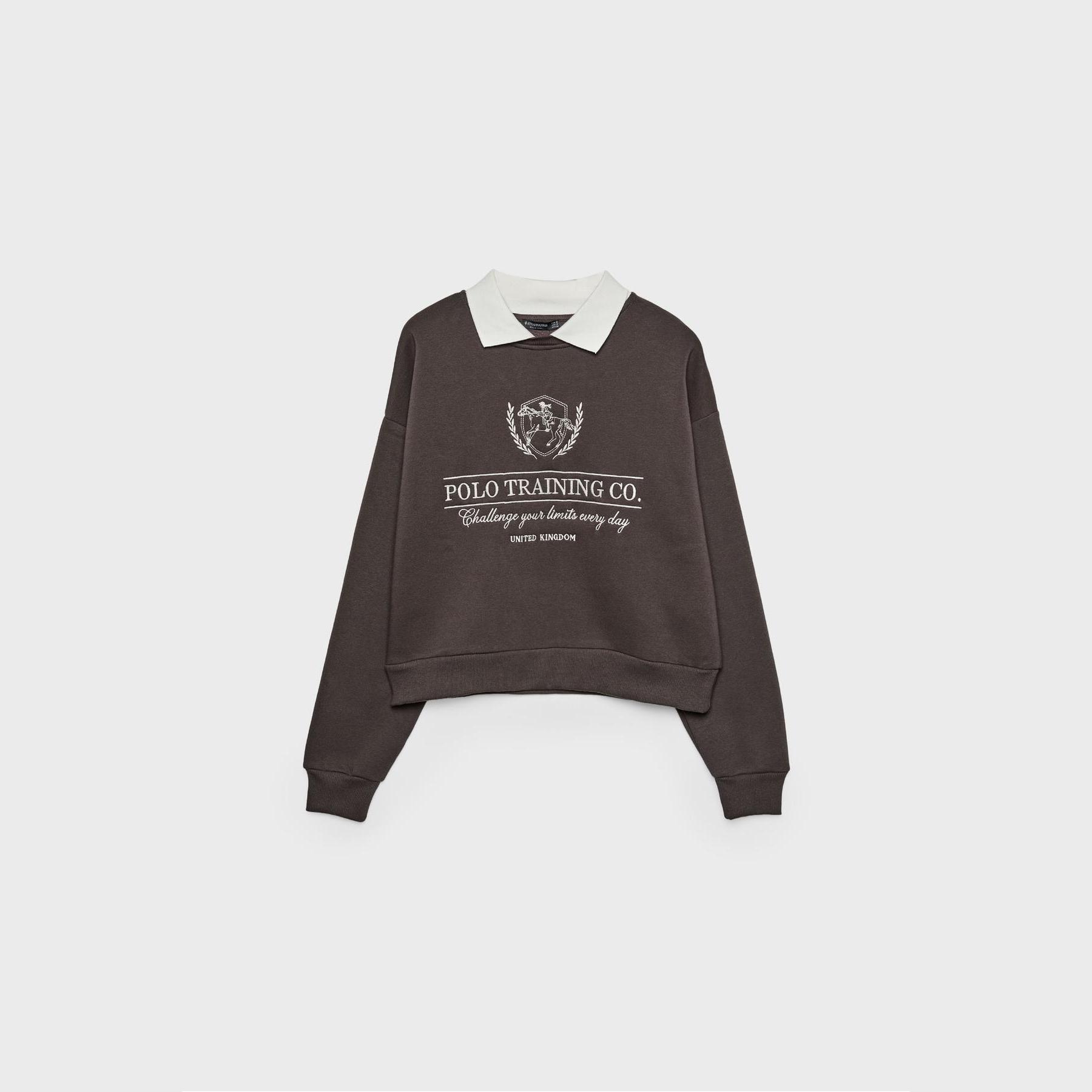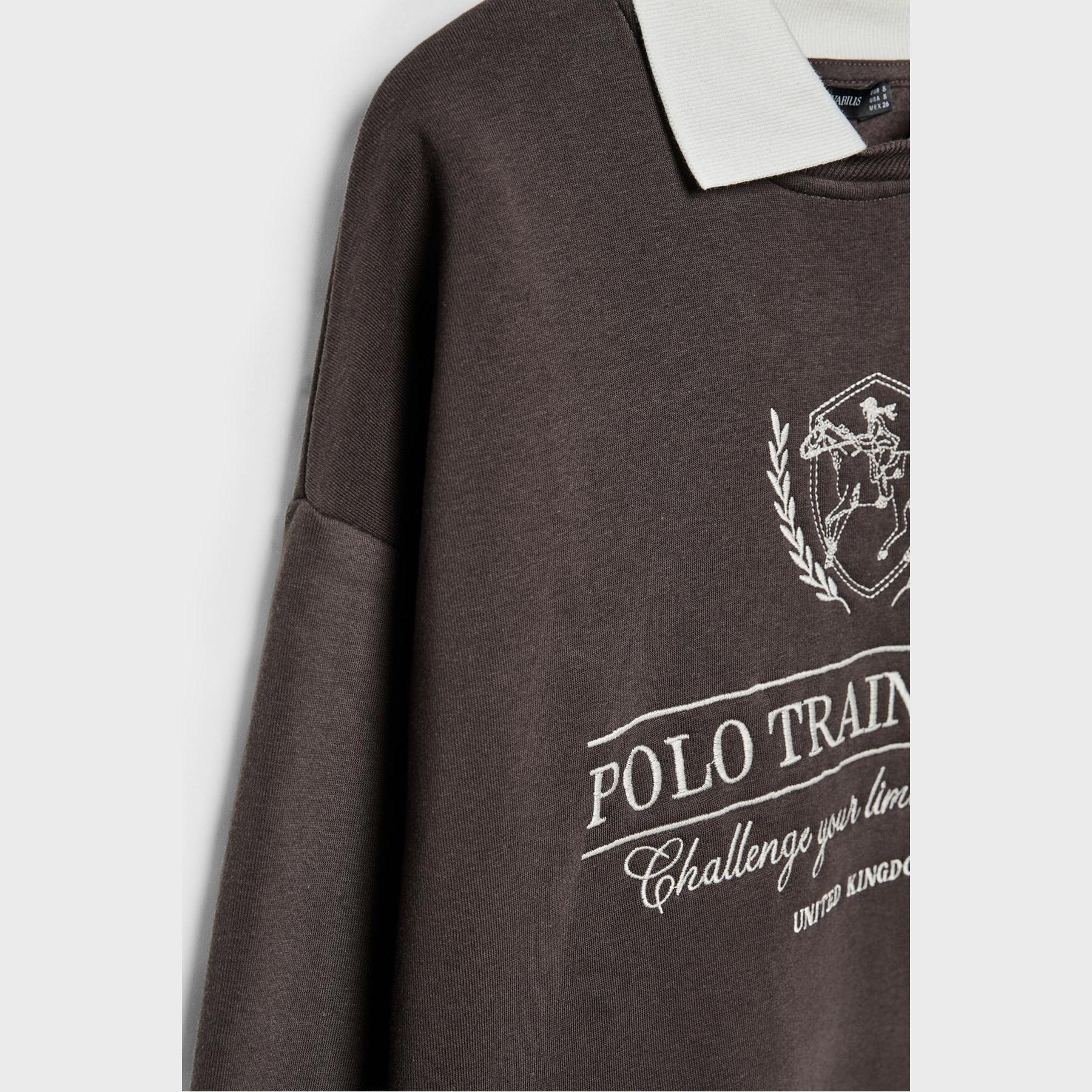 سويت شيرت بياقة بولو وتطريز أمامي – بني من Stradivarius