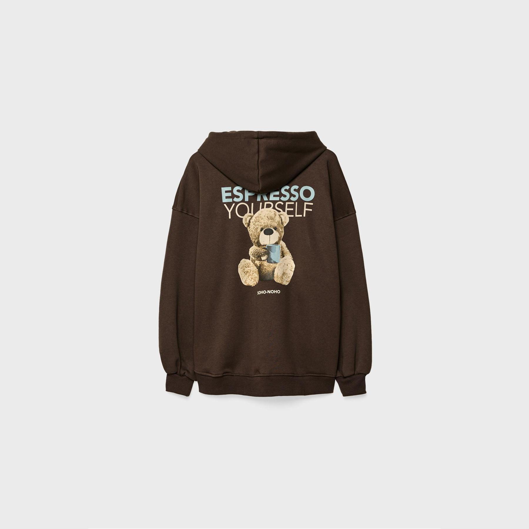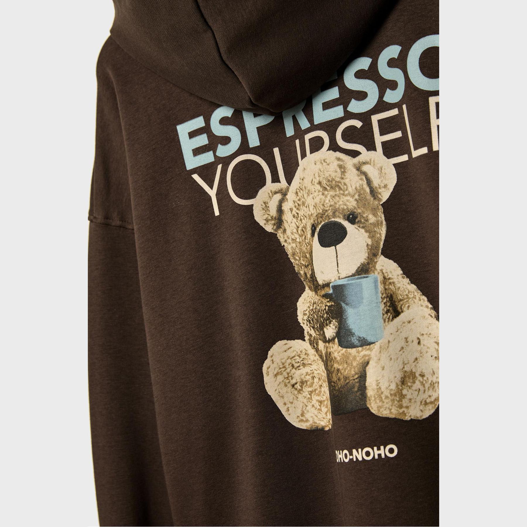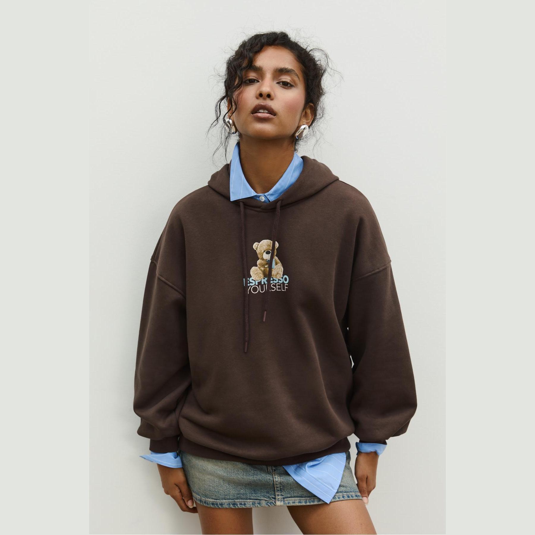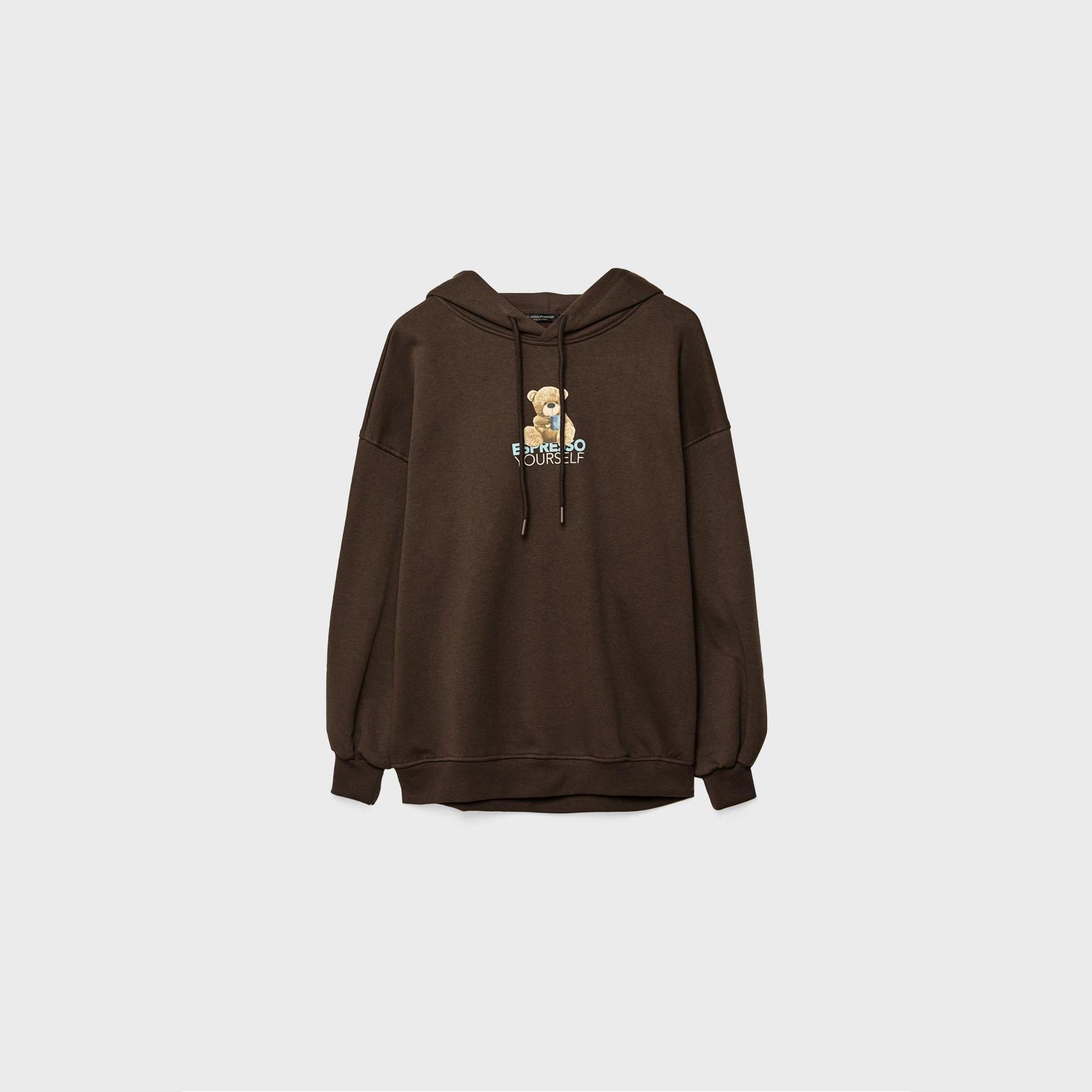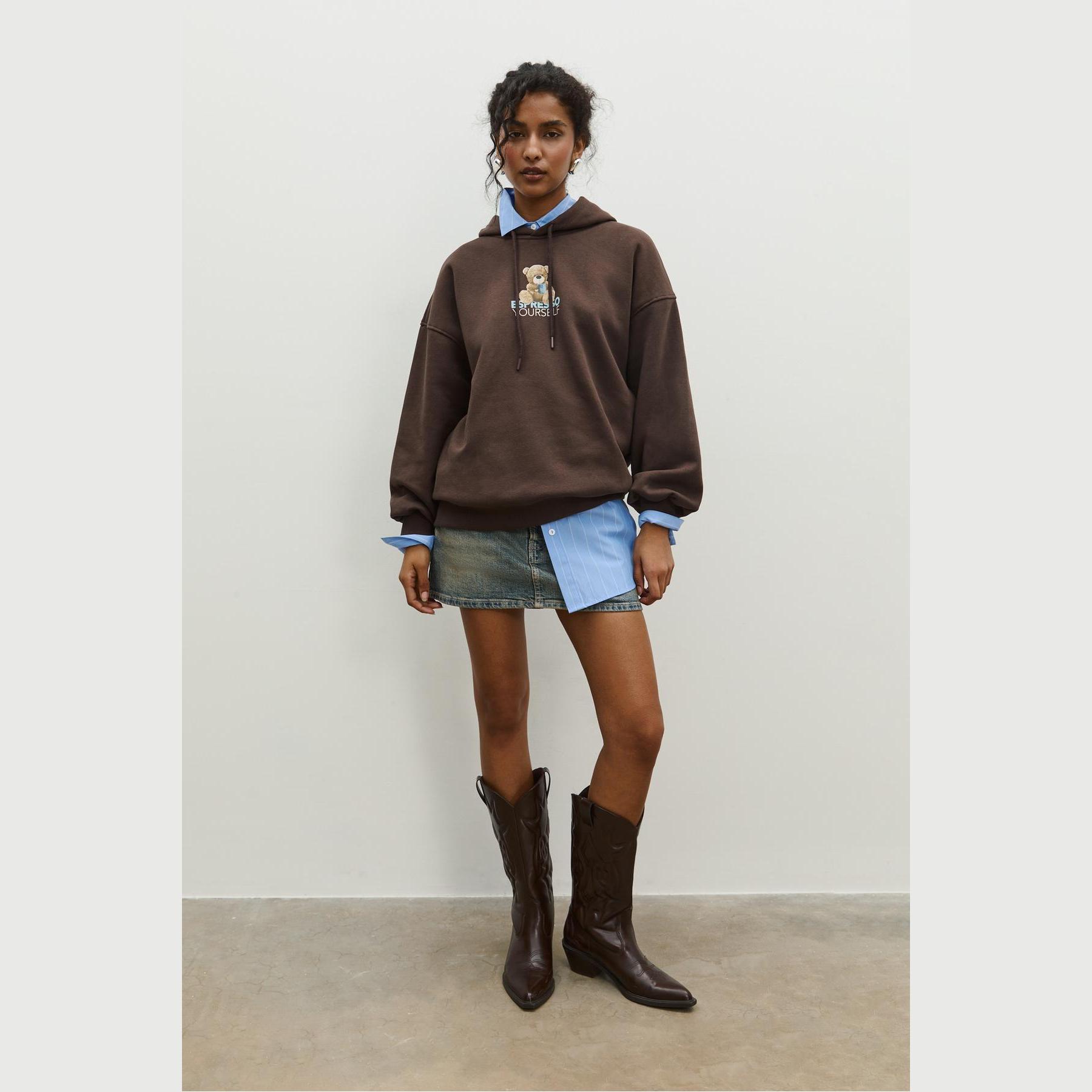 سويت شيرت شبابي من Stradivarius بلون بني، مصنوع من خامة ناعمة بتركيبة 71% قطن، 28% بوليستر، 1% إيلاستان، يتميز بقصة Regular مريحة، غطاء رأس قابل للتعديل بخيوط، فتحة رقبة دائرية (Bisiklet Yaka)، أكمام طويلة، أطراف وأساور Ribana مرنة، تصميم بطبعة جرافيك على الصدر والظهر، ملمس داخلي ناعم، بدون جيوب، مثالي للتنسيق مع جينز أو ليغينغ لإطلالة كاجوال حضرية.