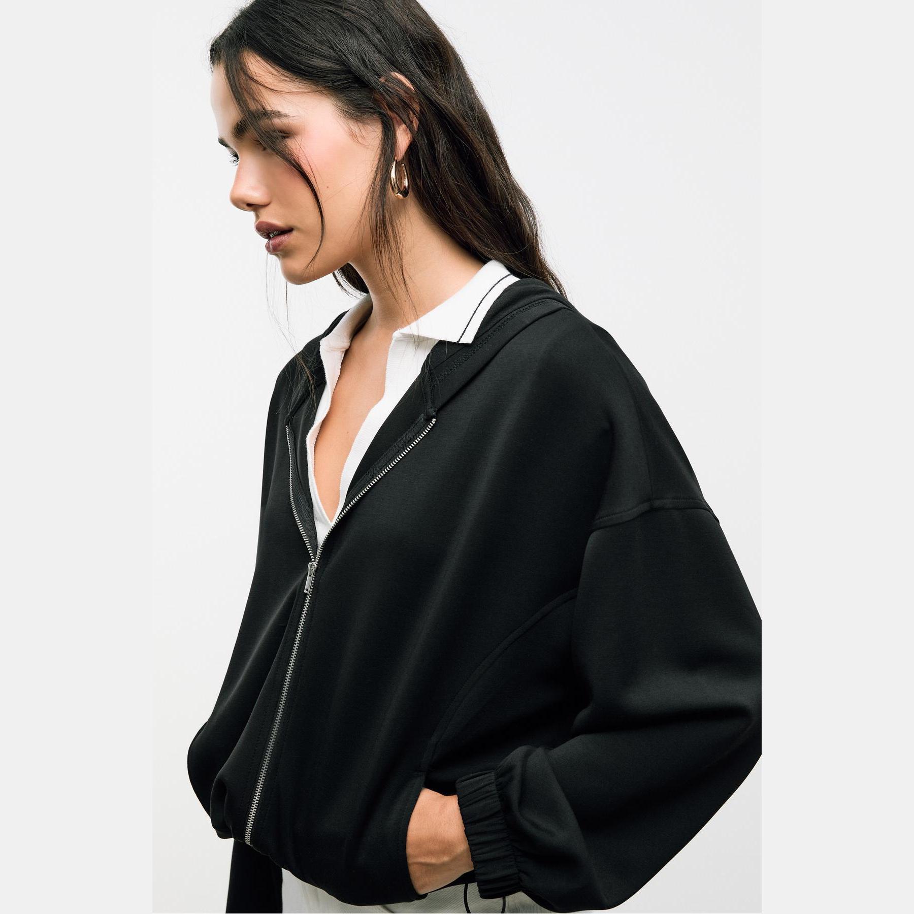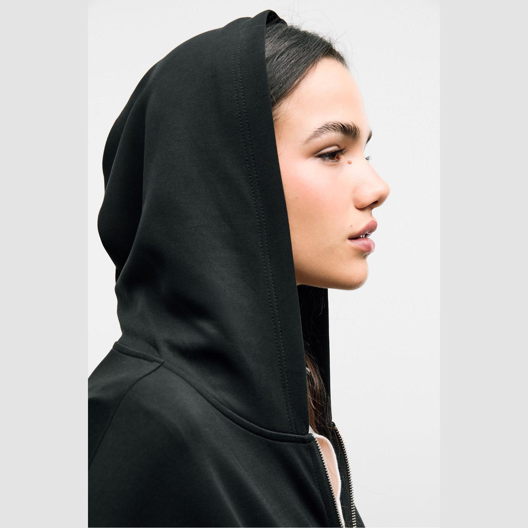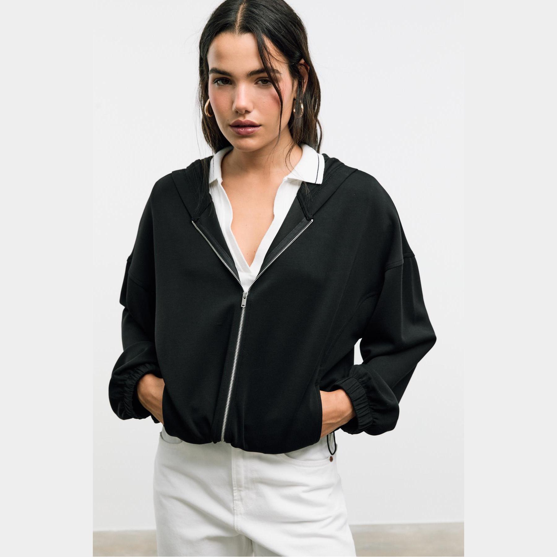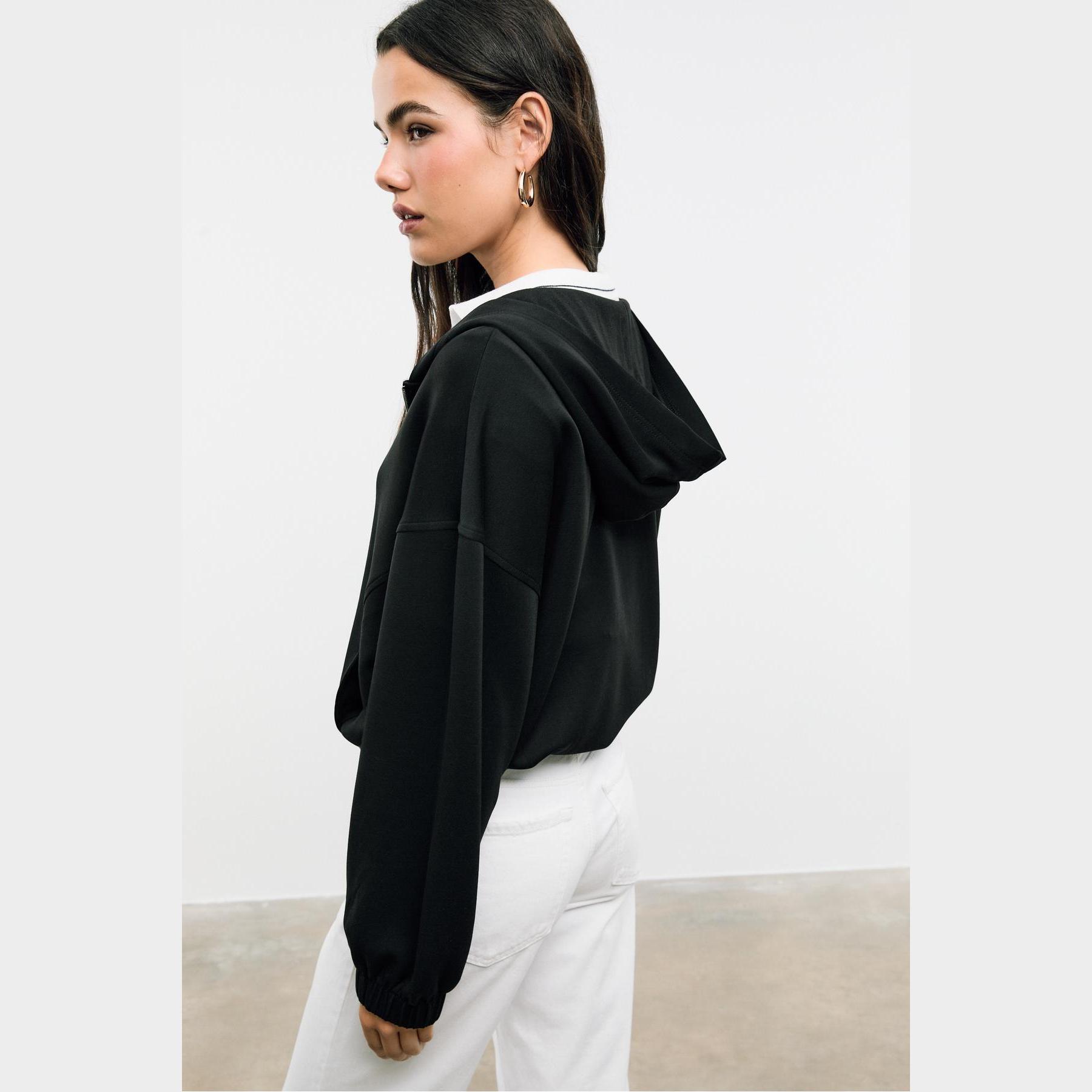 سويت شيرت عملي من Stradivarius بلون أسود، مصنوع من خامة فاخرة بتركيبة 49% مودال، 42% بوليستر، 9% إيلاستان، يتميز بقصة Comfort مريحة، غطاء رأس قابل للتعديل بخيوط وستوبر، سحاب أمامي كامل، أكمام طويلة مع أطراف وأساور Ribana مرنة، تصميم سادة بدون طبعات، مزود بجيبين جانبيين، نهاية سفلية منتفخة قابلة للتعديل، ملمس داخلي ناعم، مثالي للتنسيق مع جينز أو ليغينغ لإطلالة كاجوال يومية.
