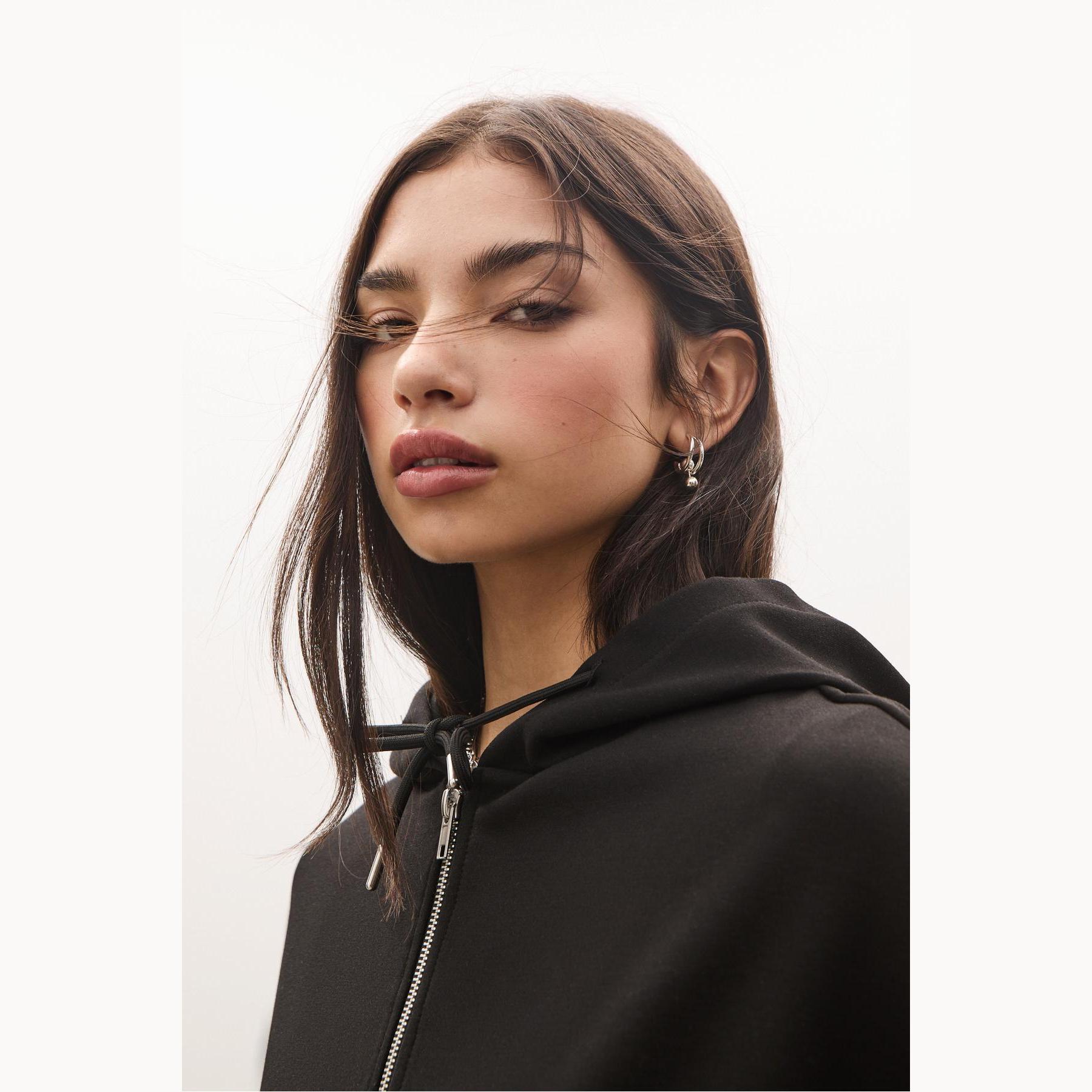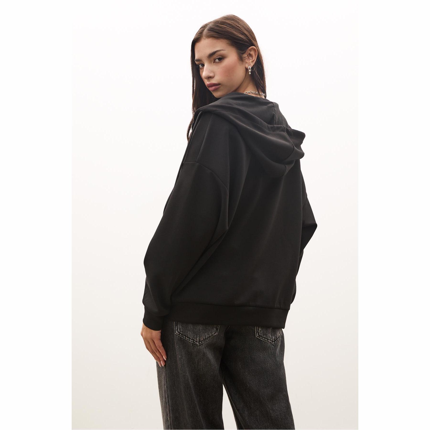 سويت شيرت عملي من Stradivarius بلون أسود، مصنوع من خامة ناعمة بتركيبة 77% بوليستر، 16% فيسكوز، 7% إيلاستان، يتميز بقصة Oversize مريحة، غطاء رأس قابل للتعديل بخيوط، سحاب أمامي كامل، أكمام طويلة مع أساور وأطراف Ribana مرنة، تصميم سادة بدون طبعات، مزود بجيبين أماميين، ملمس داخلي ناعم، مثالي للتنسيق مع جينز أو بنطال رياضي لإطلالة كاجوال يومية.