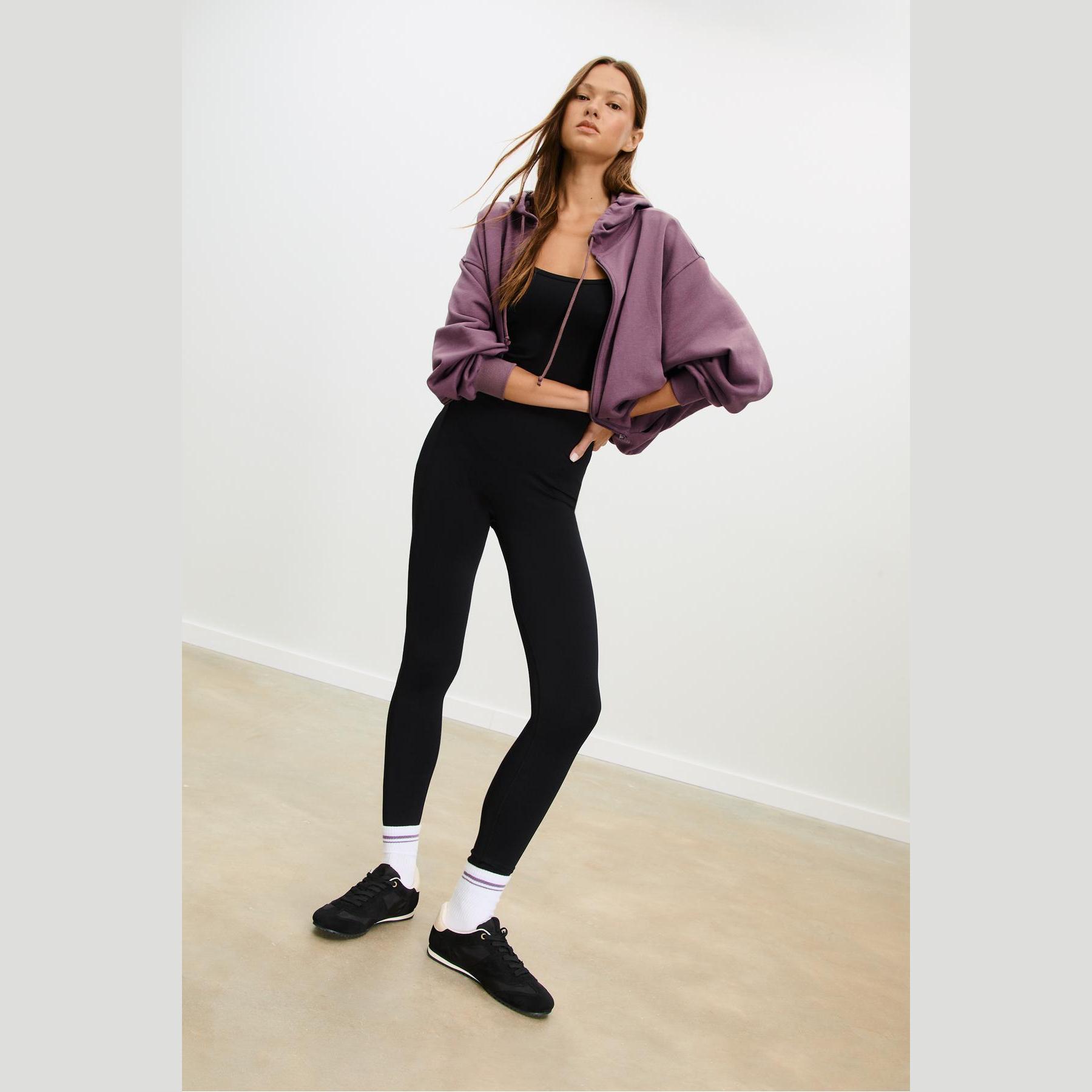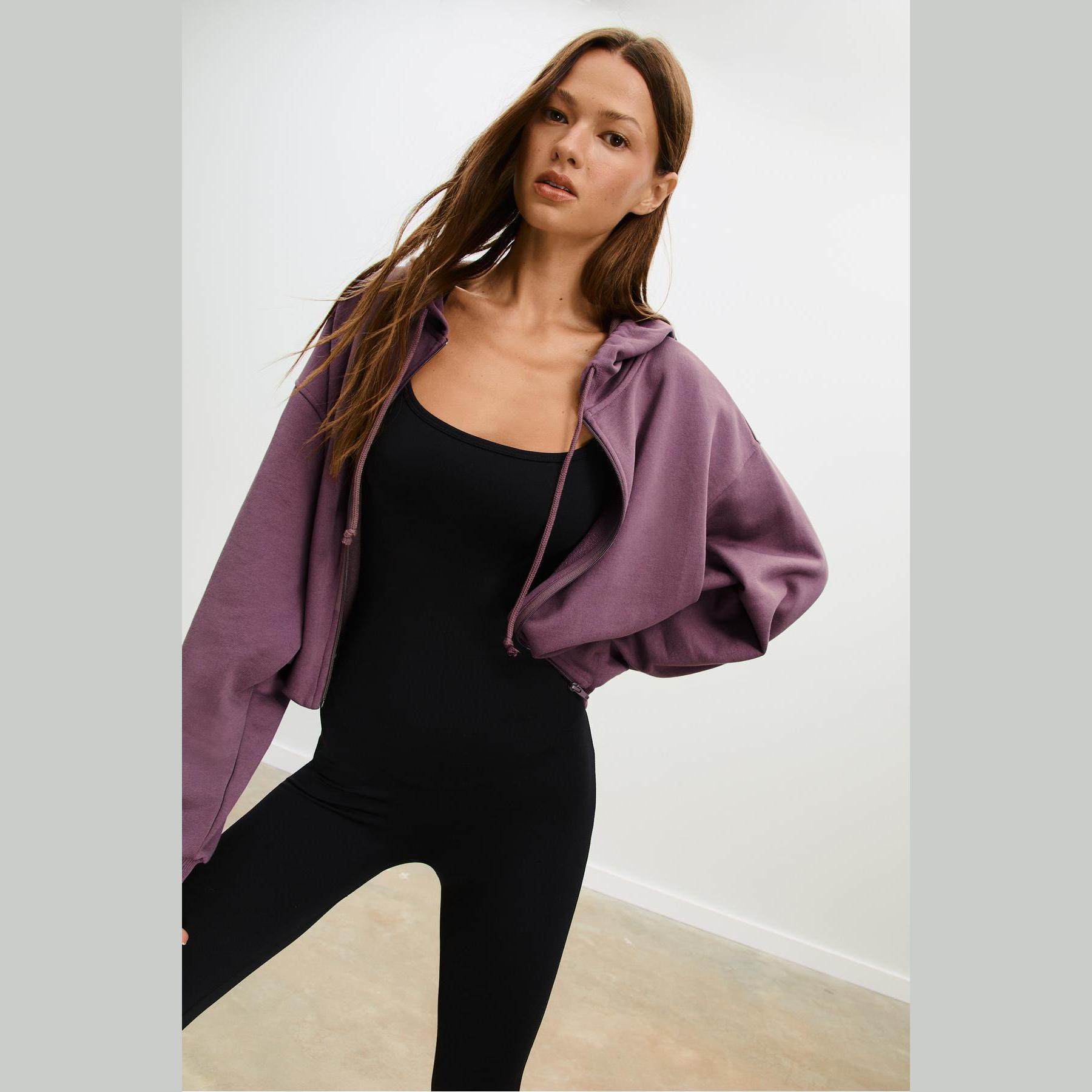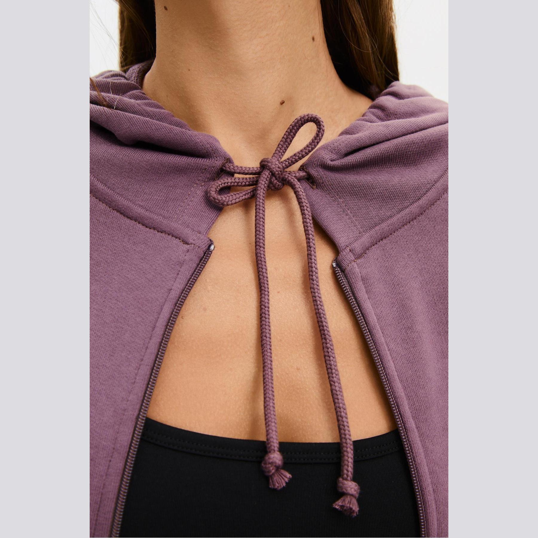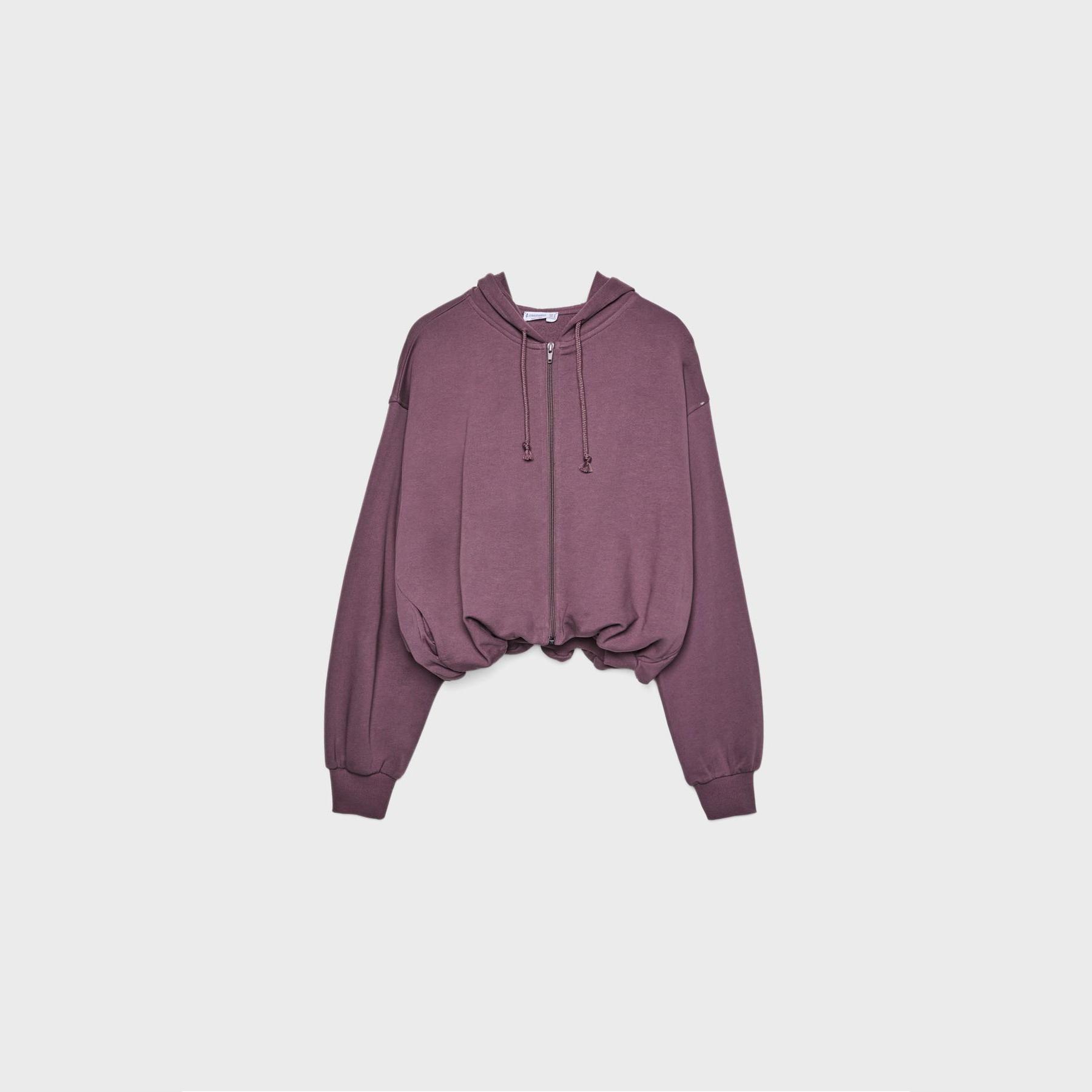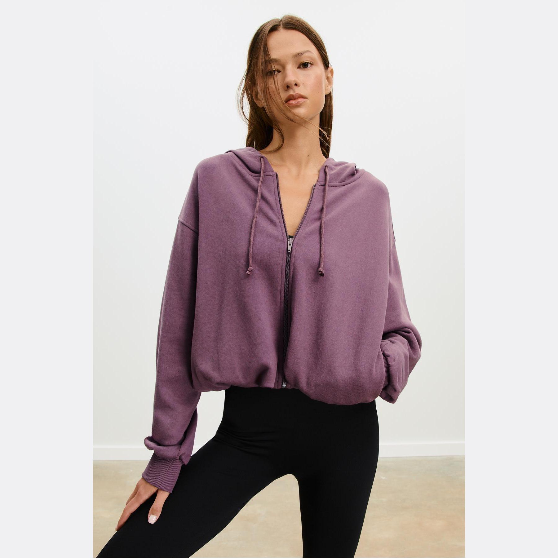 سويت شيرت عملي من Stradivarius بلون بنفسجي، مصنوع من خامة ناعمة بتركيبة 99% قطن، 1% إيلاستان، يتميز بقصة Comfort مريحة، غطاء رأس قابل للتعديل بخيوط، سحاب أمامي كامل، فتحة رقبة دائرية، أكمام طويلة، أطراف وأساور Ribana مرنة، تصميم سادة بدون طبعات، مزود بجيبين جانبيين، نهاية سفلية بُزُغية قابلة للتعديل، ملمس داخلي ناعم بدون شاردون، مثالي للتنسيق مع جينز أو ليغينغ لإطلالة كاجوال يومية.