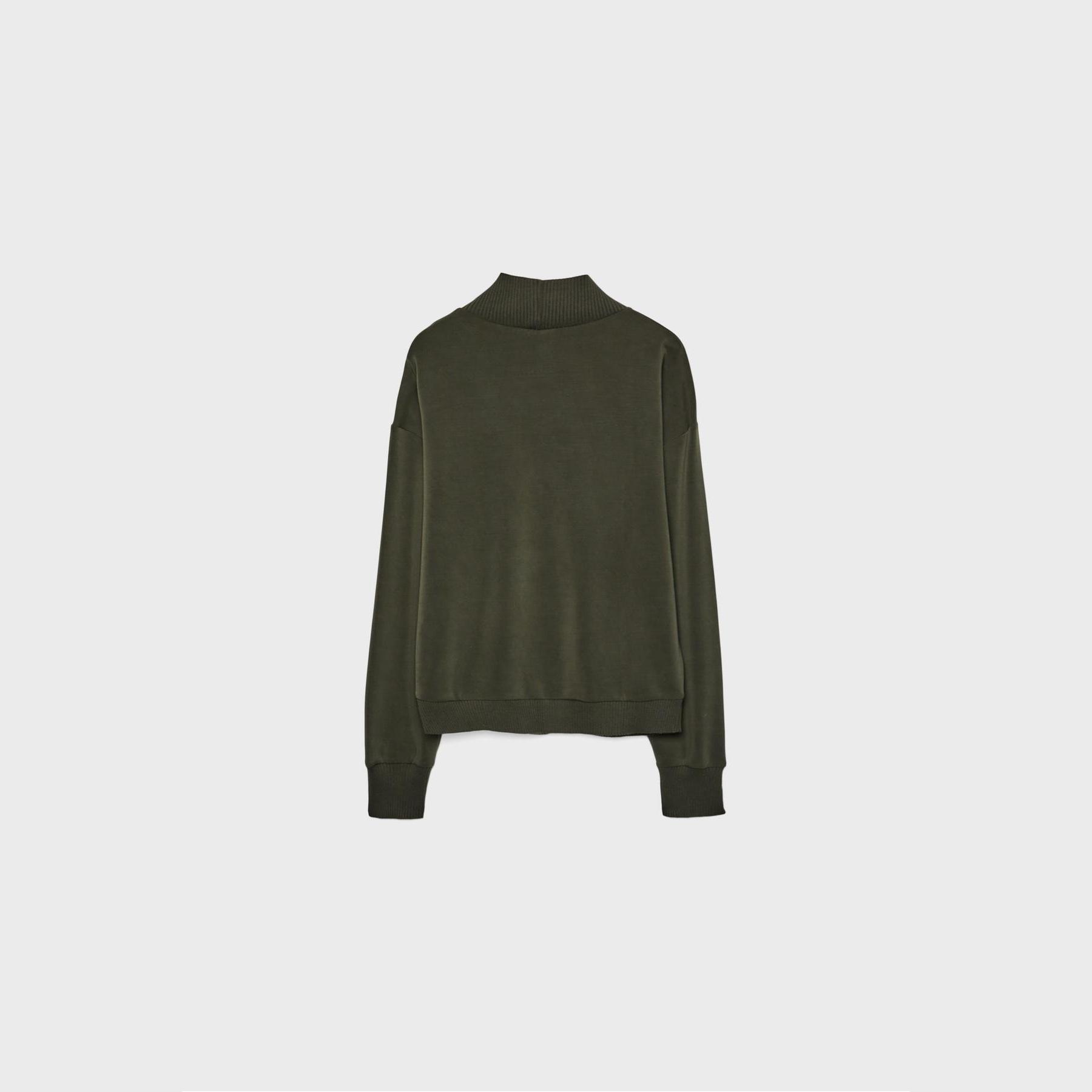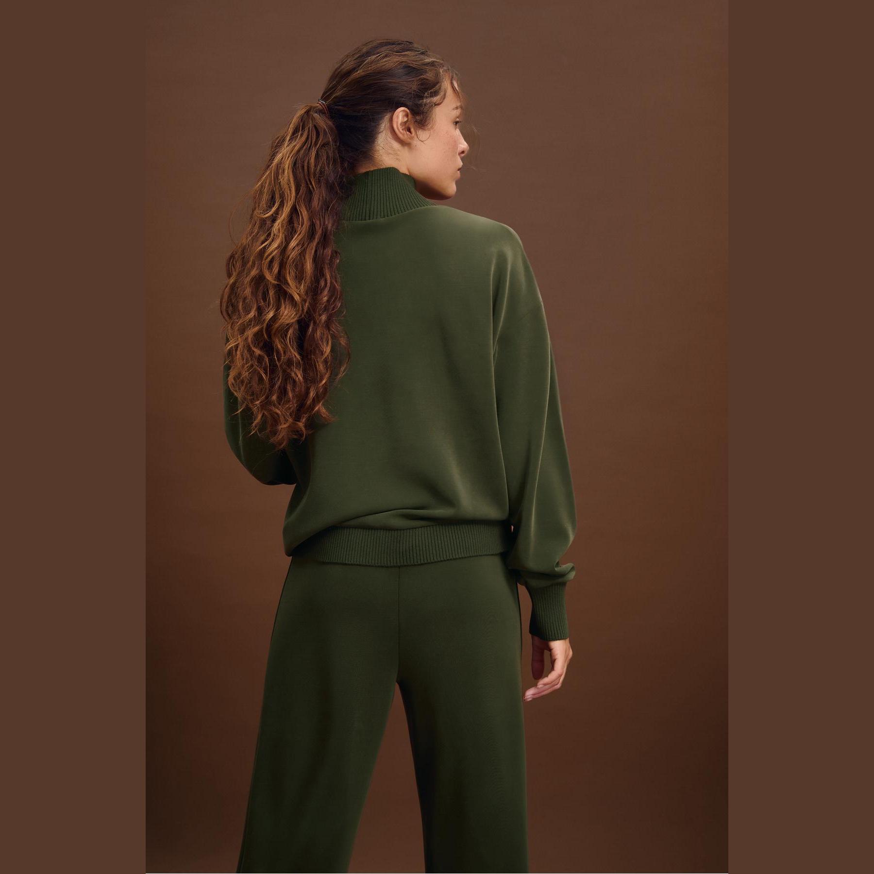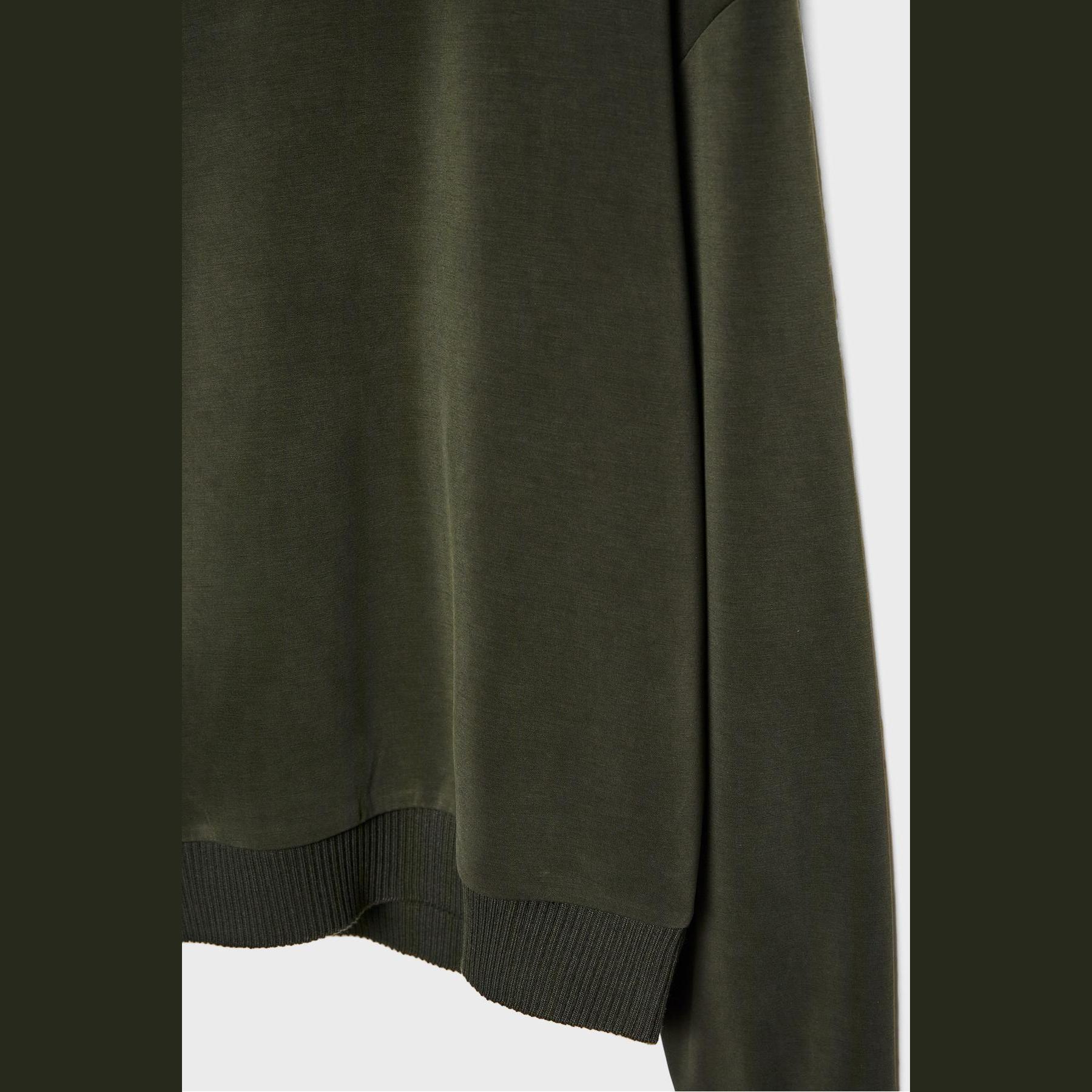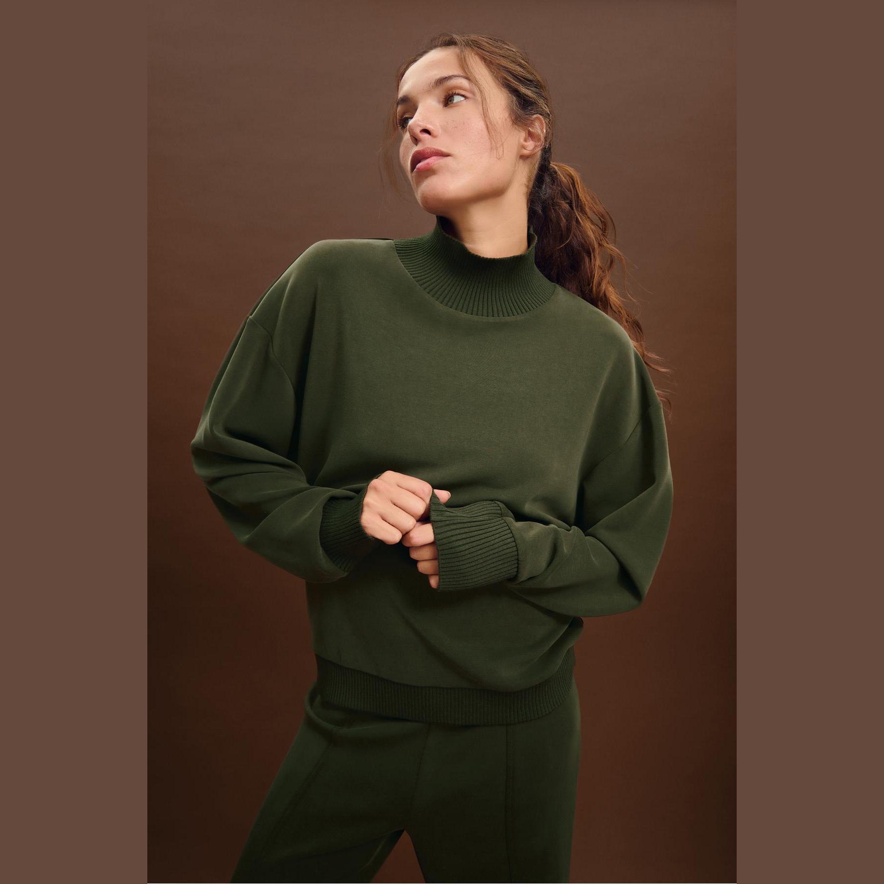 سويت شيرت أنيق من Stradivarius بلون أخضر داكن، مصنوع من خامة ناعمة بتركيبة 46% مودال، 44% بوليستر، 10% إيلاستان، يتميز بقصة Regular مريحة وياقة نصف مرتفعة (Yarım Balıkçı Yaka)، أكمام طويلة، أطراف وأساور Ribana مرنة، تصميم سادة بدون طبعات، ملمس داخلي ناعم، بدون جيوب، مثالي للتنسيق مع جينز أو بنطال قماشي لإطلالة كاجوال أنيقة.