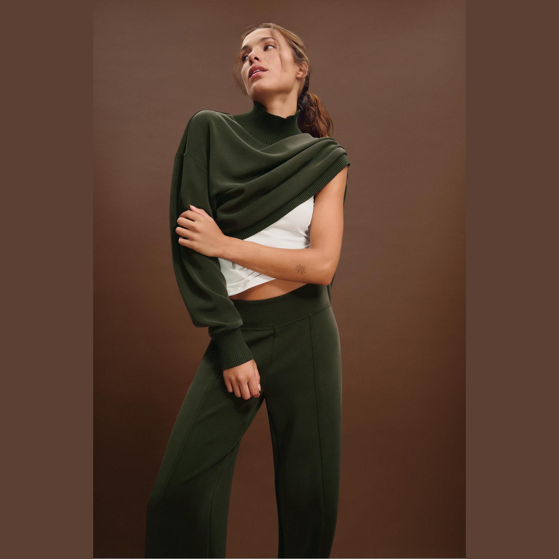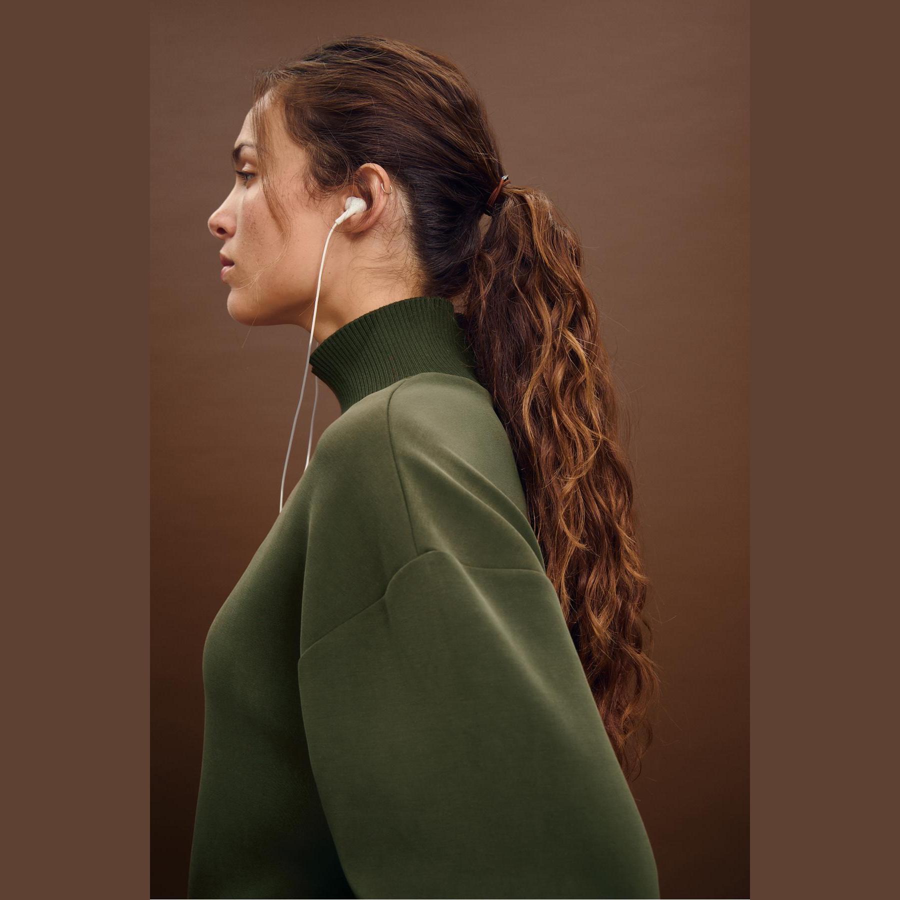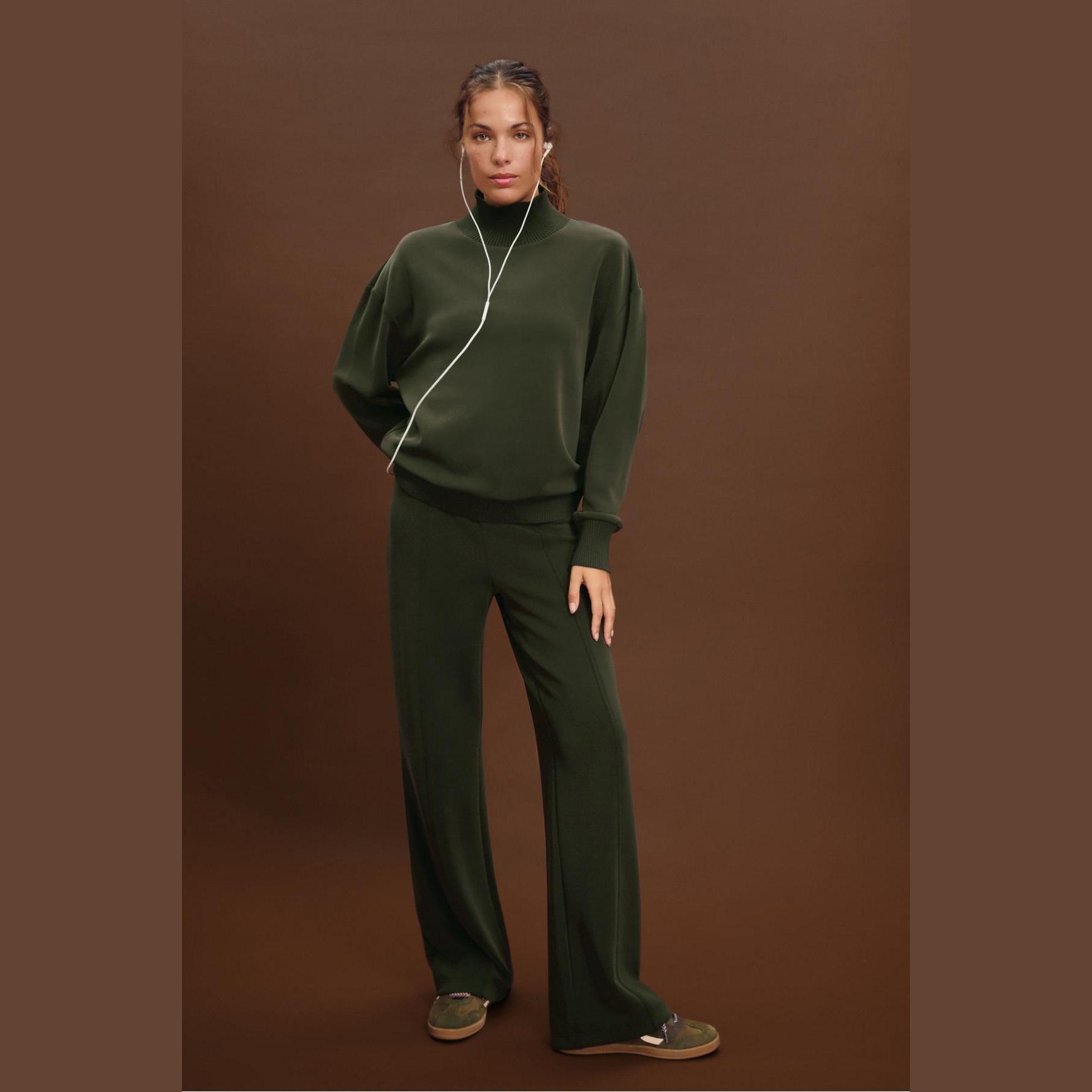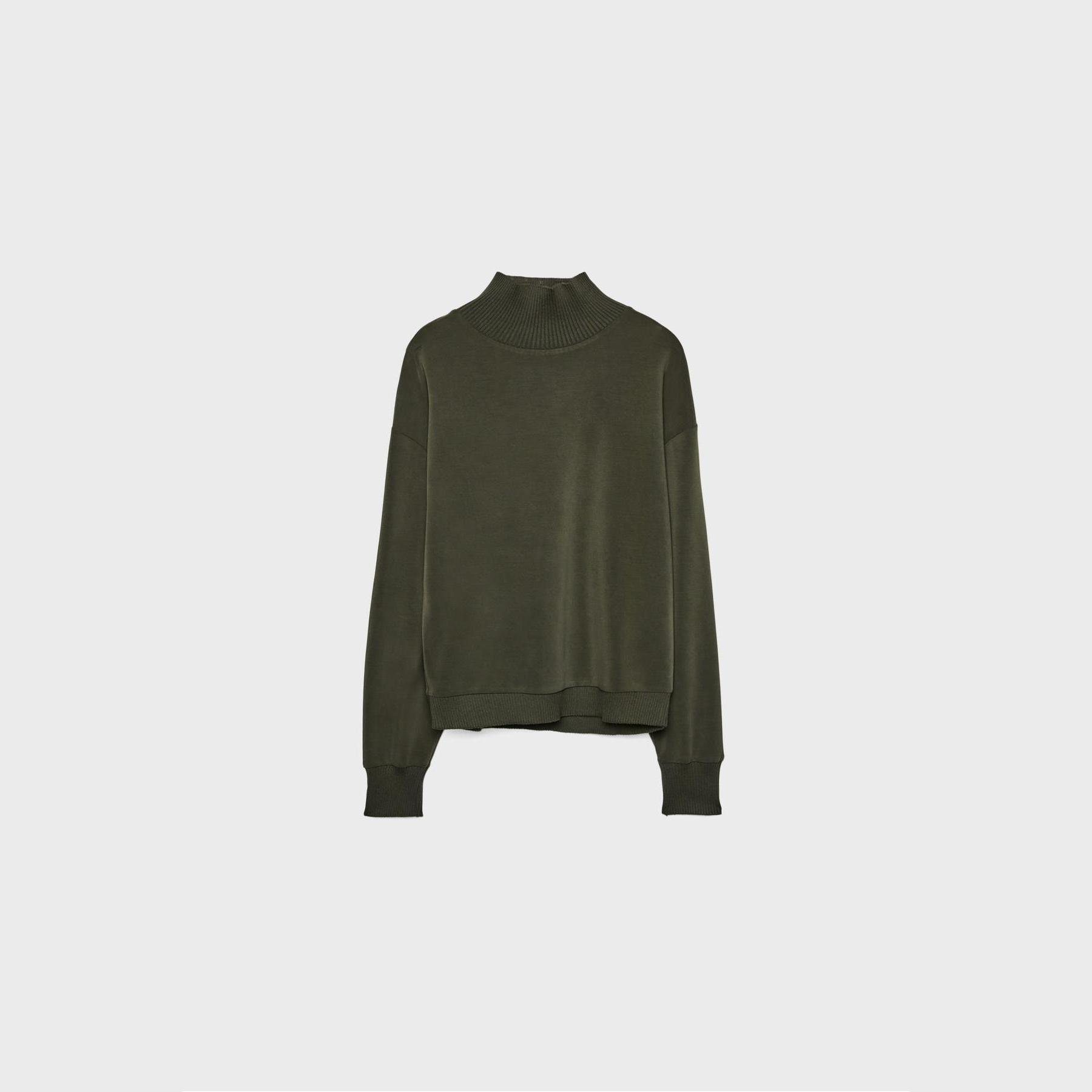 سويت شيرت أنيق من Stradivarius بلون أخضر داكن، مصنوع من خامة ناعمة بتركيبة 46% مودال، 44% بوليستر، 10% إيلاستان، يتميز بقصة Regular مريحة وياقة نصف مرتفعة (Yarım Balıkçı Yaka)، أكمام طويلة، أطراف وأساور Ribana مرنة، تصميم سادة بدون طبعات، ملمس داخلي ناعم، بدون جيوب، مثالي للتنسيق مع جينز أو بنطال قماشي لإطلالة كاجوال أنيقة.