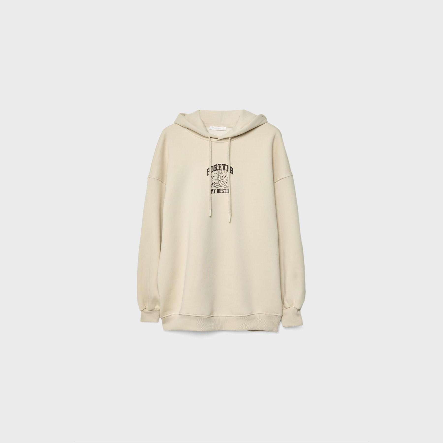 سويت شيرت شبابي من Stradivarius بلون كريمي، مصنوع من خامة ناعمة بتركيبة 65% قطن، 35% بوليستر، يتميز بقصة Regular مريحة، غطاء رأس قابل للتعديل، فتحة رقبة دائرية (Bisiklet Yaka)، أكمام طويلة، أطراف وأساور Ribana مرنة، تصميم بطبعة جرافيك على الصدر والظهر، ملمس داخلي ناعم، بدون جيوب، مثالي للتنسيق مع جينز أو ليغينغ لإطلالة كاجوال حضرية.