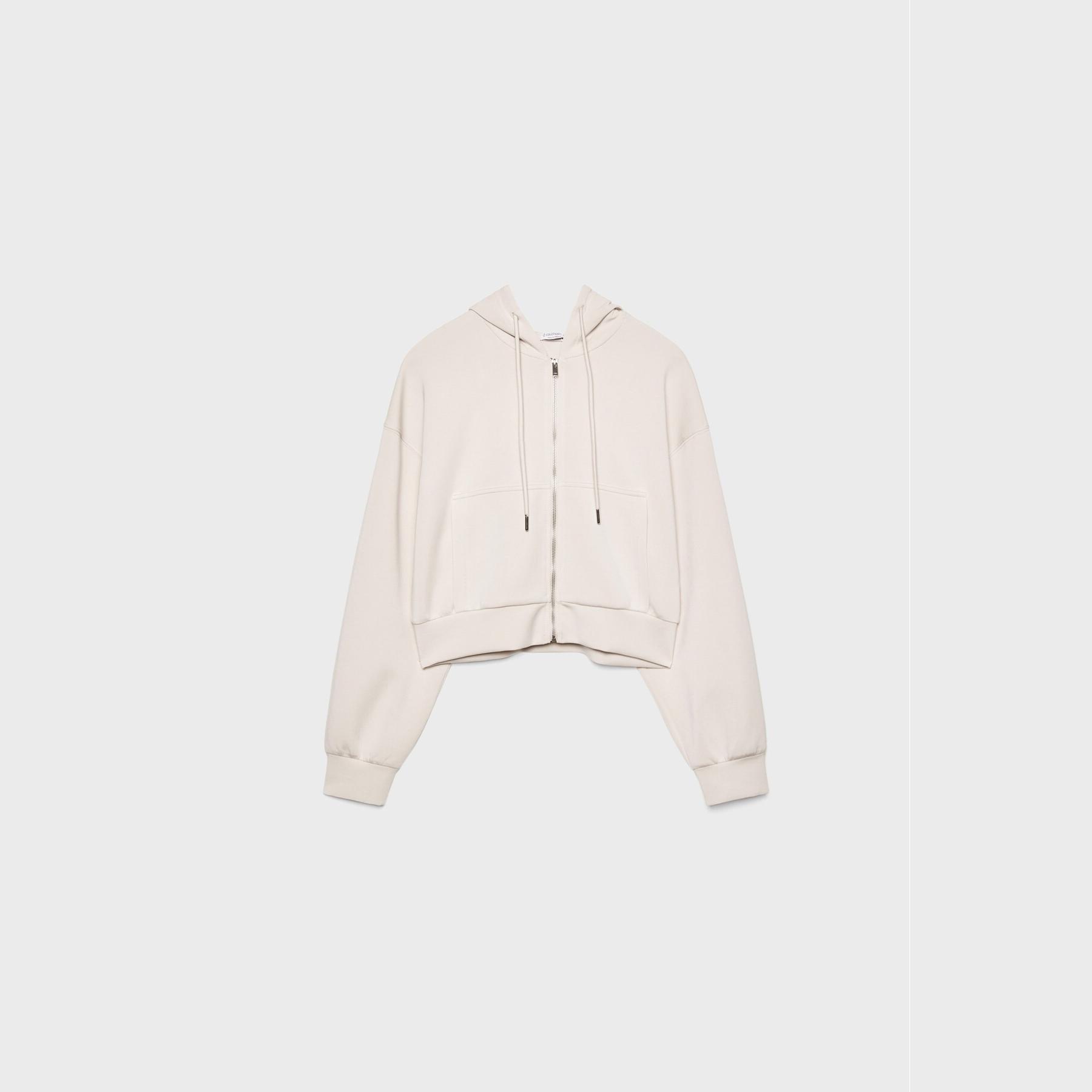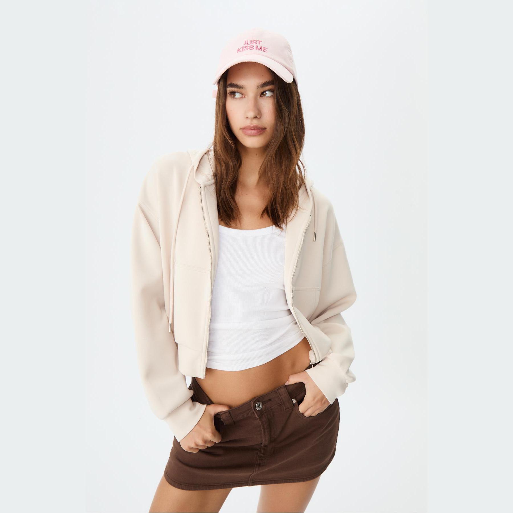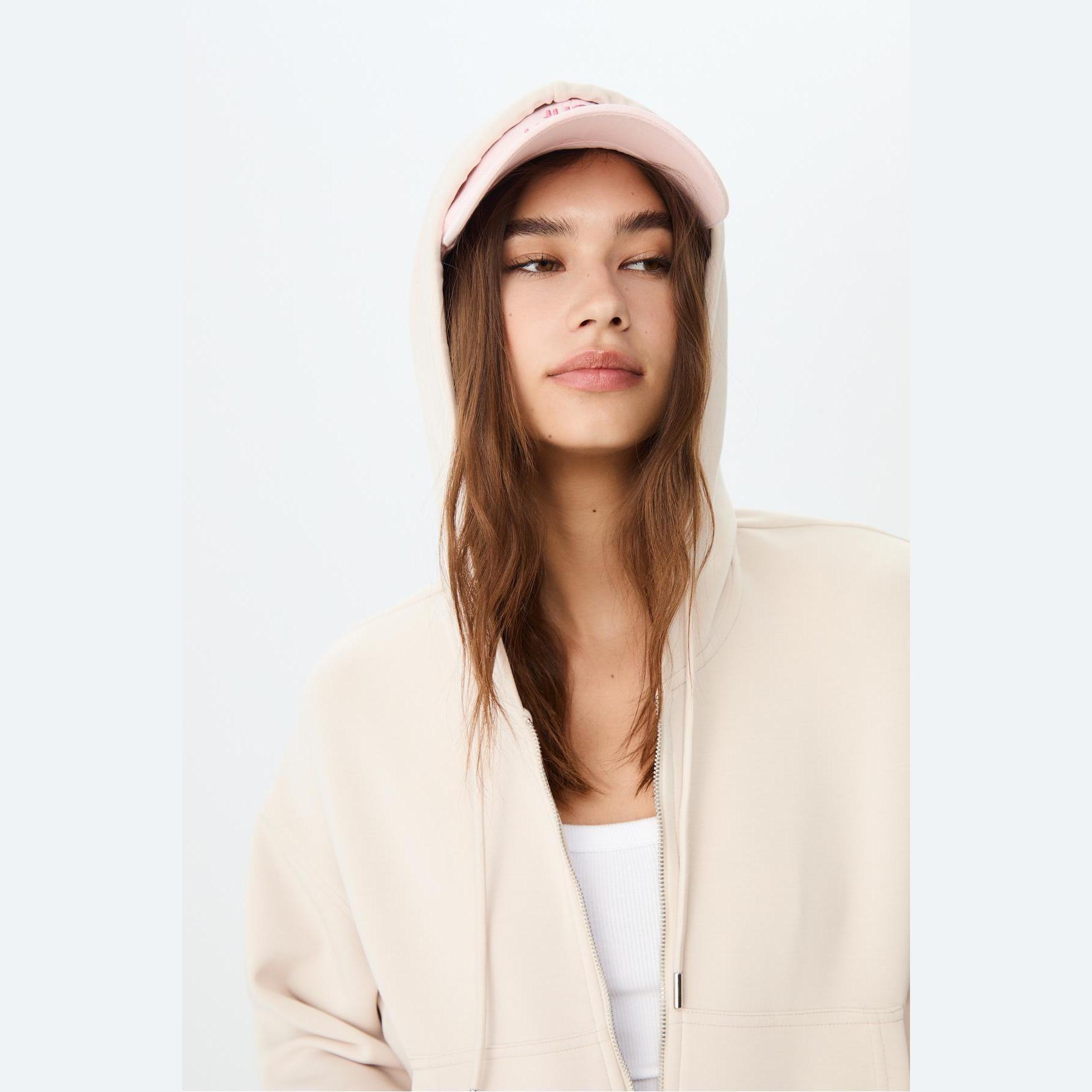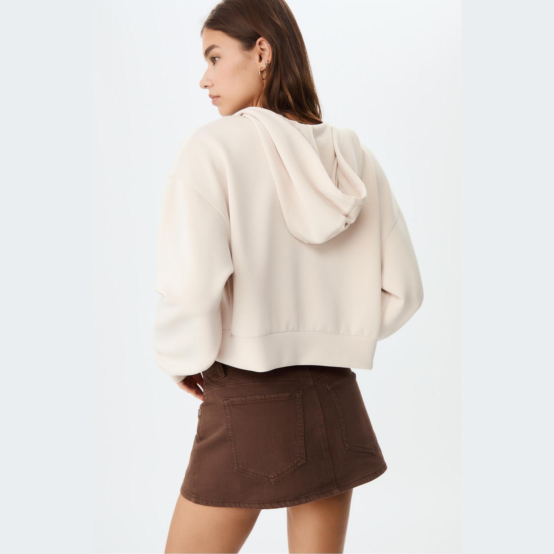 سويت شيرت عملي من Stradivarius بلون كريمي، مصنوع من خامة ناعمة بتركيبة 49% مودال، 42% بوليستر، 9% إيلاستان، يتميز بقصة Comfort Fit، ياقة دائرية، أكمام طويلة، سحاب معدني أمامي، مزود بقبعة قابلة للتعديل عبر رباط داخلي، جيبين جانبيين، تصميم سادة بملمس مغسول، بدون بطانة، ملمس داخلي ناعم، مثالي للتنسيق مع بنطال Jogger أو جينز لإطلالة كاجوال مريحة.