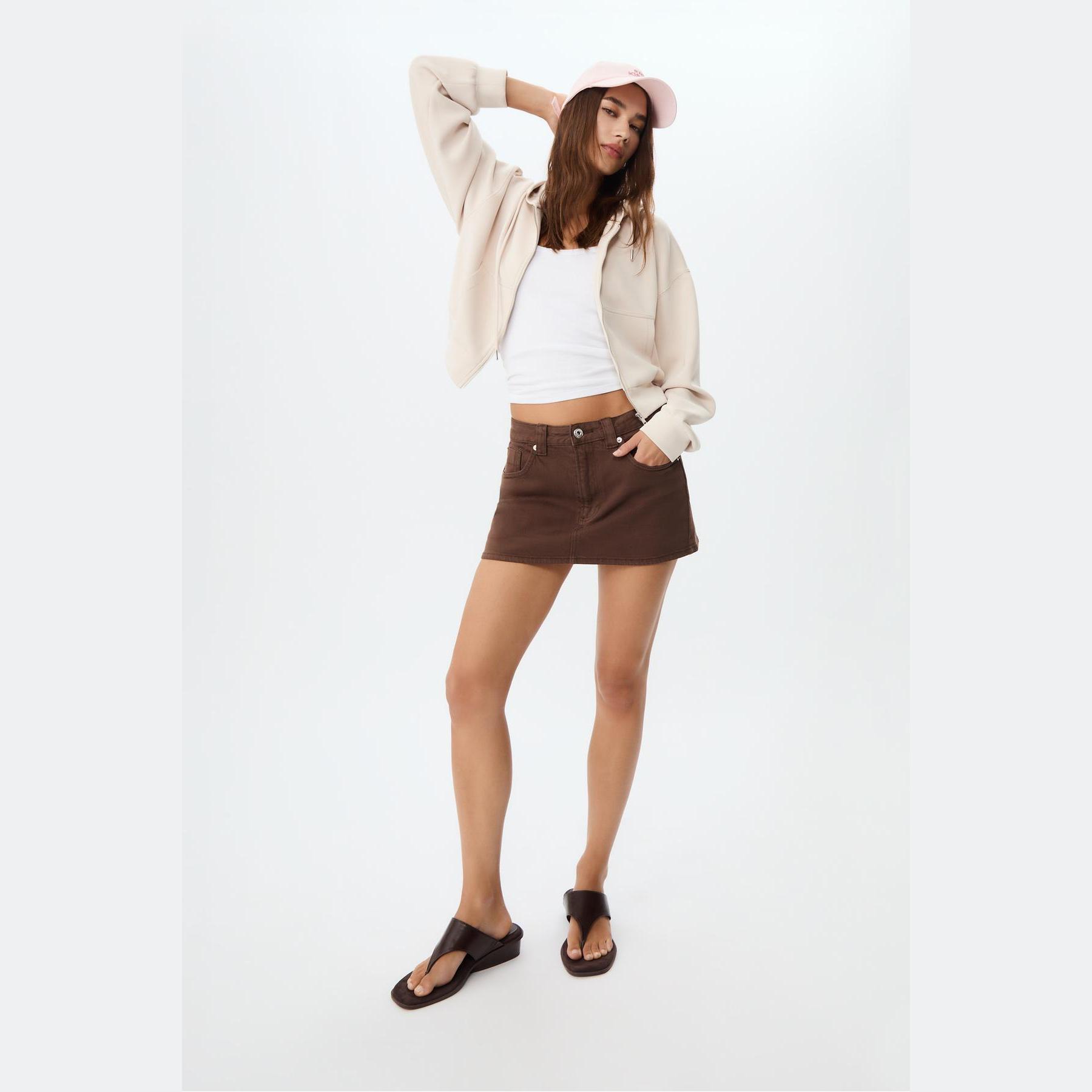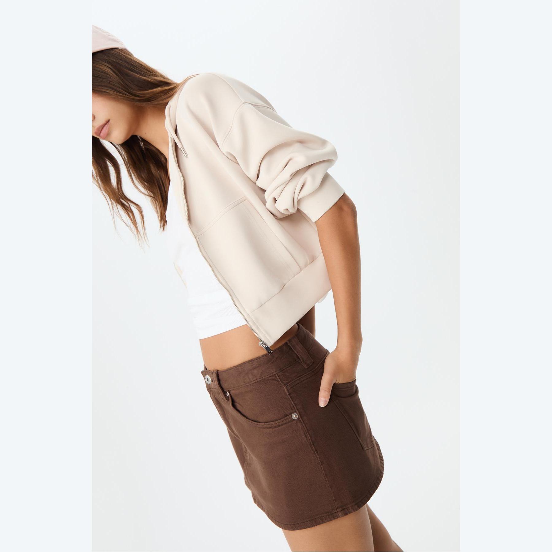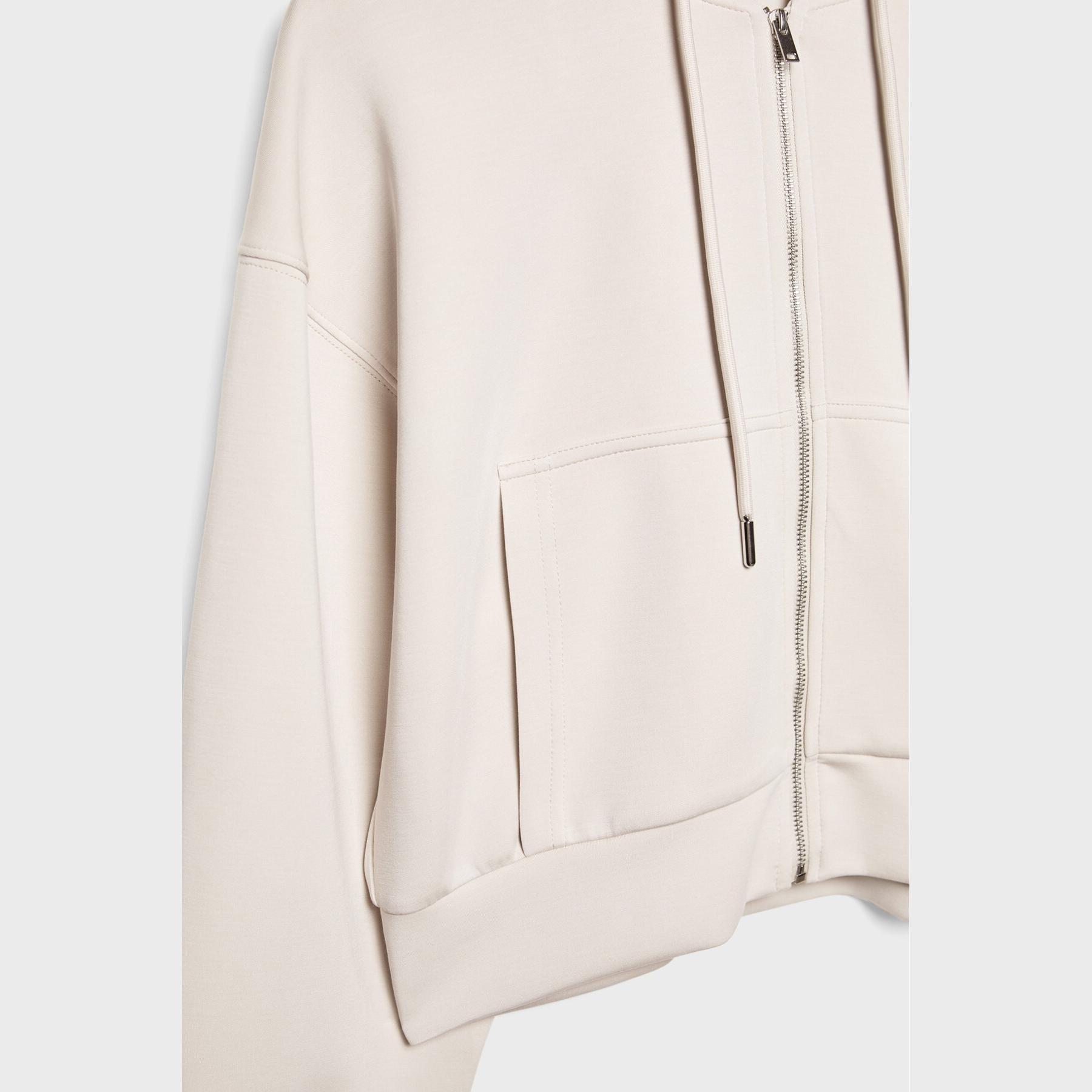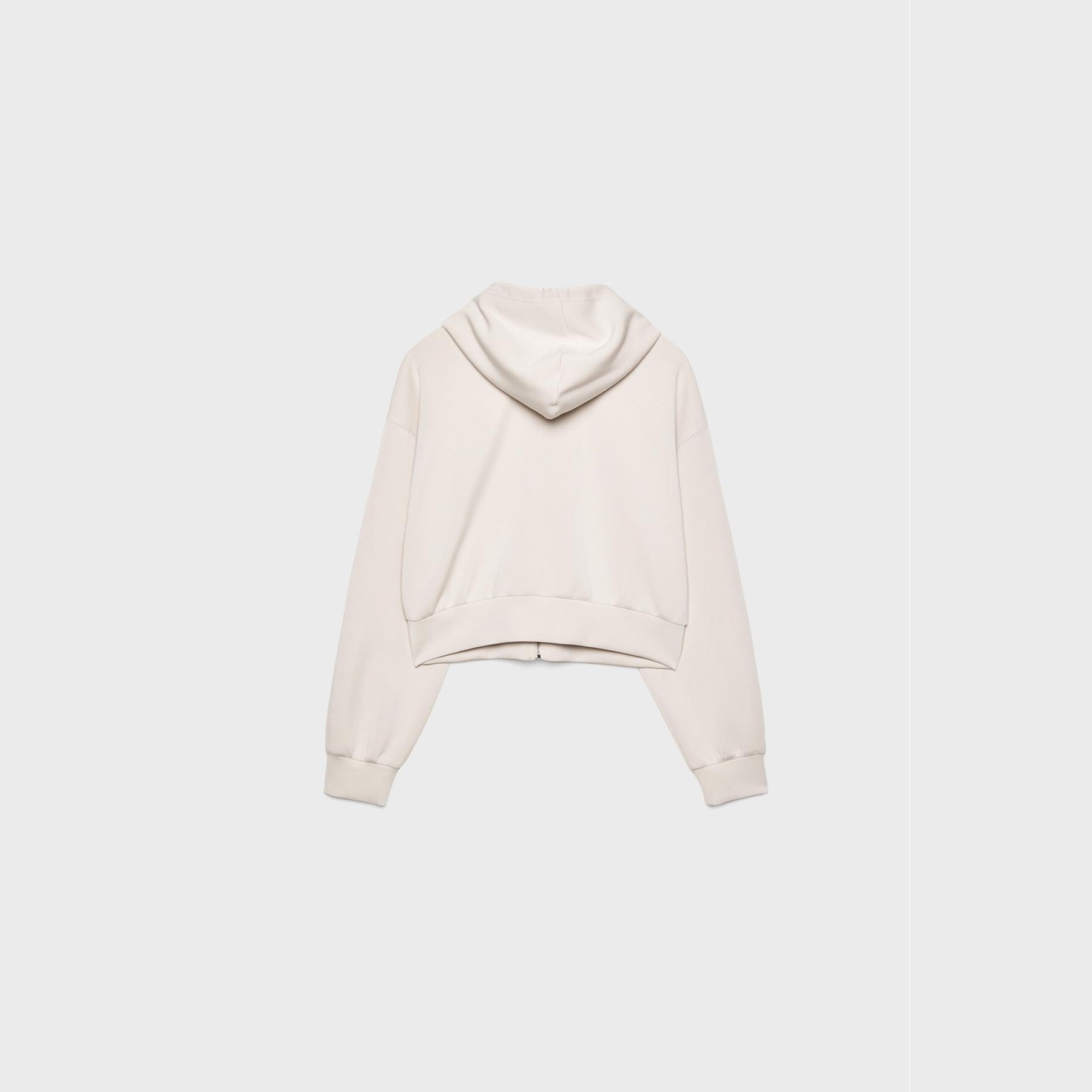 سويت شيرت عملي من Stradivarius بلون كريمي، مصنوع من خامة ناعمة بتركيبة 49% مودال، 42% بوليستر، 9% إيلاستان، يتميز بقصة Comfort Fit، ياقة دائرية، أكمام طويلة، سحاب معدني أمامي، مزود بقبعة قابلة للتعديل عبر رباط داخلي، جيبين جانبيين، تصميم سادة بملمس مغسول، بدون بطانة، ملمس داخلي ناعم، مثالي للتنسيق مع بنطال Jogger أو جينز لإطلالة كاجوال مريحة.
