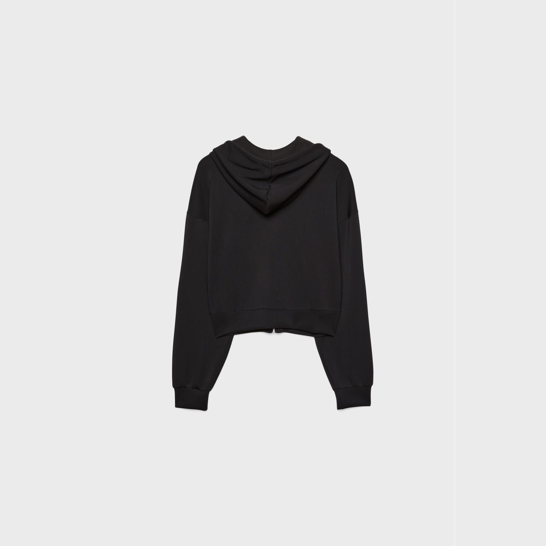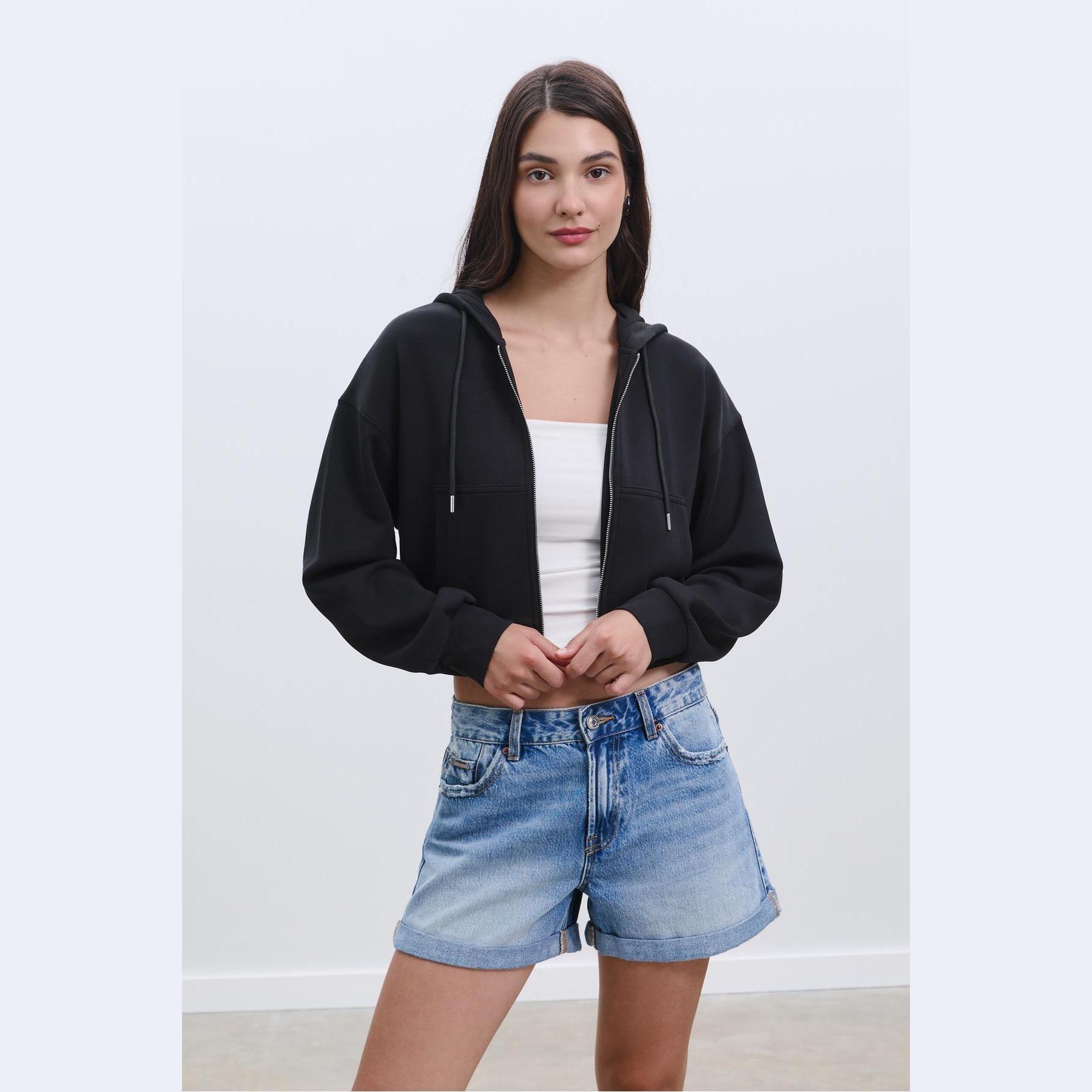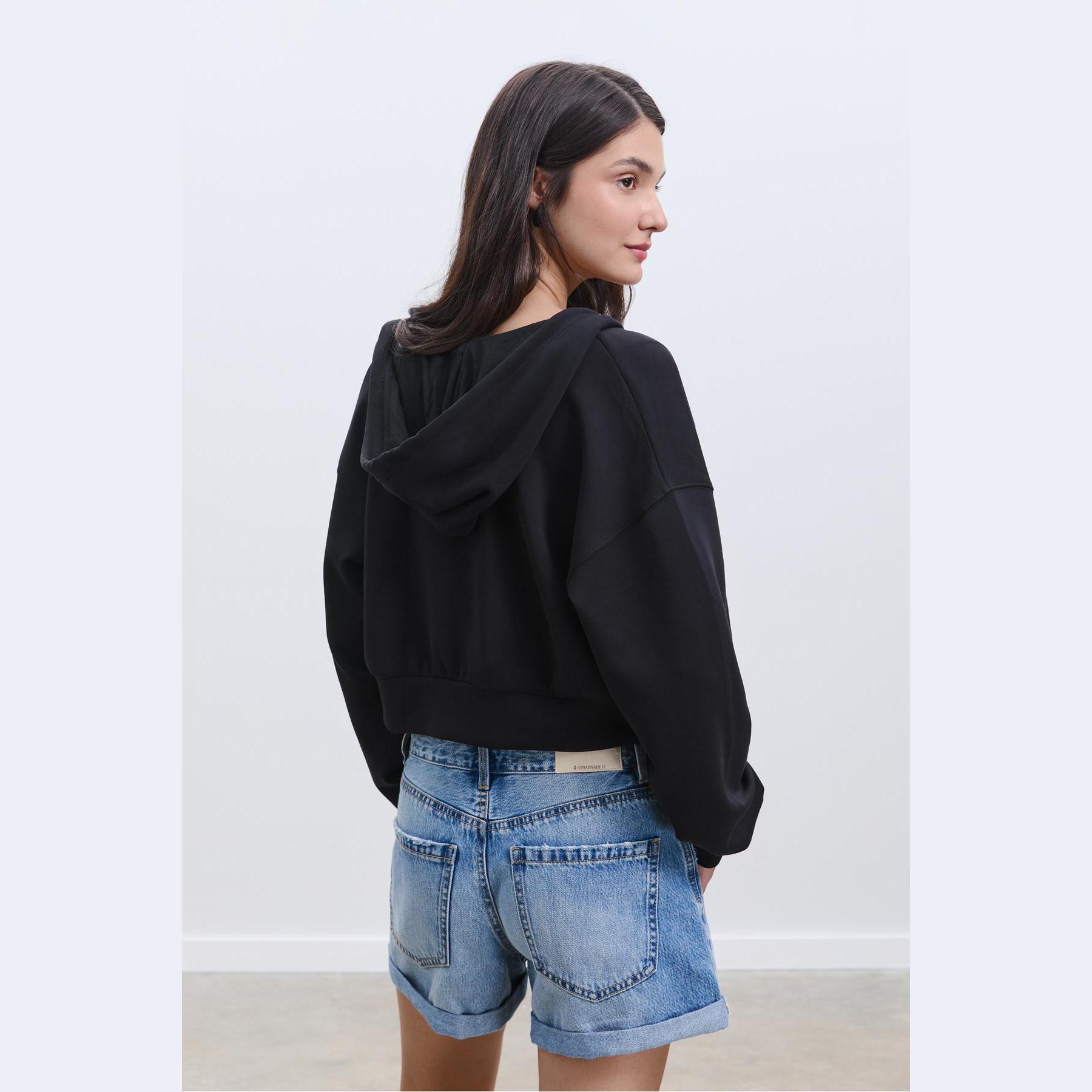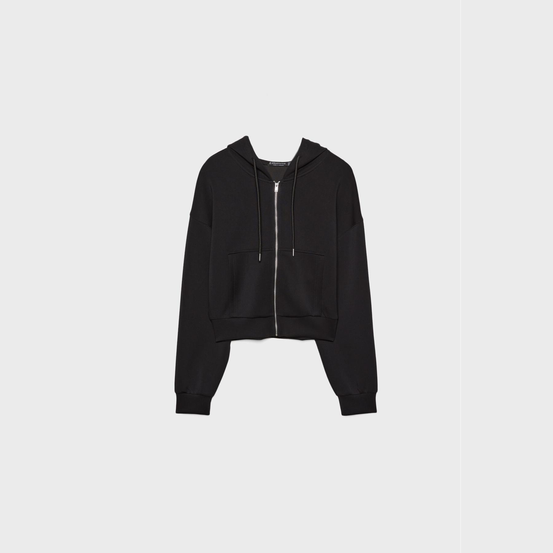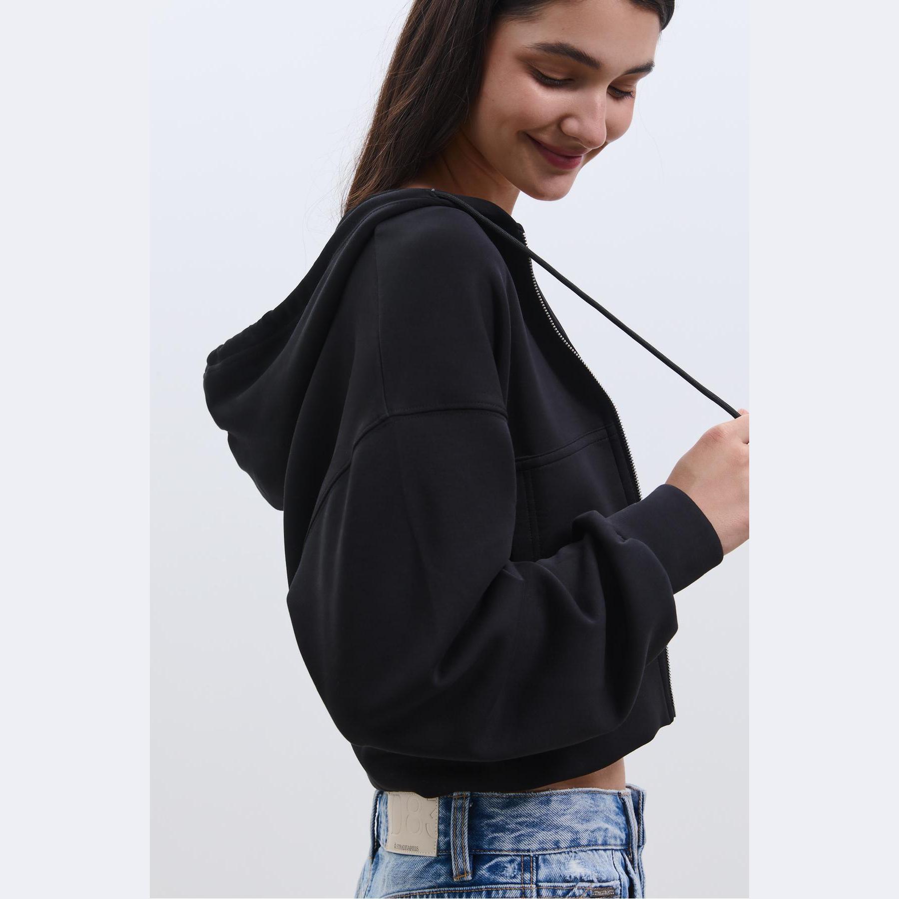 سويت شيرت عملي من Stradivarius بلون أسود، مصنوع من خامة ناعمة بتركيبة 49% مودال، 42% بوليستر، 9% إيلاستان، يتميز بقصة Comfort Fit، ياقة دائرية، أكمام طويلة، سحاب معدني أمامي، مزود بقبعة قابلة للتعديل عبر رباط داخلي، جيبين جانبيين، تصميم سادة بملمس مغسول، بدون بطانة، ملمس داخلي ناعم، مثالي للتنسيق مع بنطال Jogger أو جينز لإطلالة كاجوال مريحة.