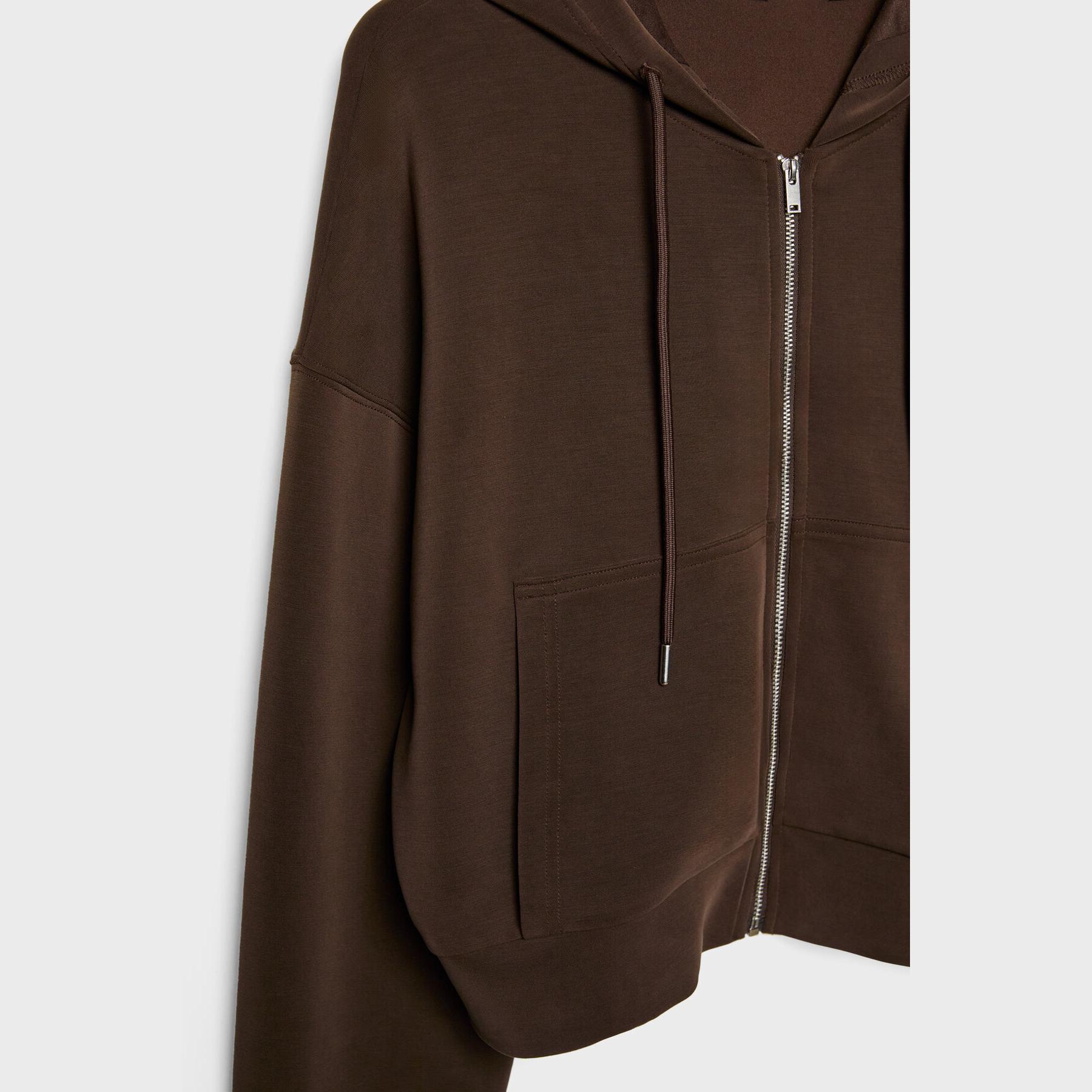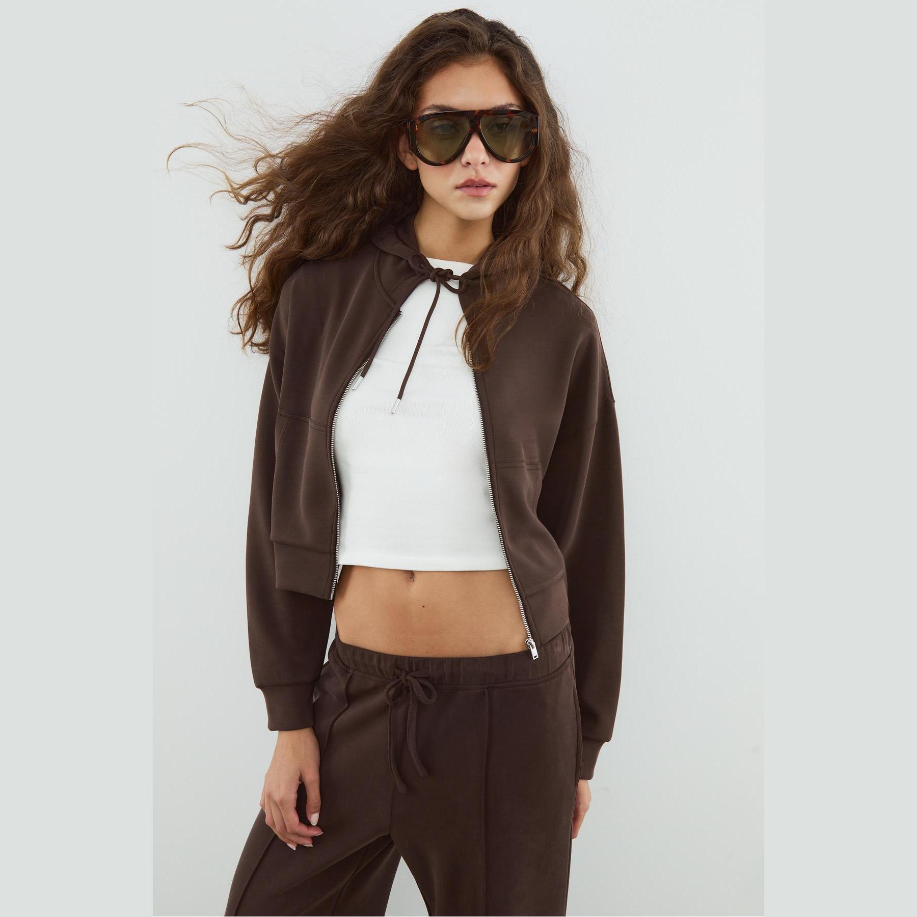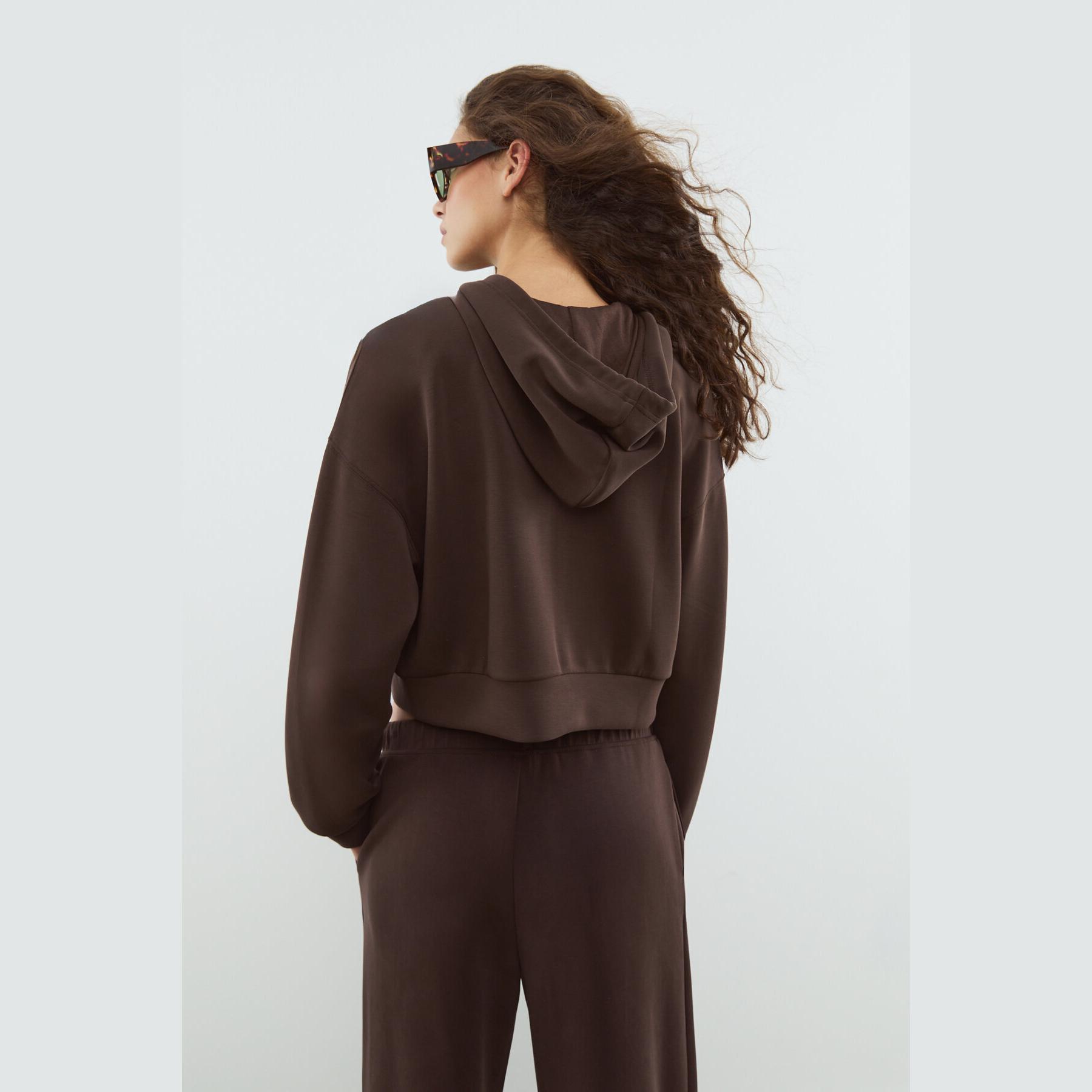 جاكيت عملي من Stradivarius بلون بني، مصنوع من خامة ناعمة بتركيبة 49% مودال، 42% بوليستر، 9% إيلاستان، يتميز بقصة مريحة Comfort Fit، ياقة دائرية مع قبعة قابلة للتعديل عبر رباط داخلي، أكمام طويلة، إغلاق أمامي بسحاب معدني، مزود بجيبين جانبيين، تصميم سادة بملمس مغسول ناعم، بدون بطانة، مثالي للتنسيق مع بنطال كاجوال أو جينز لإطلالة يومية دافئة.