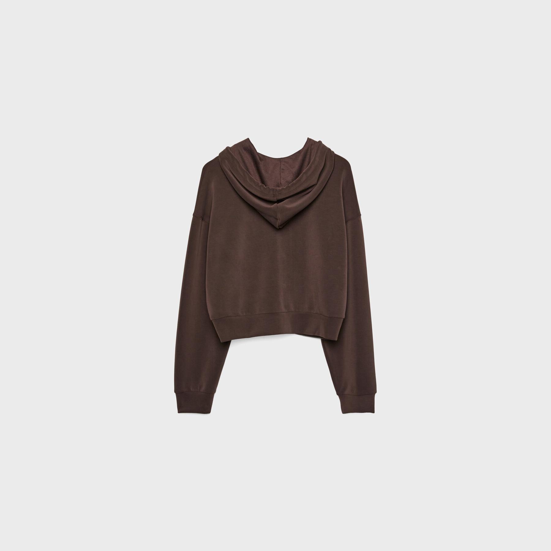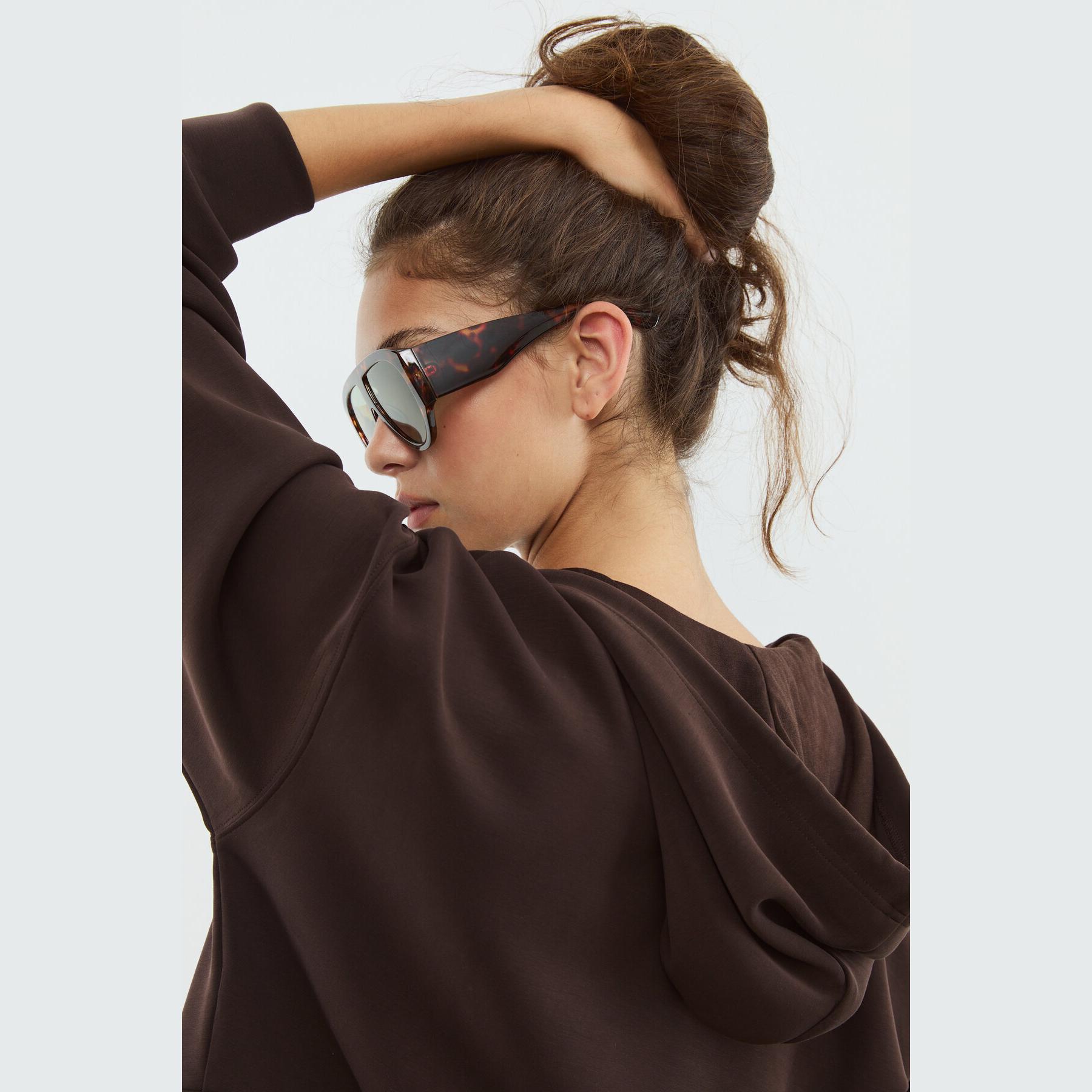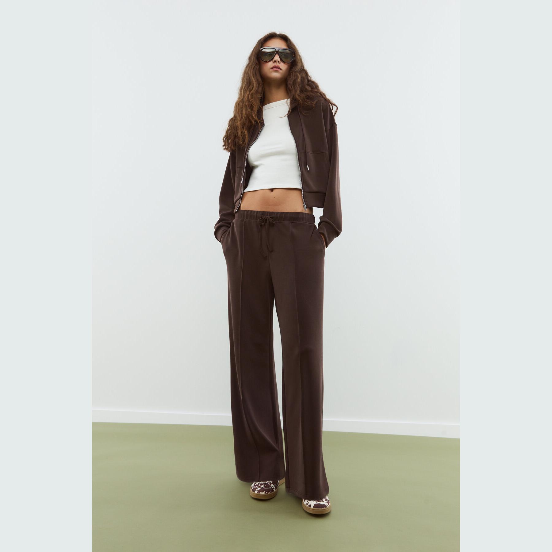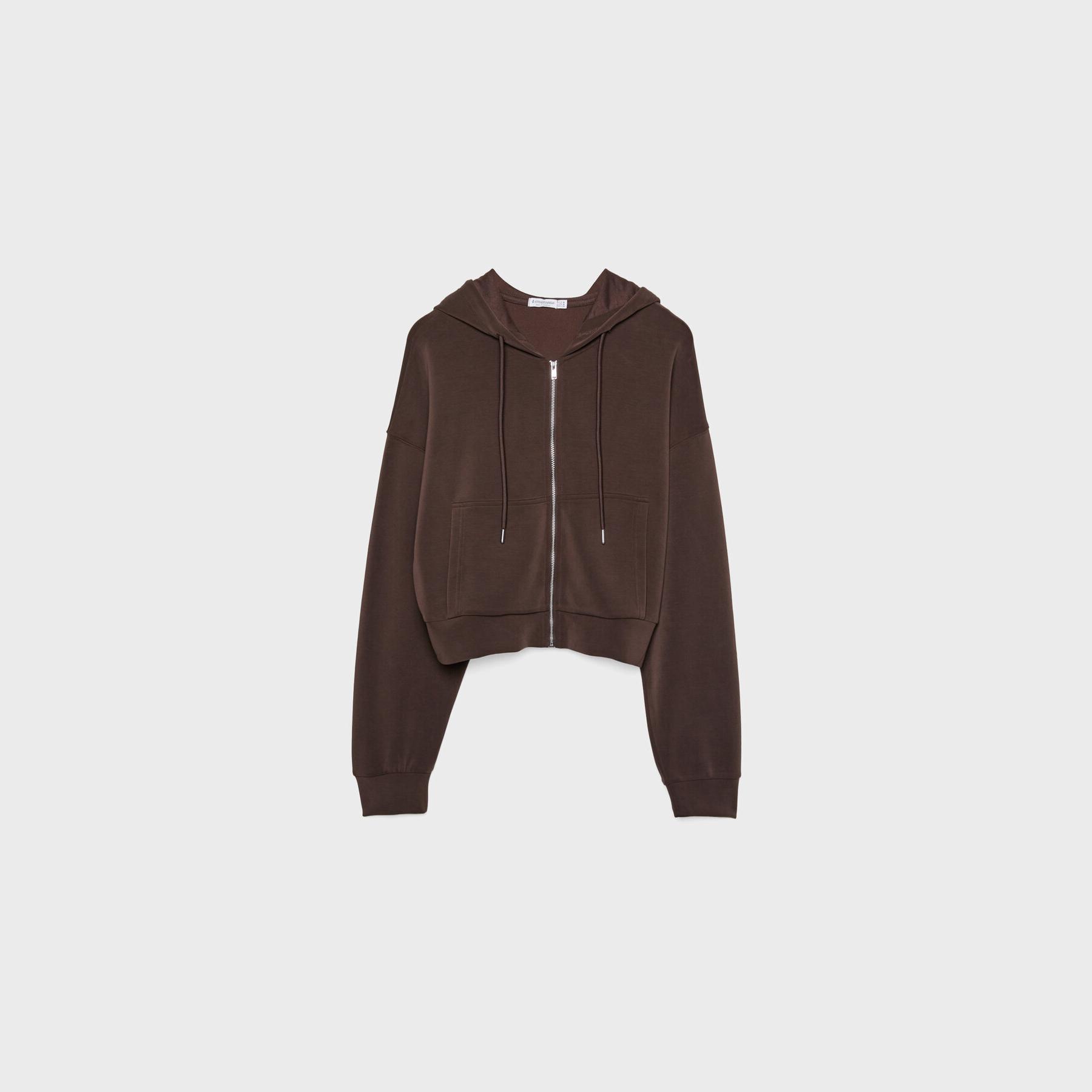 جاكيت عملي من Stradivarius بلون بني، مصنوع من خامة ناعمة بتركيبة 49% مودال، 42% بوليستر، 9% إيلاستان، يتميز بقصة مريحة Comfort Fit، ياقة دائرية مع قبعة قابلة للتعديل عبر رباط داخلي، أكمام طويلة، إغلاق أمامي بسحاب معدني، مزود بجيبين جانبيين، تصميم سادة بملمس مغسول ناعم، بدون بطانة، مثالي للتنسيق مع بنطال كاجوال أو جينز لإطلالة يومية دافئة.