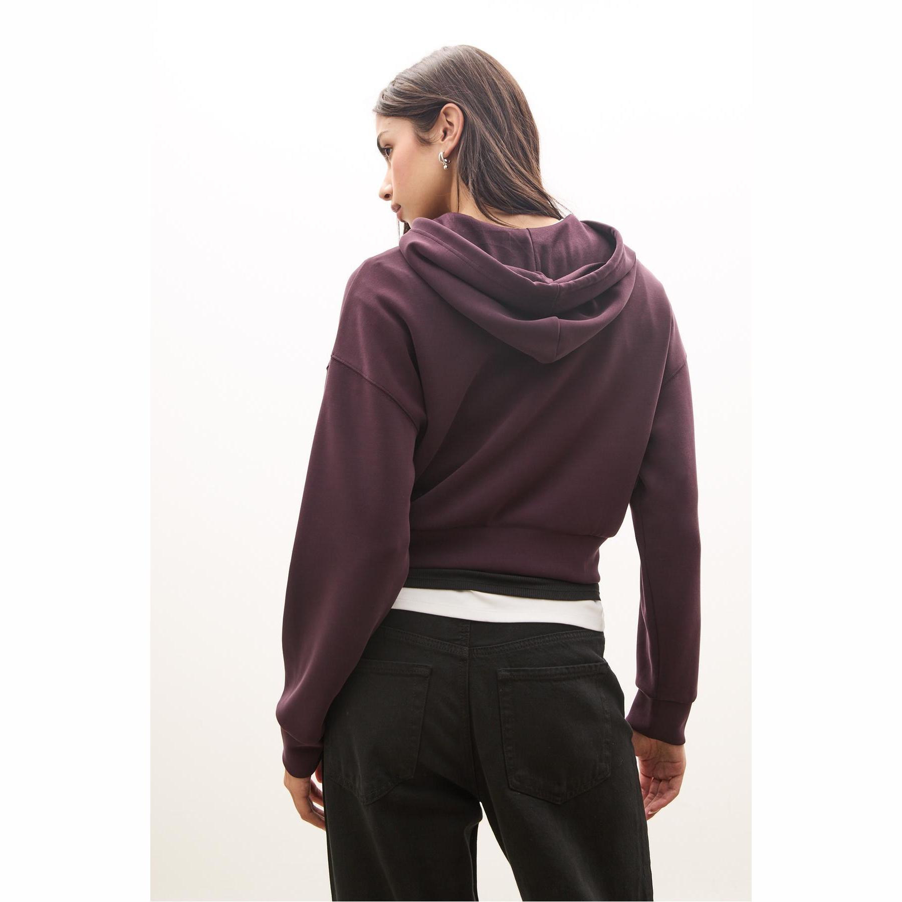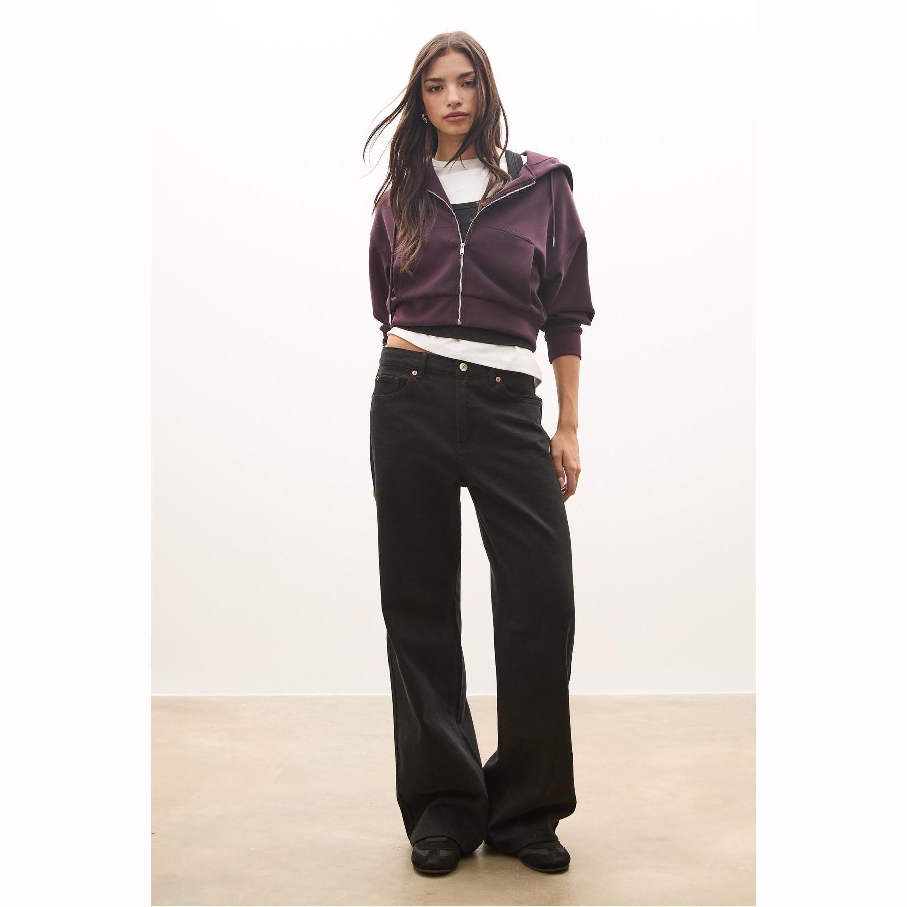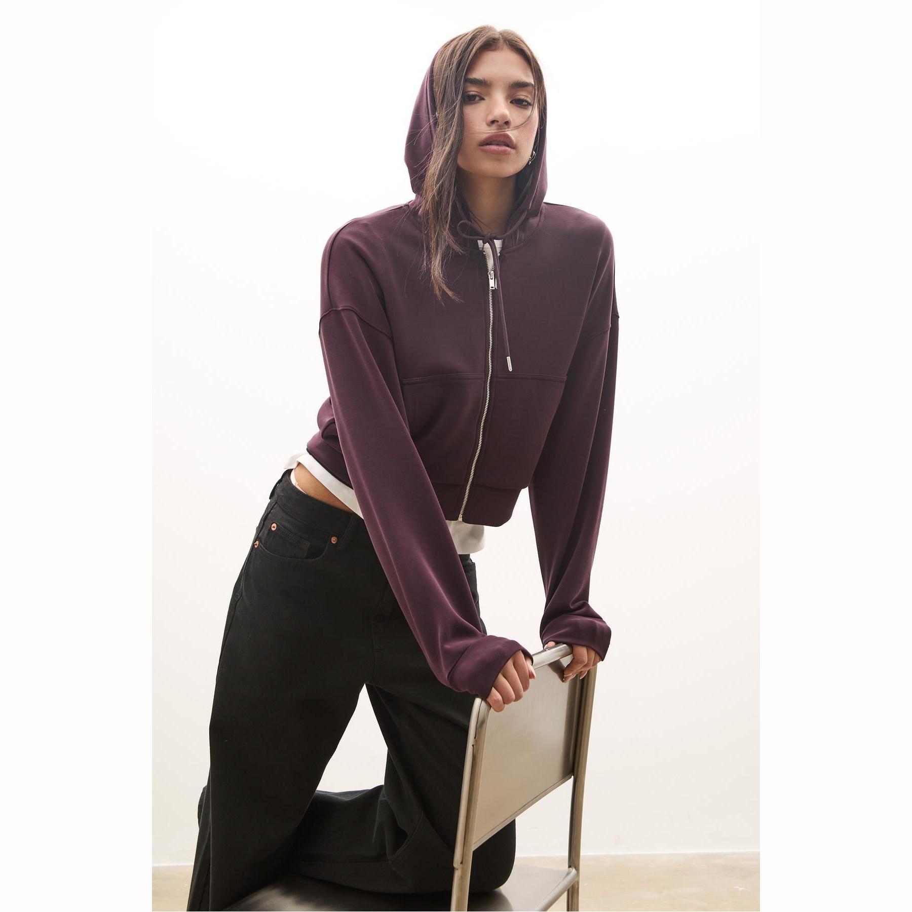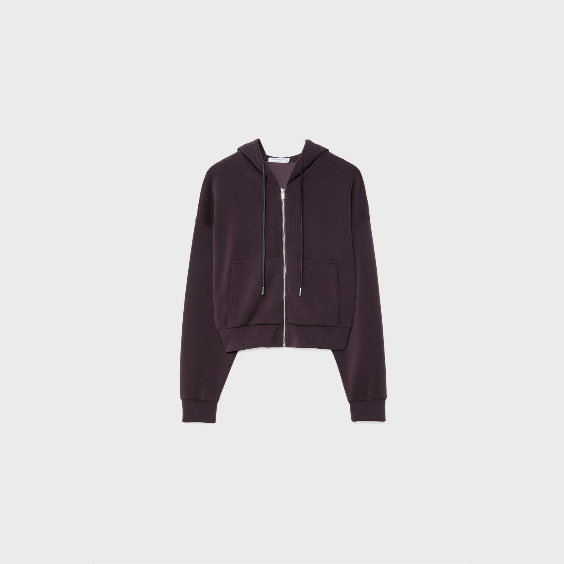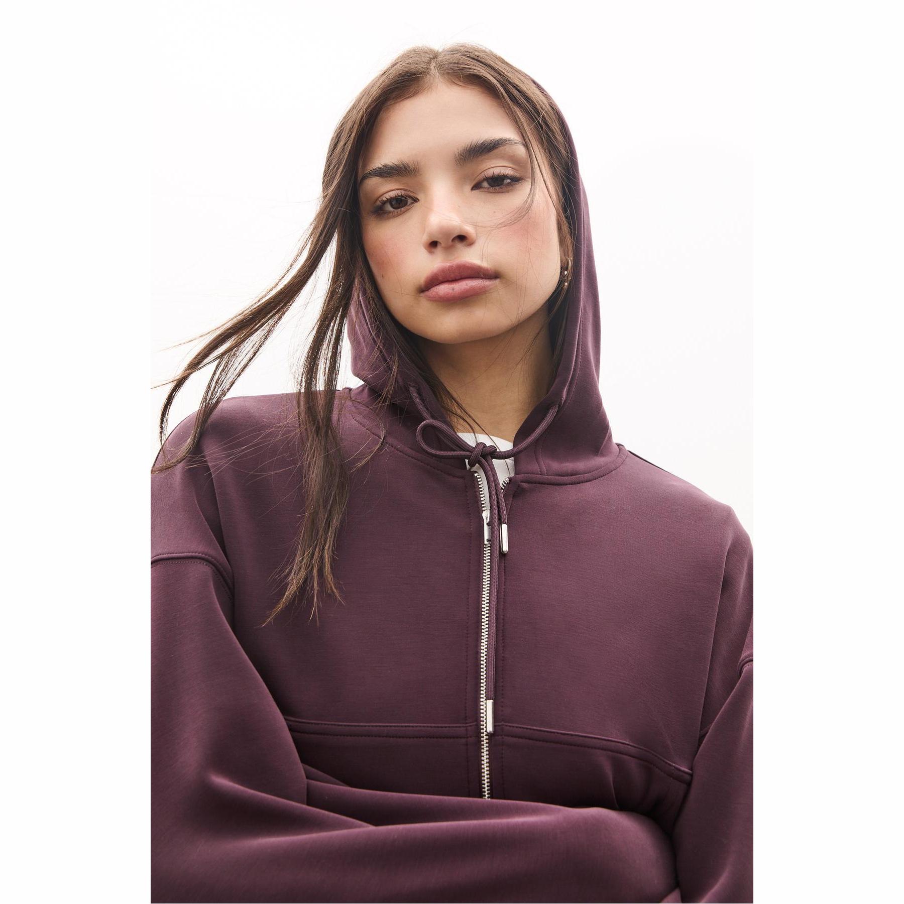 سويت شيرت عملي من Stradivarius بلون بنفسجي، مصنوع من خامة ناعمة بتركيبة 49% مودال، 42% بوليستر، 9% إيلاستان، يتميز بقصة Comfort Fit، ياقة دائرية مع قبعة قابلة للتعديل عبر رباط داخلي، أكمام طويلة، سحاب معدني أمامي، مزود بجيبين جانبيين، تصميم سادة بملمس مغسول، بدون بطانة، ملمس داخلي ناعم، مثالي للتنسيق مع بنطال Jogger أو جينز لإطلالة كاجوال مريحة.