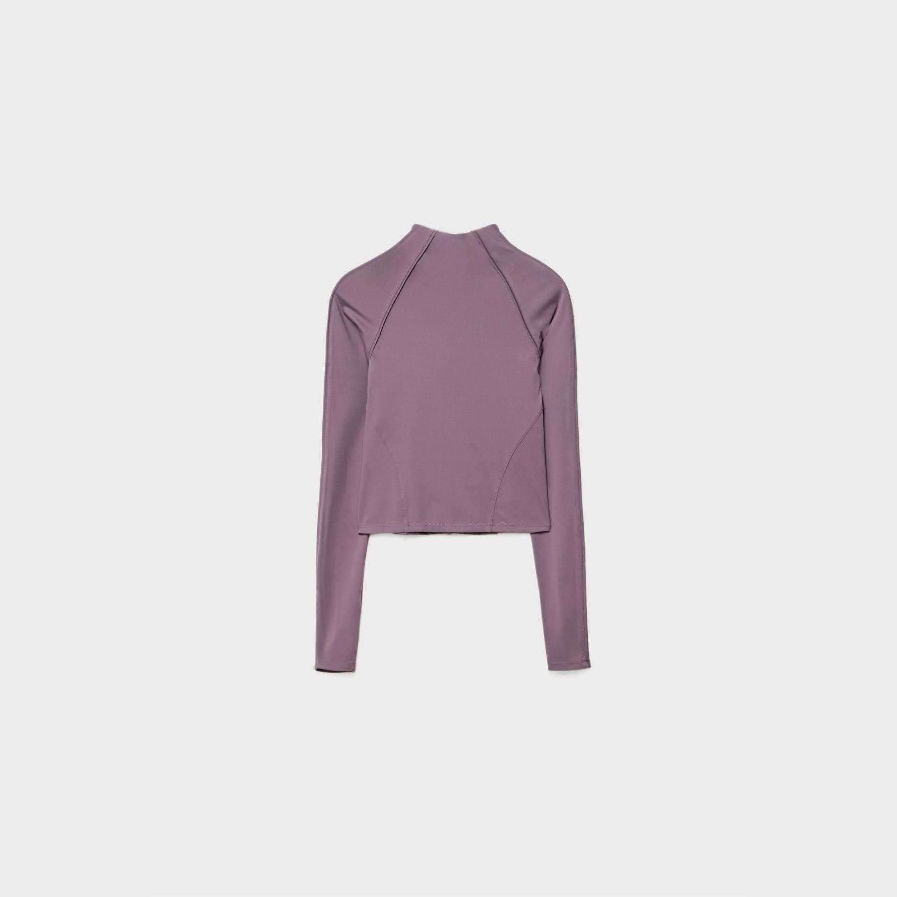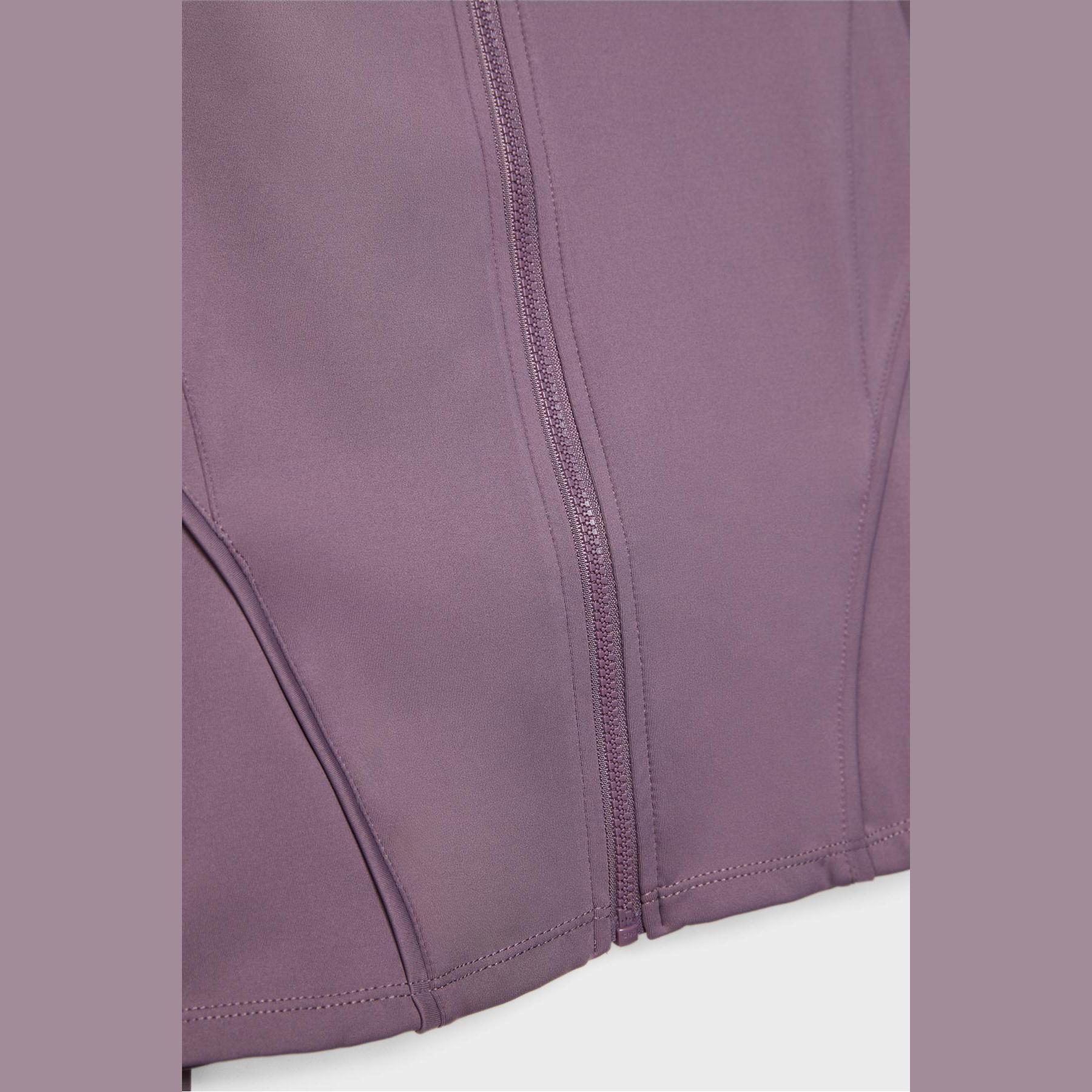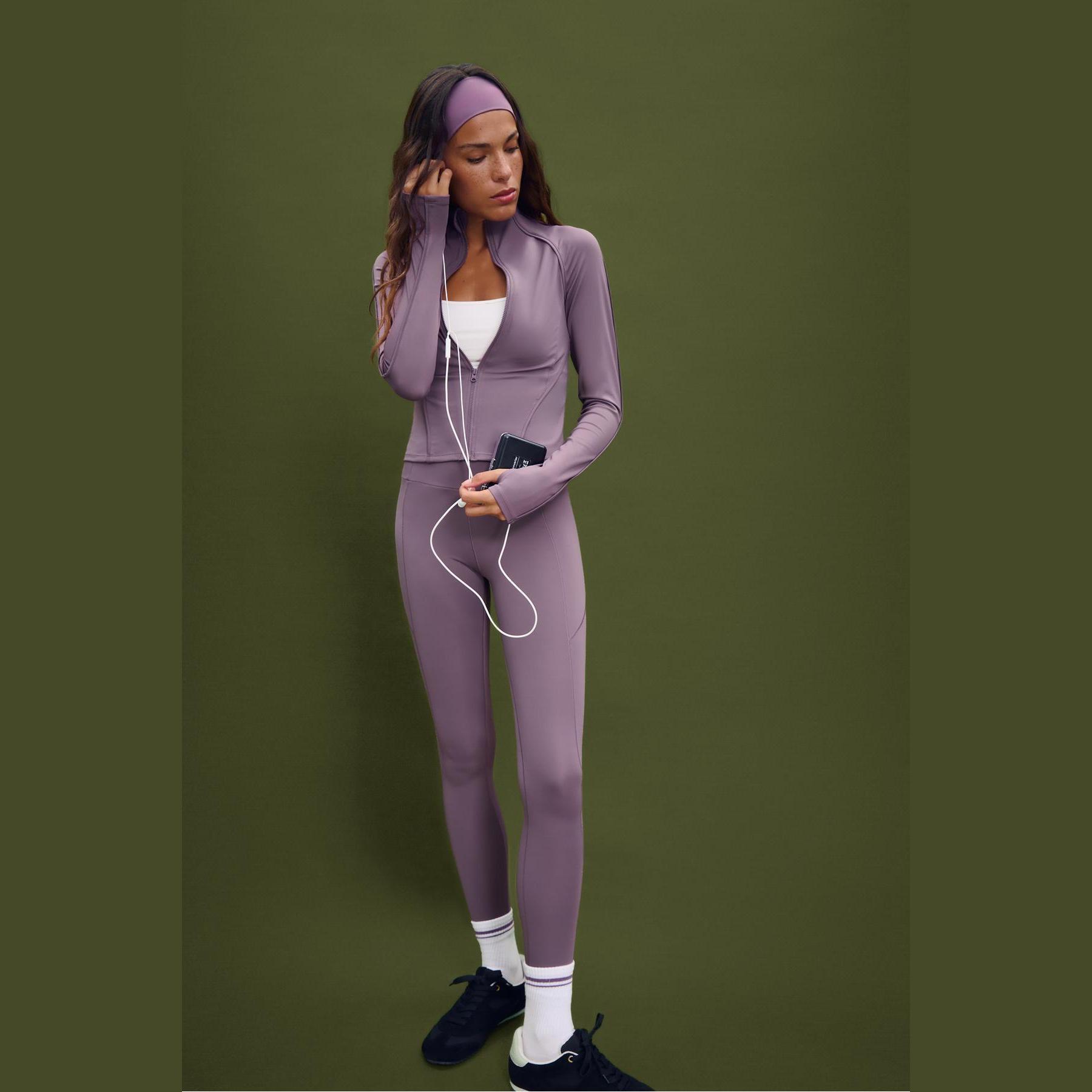 جاكيت عملي من Stradivarius بلون بنفسجي، مصنوع من خامة مرنة بتركيبة 78% بوليستر، 22% إيلاستان، يتميز بقصة ضيقة Slim Fit، ياقة دائرية، أكمام طويلة مزودة بفتحة لإدخال الإبهام، إغلاق أمامي بسحاب كامل، تصميم سادة بملمس ناعم، بدون بطانة، ملمس داخلي مريح، مثالي للتنسيق مع قطع رياضية أو كاجوال.