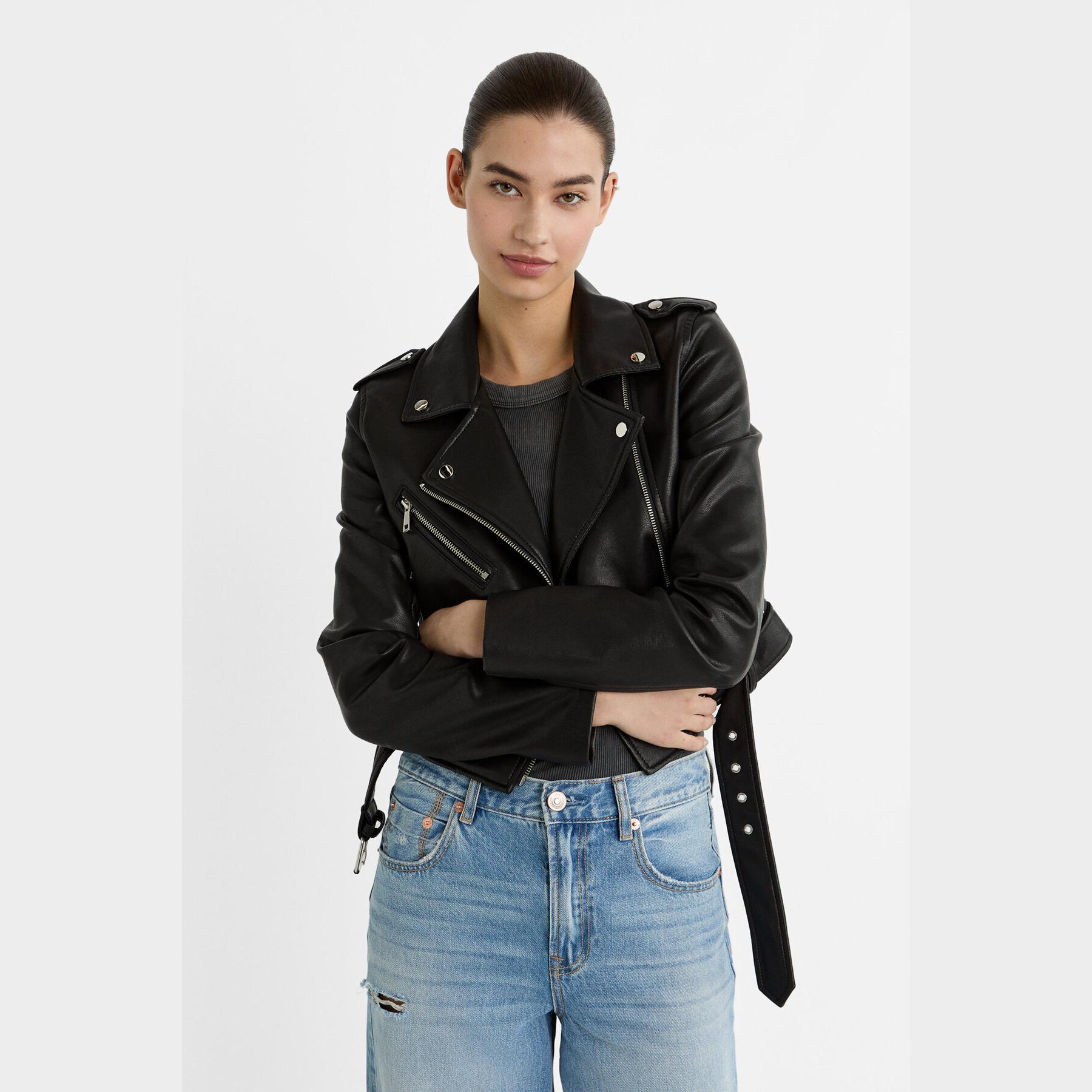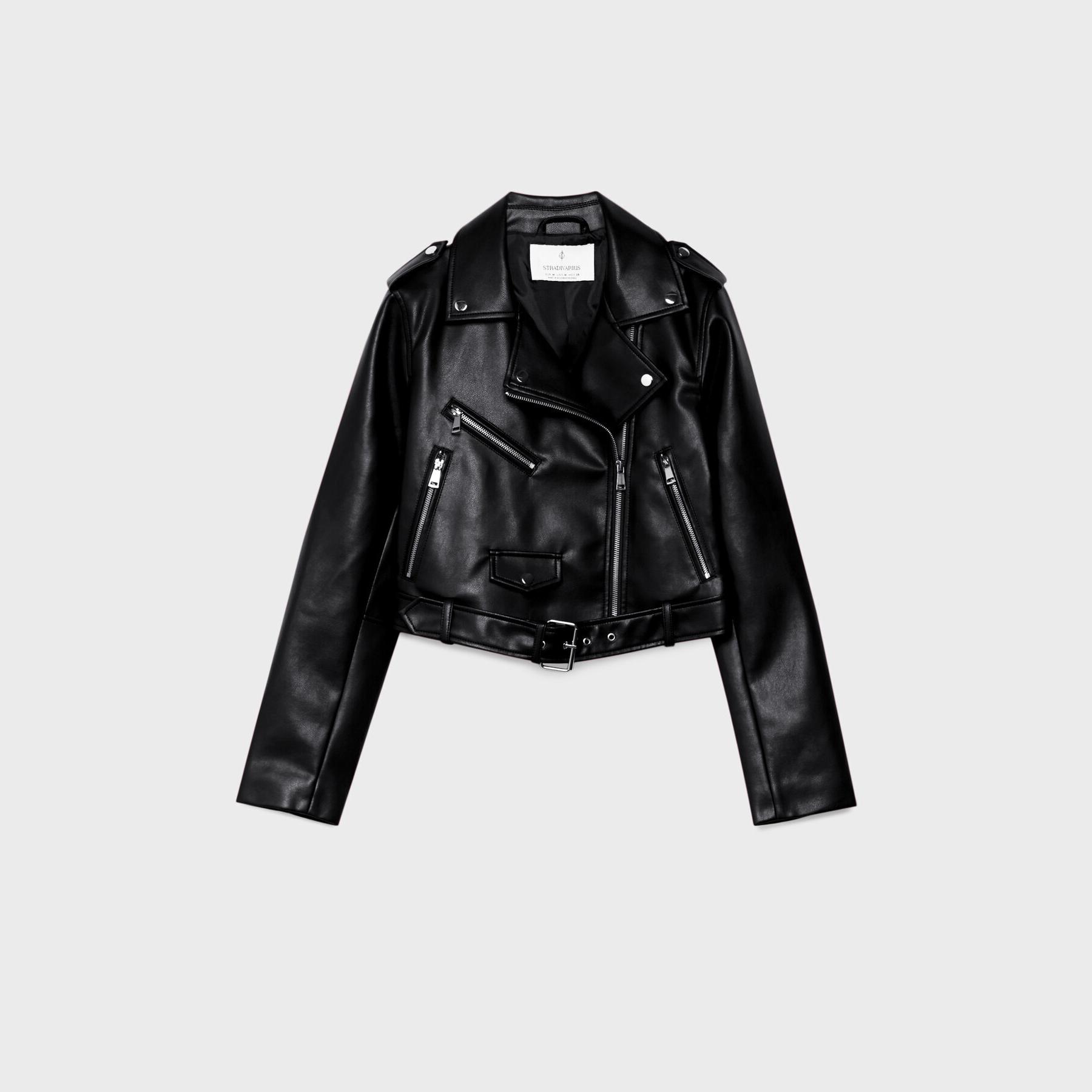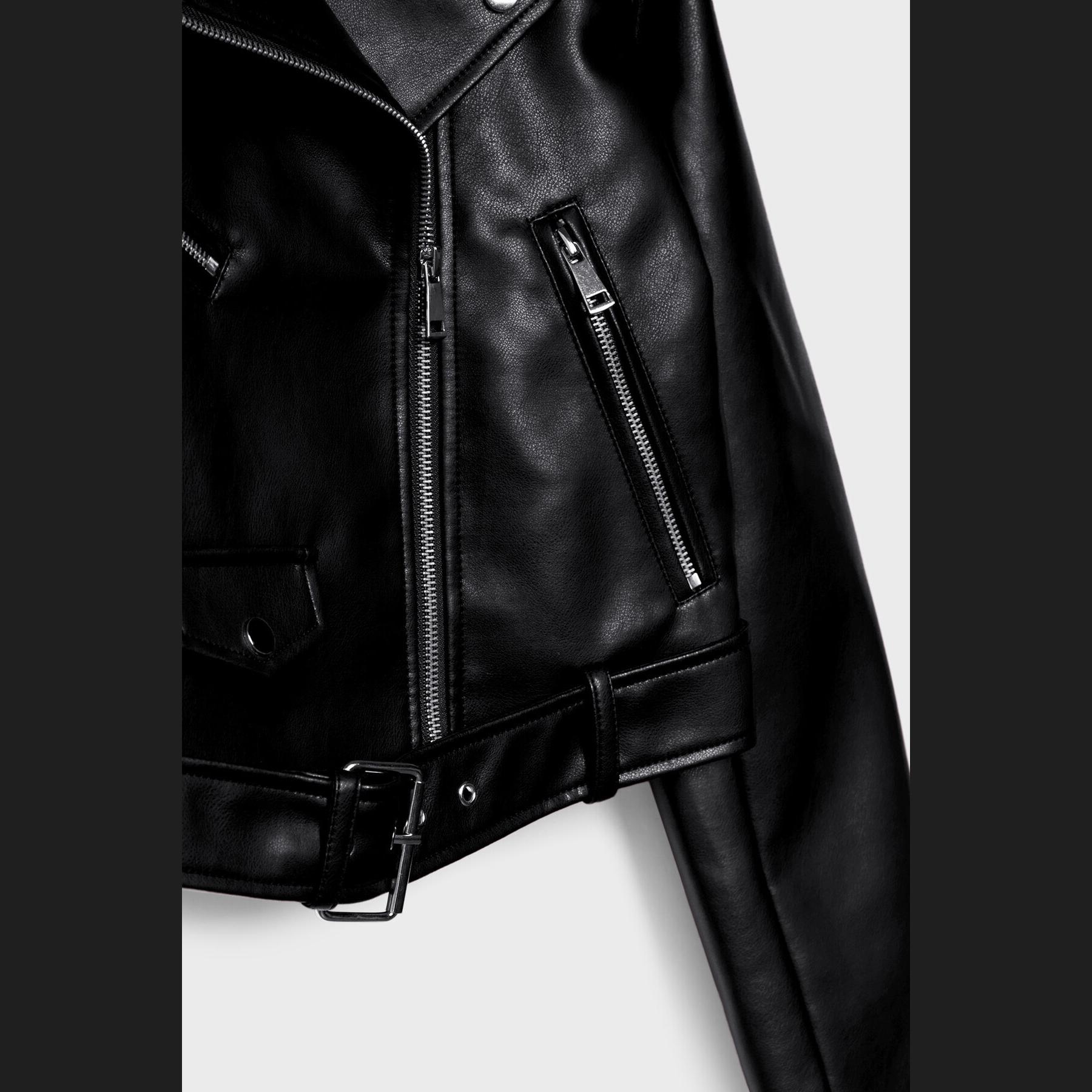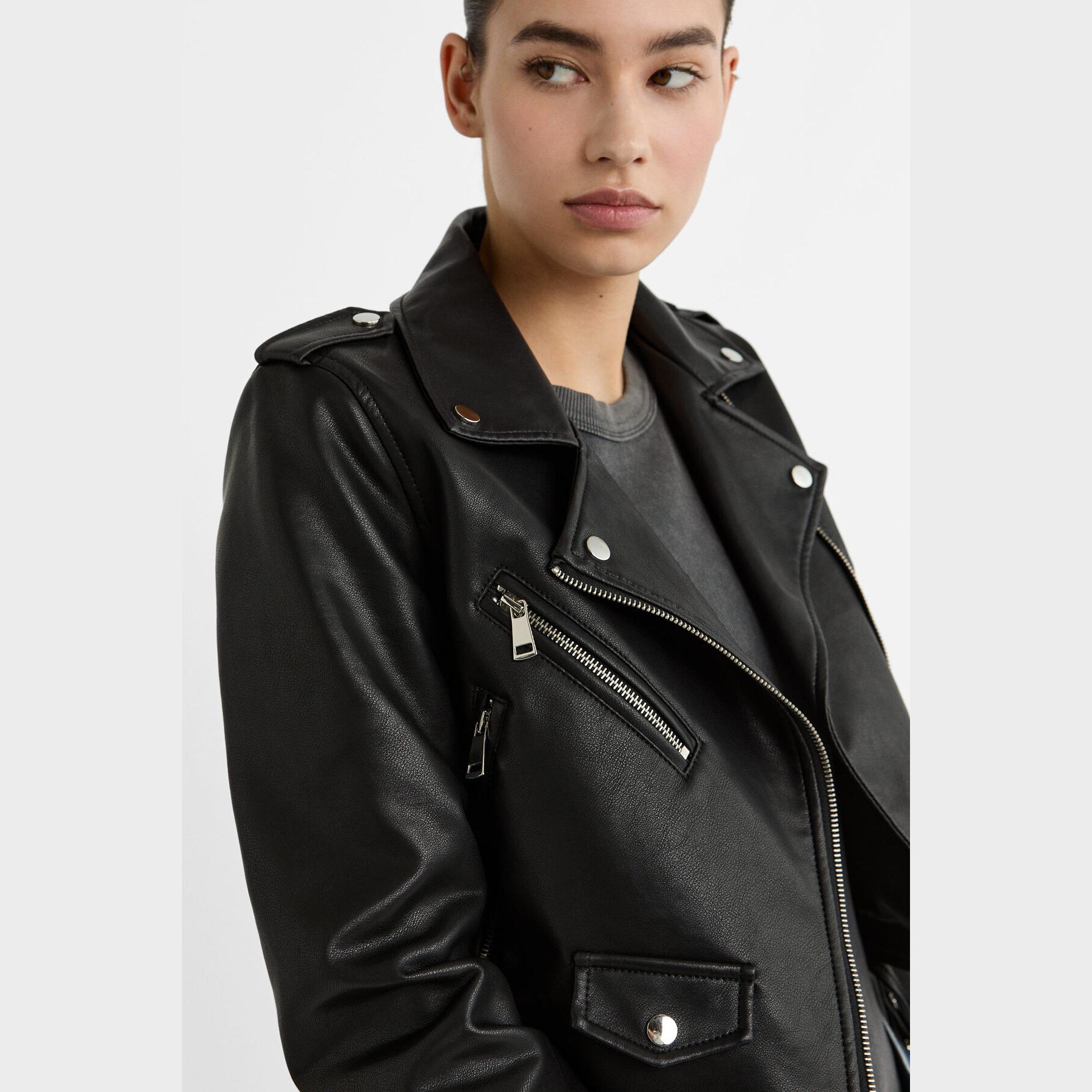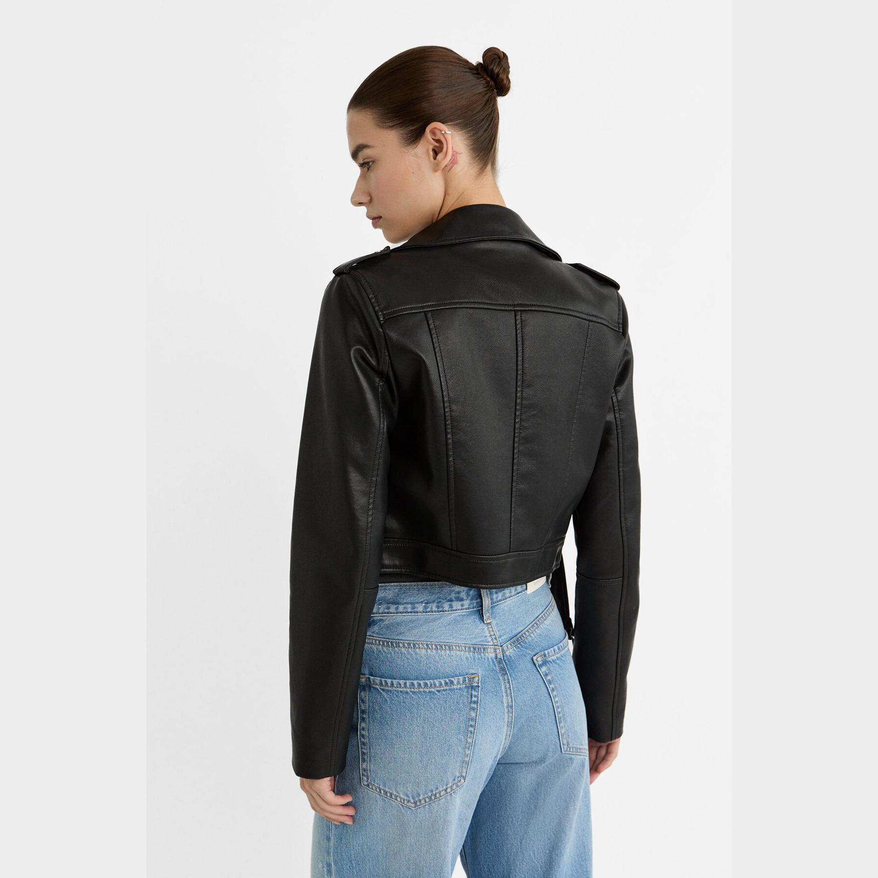 جاكيت بايكر أنيق من Stradivarius بلون أسود، مصنوع من خامة جلد صناعي بتركيبة 55% بولي يوريثان، 41% بوليستر، 3% قطن، 1% فيسكوز، يتميز بقصة Regular Fit، ياقة بايكر كلاسيكية، أكمام طويلة، إغلاق أمامي بسحاب مائل، مزود بجيبين أماميين بسحاب، تصميم سادة بملمس لامع، مزود بحزام عند الخصر لتعزيز الشكل، مبطّن بالكامل، مثالي للتنسيق مع قطع كاجوال أو إطلالات مسائية جريئة.