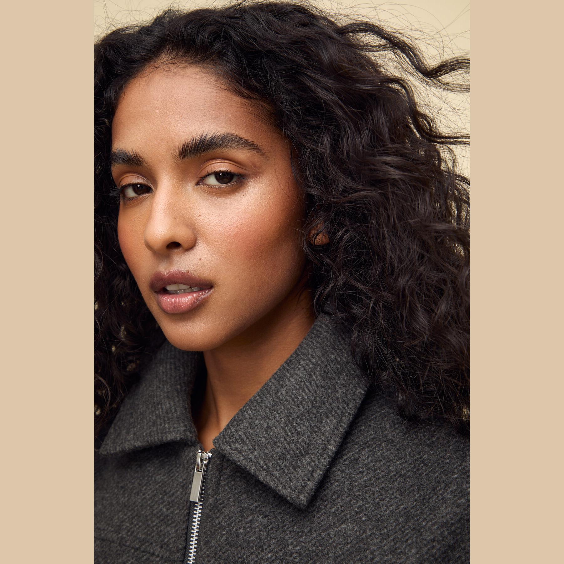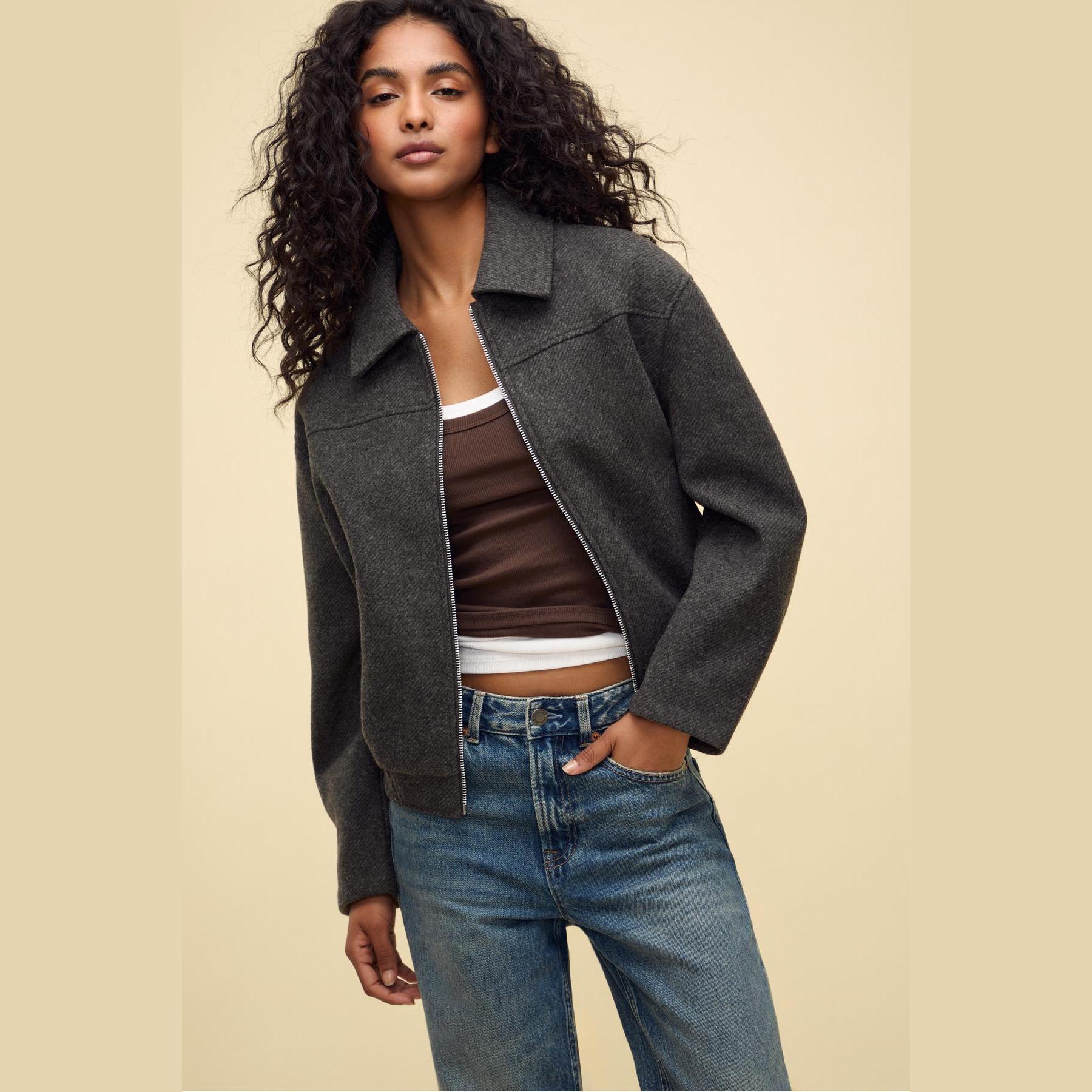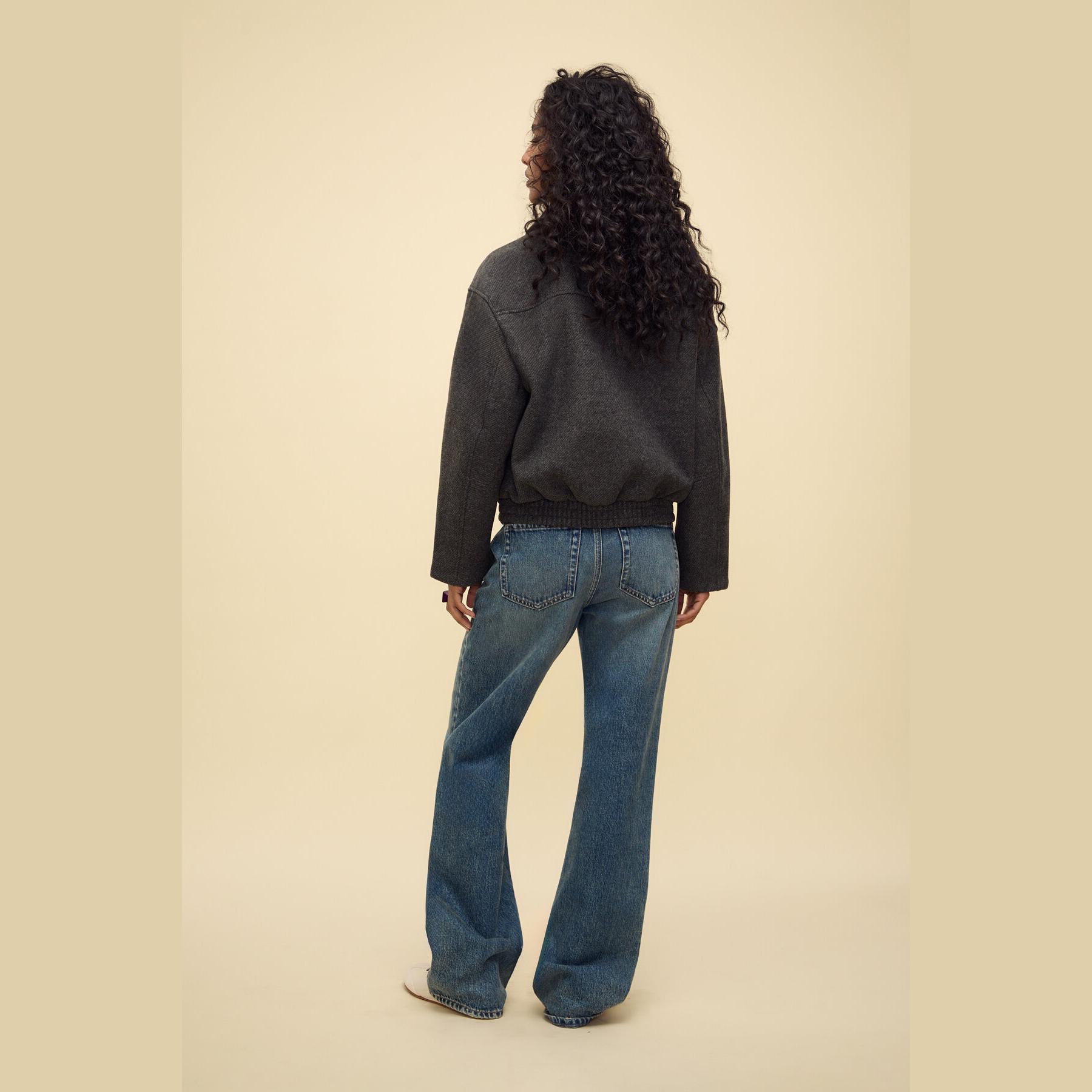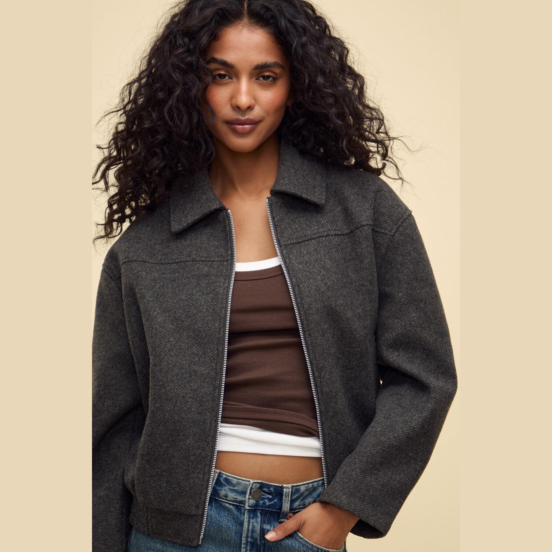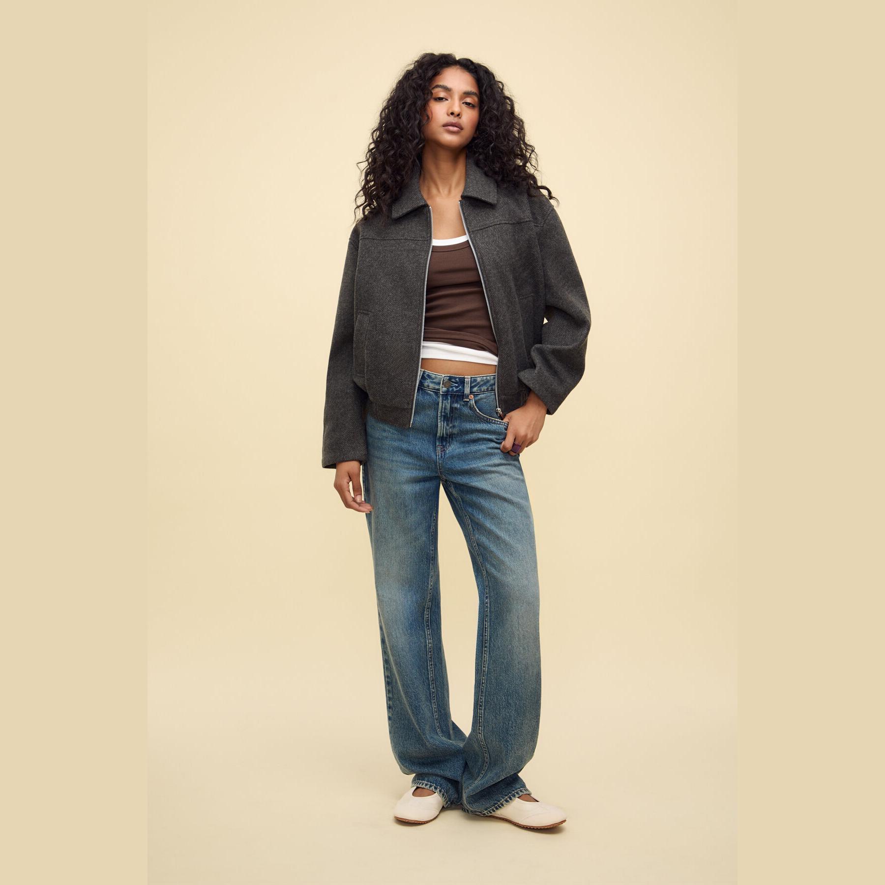 جاكيت بومبر أنيق من Stradivarius بلون رمادي غامق، مصنوع من خامة ناعمة بتركيبة 100% بوليستر، يتميز بقصة Oversize، ياقة بومبر كلاسيكية، أكمام طويلة، إغلاق أمامي بسحاب معدني، مزود بجيبين جانبيين بفتحة مائلة، تصميم سادة بملمس مغسول، حافة سفلية مطاطية، بدون بطانة، ملمس داخلي ناعم، مثالي للتنسيق مع بنطال كاجوال أو ليقنز لإطلالة يومية مريحة.