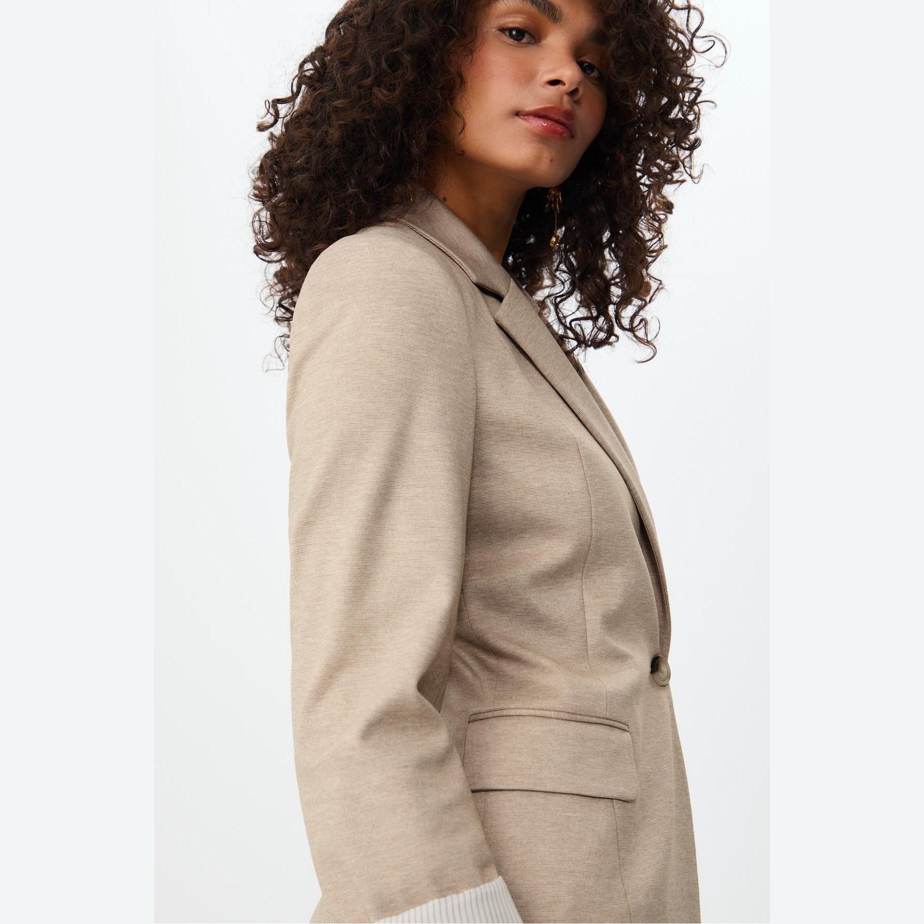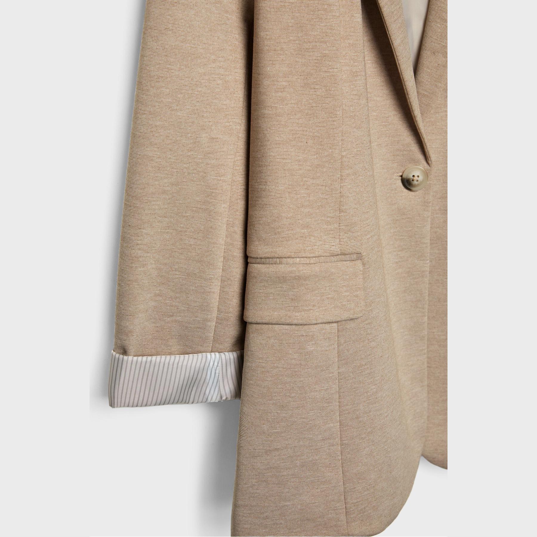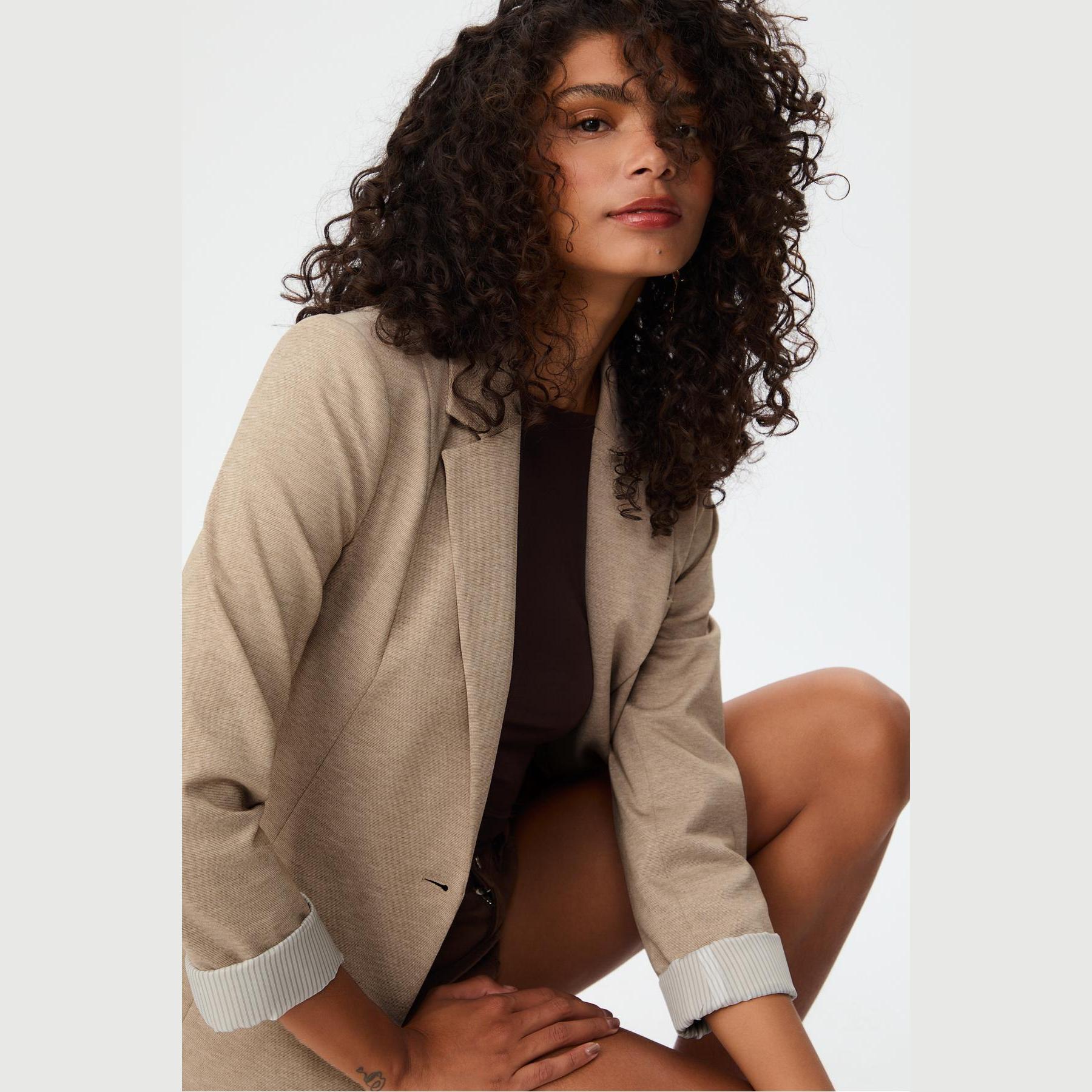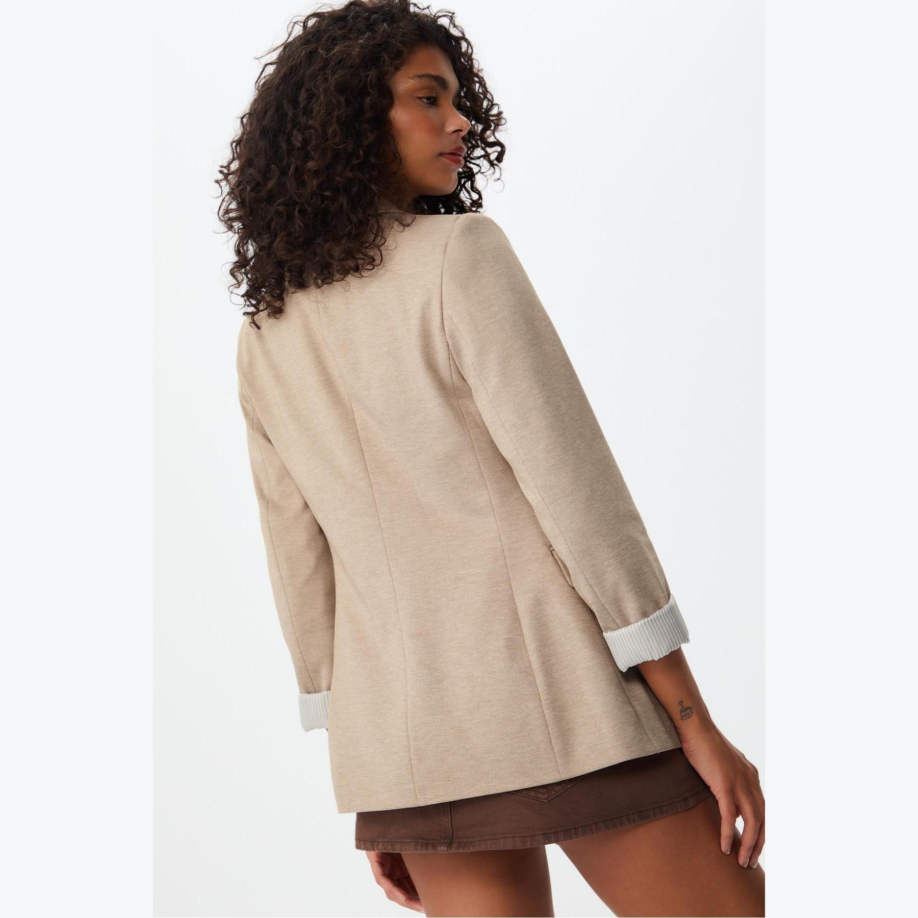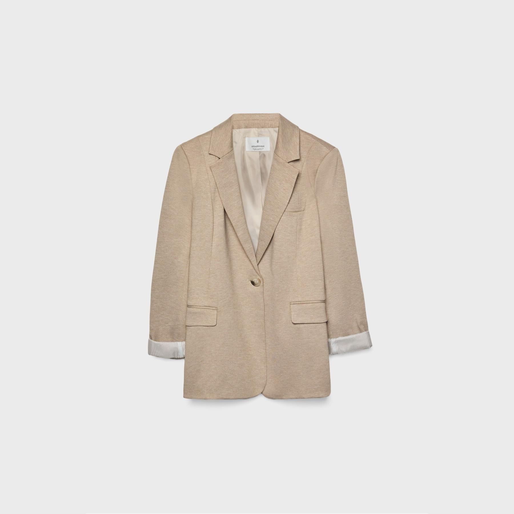 بليزر أنيق من Stradivarius بلون إكرو، مصنوع من خامة مرنة بتركيبة 75% بوليستر، 20% فيسكوز، 5% إيلاستان، يتميز بقصة ضيقة Slim Fit، ياقة مطوية كلاسيكية، أكمام طويلة قابلة للطي، إغلاق أمامي بأزرار، مزود بجيوب أمامية بغطاء، تصميم سادة بملمس ناعم، مبطّن بالكامل بخطوط داخلية، مثالي للتنسيق مع بنطال رسمي أو تنورة لإطلالة مكتبية أنيقة.