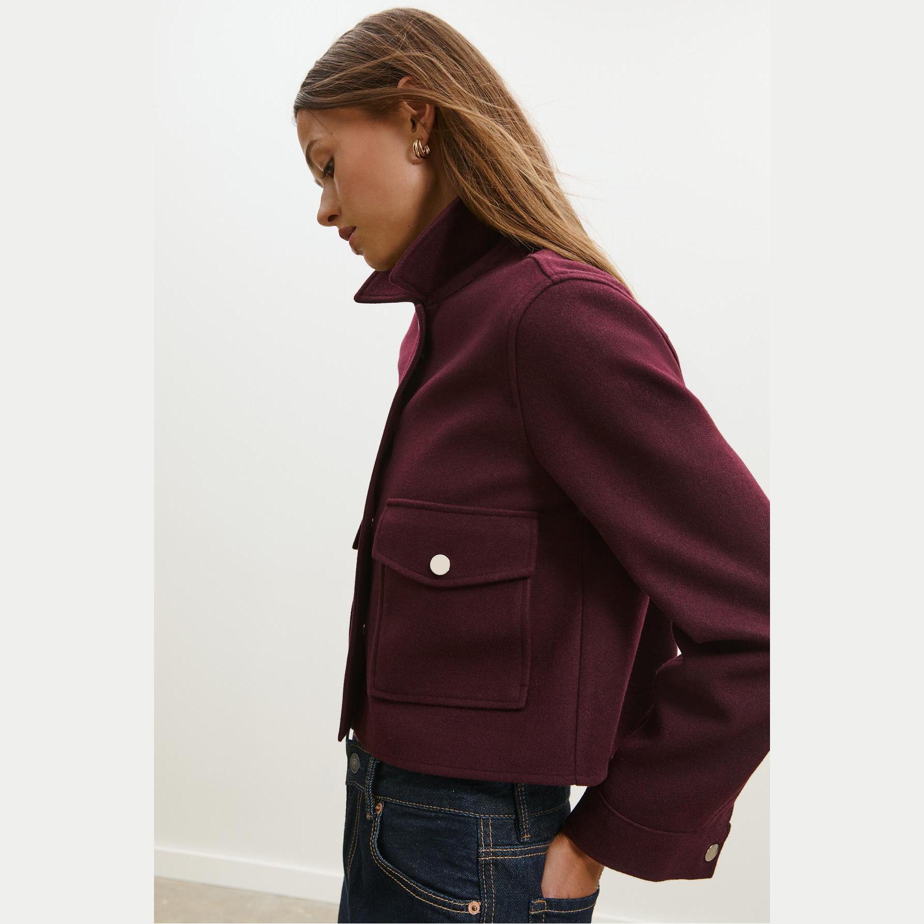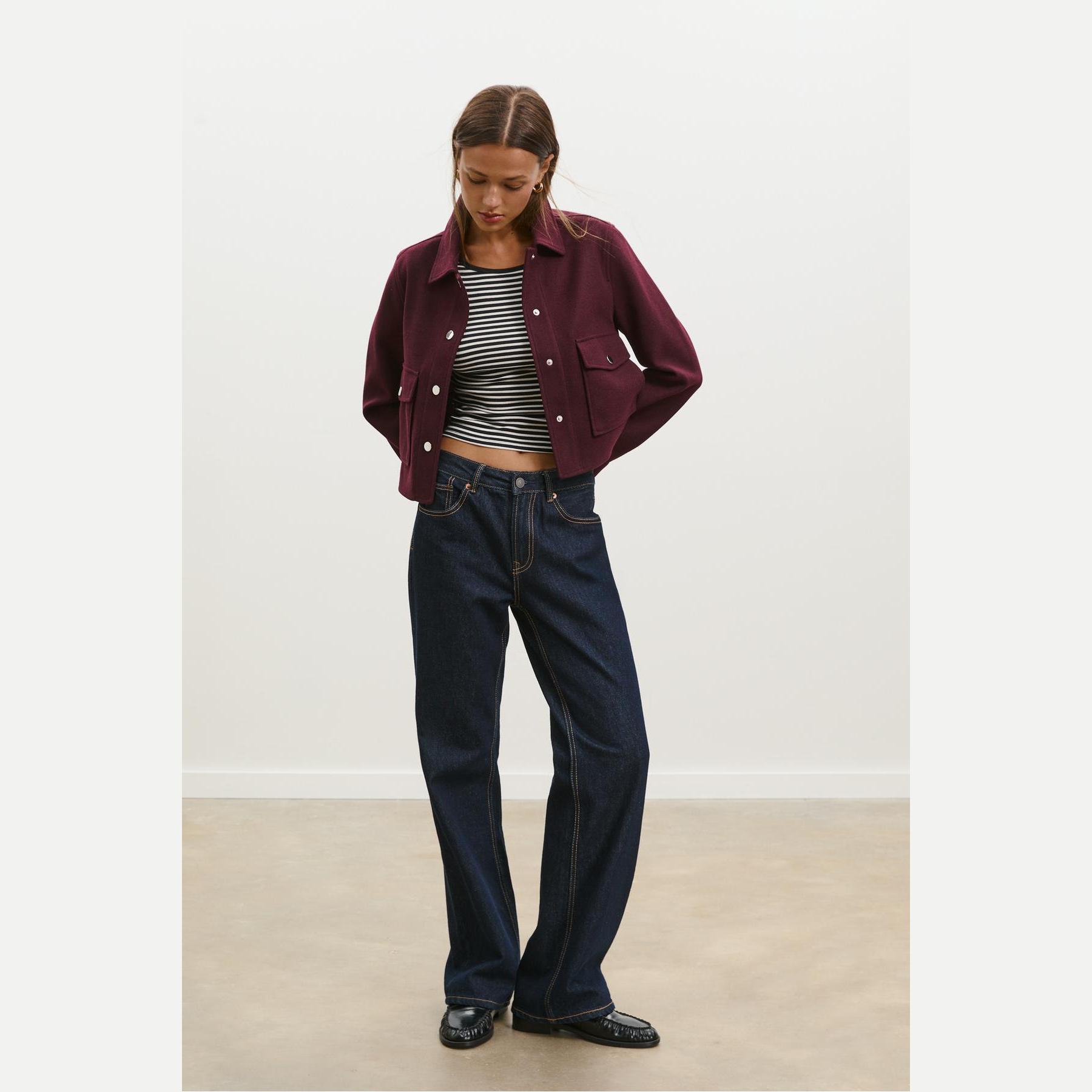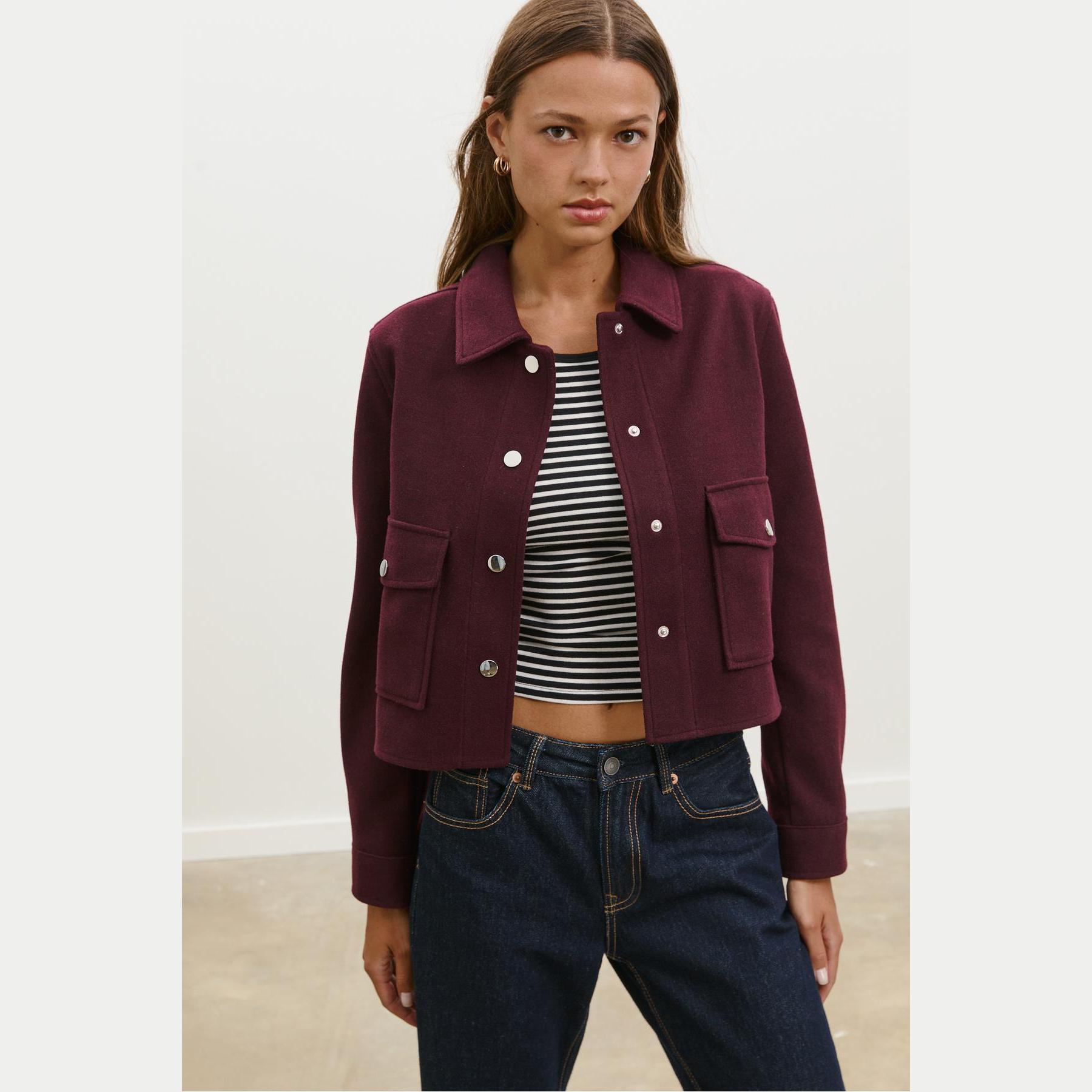 جاكيت عملي من Stradivarius بلون بوردو بنقشة مربعات، مصنوع من خامة ناعمة بتركيبة 100% بوليستر، يتميز بقصة مستقيمة Straight Fit، ياقة كلاسيكية، أكمام طويلة، إغلاق أمامي بأزرار كبس، مزود بجيبين أماميين بغطاء، تصميم بملمس مخملي ناعم، بدون بطانة، مثالي للتنسيق مع بنطال جينز أو تنورة قصيرة لإطلالة يومية دافئة.