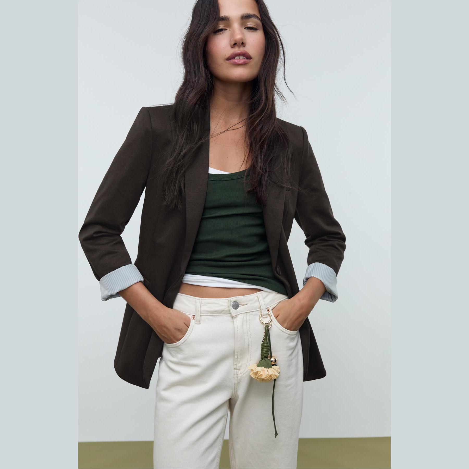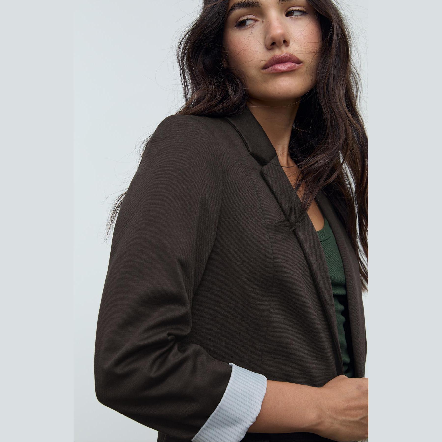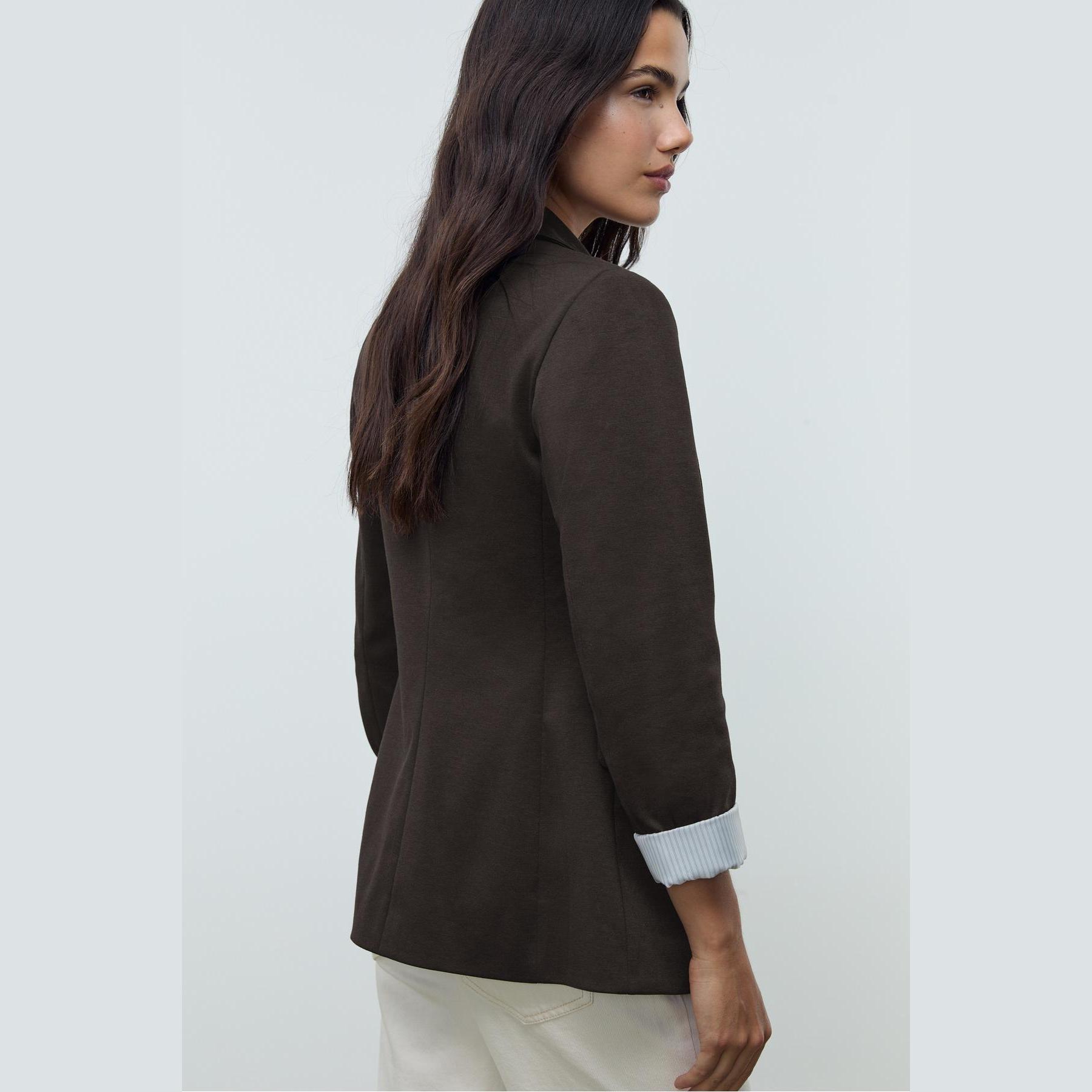 بليزر أنيق من Stradivarius بلون بني، مصنوع من خامة مرنة بتركيبة 75% بوليستر، 20% فيسكوز، 5% إيلاستان، يتميز بقصة ضيقة Slim Fit، ياقة مطوية كلاسيكية، أكمام طويلة قابلة للطي، إغلاق أمامي بأزرار، مزود بجيوب أمامية بغطاء، تصميم سادة بملمس ناعم، مبطّن بالكامل بخطوط داخلية، مثالي للتنسيق مع بنطال رسمي أو تنورة لإطلالة مكتبية أنيقة.