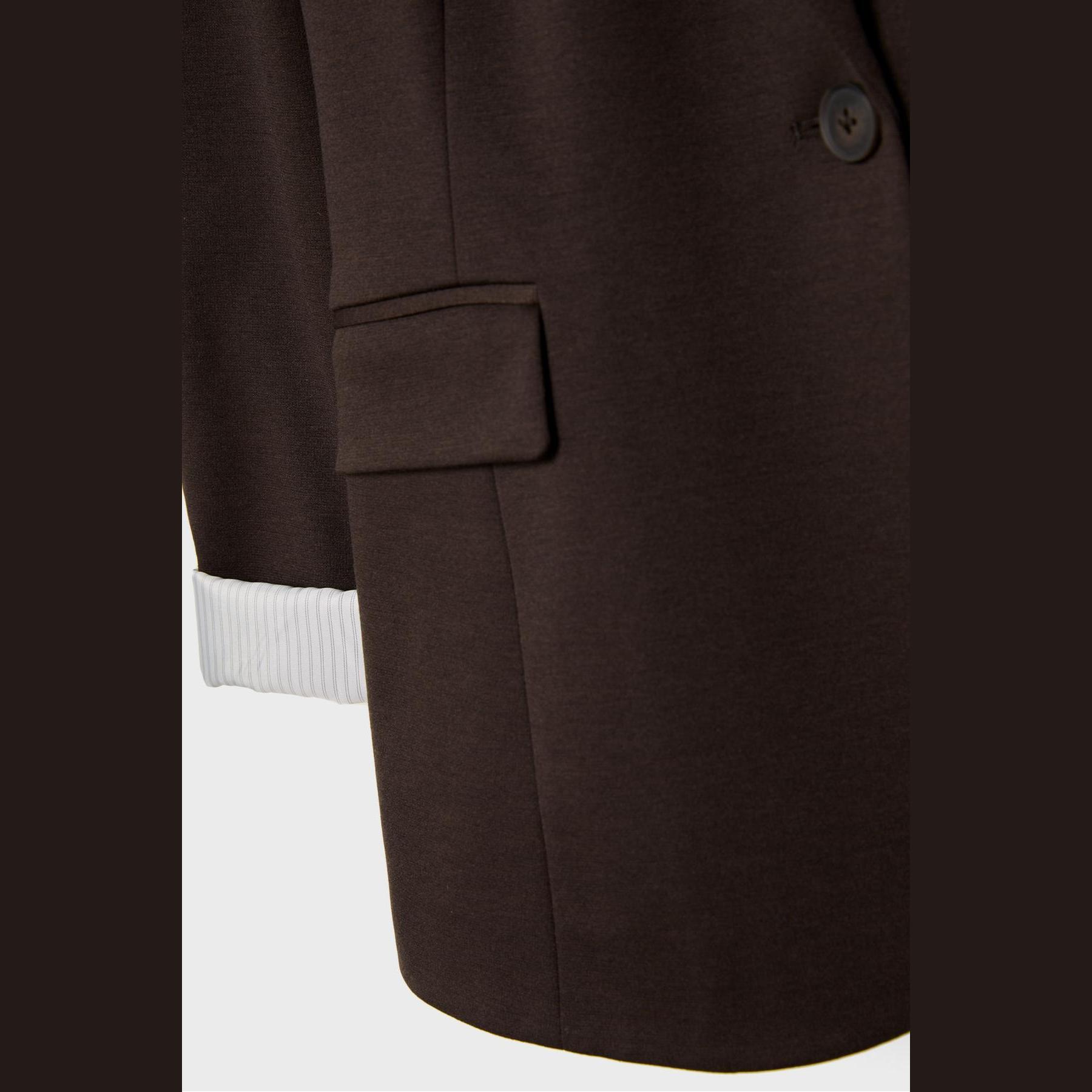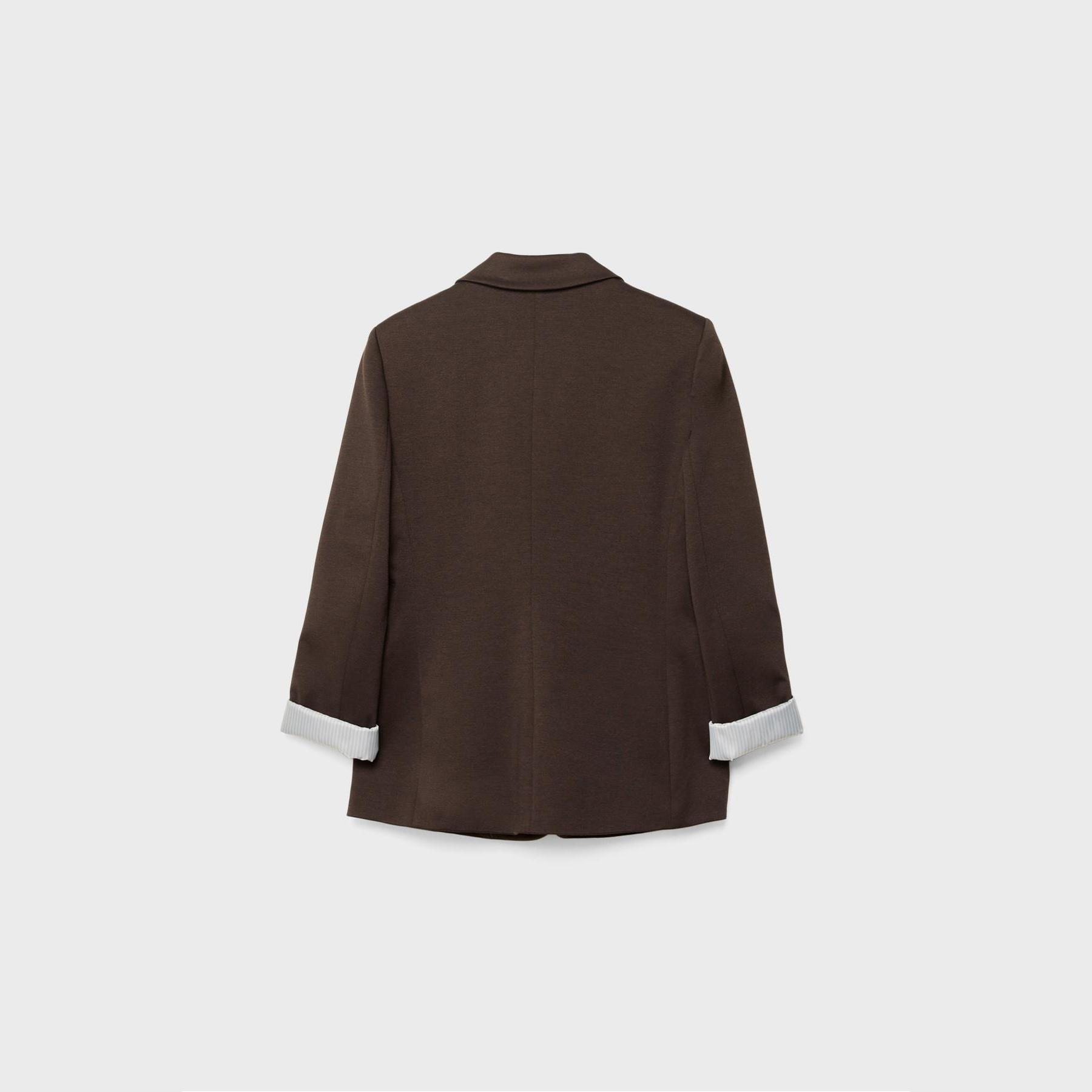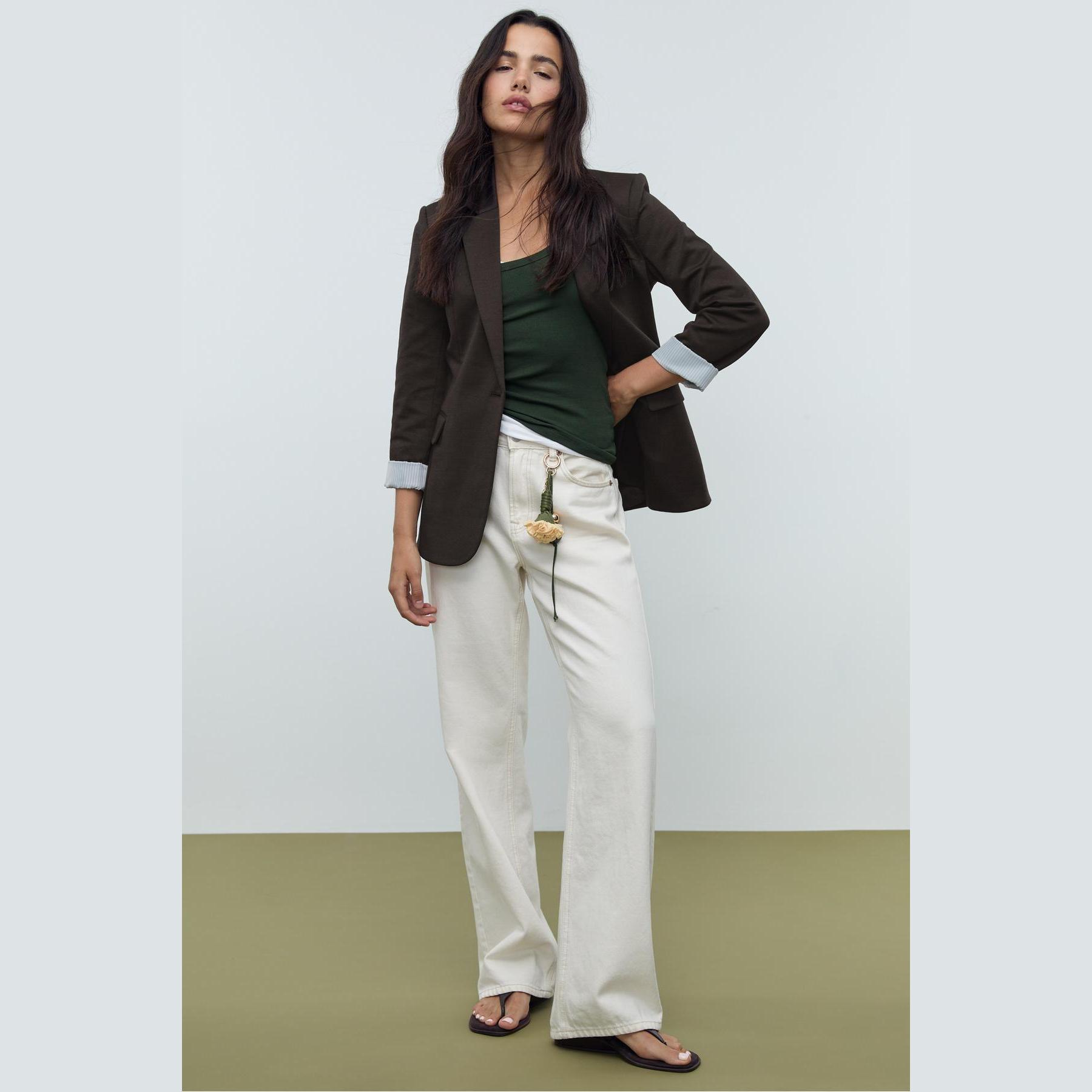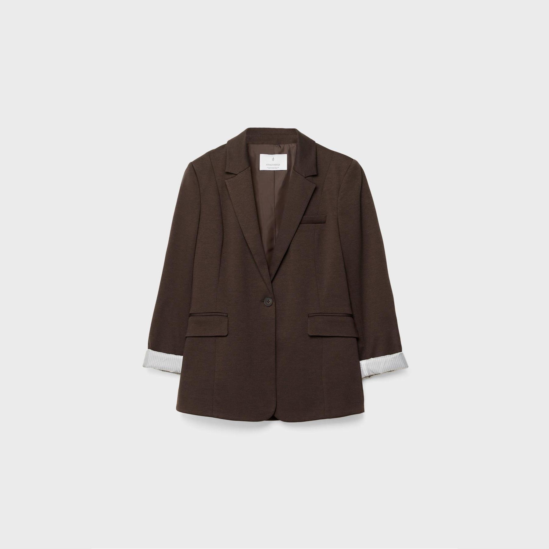 بليزر أنيق من Stradivarius بلون بني، مصنوع من خامة مرنة بتركيبة 75% بوليستر، 20% فيسكوز، 5% إيلاستان، يتميز بقصة ضيقة Slim Fit، ياقة مطوية كلاسيكية، أكمام طويلة قابلة للطي، إغلاق أمامي بأزرار، مزود بجيوب أمامية بغطاء، تصميم سادة بملمس ناعم، مبطّن بالكامل بخطوط داخلية، مثالي للتنسيق مع بنطال رسمي أو تنورة لإطلالة مكتبية أنيقة.