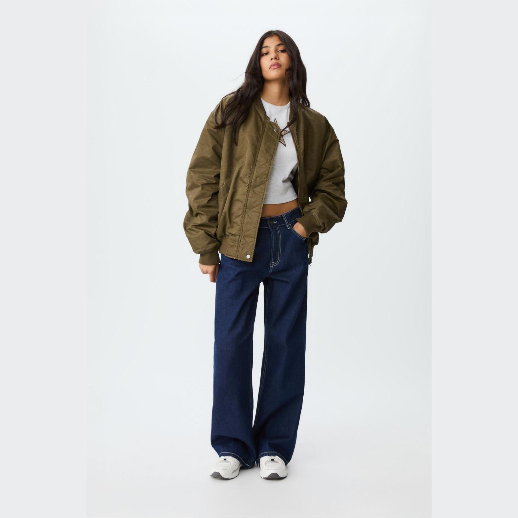 جاكيت بومبر أنيق من Stradivarius بلون أخضر داكن، مصنوع من خامة ناعمة بتركيبة 75% بولياميد، 25% بوليستر، يتميز بقصة Regular Fit، ياقة عالية، أكمام طويلة مع أساور مطاطية، إغلاق أمامي بسحاب معدني مع كبسات داخلية، مزود بجيبين أماميين بفتحة مائلة، تصميم بملمس مغسول وتفاصيل Ribana بلون متباين، بدون بطانة، ملمس داخلي ناعم، مثالي للتنسيق مع بنطال كاجوال أو ليقنز لإطلالة يومية مريحة.