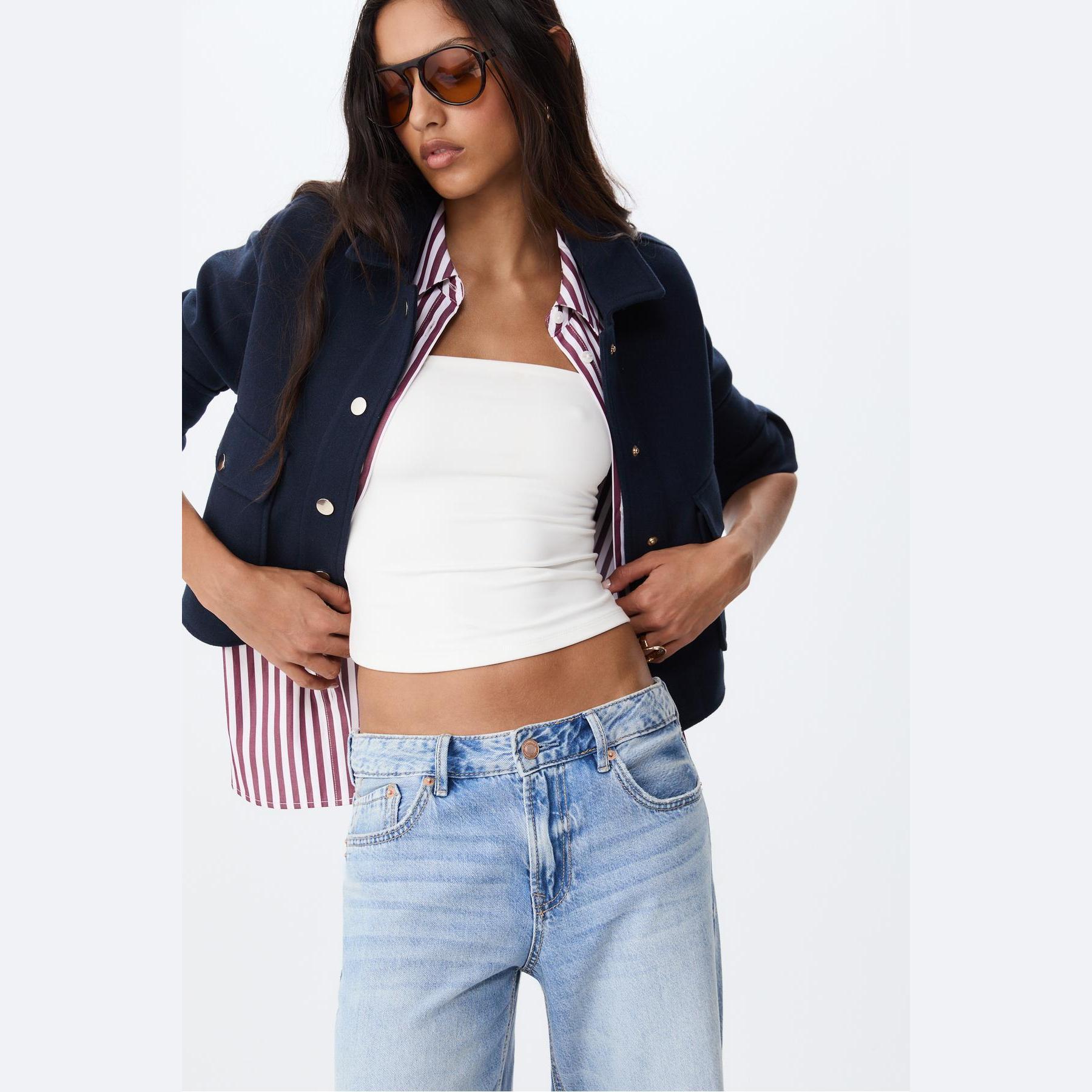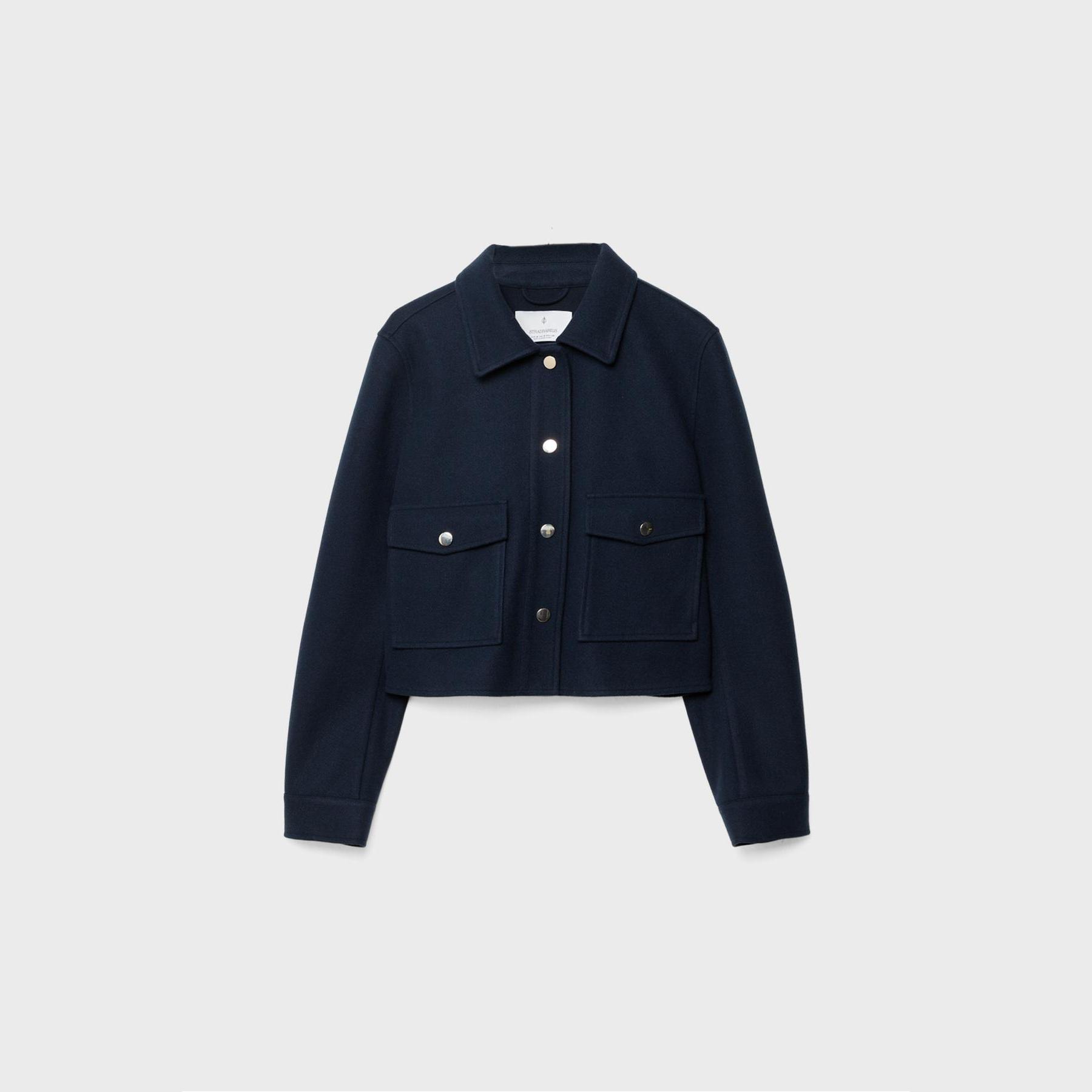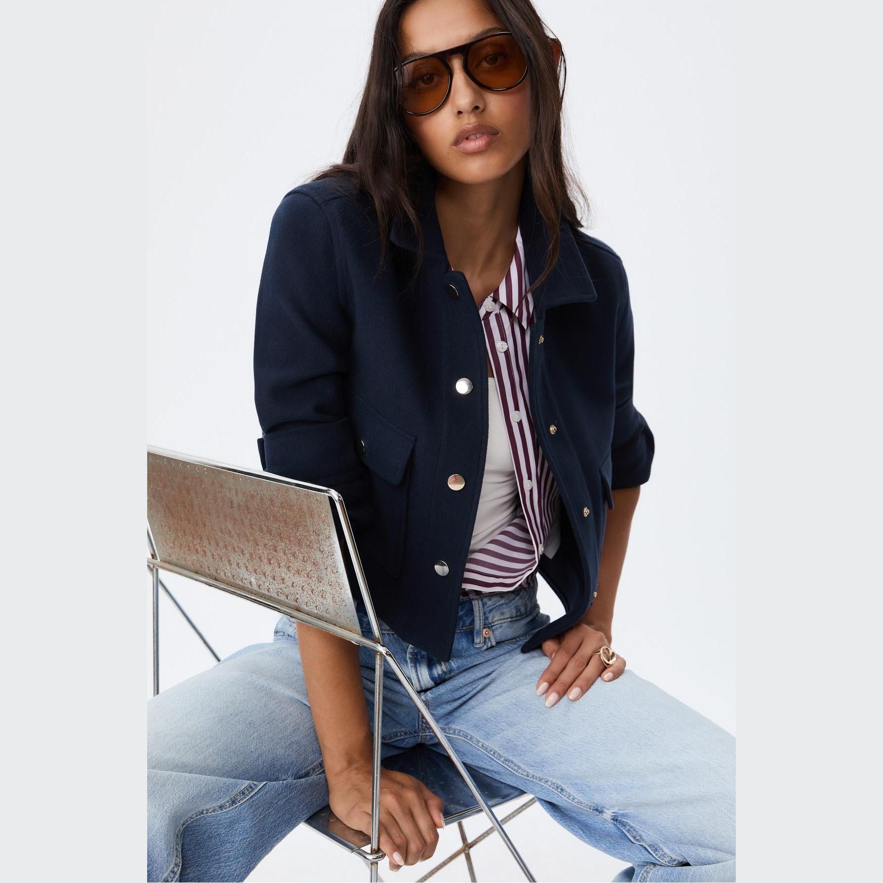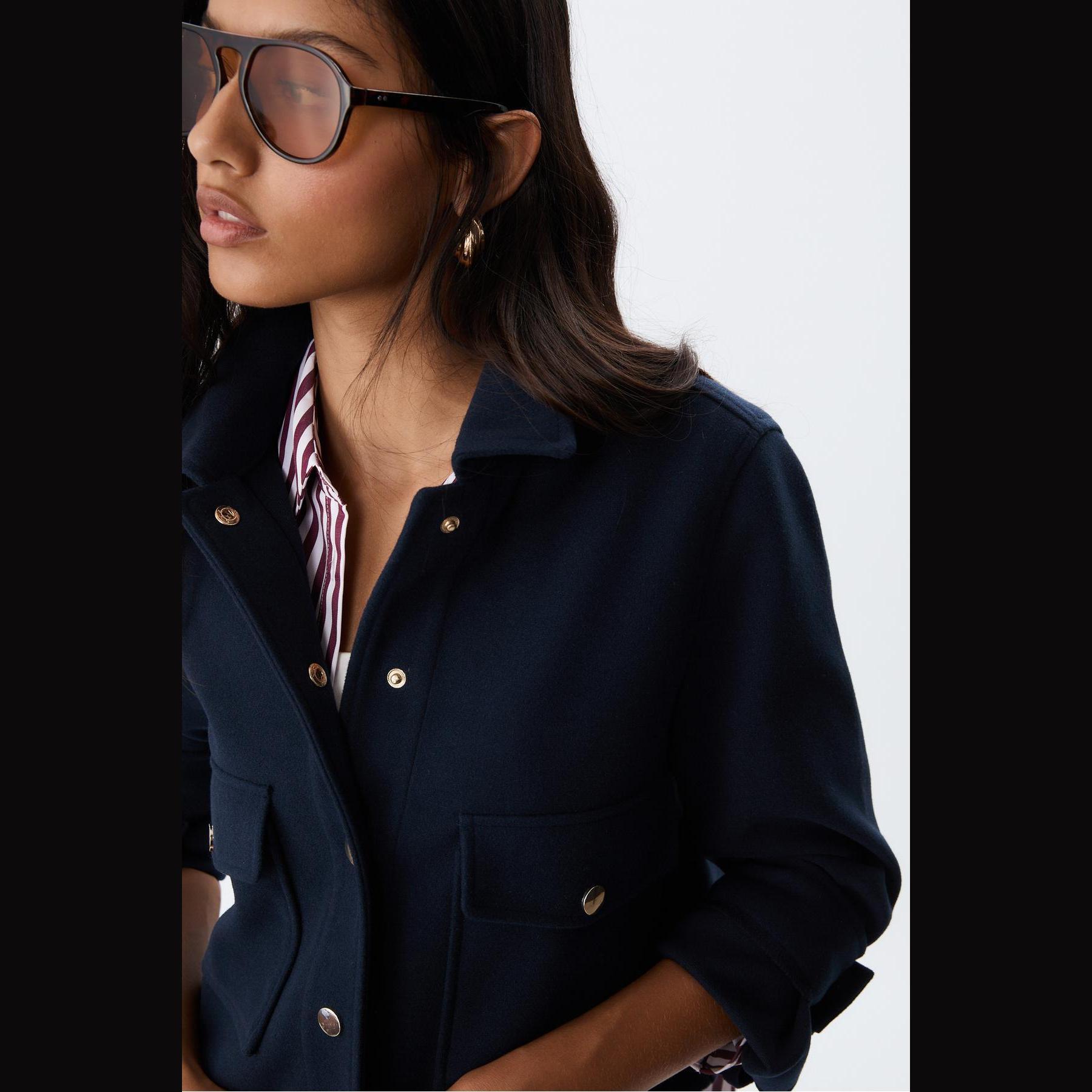 جاكيت عملي من Stradivarius بلون كحلي بنقشة مربعات، مصنوع من خامة ناعمة بتركيبة 100% بوليستر، يتميز بقصة Regular Fit، ياقة قميص كلاسيكية، أكمام طويلة مع أساور، إغلاق أمامي بأزرار كبس، مزود بجيوب أمامية بغطاء، تصميم بملمس مخملي ناعم، بدون بطانة، مثالي للتنسيق مع بنطال جينز أو تنورة قصيرة لإطلالة يومية دافئة.