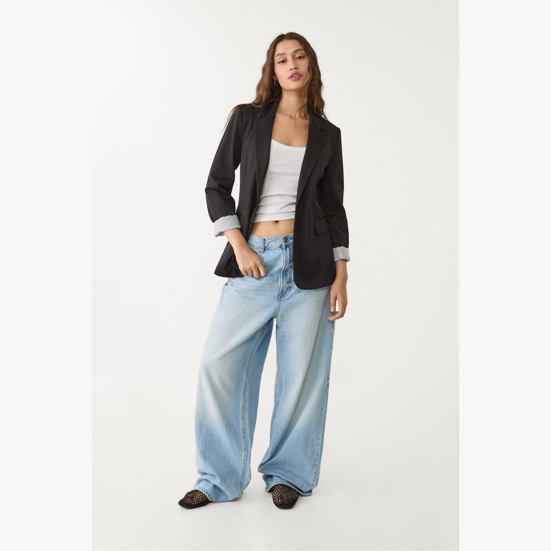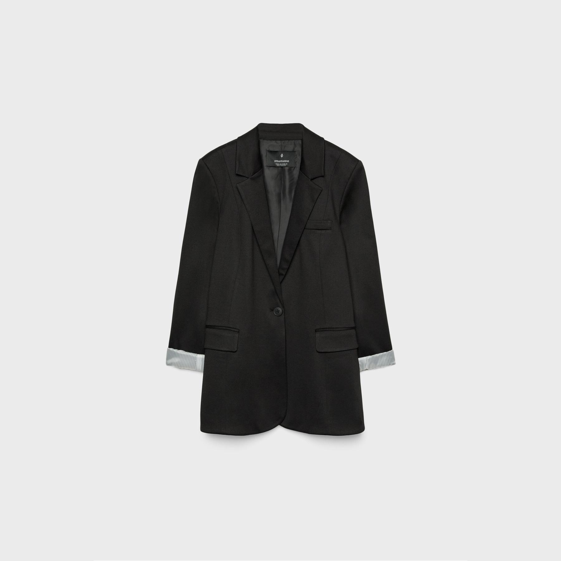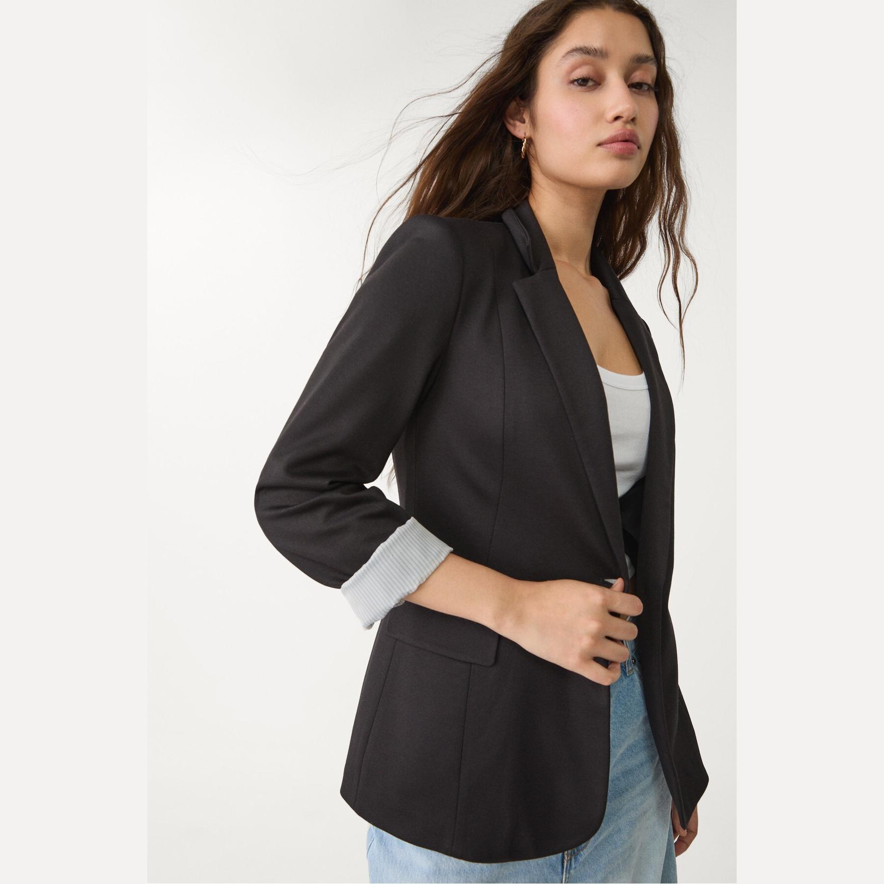 بليزر أنيق من Stradivarius بلون أسود، مصنوع من خامة مرنة بتركيبة 75% بوليستر، 20% فيسكوز، 5% إيلاستان، يتميز بقصة ضيقة Slim Fit، ياقة مطوية كلاسيكية، أكمام طويلة قابلة للطي، إغلاق أمامي بأزرار، مزود بجيوب أمامية بغطاء، تصميم سادة بملمس ناعم، مبطّن بالكامل بخطوط داخلية، مثالي للتنسيق مع بنطال رسمي أو تنورة لإطلالة مكتبية أنيقة.
