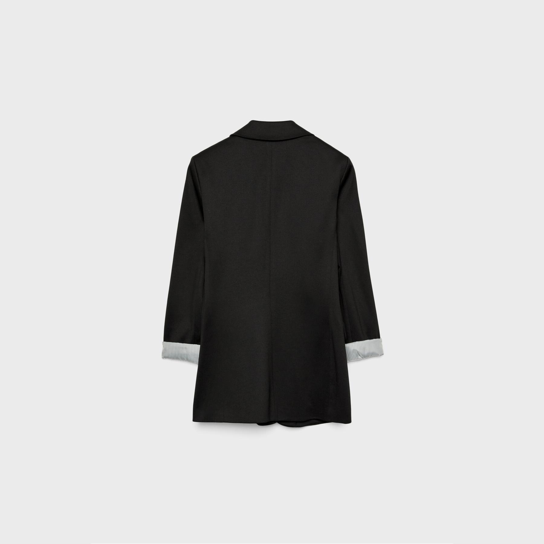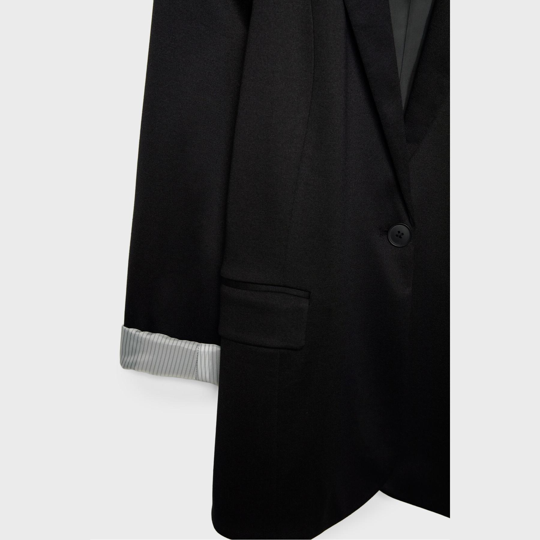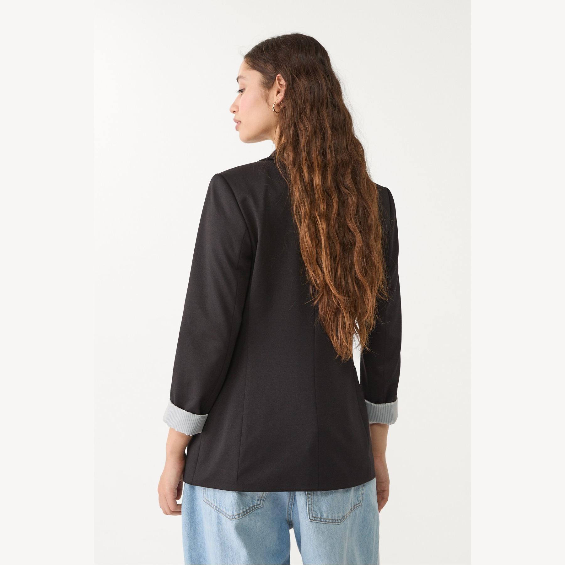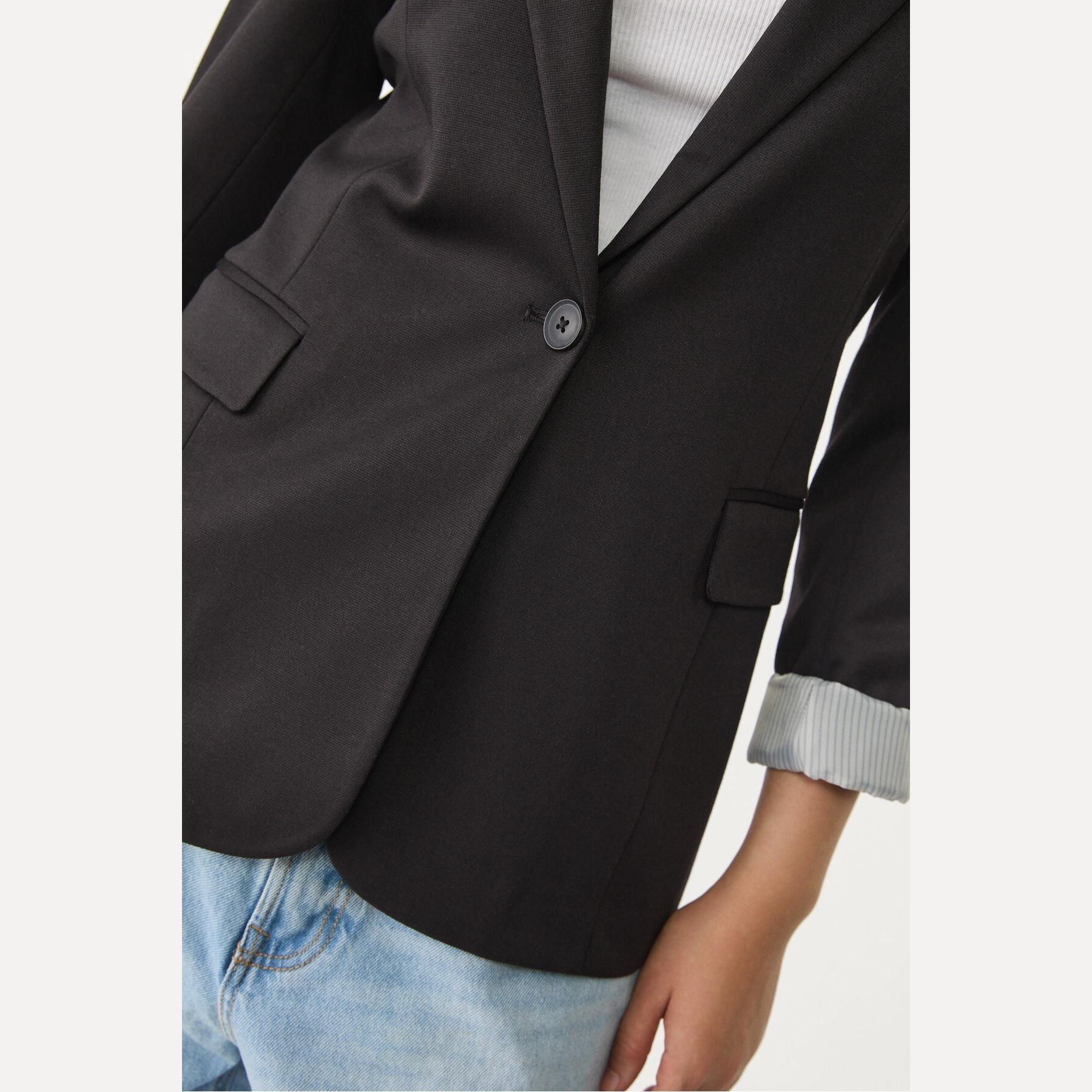بليزر أنيق من Stradivarius بلون أسود، مصنوع من خامة مرنة بتركيبة 75% بوليستر، 20% فيسكوز، 5% إيلاستان، يتميز بقصة ضيقة Slim Fit، ياقة مطوية كلاسيكية، أكمام طويلة قابلة للطي، إغلاق أمامي بأزرار، مزود بجيوب أمامية بغطاء، تصميم سادة بملمس ناعم، مبطّن بالكامل بخطوط داخلية، مثالي للتنسيق مع بنطال رسمي أو تنورة لإطلالة مكتبية أنيقة.