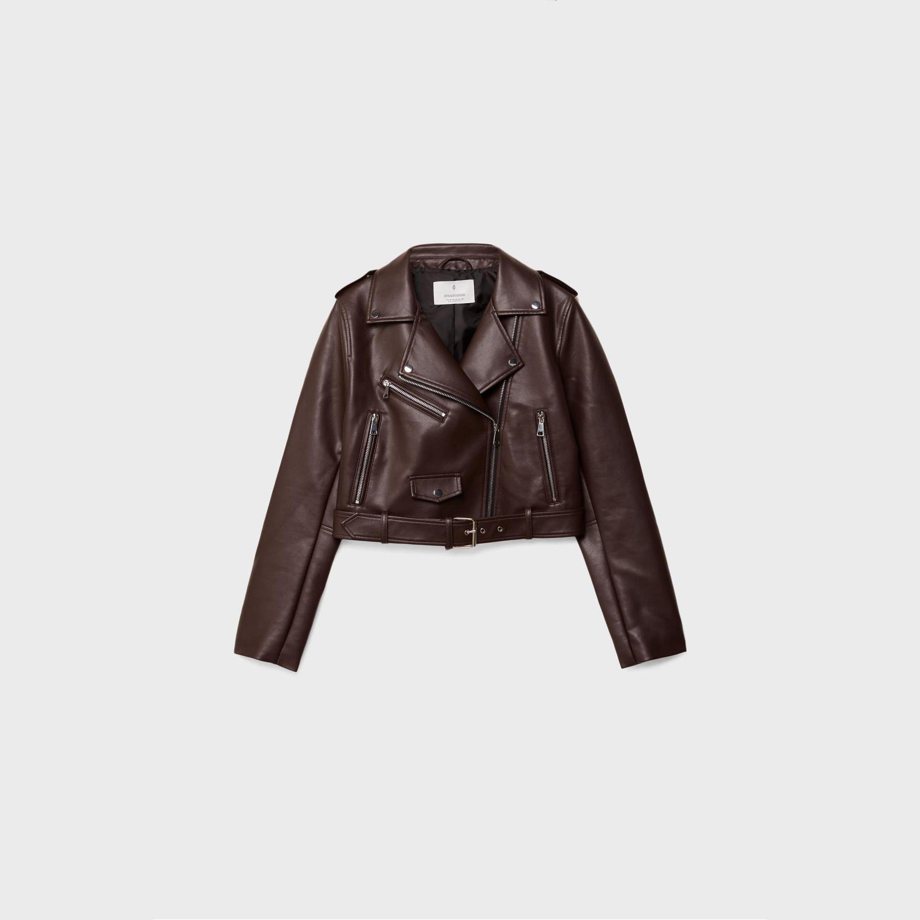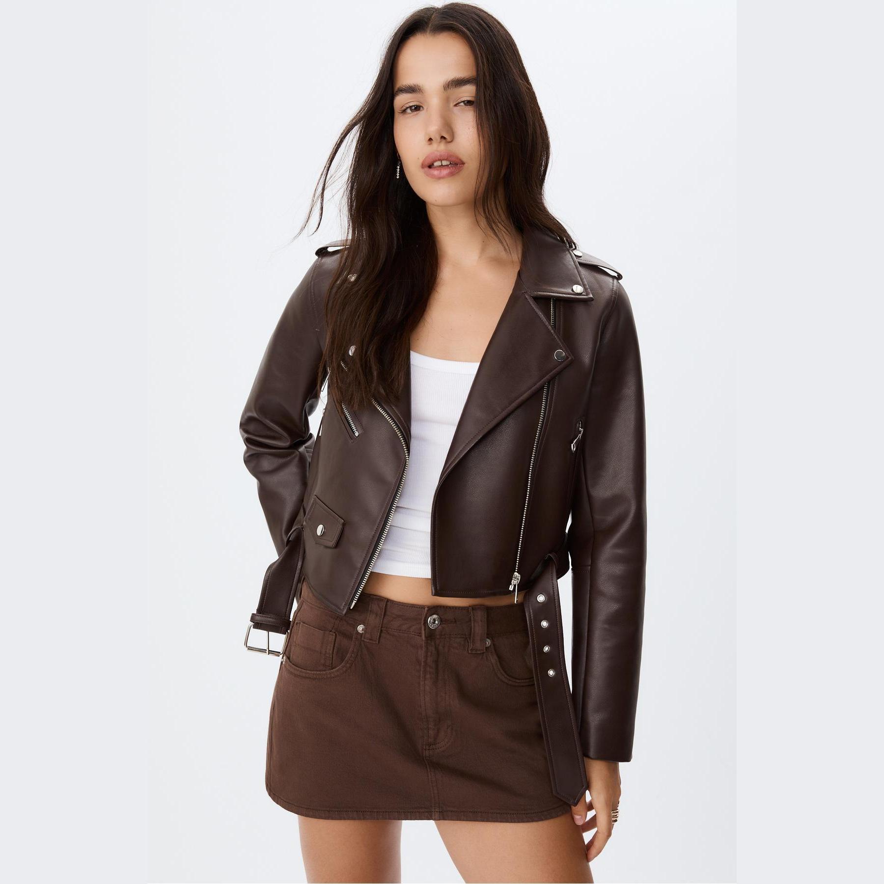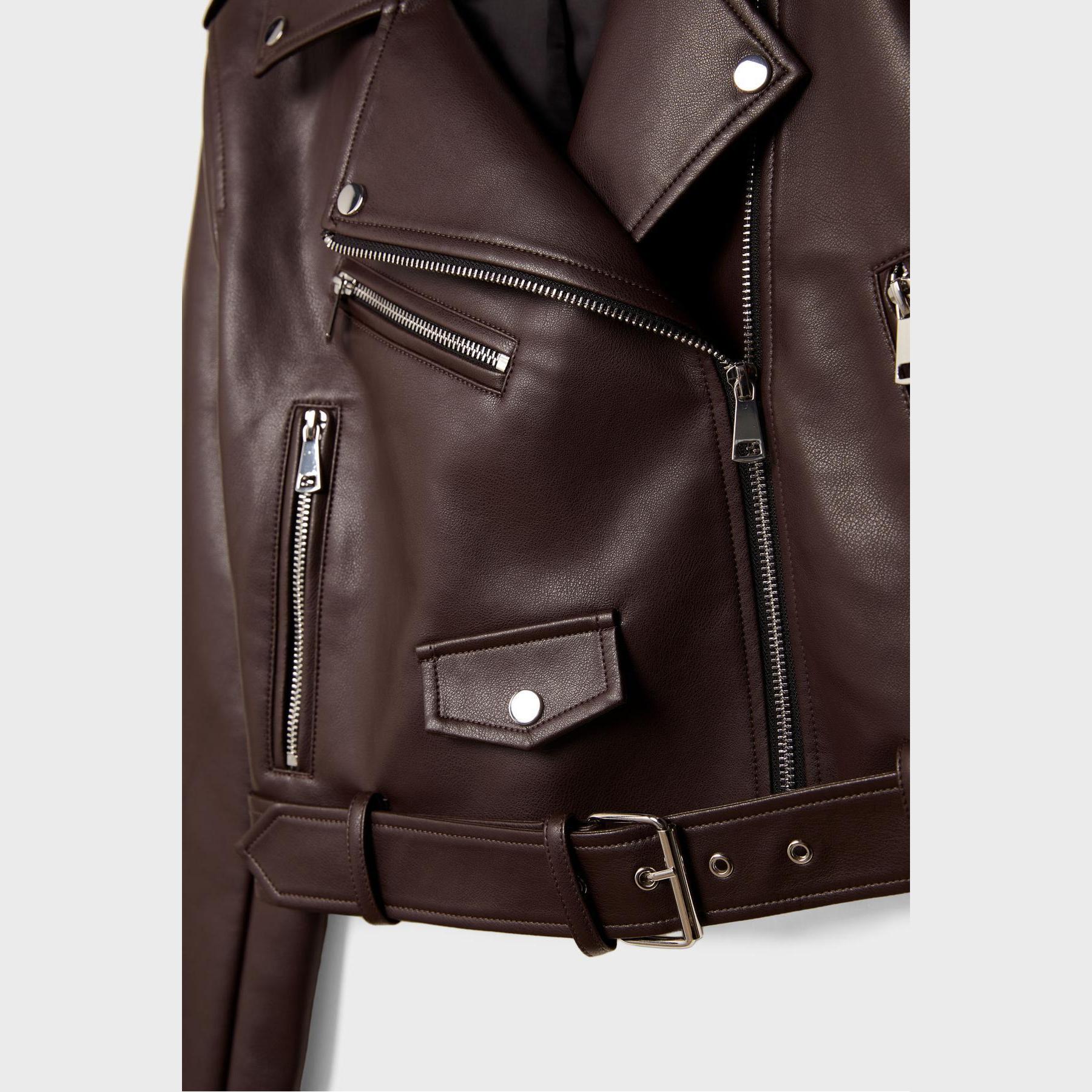 جاكيت بايكر من الجلد الصناعي مع حزام – بني من Stradivarius