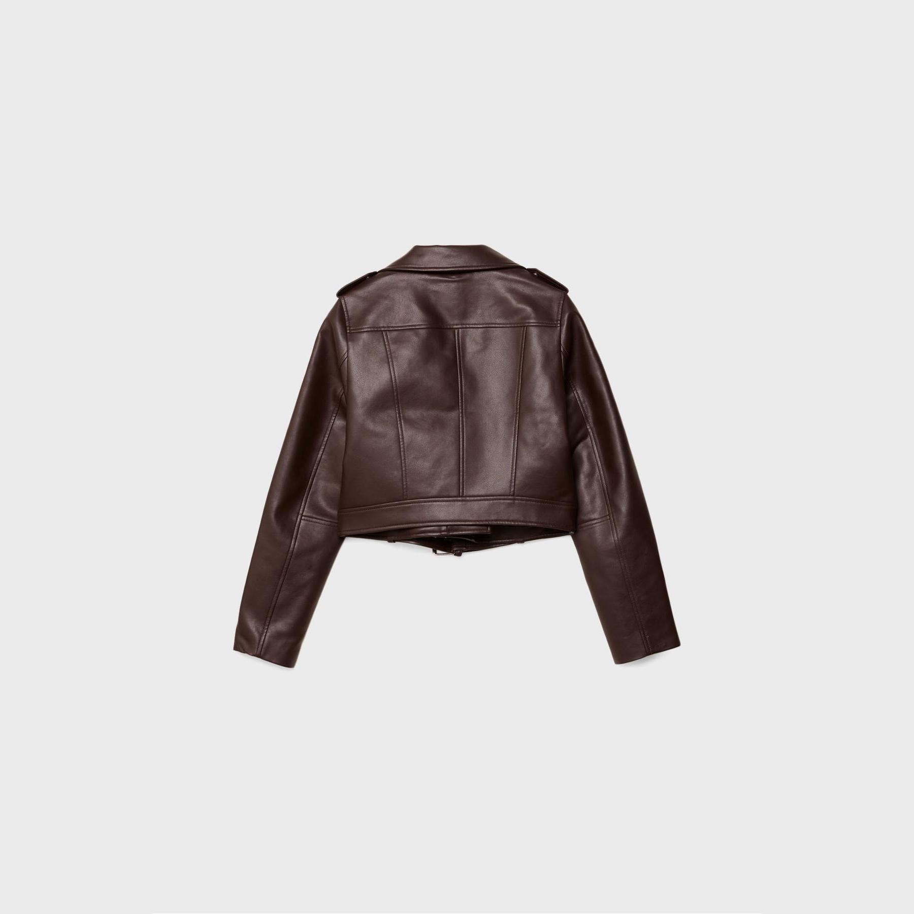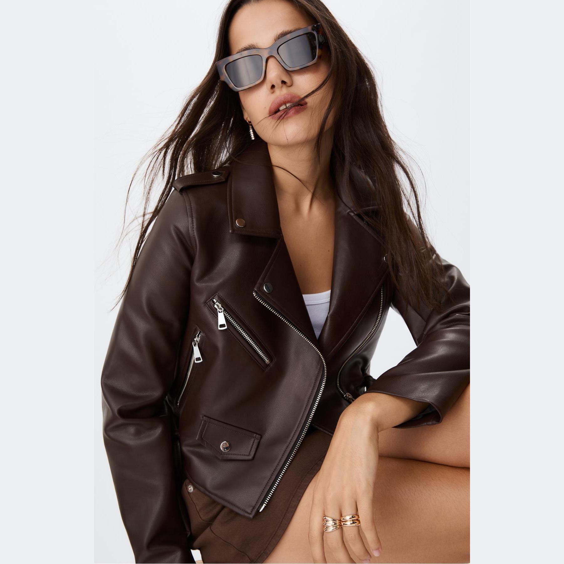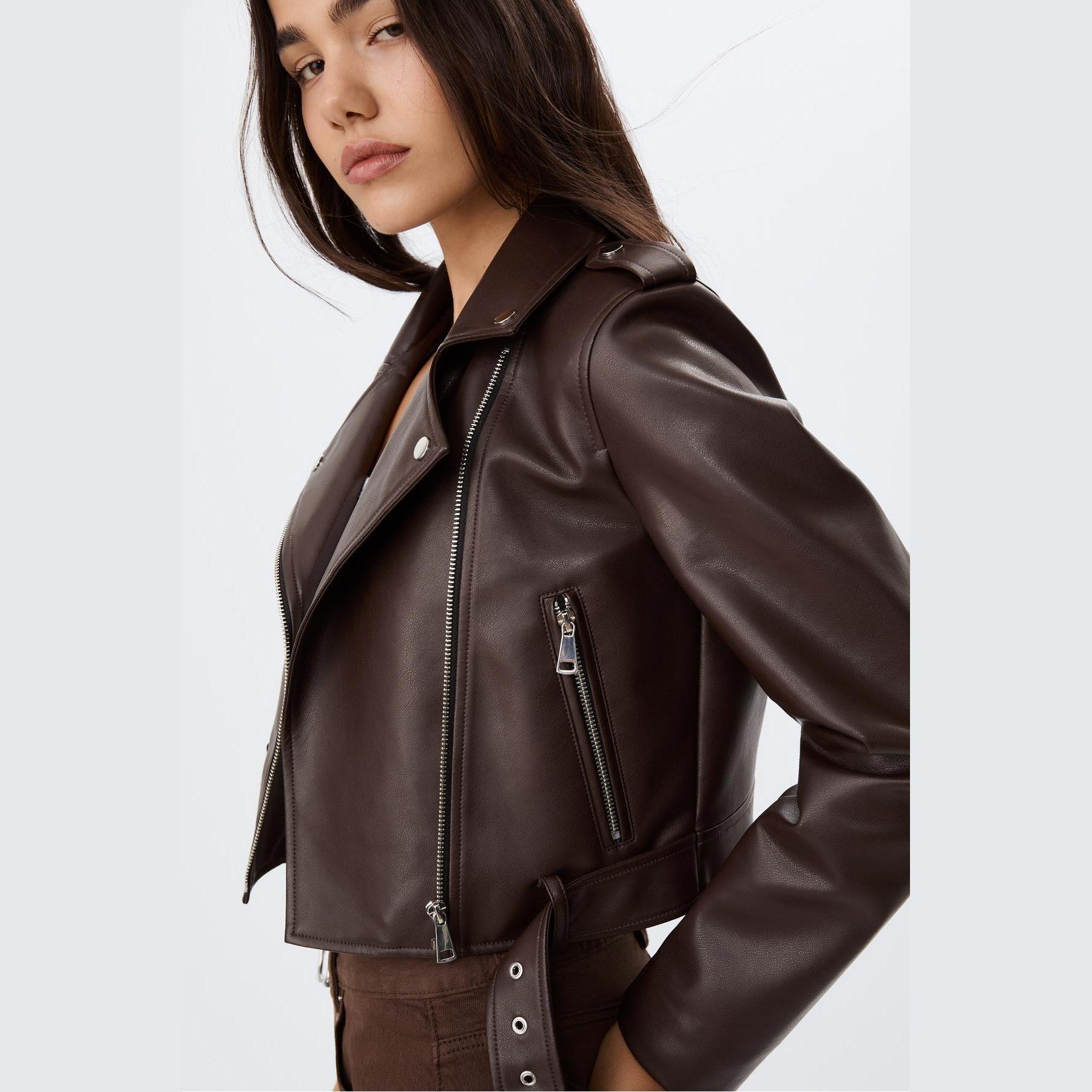 جاكيت بايكر أنيق من Stradivarius بلون بني، مصنوع من خامة جلد صناعي بتركيبة 55% بولي يوريثان، 41% بوليستر، 3% قطن، 1% فيسكوز، يتميز بقصة Regular Fit، ياقة بايكر كلاسيكية، أكمام طويلة، إغلاق أمامي بسحاب مائل، مزود بجيبين أماميين بسحاب، تصميم سادة بملمس لامع، مزود بحزام عند الخصر لتعزيز الشكل، مبطّن بالكامل، مثالي للتنسيق مع قطع كاجوال أو إطلالات مسائية جريئة.