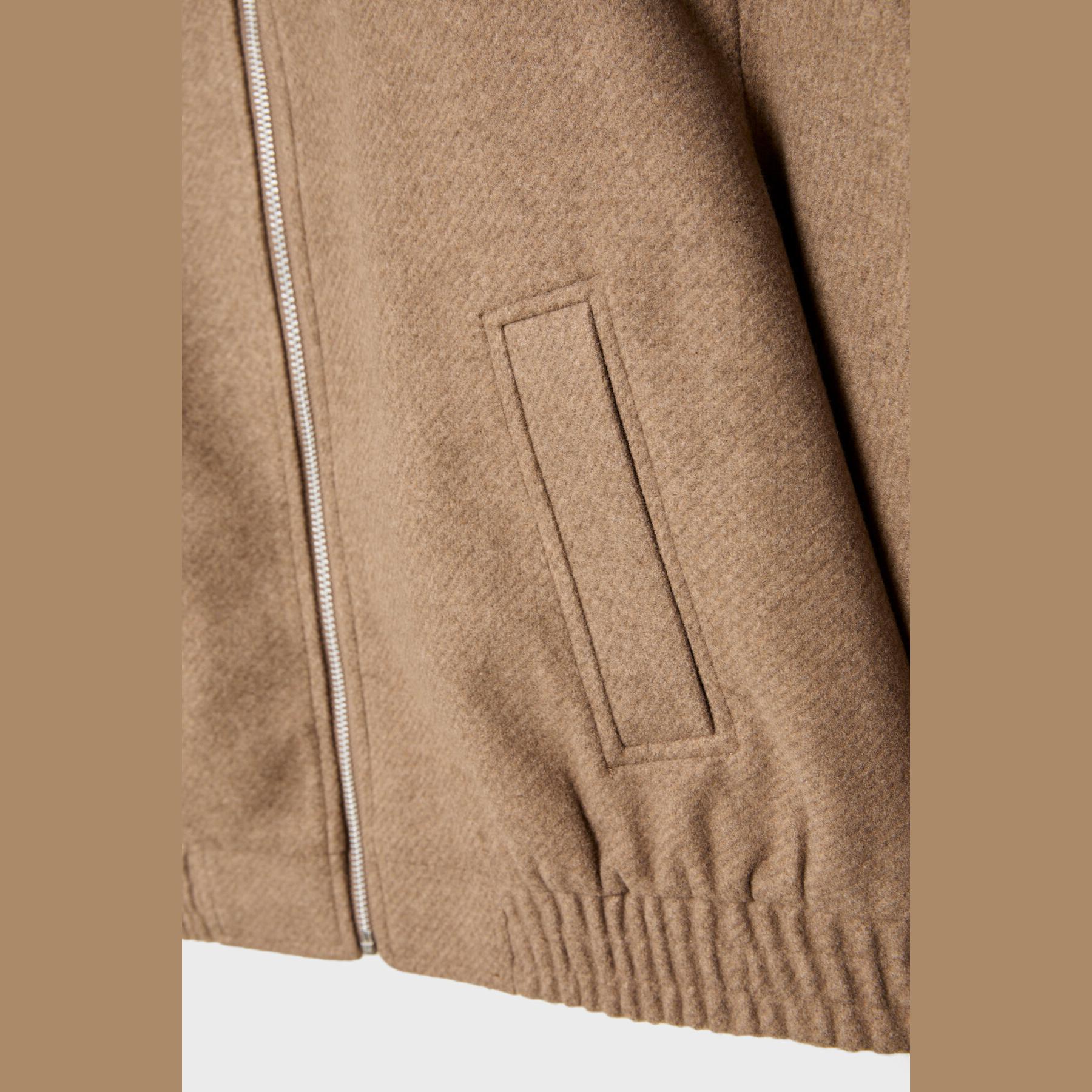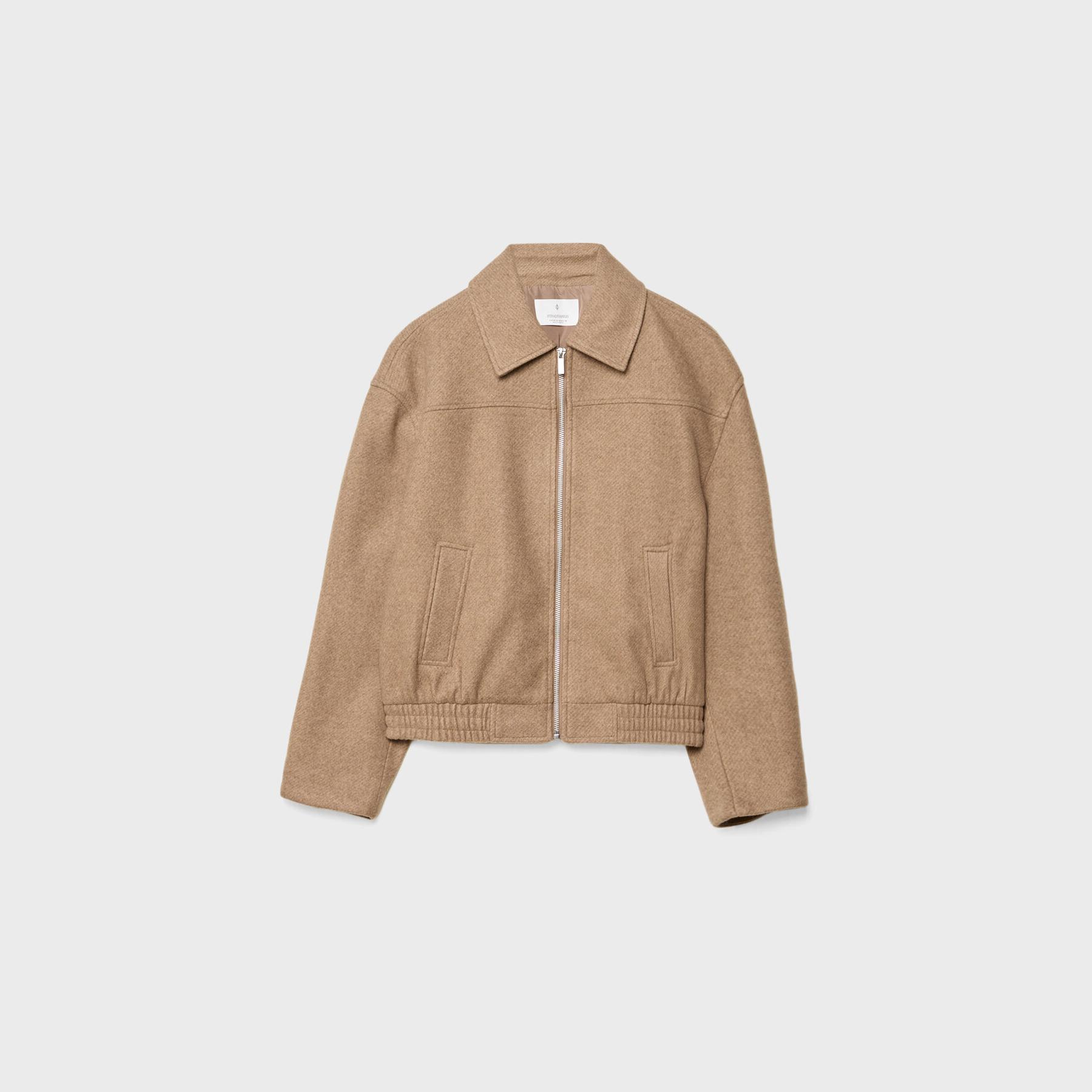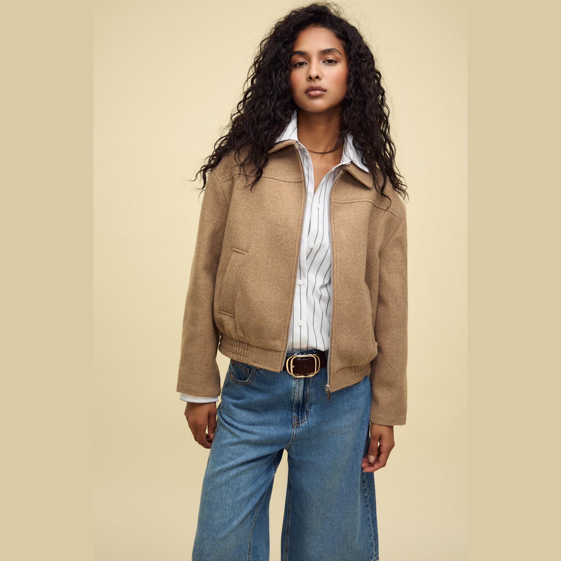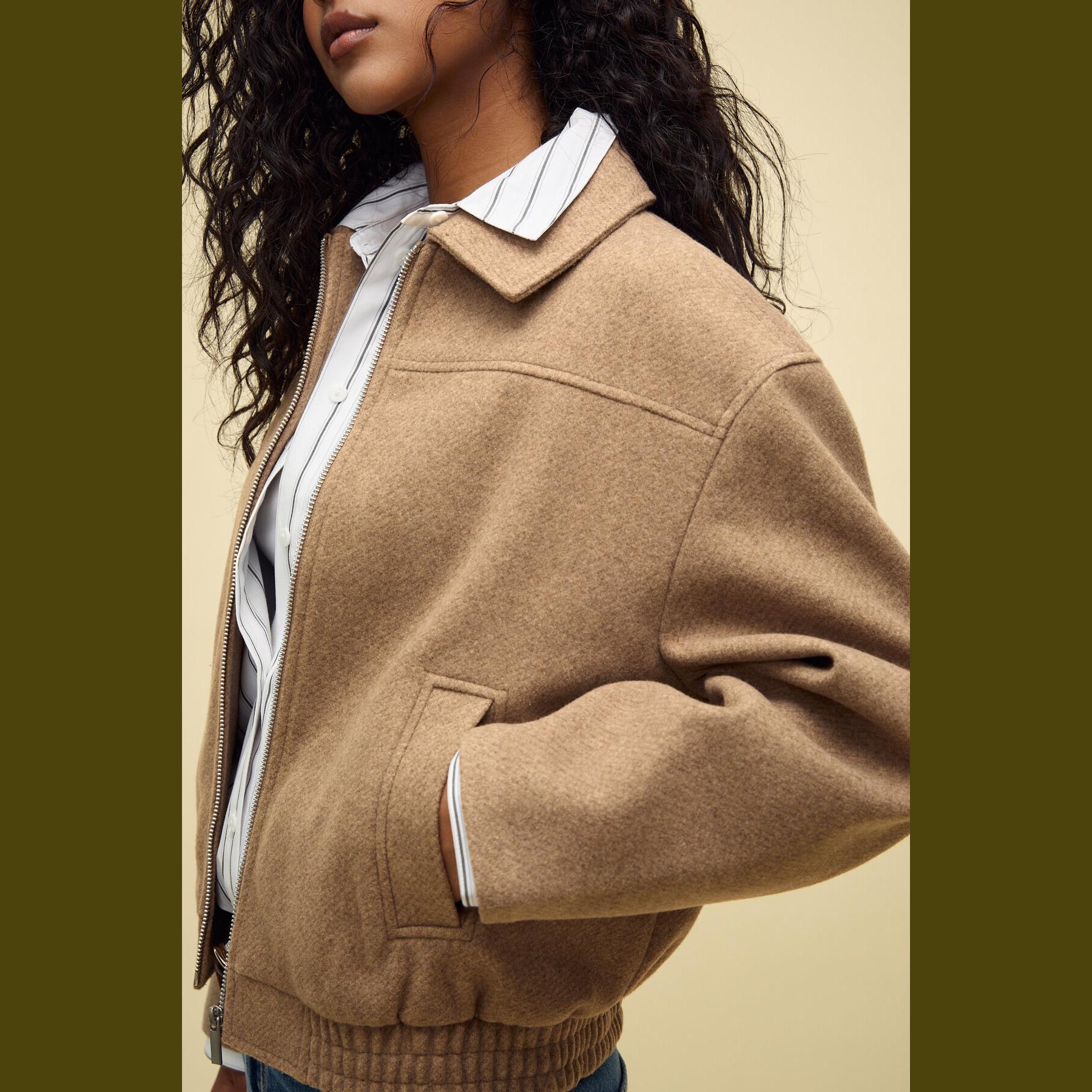 جاكيت بومبر أنيق من Stradivarius بلون كاميل، مصنوع من خامة ناعمة بتركيبة 100% بوليستر، يتميز بقصة Oversize، ياقة بومبر كلاسيكية، أكمام طويلة، إغلاق أمامي بسحاب معدني، مزود بجيبين أماميين بفتحة مائلة، تصميم سادة بملمس مغسول، حافة سفلية مطاطية، بدون بطانة، ملمس داخلي ناعم، مثالي للتنسيق مع بنطال كاجوال أو ليقنز لإطلالة يومية مريحة.