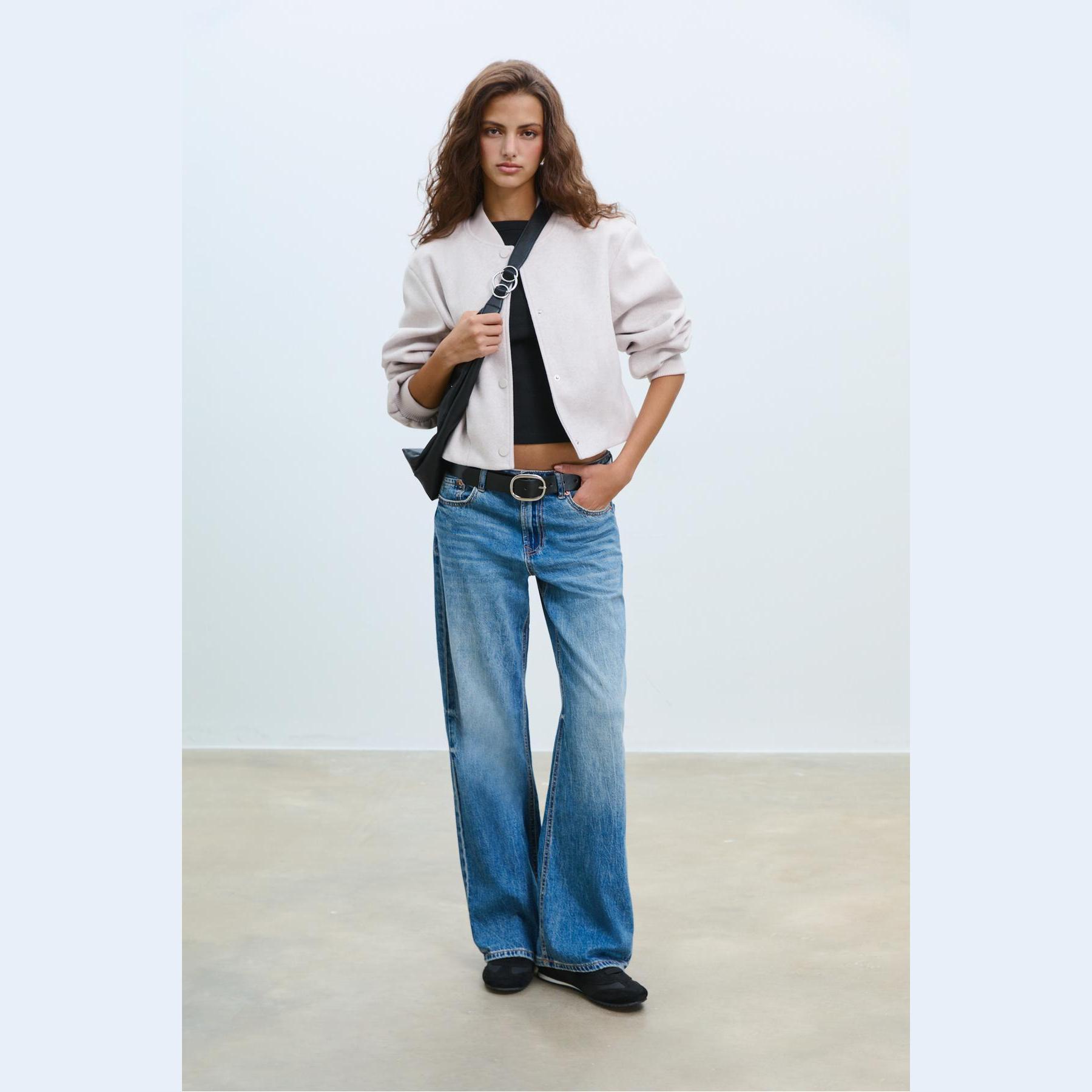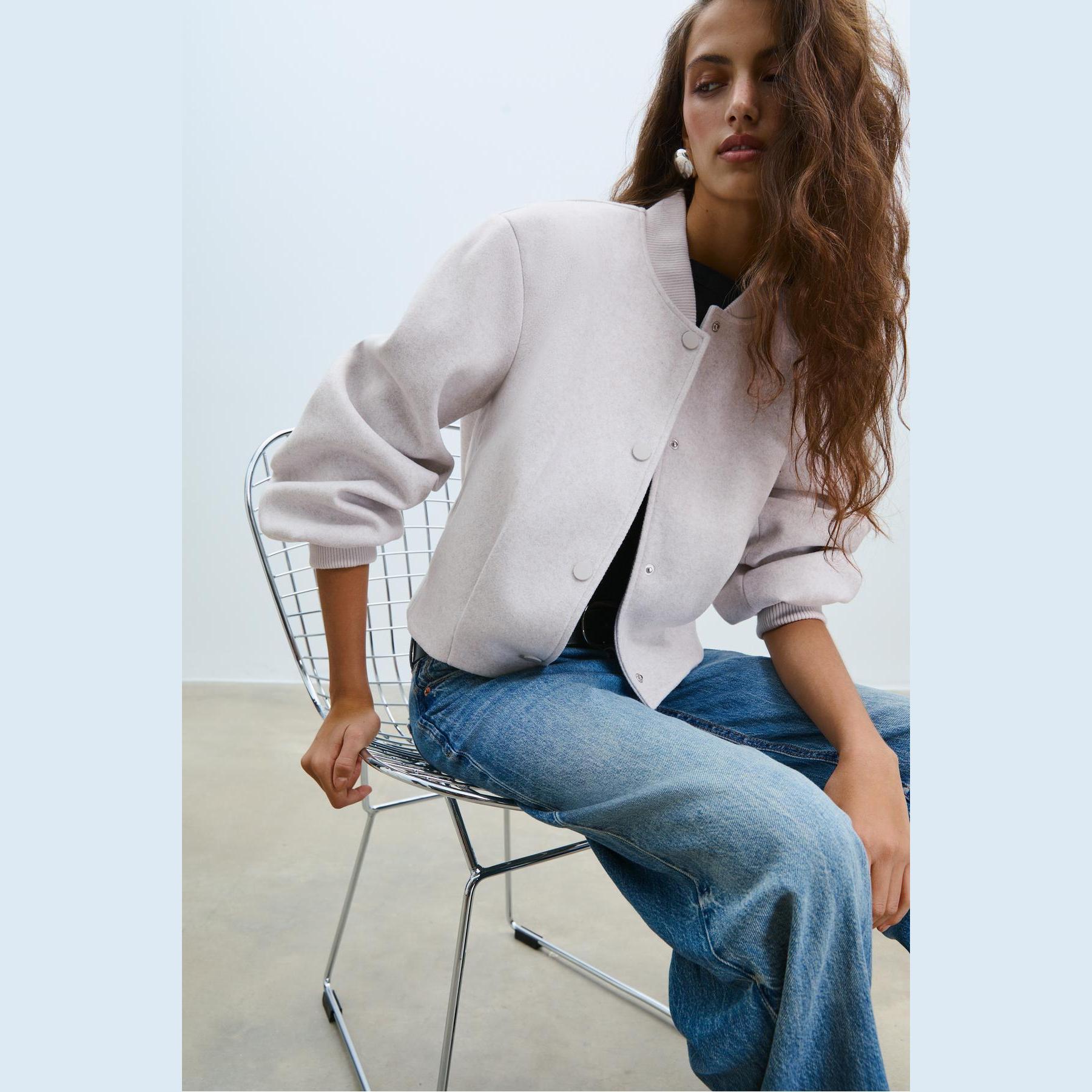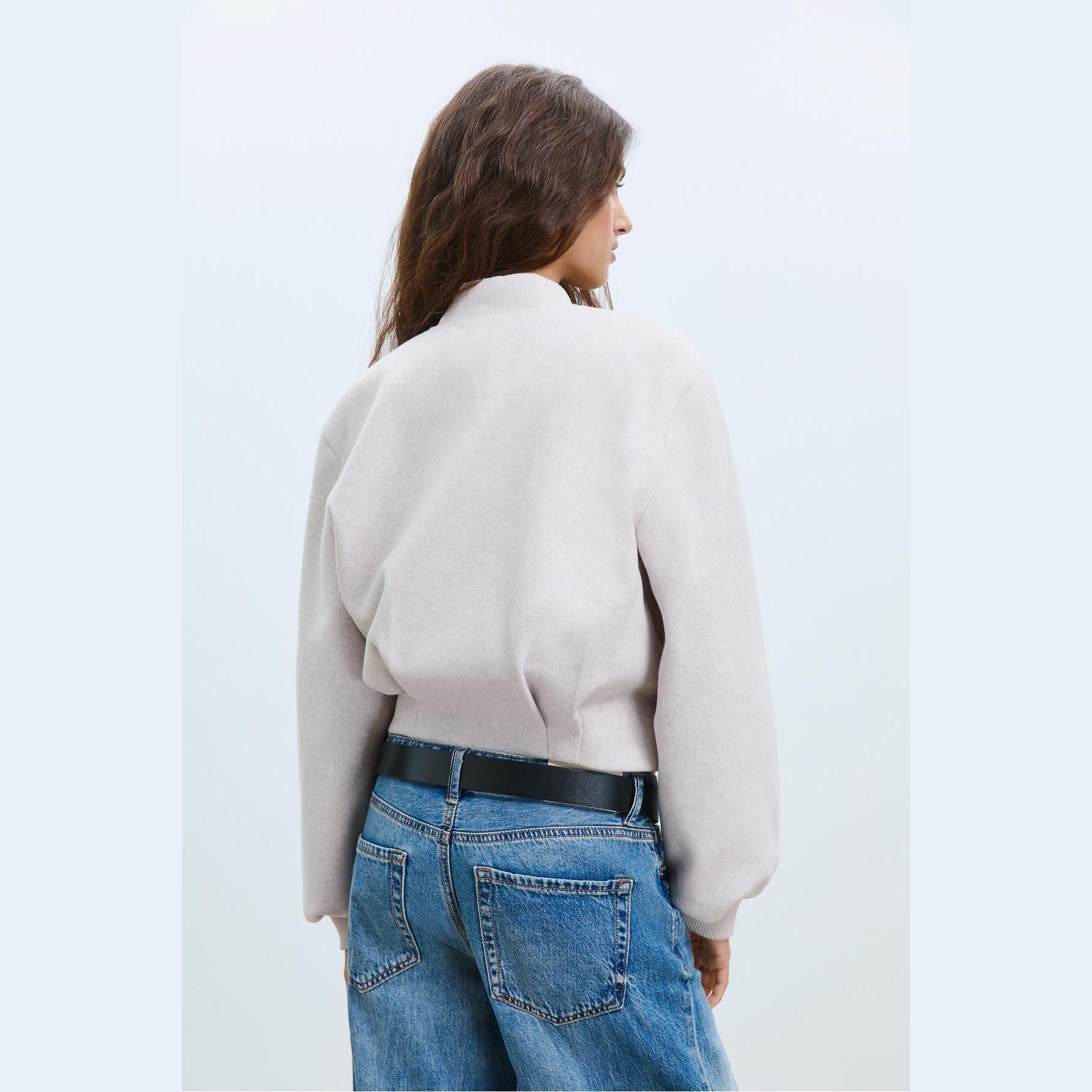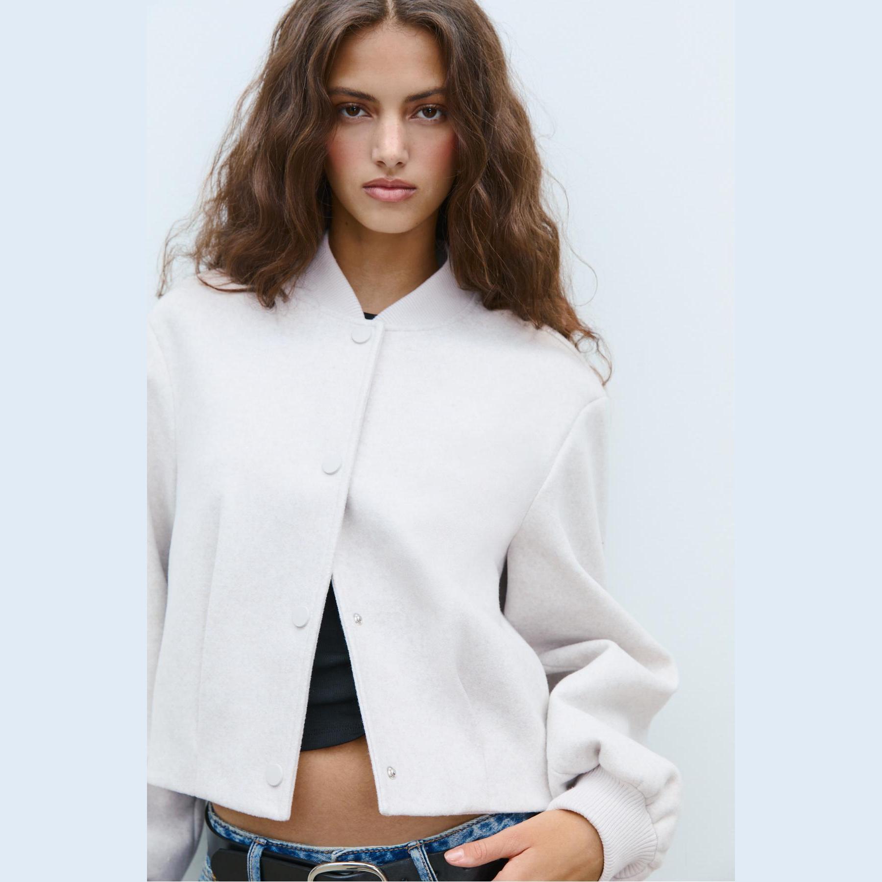 جاكيت بومبر أنيق من Stradivarius بلون إكرو بنقشة مربعات، مصنوع من خامة ناعمة بتركيبة 100% بوليستر، يتميز بقصة Regular Fit، ياقة نصف عالية، أكمام طويلة بأساور مطاطية، إغلاق أمامي بسحاب، مزود بجيبين جانبيين، تصميم بملمس مغسول وتفاصيل Ribana بلون متناسق، بدون بطانة، ملمس داخلي ناعم، مثالي للتنسيق مع بنطال جينز أو ليقنز لإطلالة يومية مريحة.