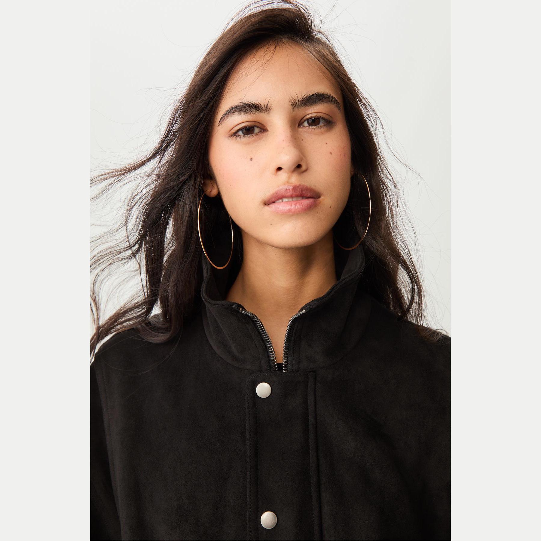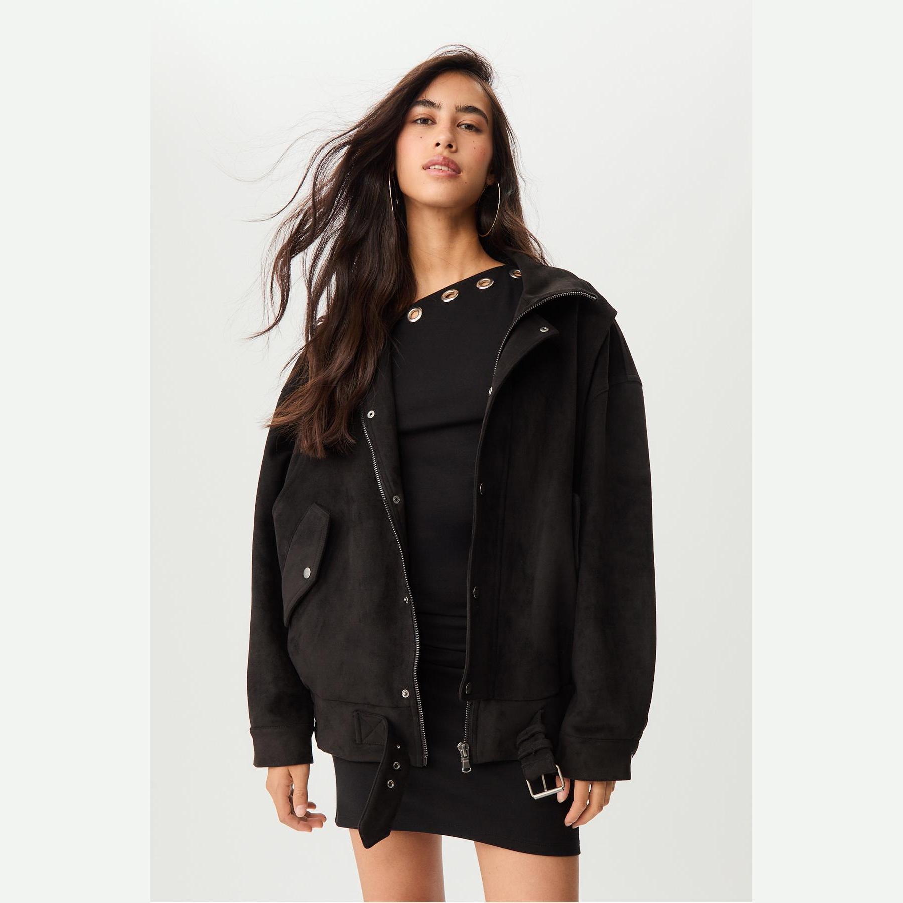 جاكيت بايكر أنيق من Stradivarius بلون أسود، مصنوع من خامة شمواه صناعي بتركيبة 100% بوليستر، يتميز بقصة Regular Fit، ياقة بايكر مرتفعة، أكمام طويلة مع أساور بأزرار، إغلاق أمامي بسحاب معدني مخفي تحت بات مع كبسات، مزود بجيوب جانبية بغطاء وأزرار، تصميم سادة بملمس ناعم، حافة سفلية مطاطية مع تفاصيل حلقات، بدون بطانة، مثالي للتنسيق مع بنطال جينز أو تنورة قصيرة لإطلالة يومية أو مسائية.