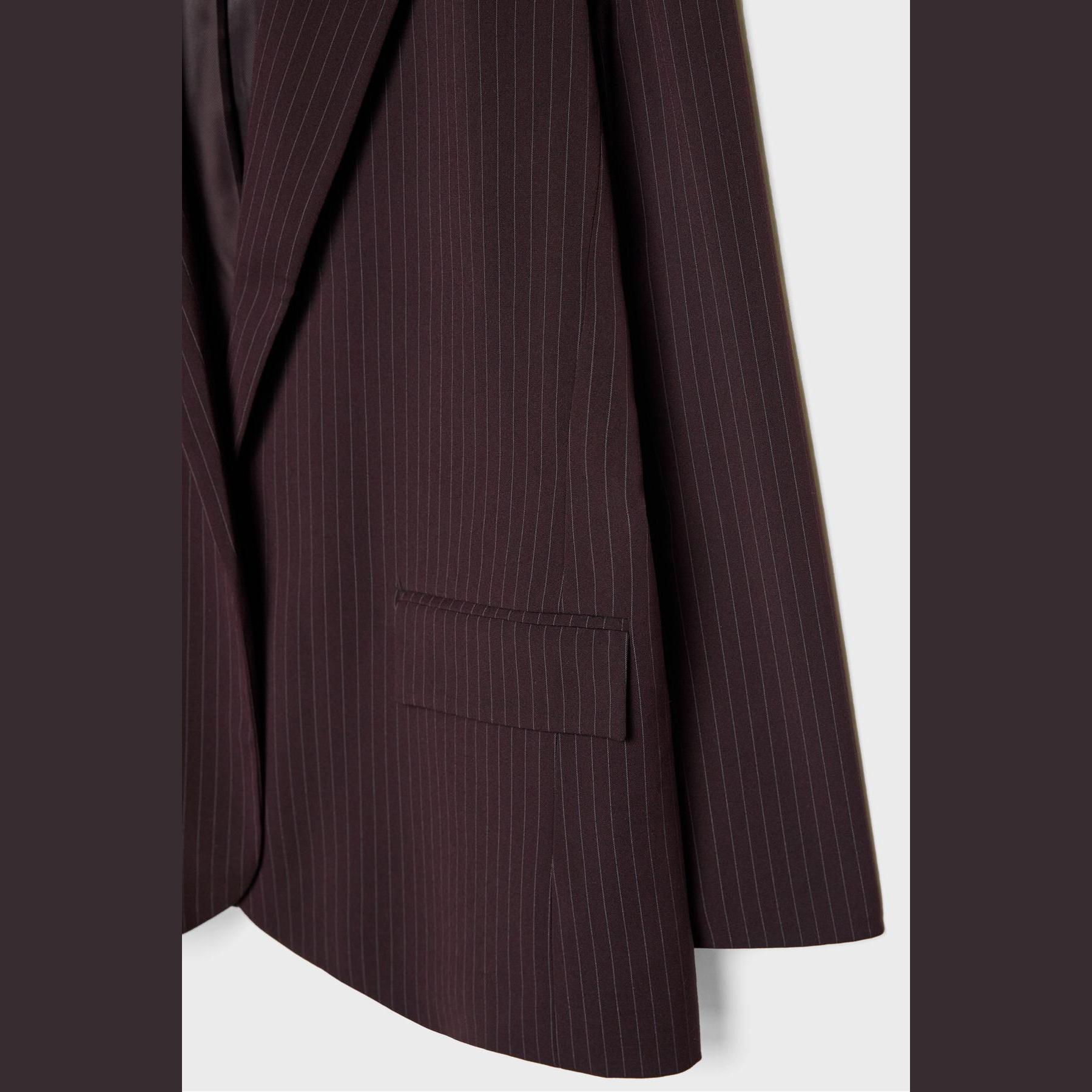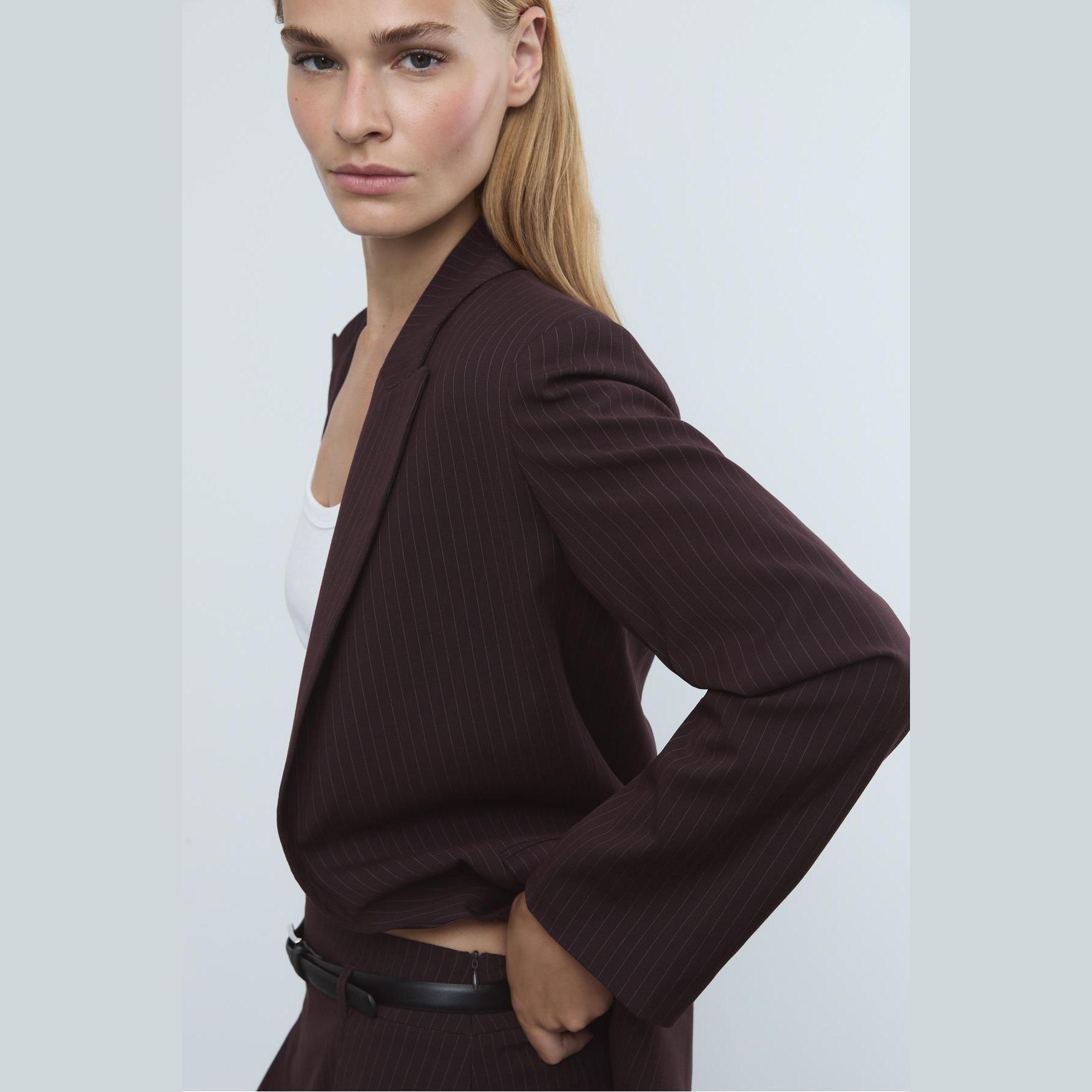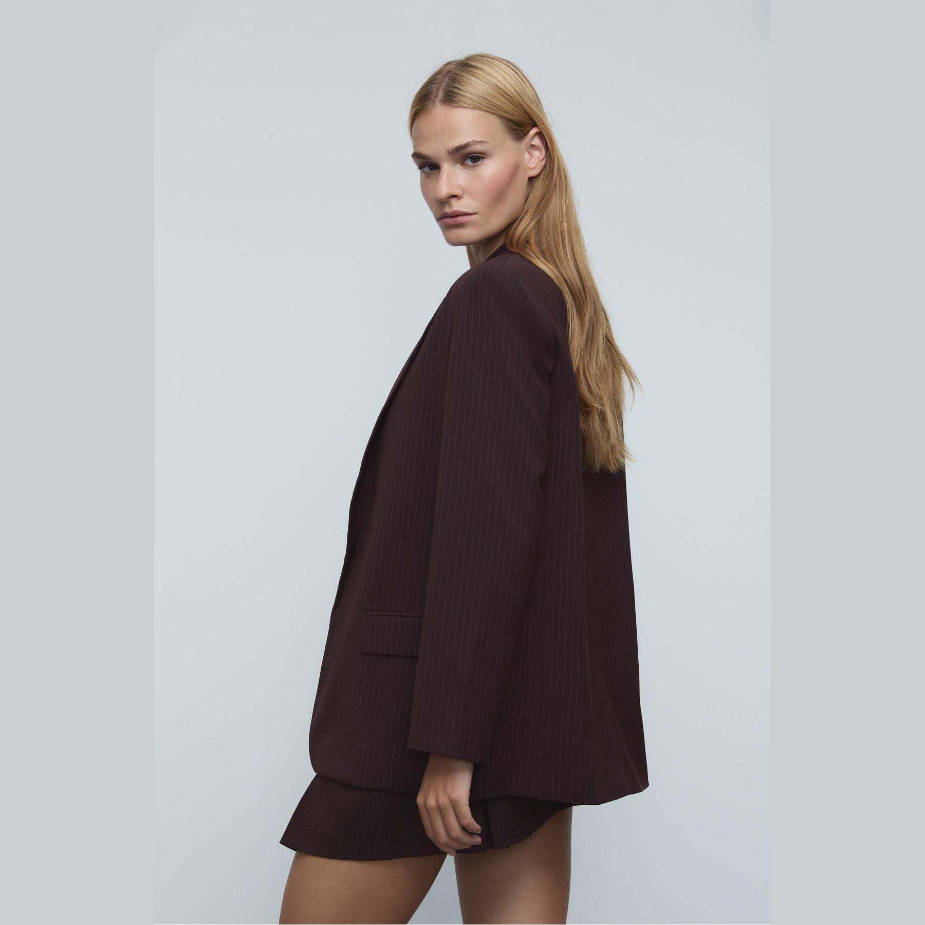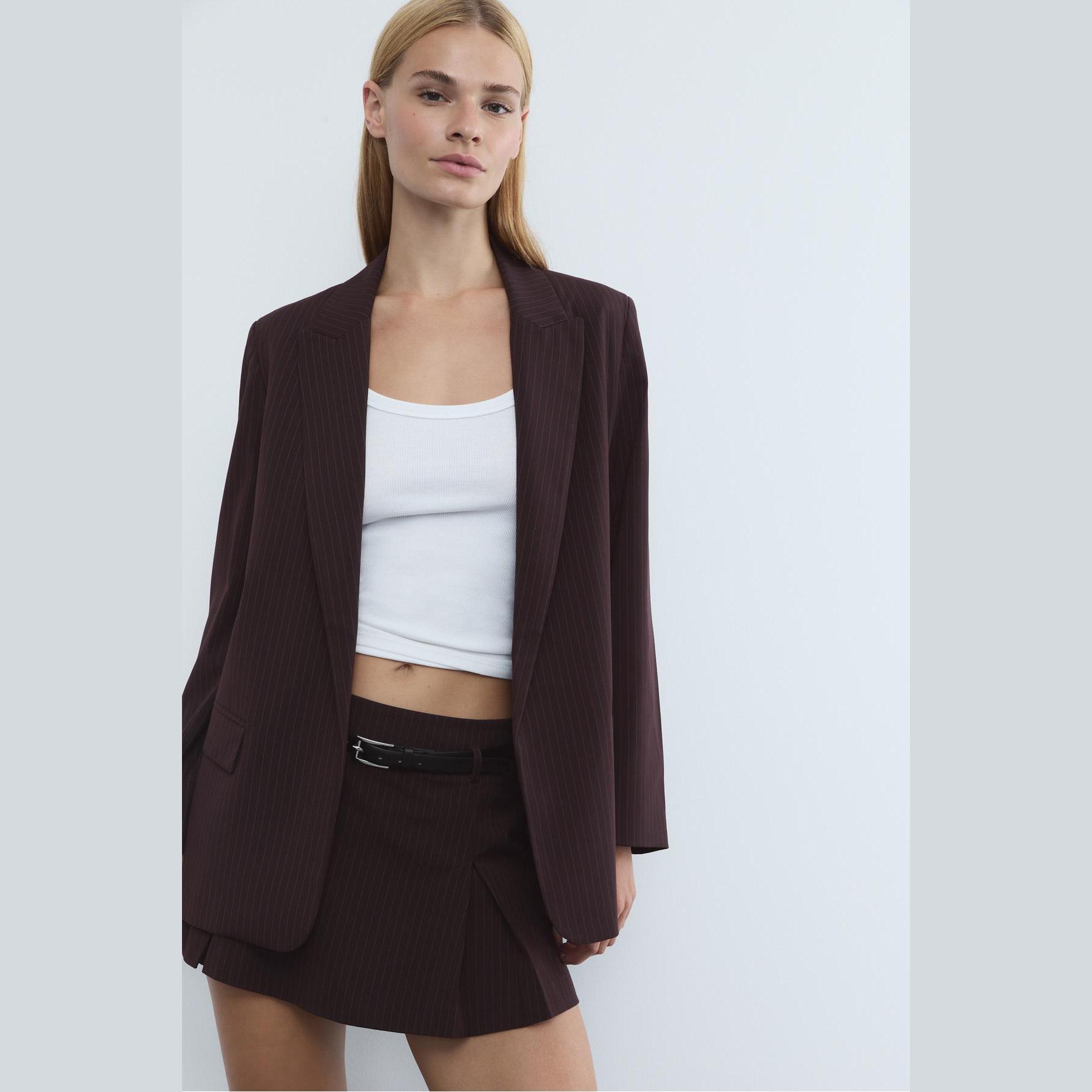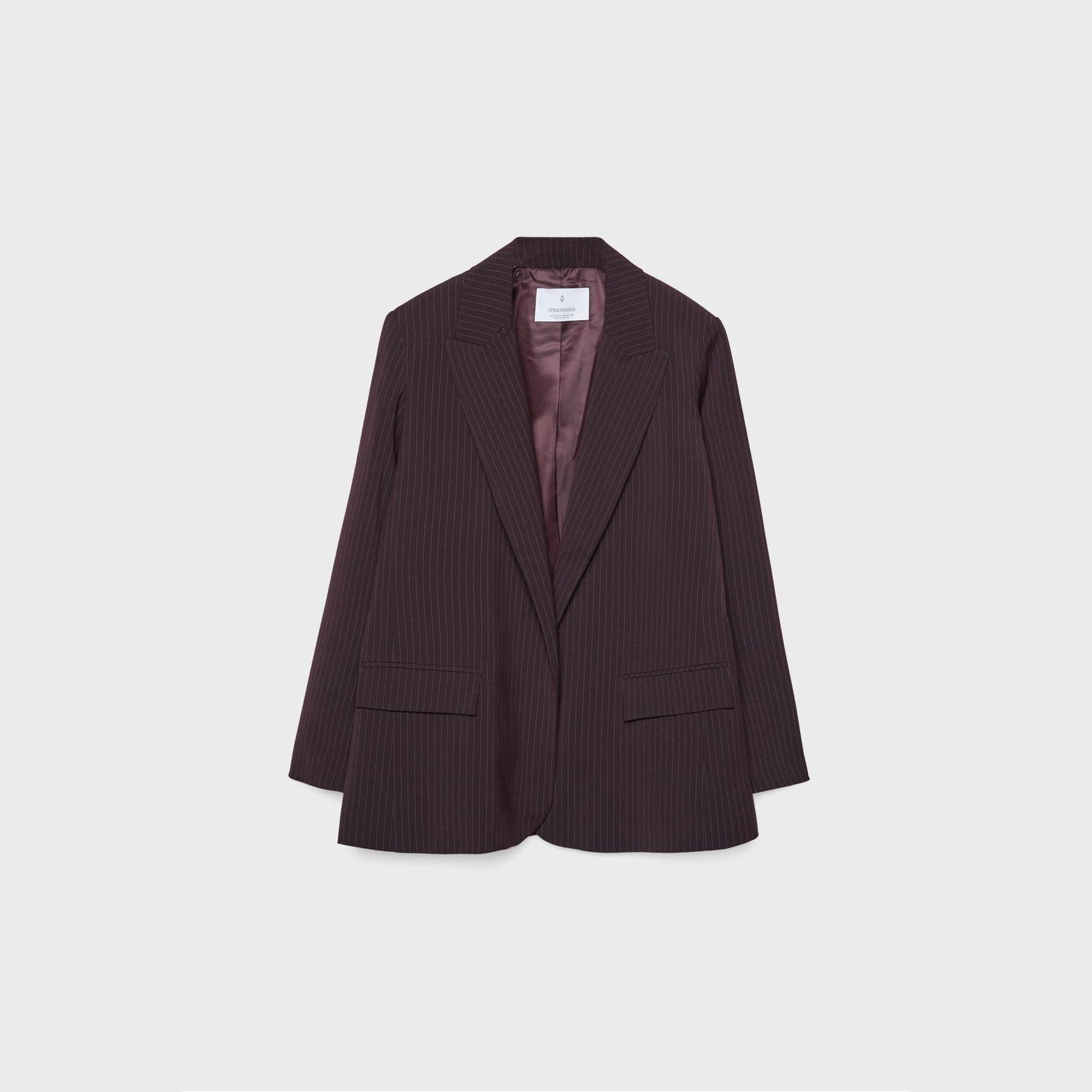 بليزر أنيق من Stradivarius بلون بنفسجي، مصنوع من خامة مرنة بتركيبة 69% بوليستر، 29% فيسكوز، 2% إيلاستان، يتميز بقصة مستقيمة Straight Fit، ياقة كلاسيكية مطوية، أكمام طويلة، تصميم مفتوح بدون إغلاق أمامي، مزود بجيوب أمامية بغطاء، نقشة خطوط طولية بملمس محبب، مبطّن بالكامل، مثالي للتنسيق مع بنطال رسمي أو تنورة لإطلالة مكتبية أو يومية أنيقة.