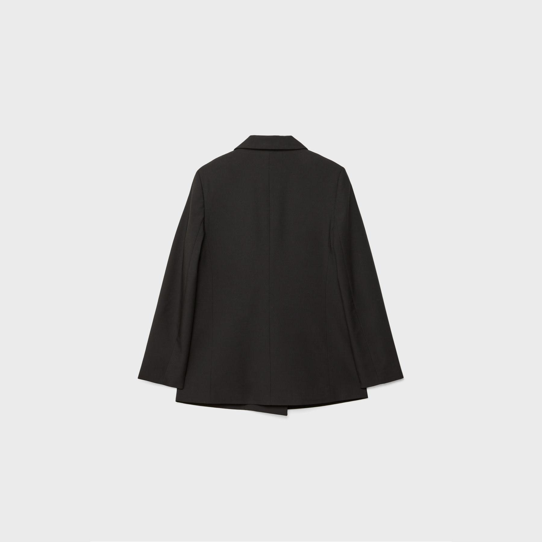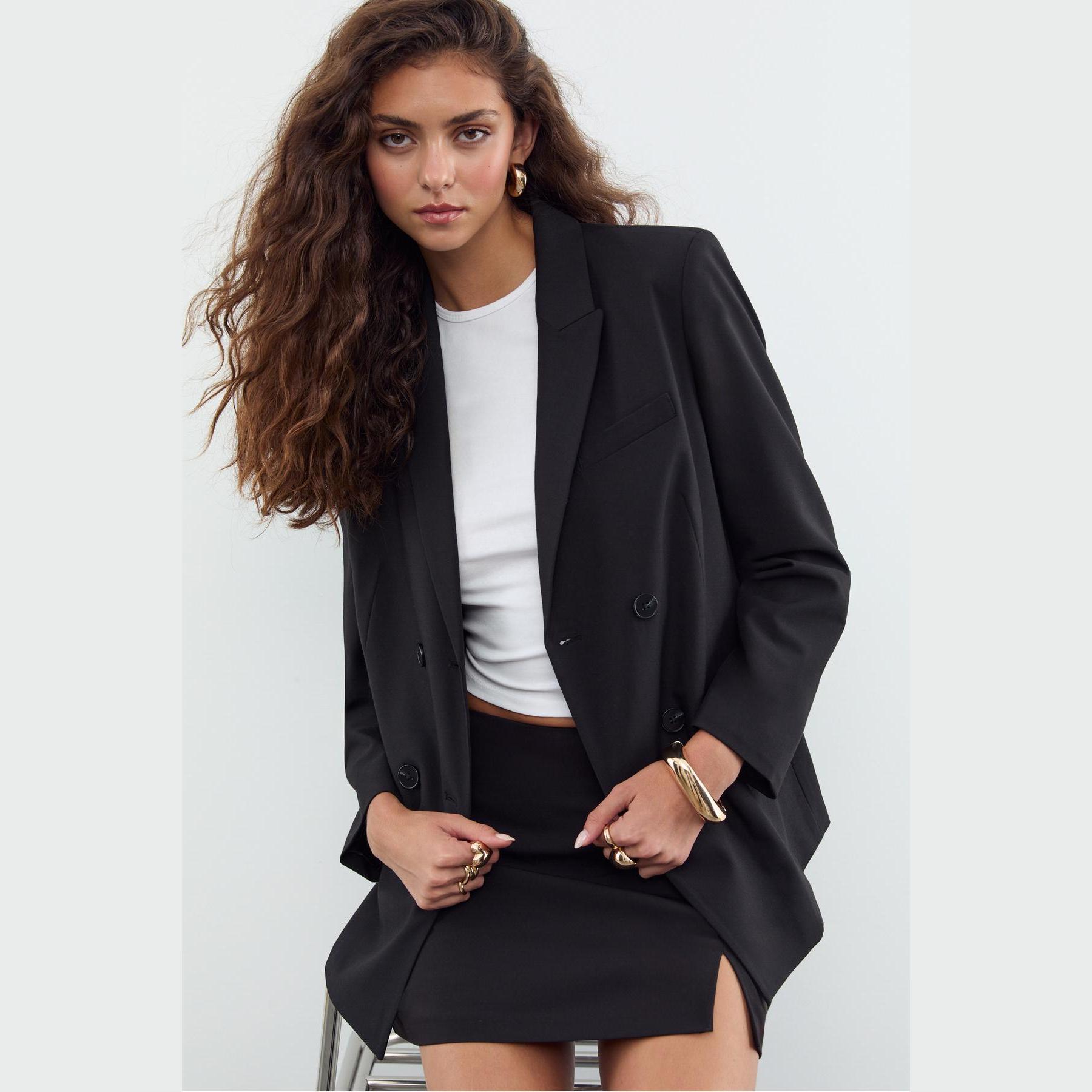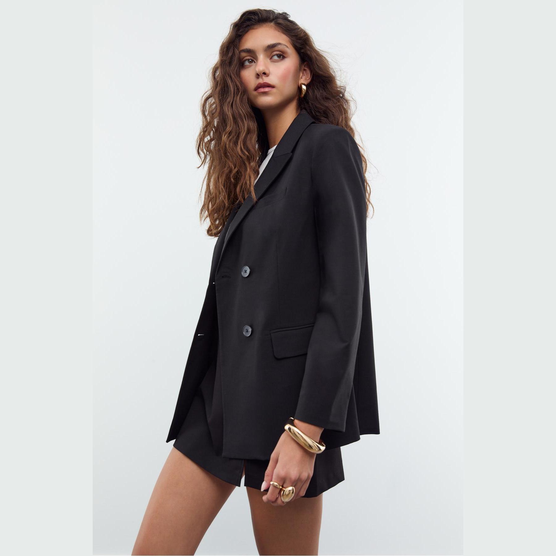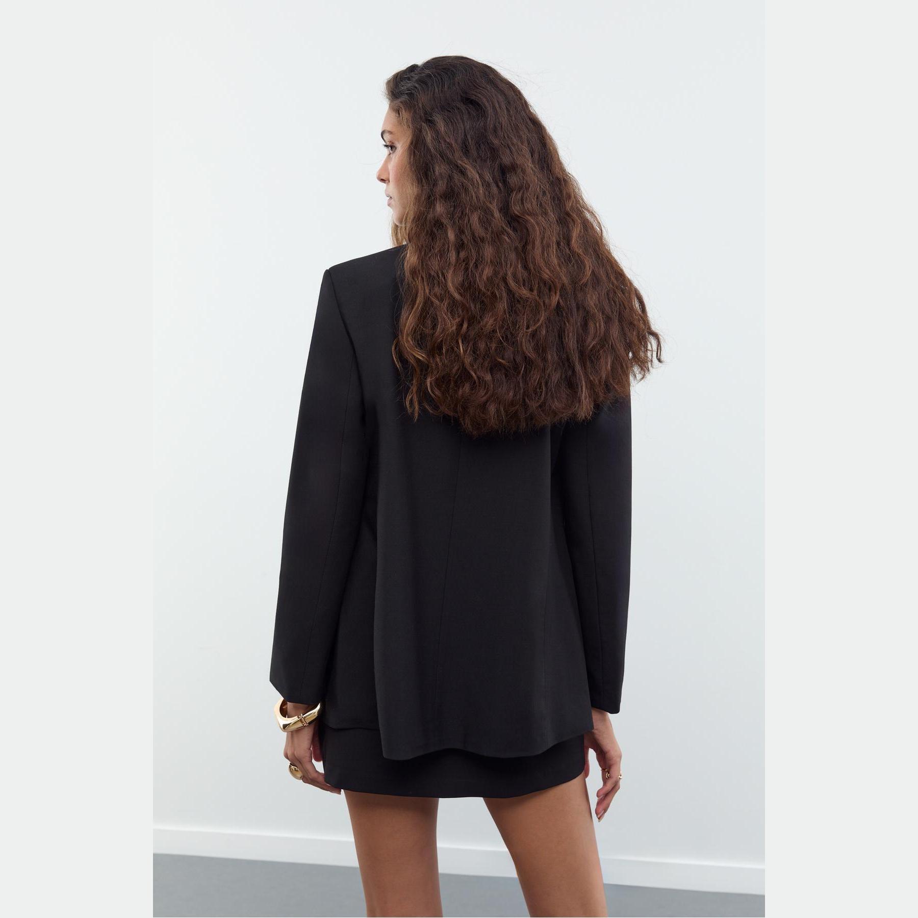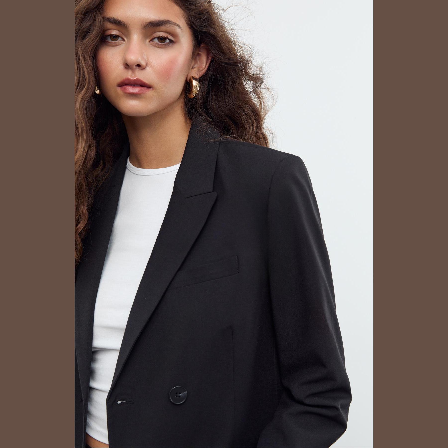 بليزر أنيق من Stradivarius بلون أسود، مصنوع من خامة مرنة بتركيبة 78% بوليستر، 16% فيسكوز، 6% إيلاستان، يتميز بقصة مستقيمة Straight Fit، ياقة كلاسيكية مطوية، أكمام طويلة، إغلاق أمامي مزدوج (كروڤاز) بأزرار، مزود بجيوب أمامية بغطاء (ديكورية)، تصميم سادة بملمس ناعم، مبطّن بالكامل، مثالي للتنسيق مع بنطال رسمي أو تنورة لإطلالة مكتبية أنيقة.