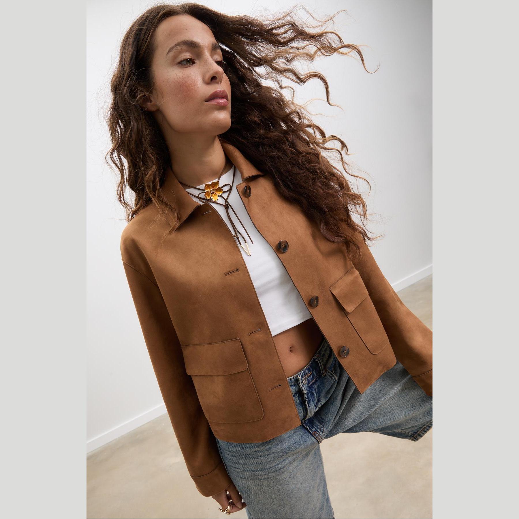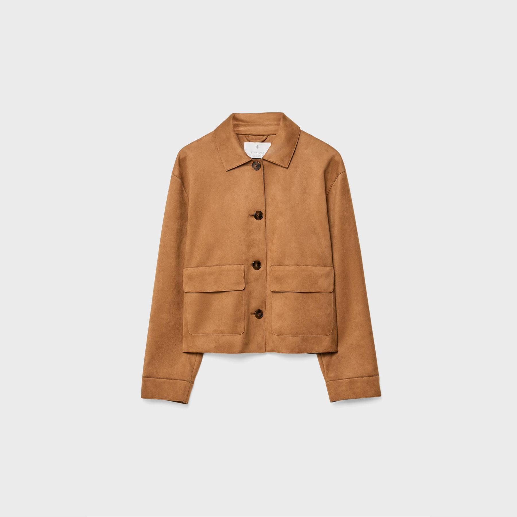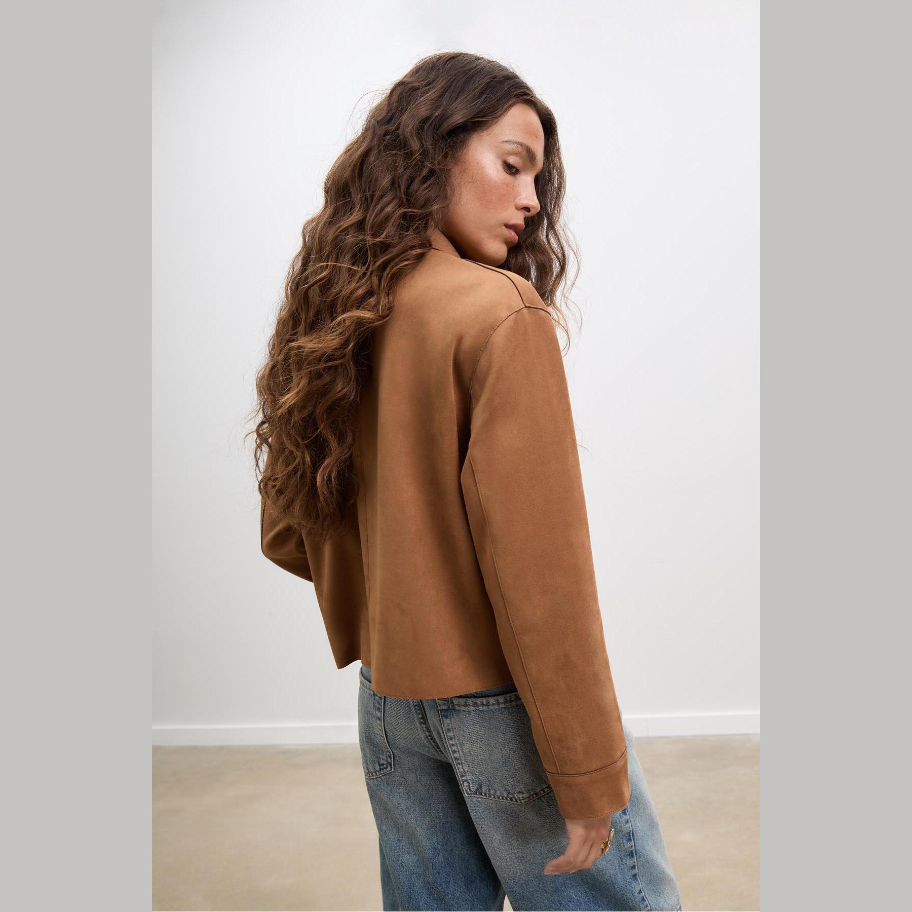 جاكيت أنيق من Stradivarius بلون بني فاتح، مصنوع من خامة شمواه صناعي بتركيبة 88% بوليستر، 12% إيلاستان، يتميز بقصة Regular Fit، ياقة ديكولتيه منسدلة، أكمام طويلة، إغلاق أمامي بأزرار، مزود بجيبين أماميين بغطاء، تصميم سادة بملمس ناعم، بدون بطانة، مثالي للتنسيق مع بنطال جينز أو تنورة لإطلالة خريفية أو يومية أنيقة.