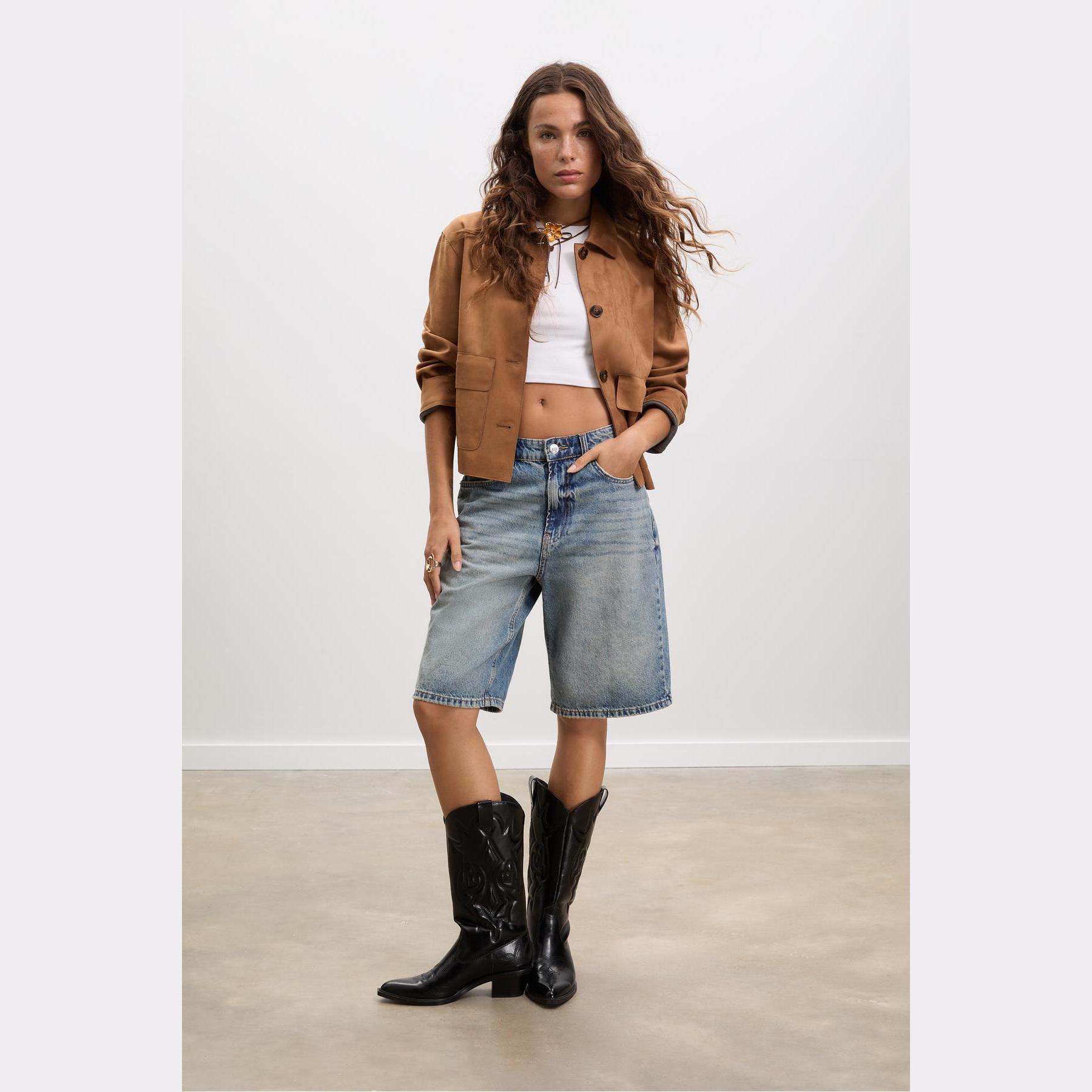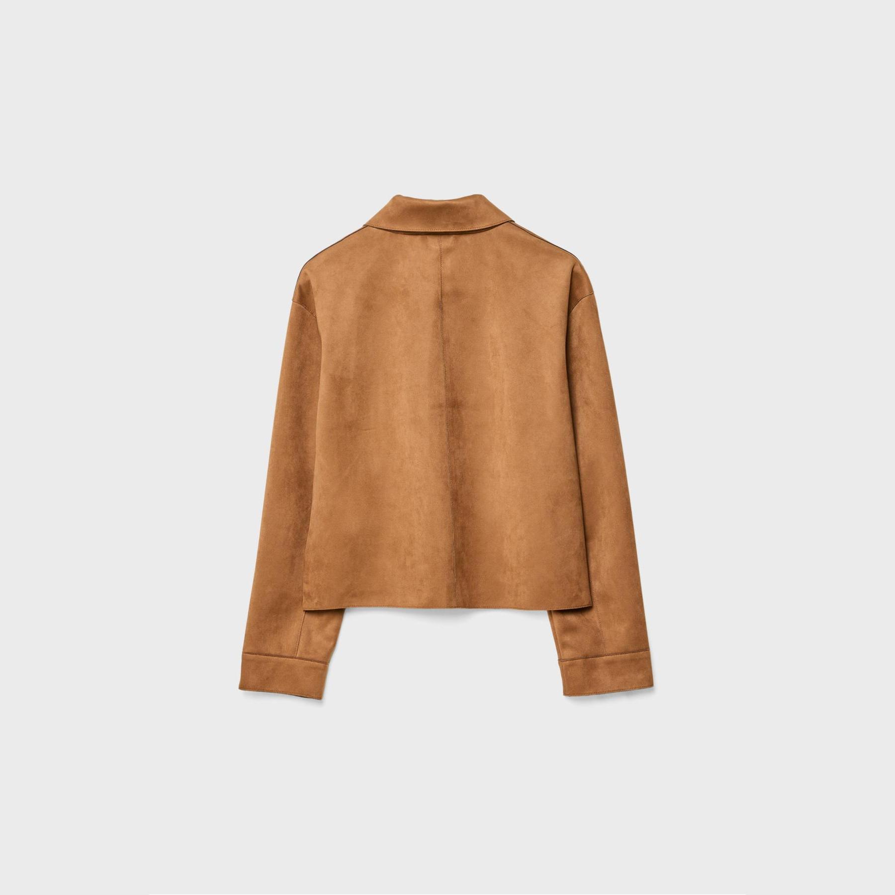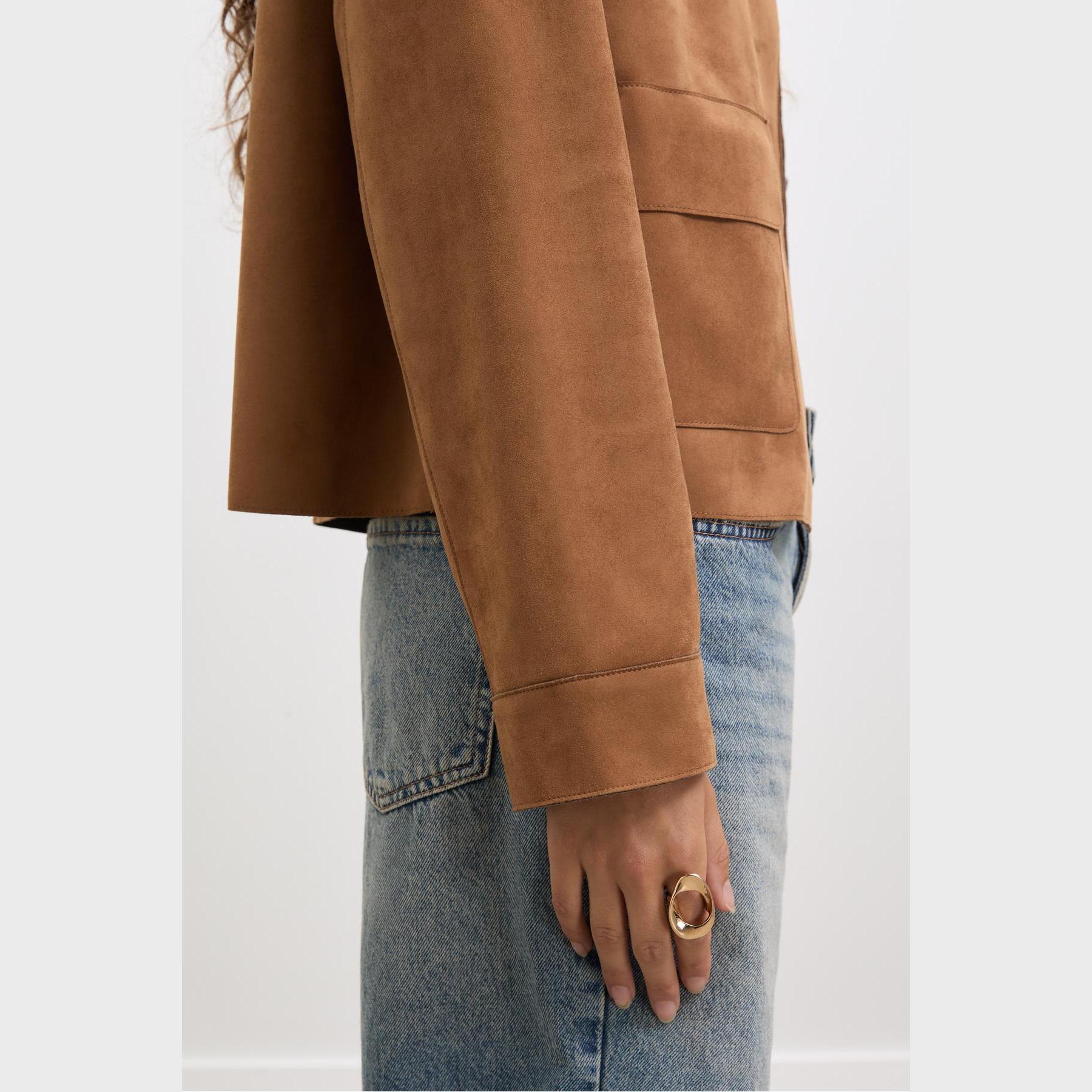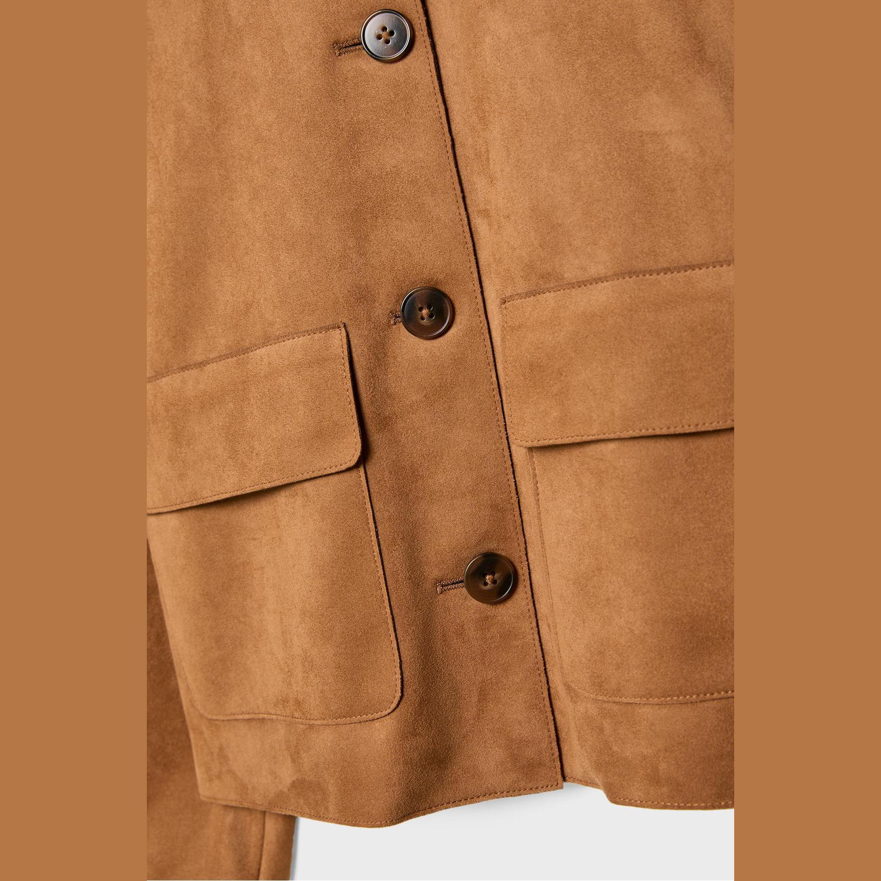 جاكيت أنيق من Stradivarius بلون بني فاتح، مصنوع من خامة شمواه صناعي بتركيبة 88% بوليستر، 12% إيلاستان، يتميز بقصة Regular Fit، ياقة ديكولتيه منسدلة، أكمام طويلة، إغلاق أمامي بأزرار، مزود بجيبين أماميين بغطاء، تصميم سادة بملمس ناعم، بدون بطانة، مثالي للتنسيق مع بنطال جينز أو تنورة لإطلالة خريفية أو يومية أنيقة.
