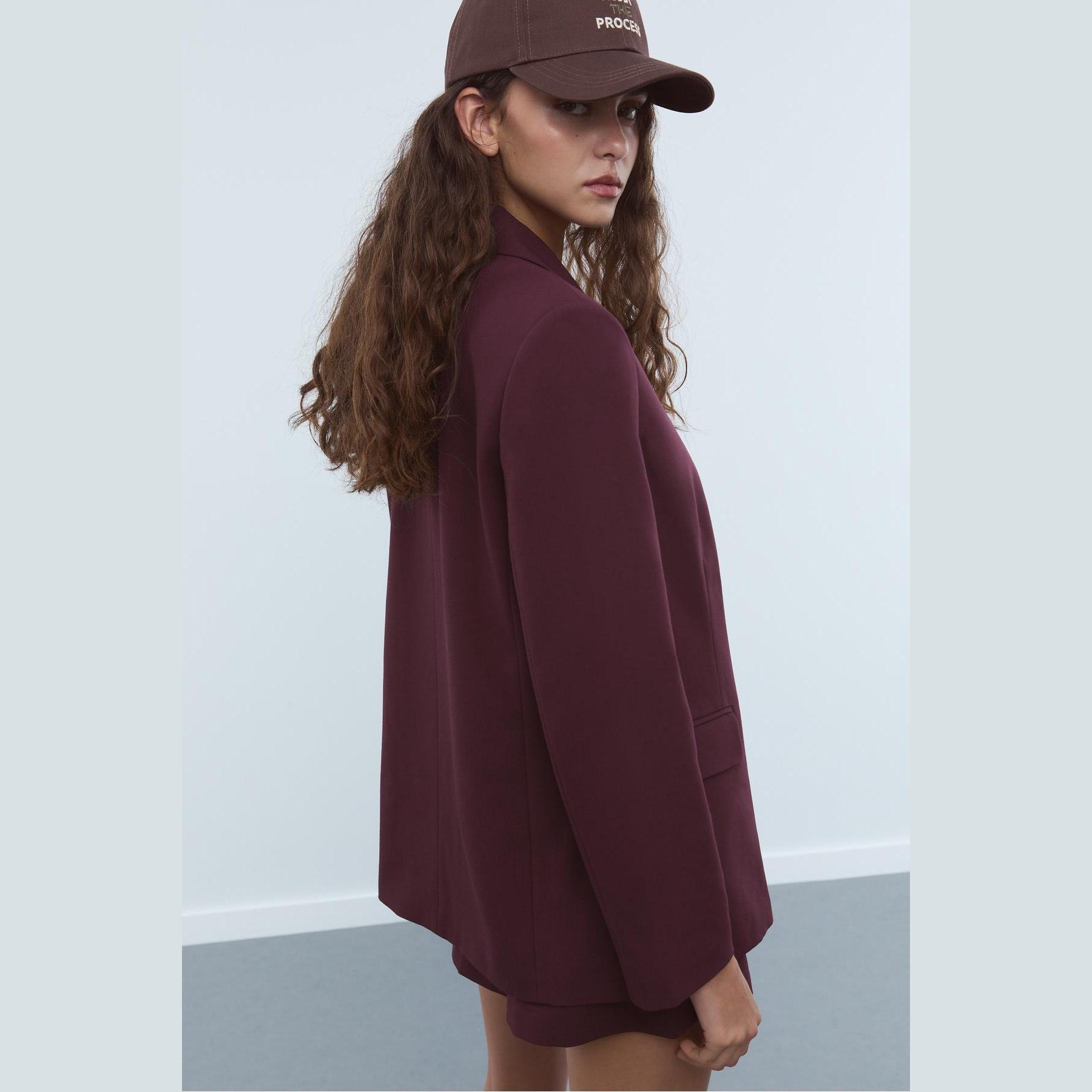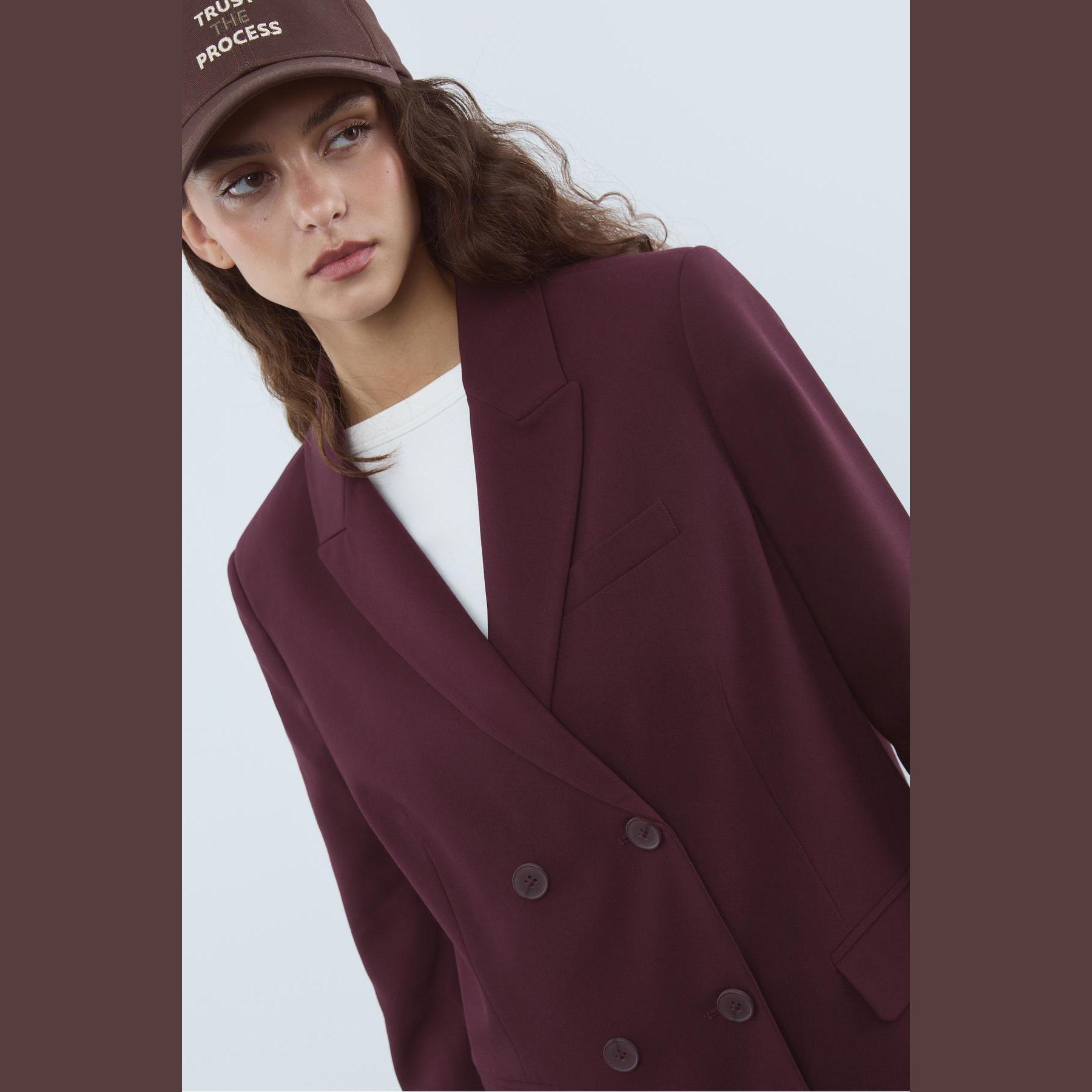 بليزر أنيق من Stradivarius بلون بوردو بنقشة مربعات، مصنوع من خامة مرنة بتركيبة 78% بوليستر، 16% فيسكوز، 6% إيلاستان، يتميز بقصة Regular Fit، ياقة كلاسيكية مطوية، أكمام طويلة، إغلاق أمامي مزدوج (كروڤاز) بأزرار، مزود بجيوب أمامية بغطاء (ديكورية)، تصميم مصقول بملمس ناعم، مبطّن بالكامل، مثالي للتنسيق مع بنطال رسمي أو تنورة لإطلالة مكتبية أنيقة.