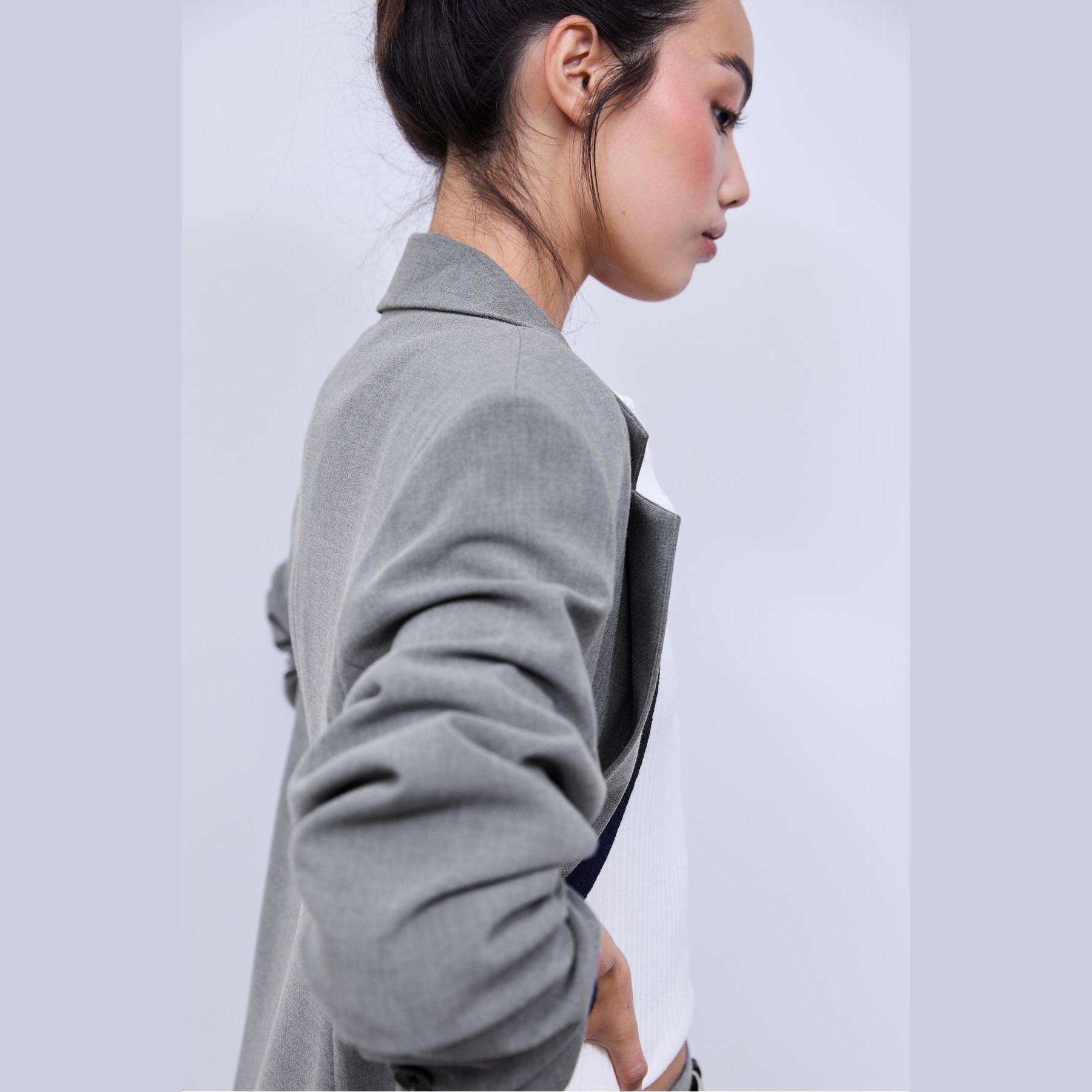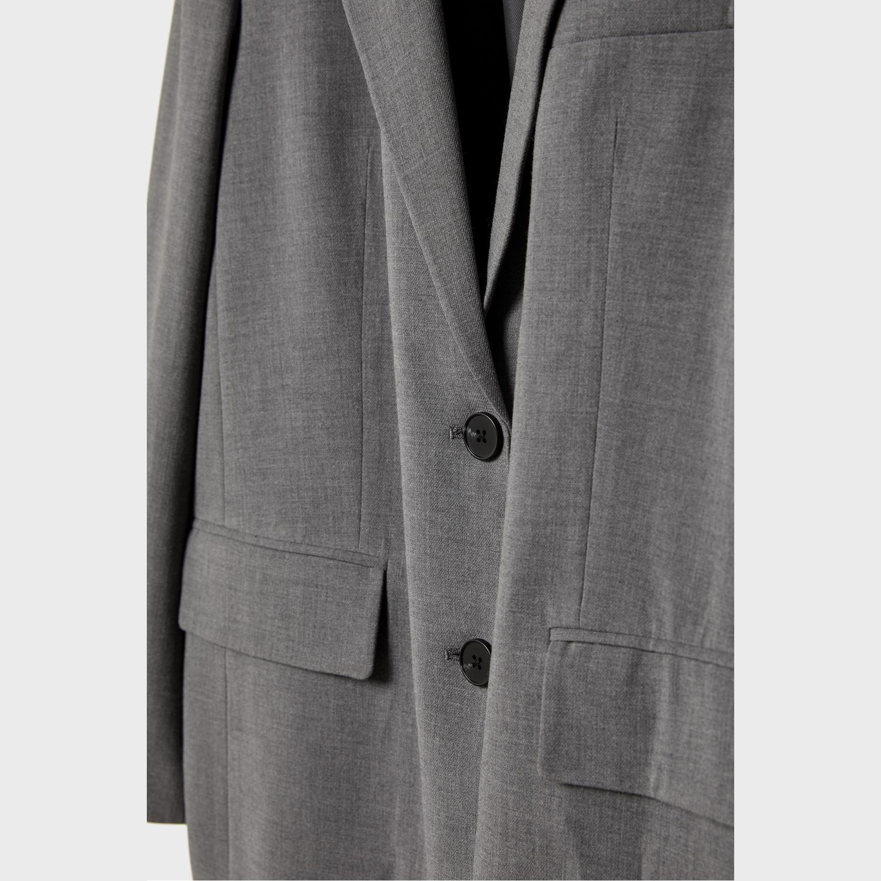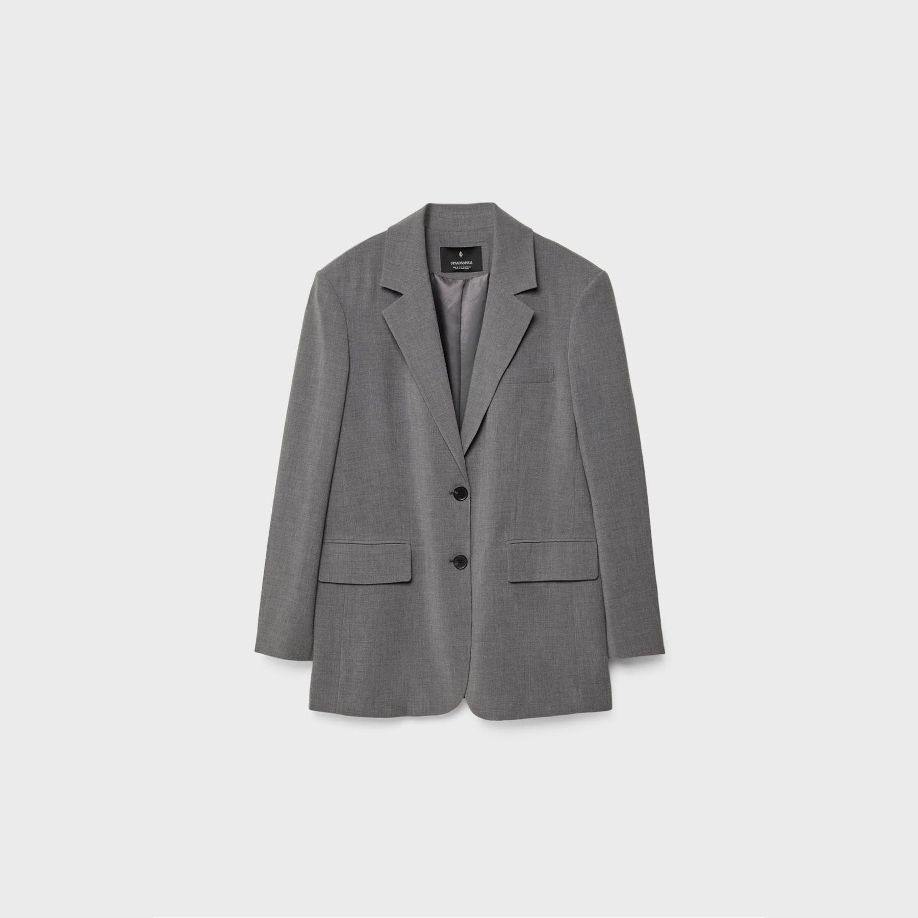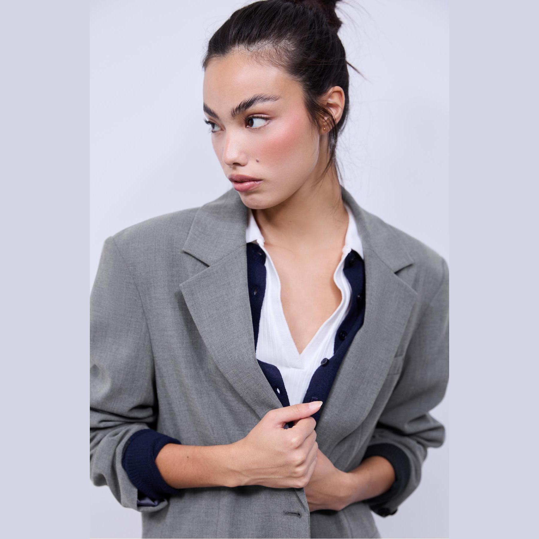 بليزر أنيق من Stradivarius بلون رمادي، مصنوع من خامة مرنة بتركيبة 63% بوليستر، 29% فيسكوز، 8% إيلاستان، يتميز بقصة Oversize، ياقة كلاسيكية مطوية، أكمام طويلة، إغلاق أمامي بأزرار، مزود بجيوب أمامية بغطاء (ديكورية)، تصميم سادة بملمس ناعم، مبطّن بالكامل، مثالي للتنسيق مع بنطال رسمي أو تنورة لإطلالة مكتبية أو يومية أنيقة.